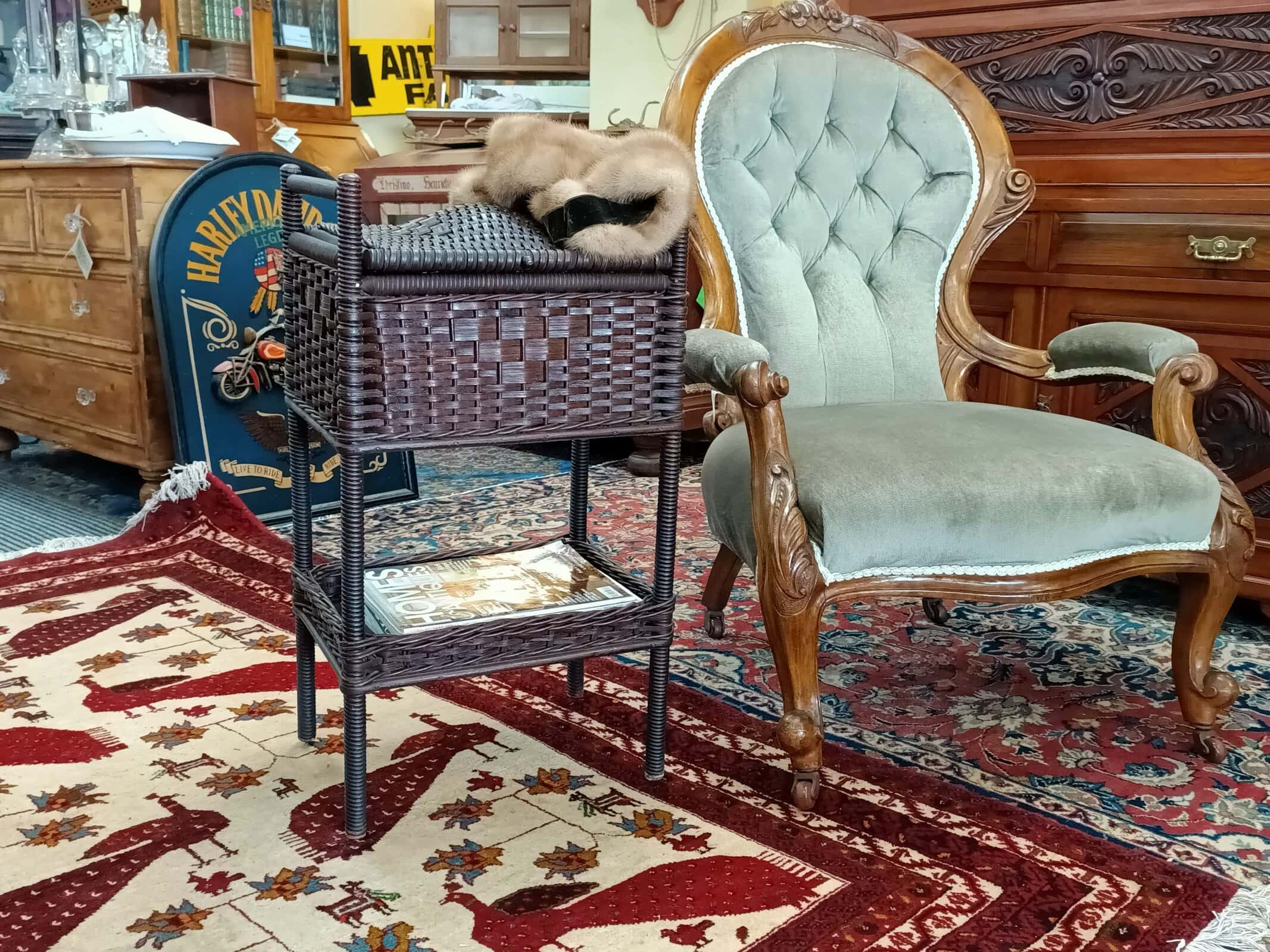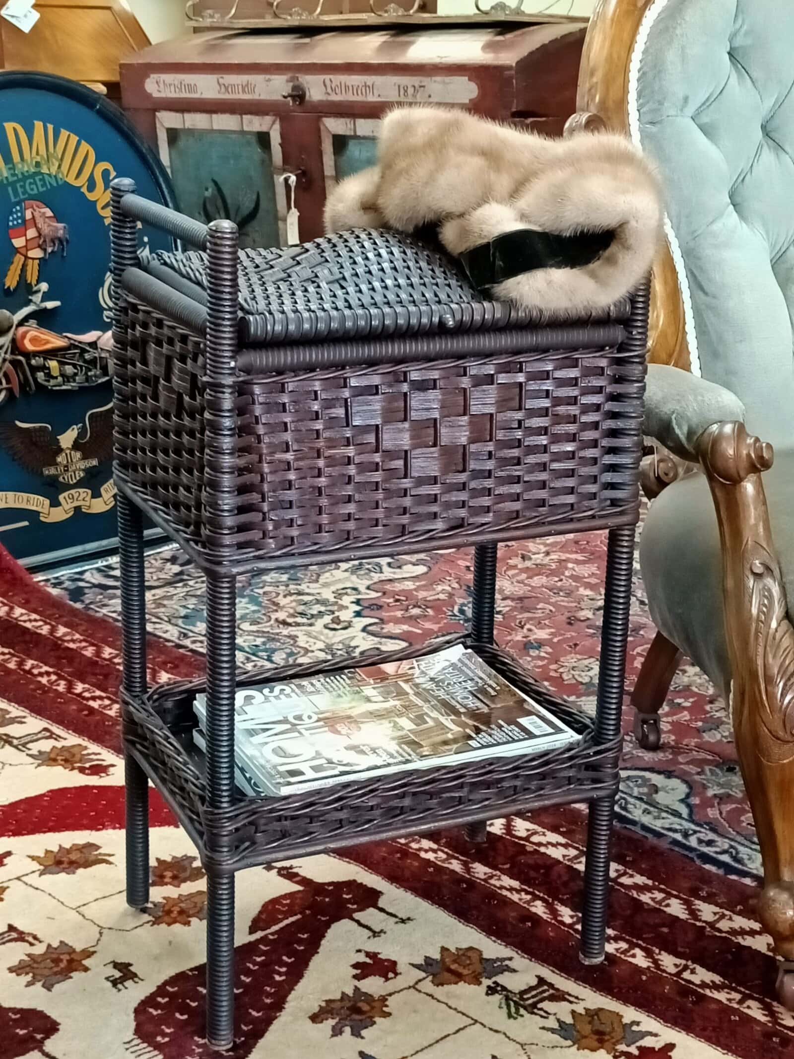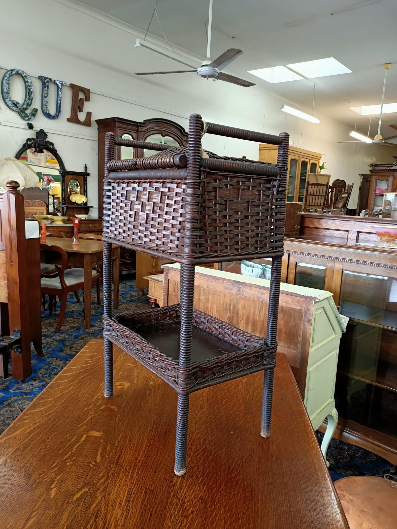 Now here's a QTPie for all you crafts folk. An American feeling cane and pine sew box/basket. Domed top, flip top lid, bobbin turned wood frame, lined basket, and a tray beneath for the magazines and biscuit jar! Dark chocolate colour. Excellent condition. Circa 1950.