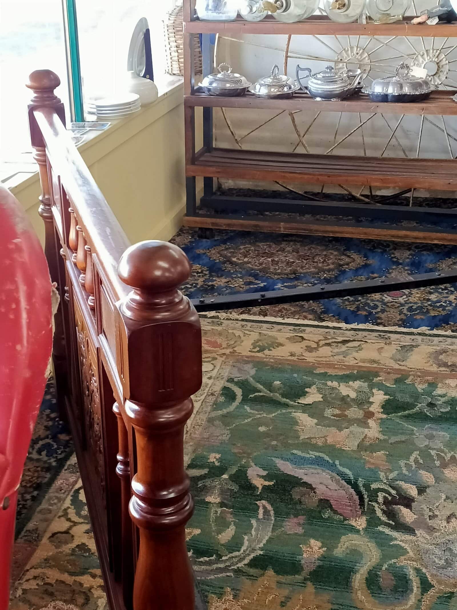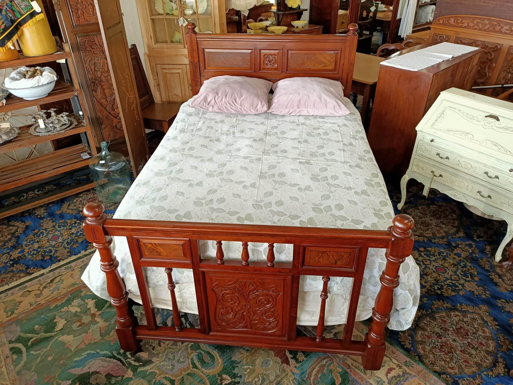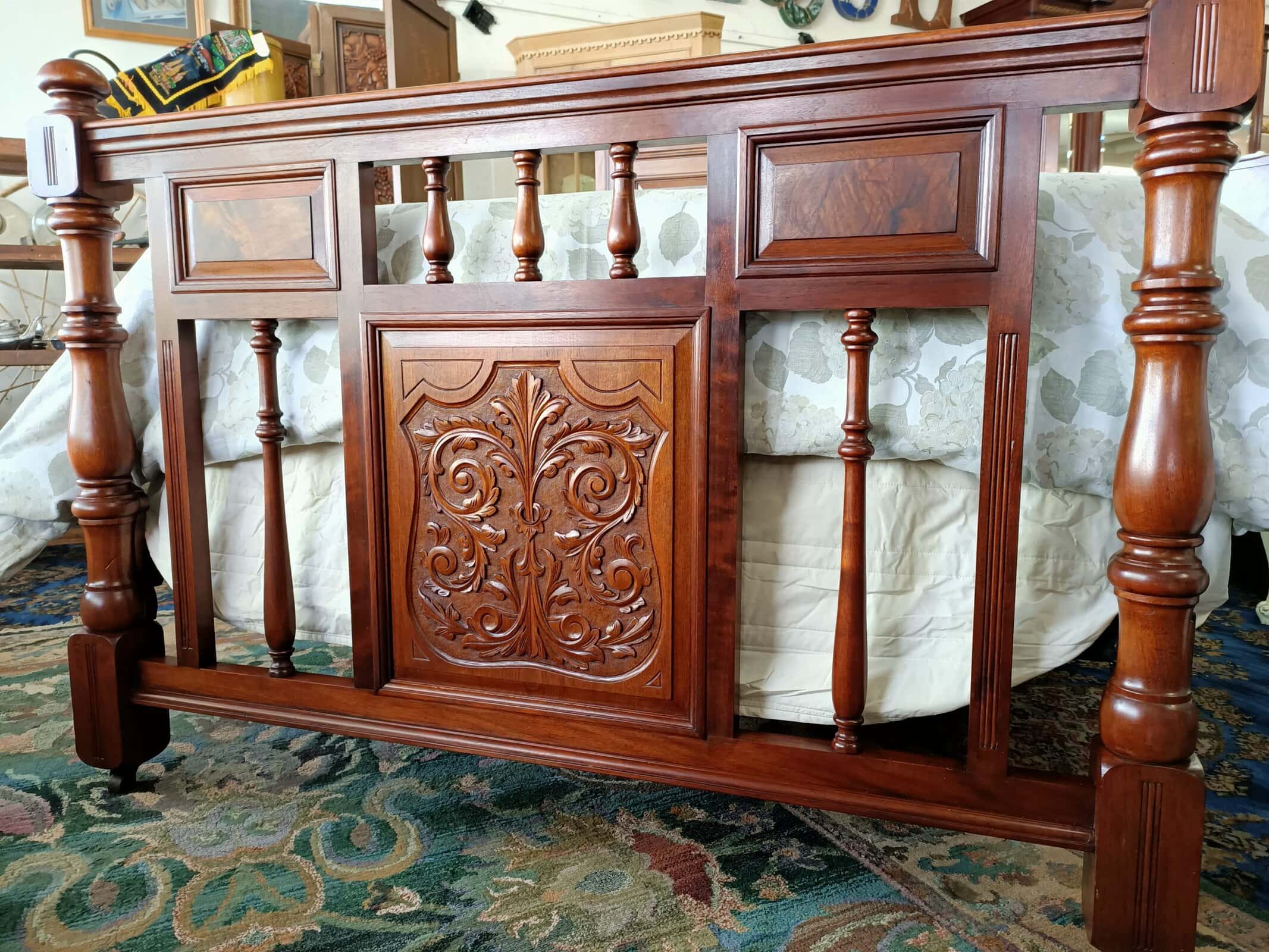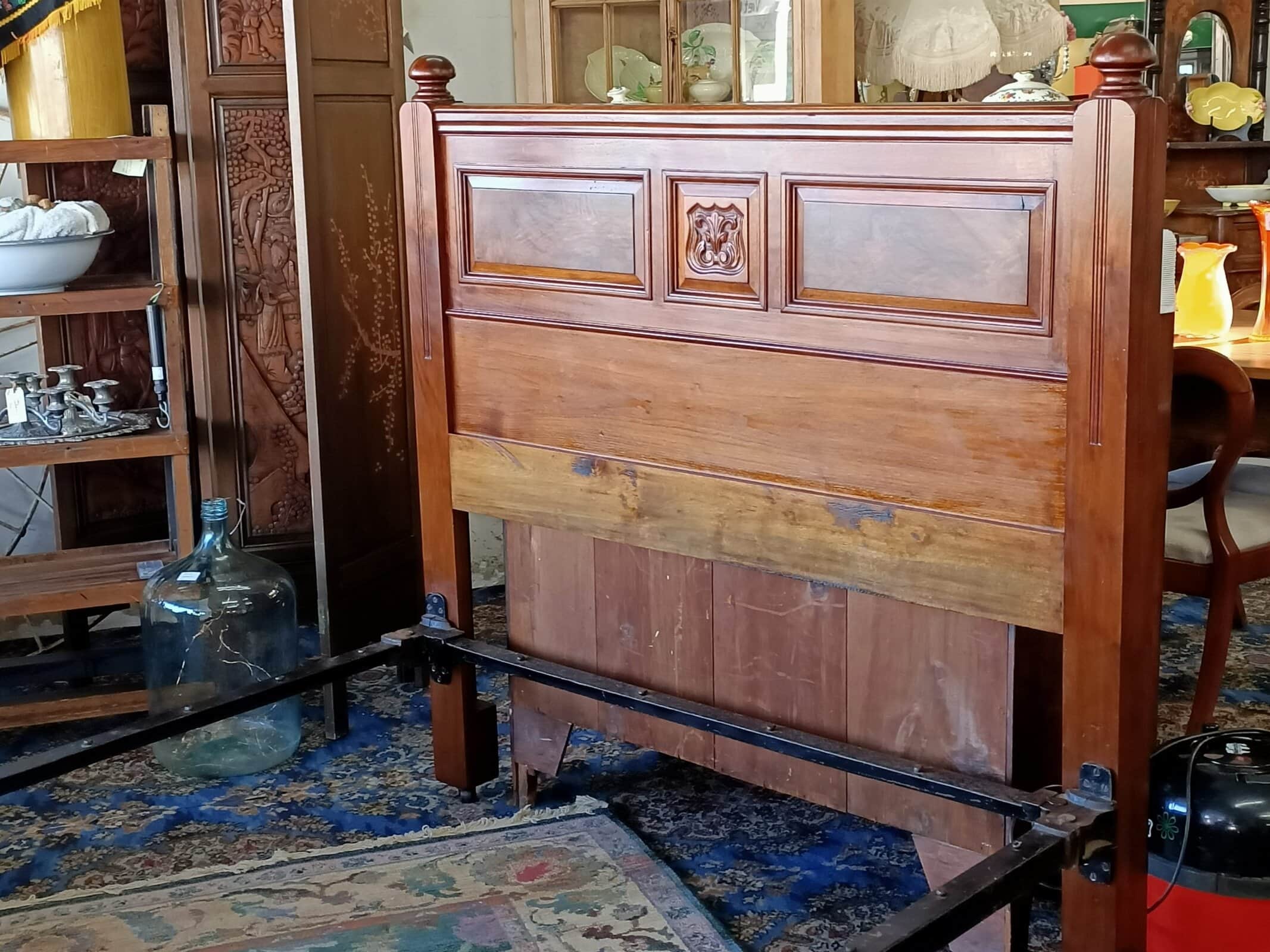 Here's just the ticket to accomplish you own bedroom bliss, an English made, American Walnut DOUBLE bed frame.  A taller headboard, and lovely carved footboard, along with two metal rails.  Upon castors.  Seen here dressed up with the shop bed gear.   Auburn hues.    Furthermore, the bed frame is pretty heavy, and has plenty of hitching knobs and posts 😜.  Excellent condition.  Circa 1890.