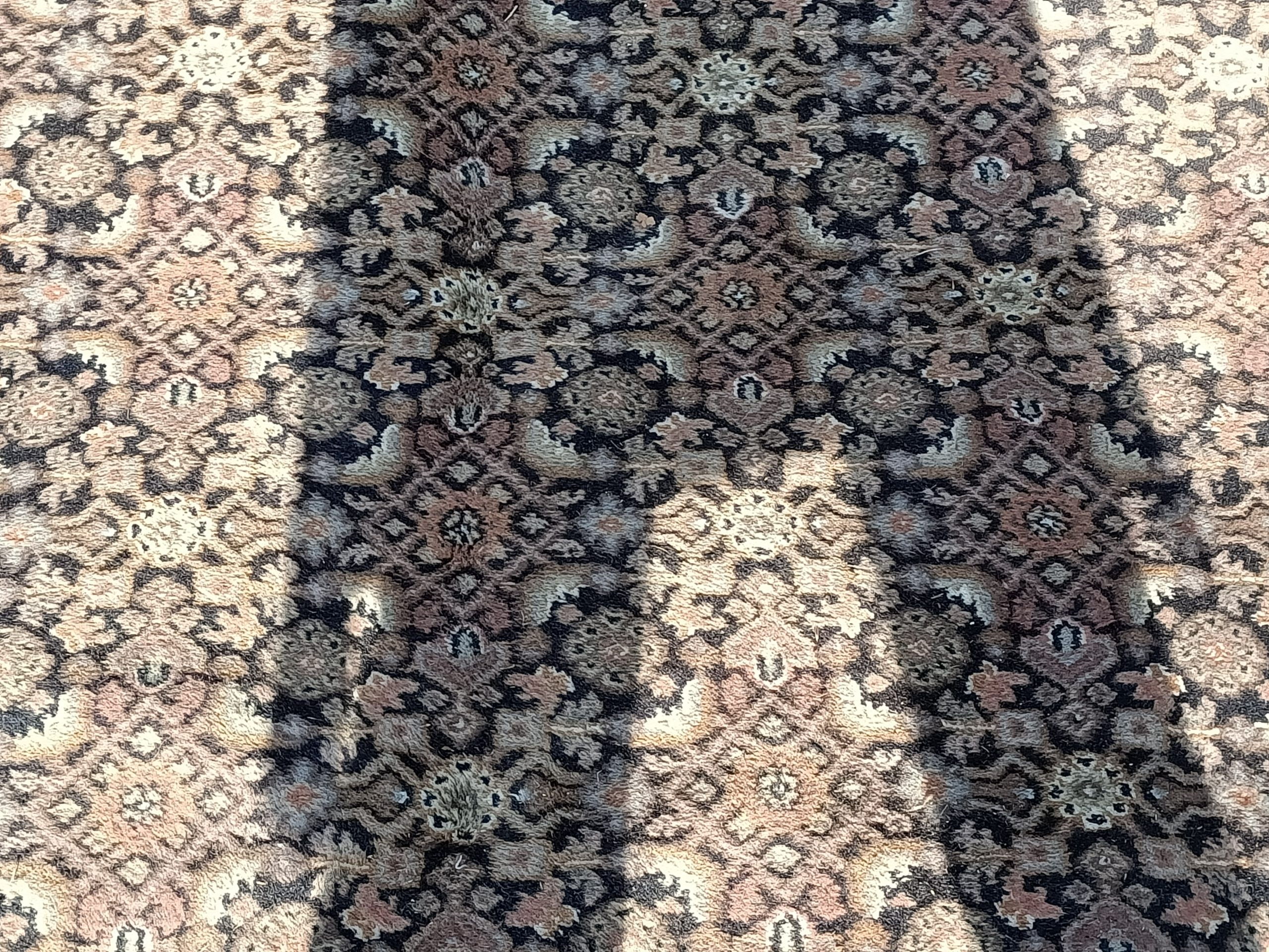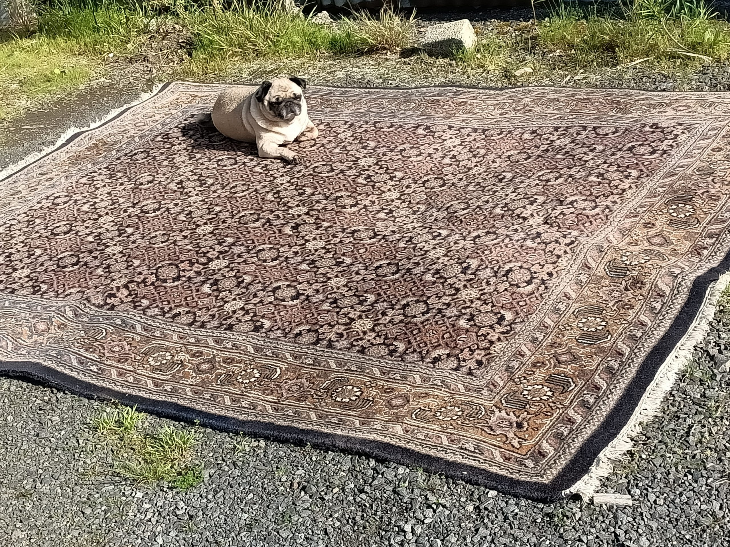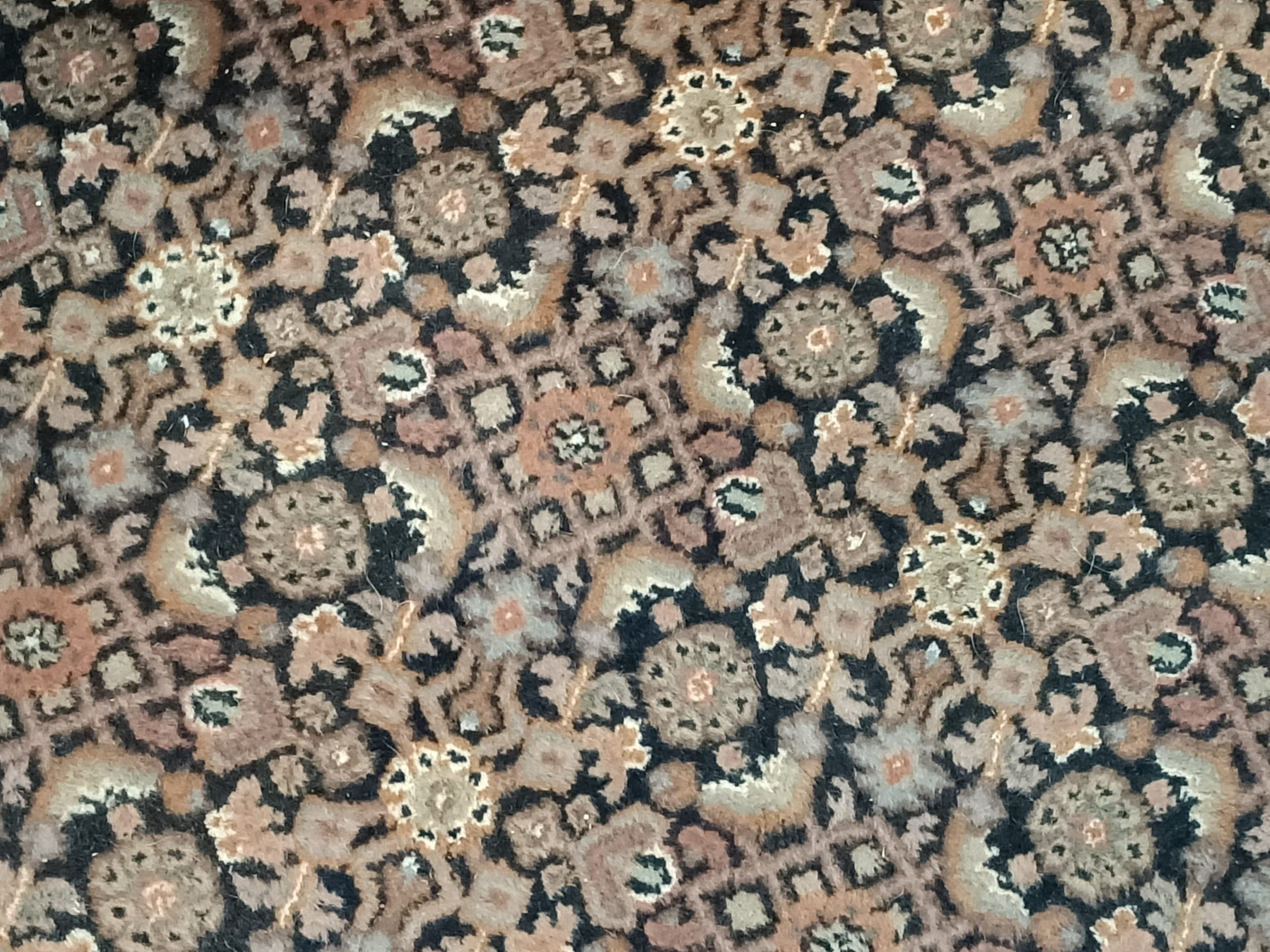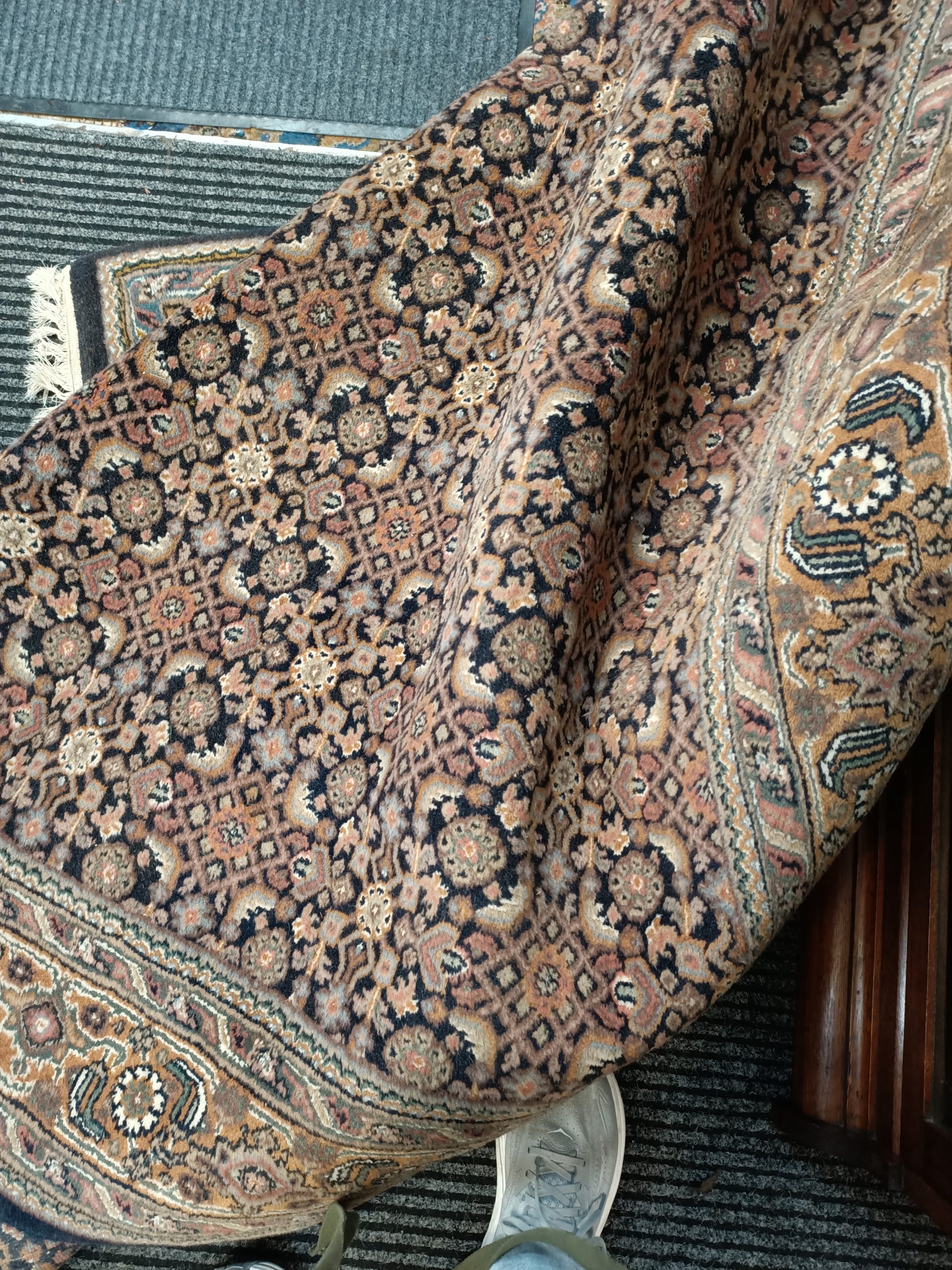 Pugster loves lounging on this finely tightly knotted, thickish napped wool on cotton carpet, Boteh style. Navy blue background with a dense flora and geometric stamp pattern in caramels and light blue. Decent daisy border. This carpet compliments most colour spectrums here in the shop... formal, informal, tans, cocoa, whites, reds, greens. Pretty good condition, longish nap has matted slightly. Very easy to vacuum. Circa 1950.
