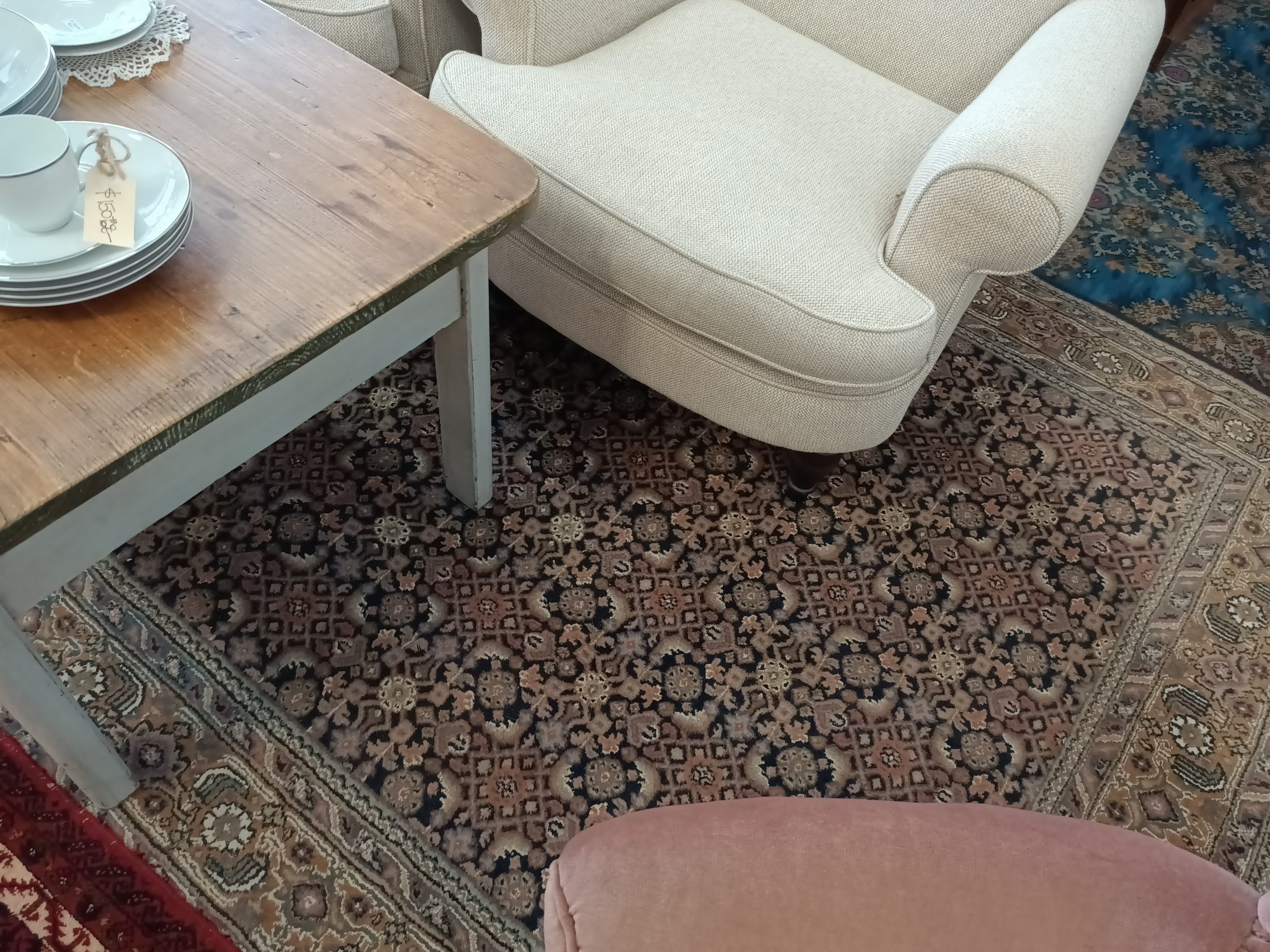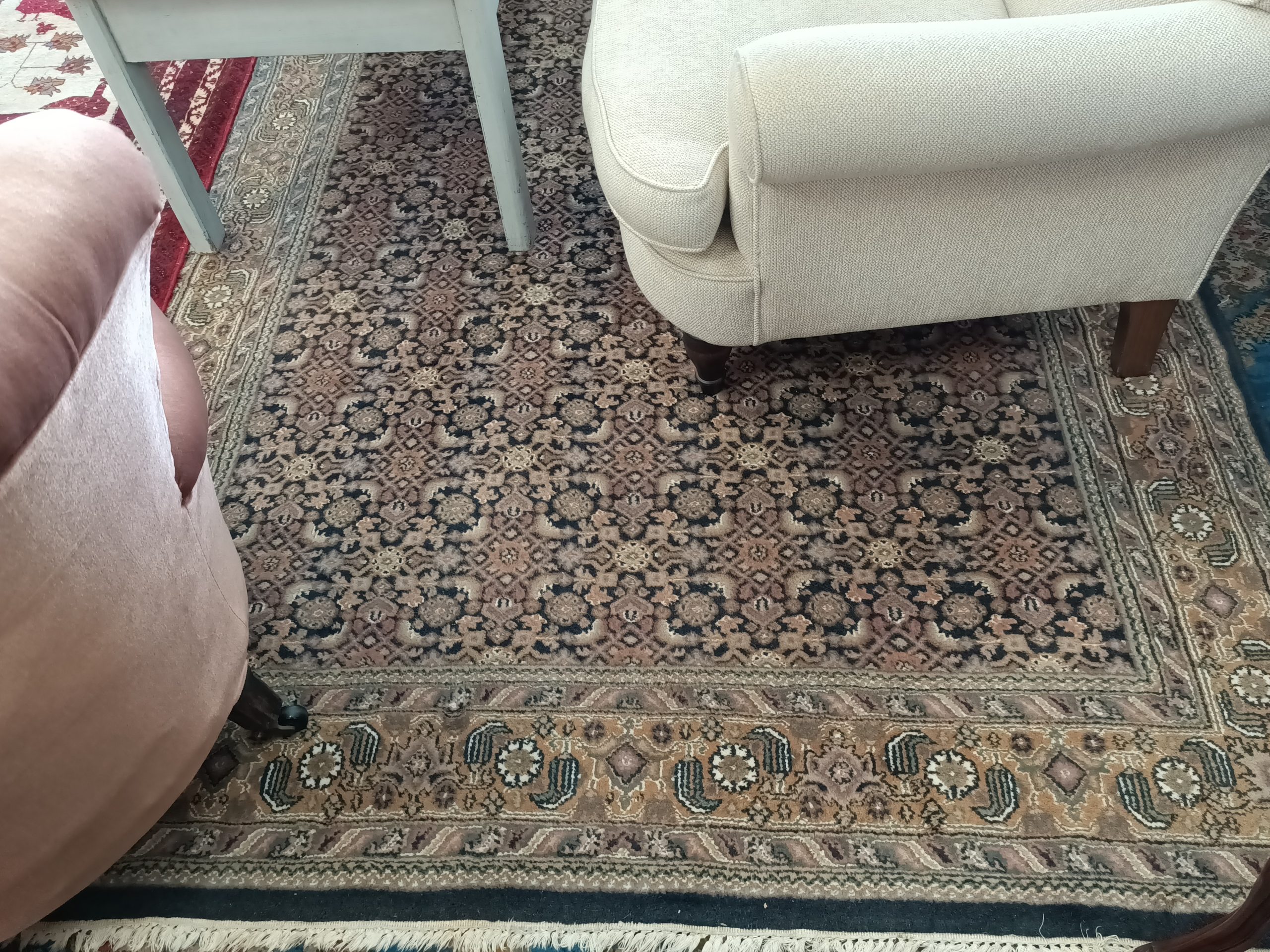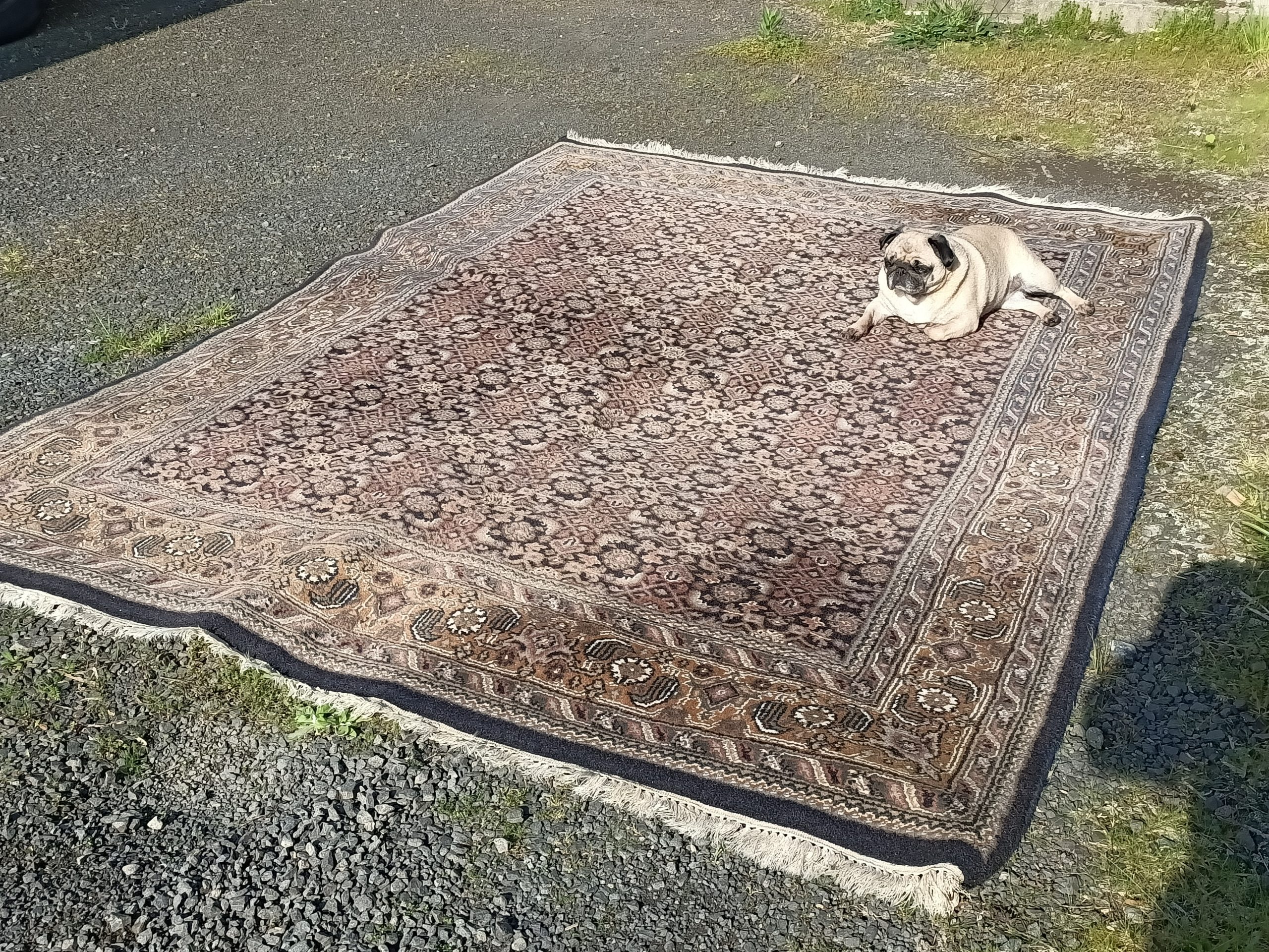 Pugster loves lounging on this finely tightly knotted, thickish napped wool on cotton carpet, Boteh style. Navy blue background with a dense flora and geometric stamp pattern in caramels and light blue. Decent daisy border. This carpet compliments most colour spectrums here in the shop... formal, informal, tans, cocoa, whites, reds, greens. Pretty good condition, longish nap has matted slightly. Very easy to vacuum. Circa 1950.