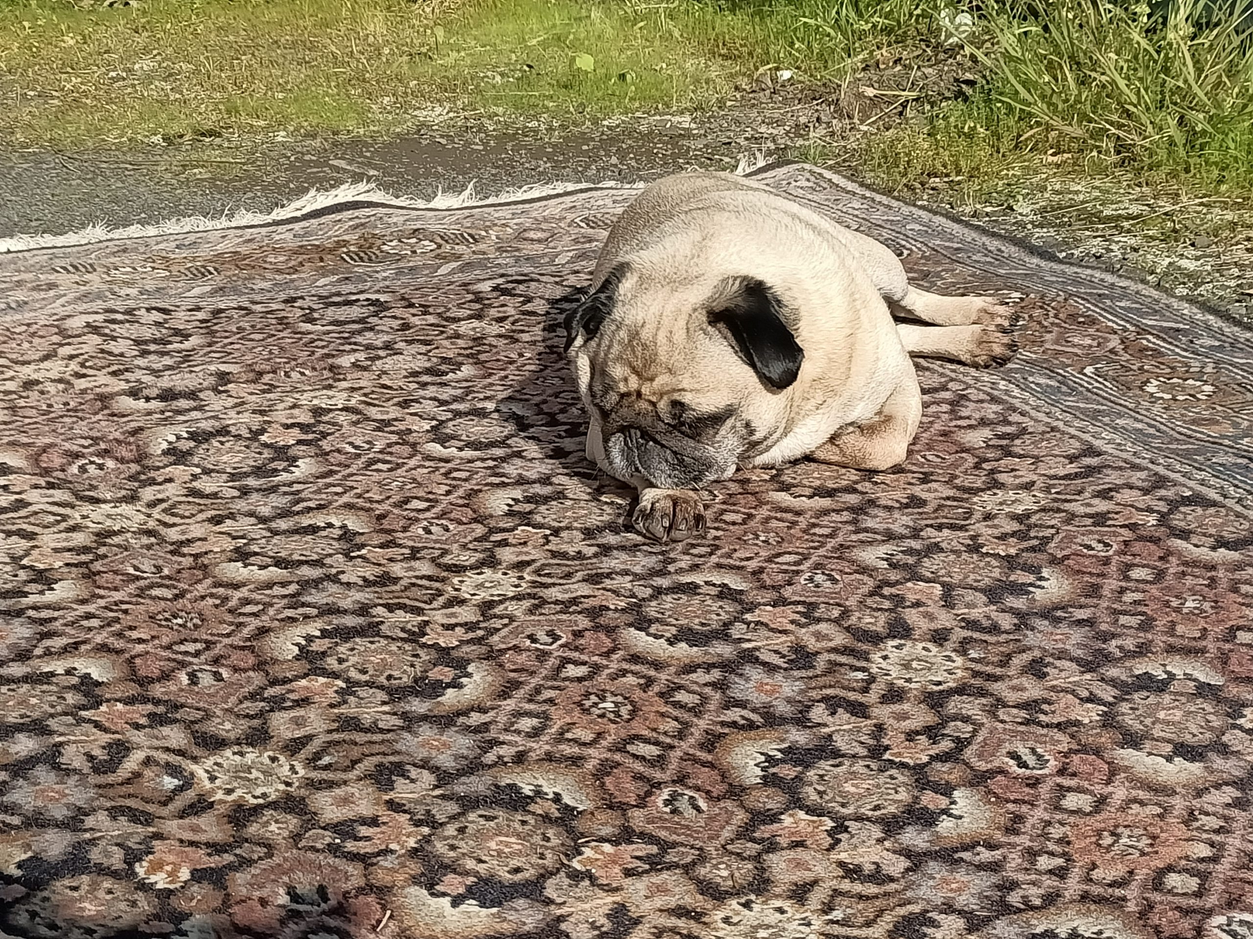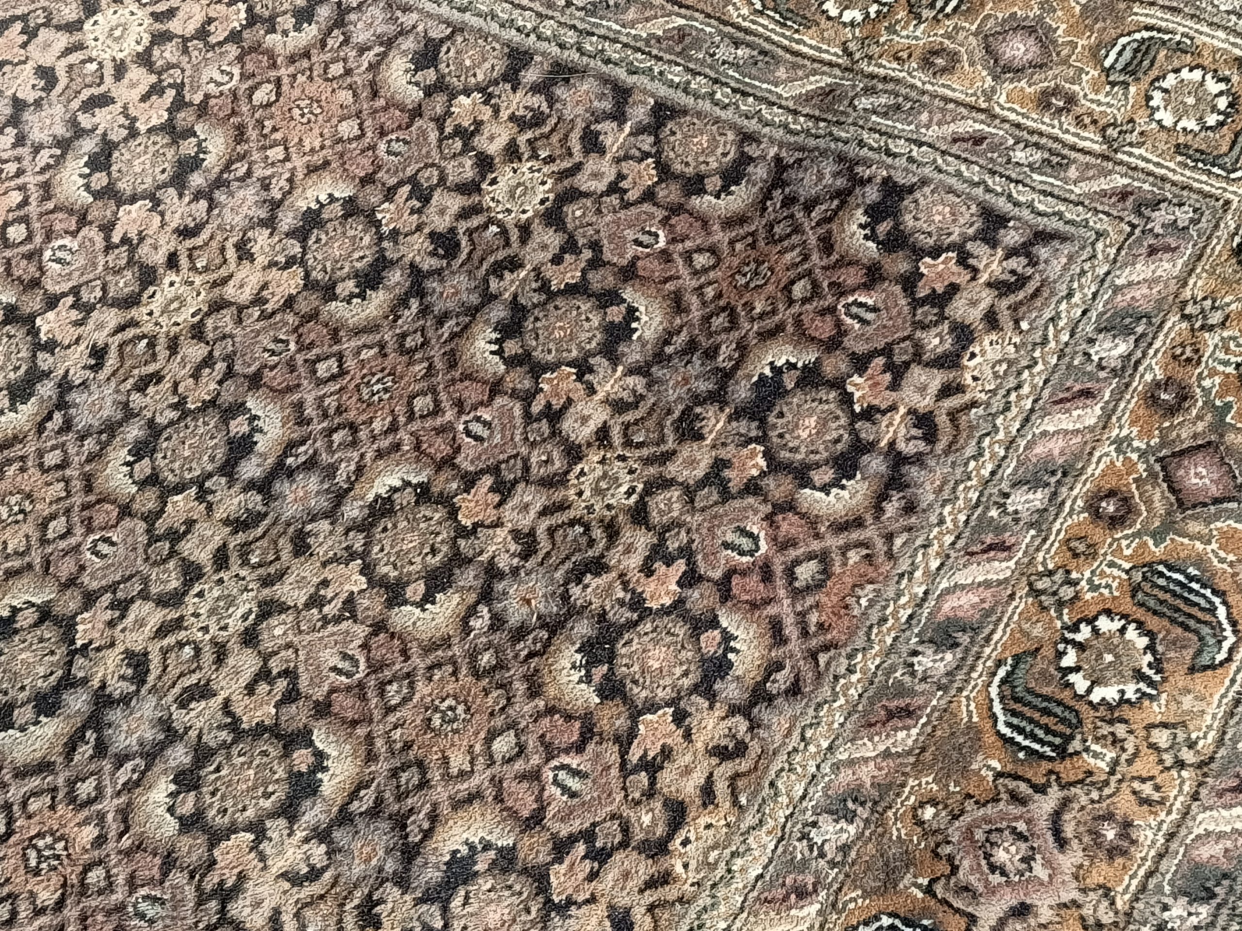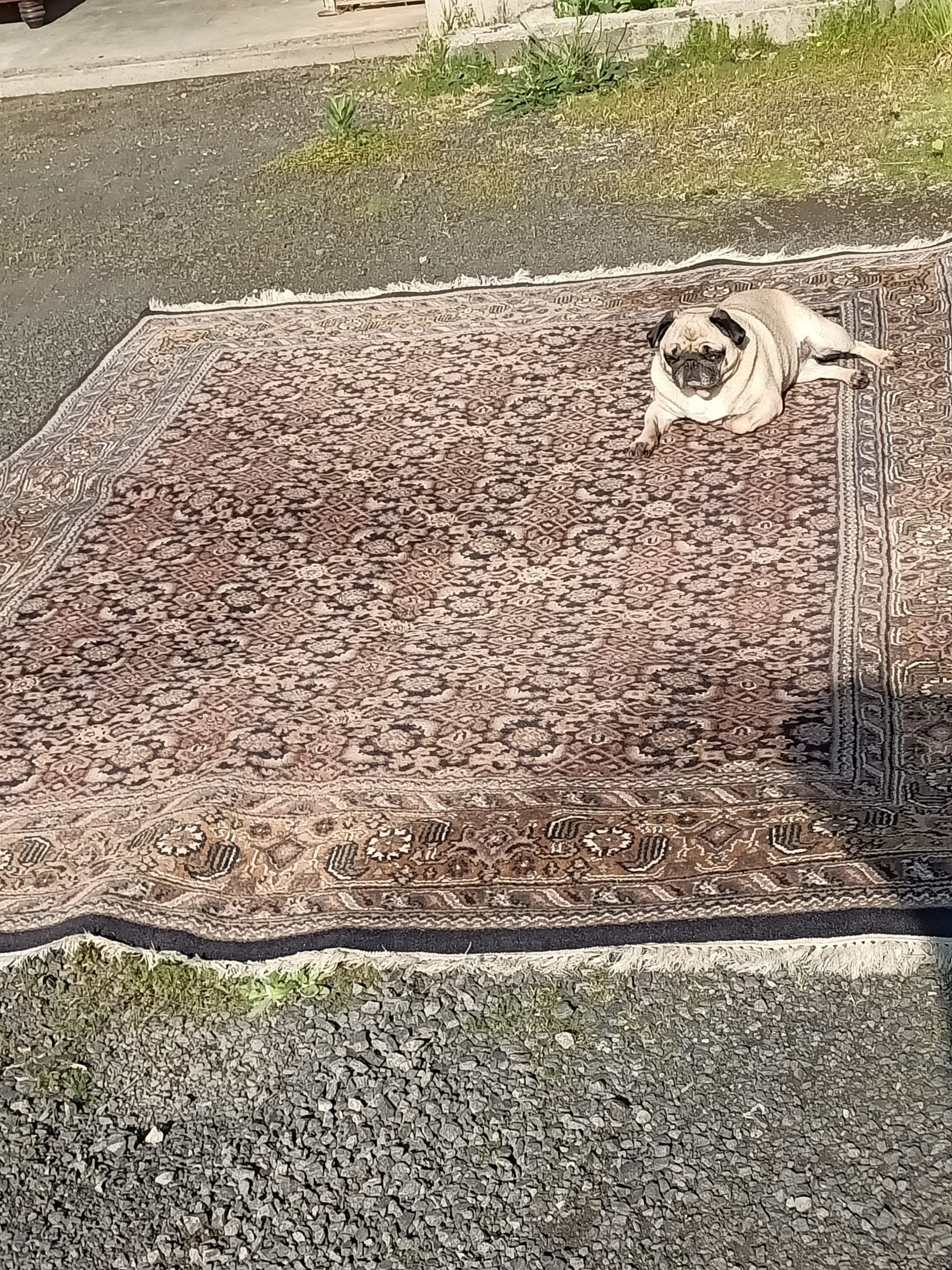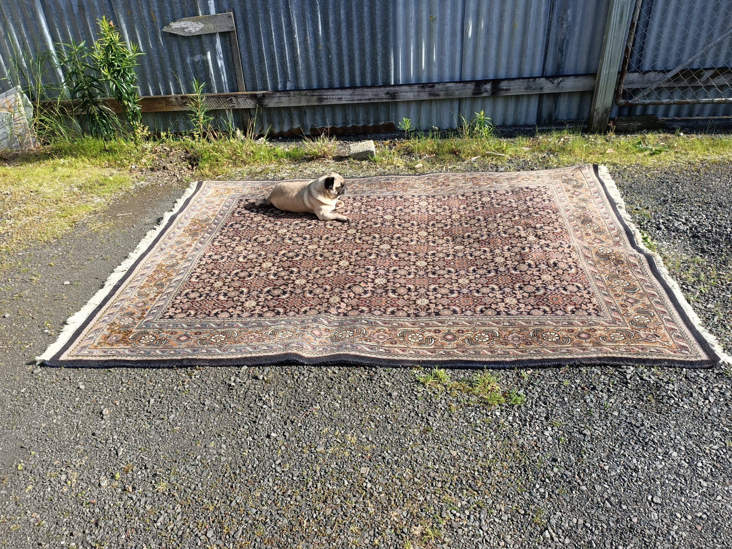 Pugster loves lounging on this finely tightly knotted, thickish napped wool on cotton carpet, Boteh style. Navy blue background with a dense flora and geometric stamp pattern in caramels and light blue. Decent daisy border. This carpet compliments most colour spectrums here in the shop... formal, informal, tans, cocoa, whites, reds, greens. Pretty good condition, longish nap has matted slightly. Very easy to vacuum. Circa 1950.