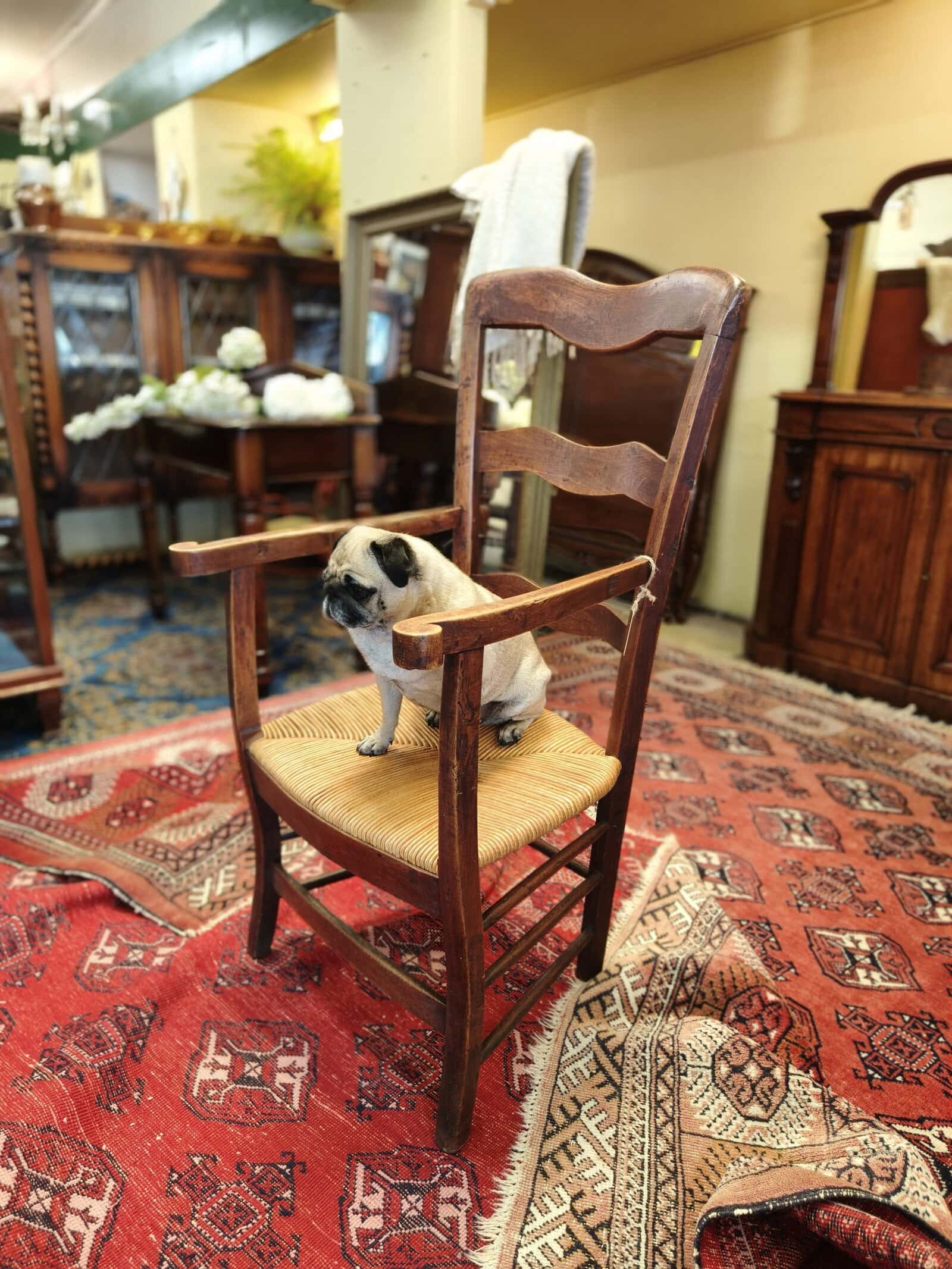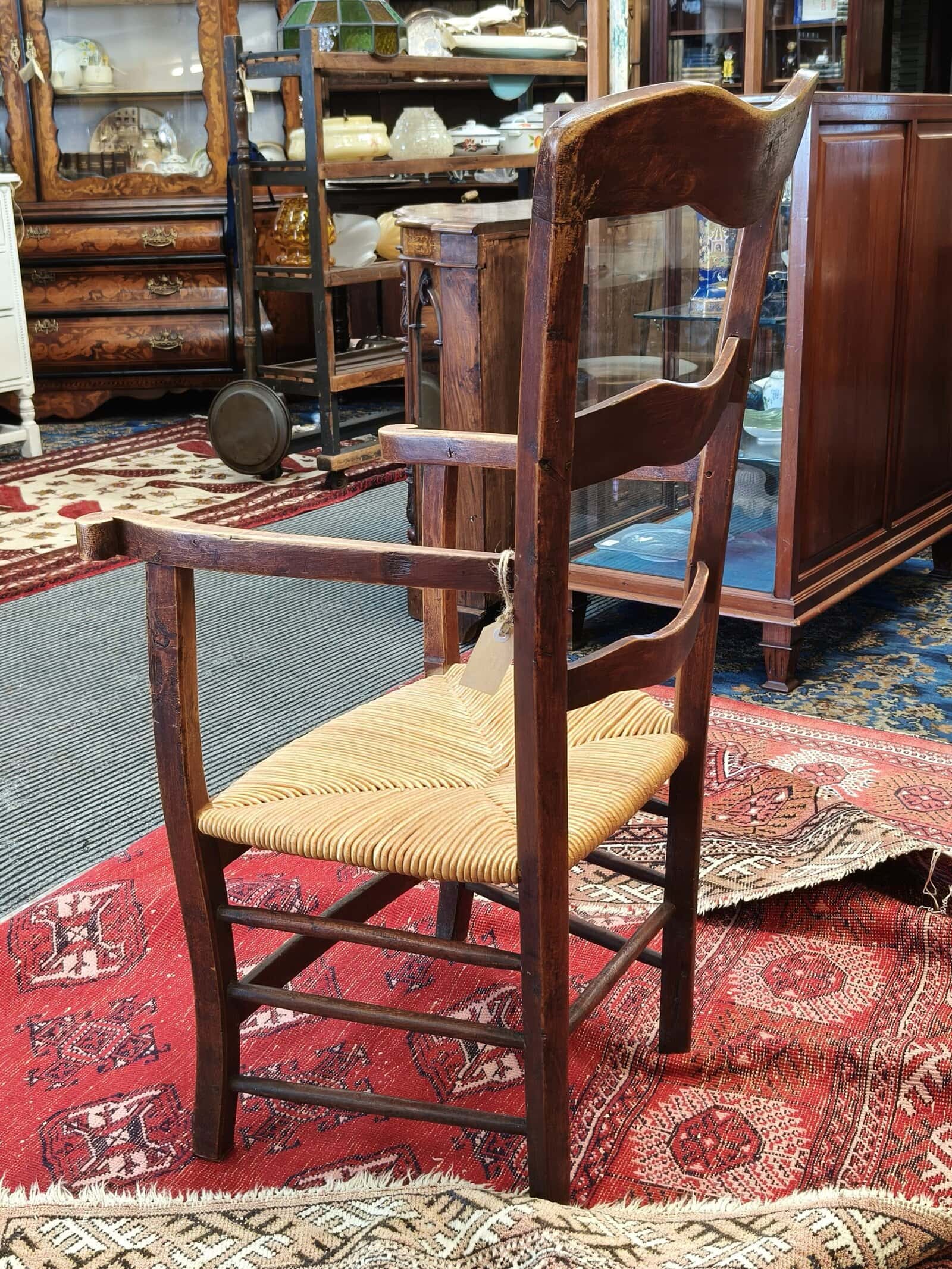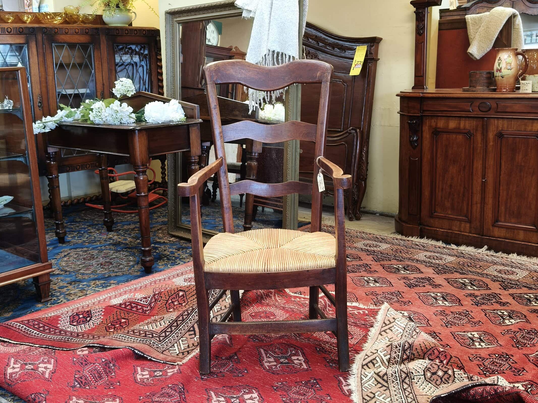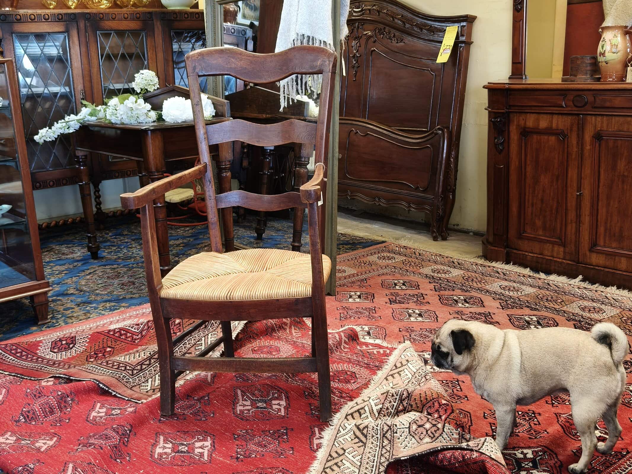 How would you be in 175 years? I think this rustic mid-nineteenth century chestnut carver chair is doing wonderfully for being nearly two hundred years old. French with rough roan stain, patina worn arms. Stretchers and structurally sound. A newer popout rush seat makes for a comfy sit. Some old bug holes in two legs as per pix, priced accordingly. Circa 1850.