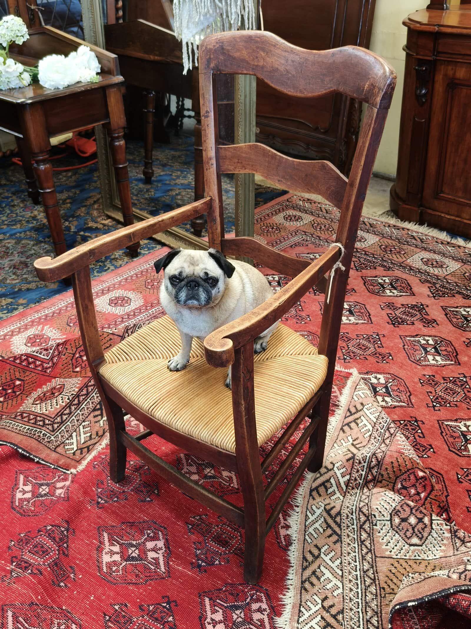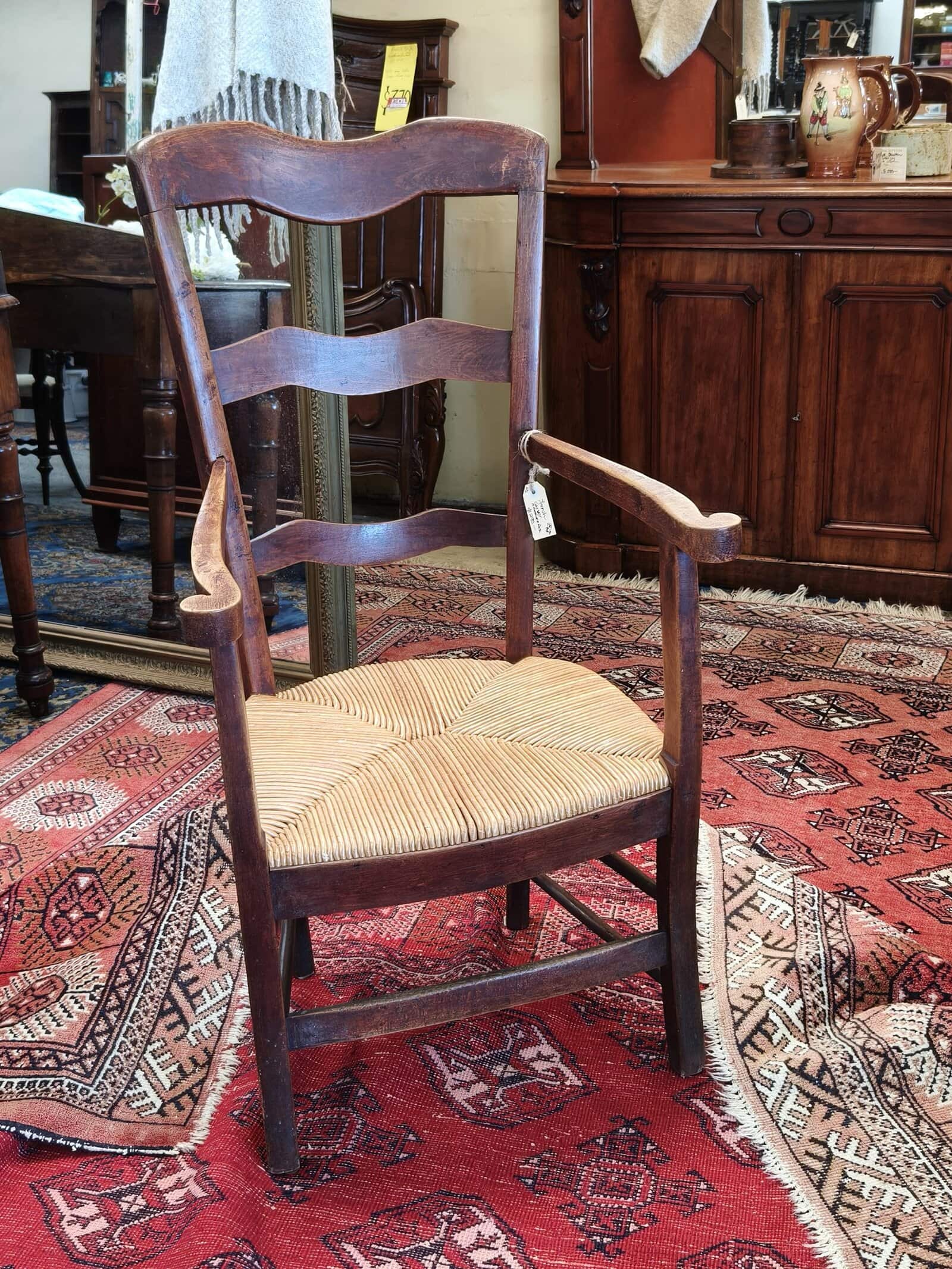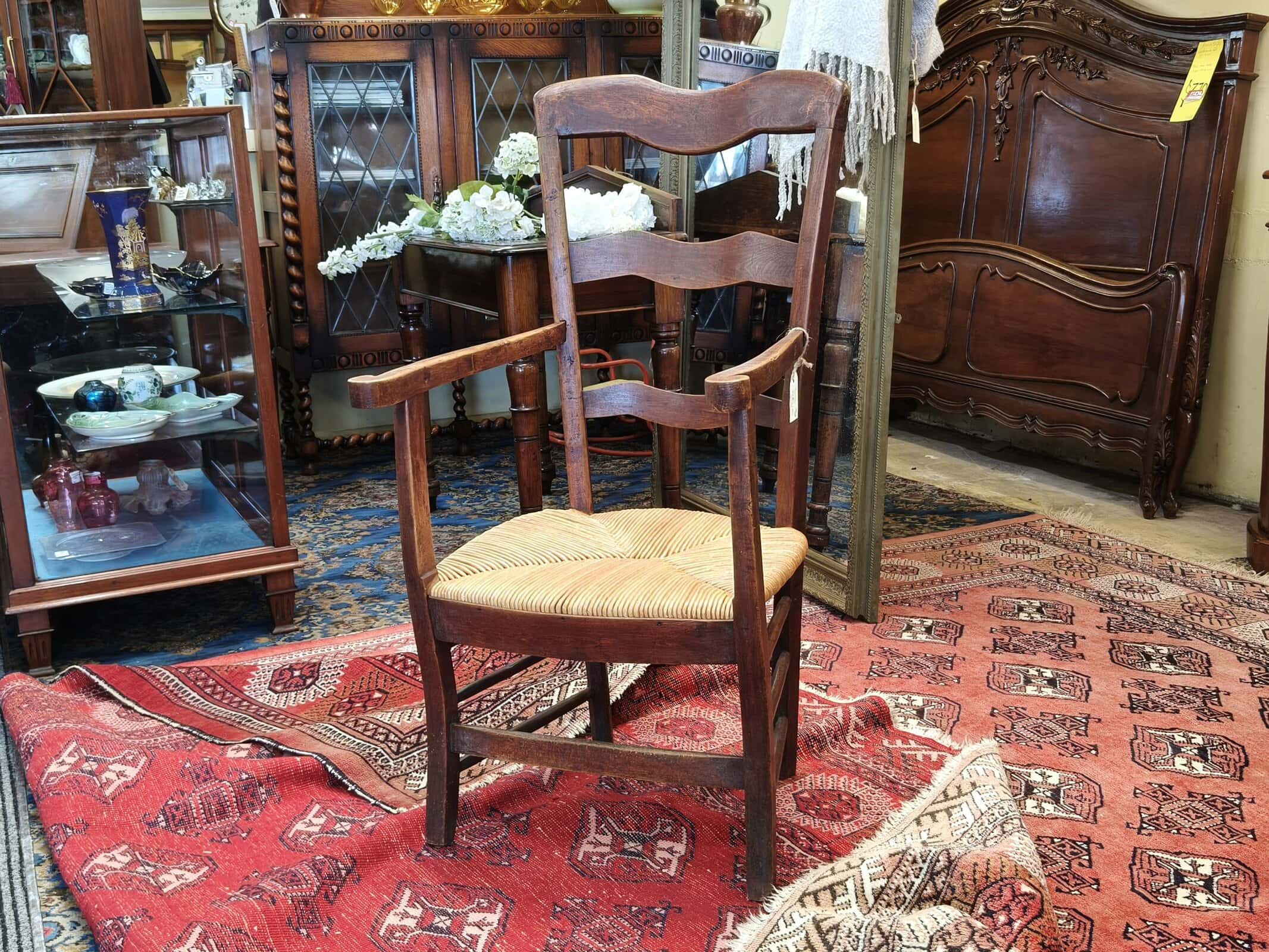 How would you be in 175 years? I think this rustic mid-nineteenth century chestnut carver chair is doing wonderfully for being nearly two hundred years old. French with rough roan stain, patina worn arms. Stretchers and structurally sound. A newer popout rush seat makes for a comfy sit. Some old bug holes in two legs as per pix, priced accordingly. Circa 1850.