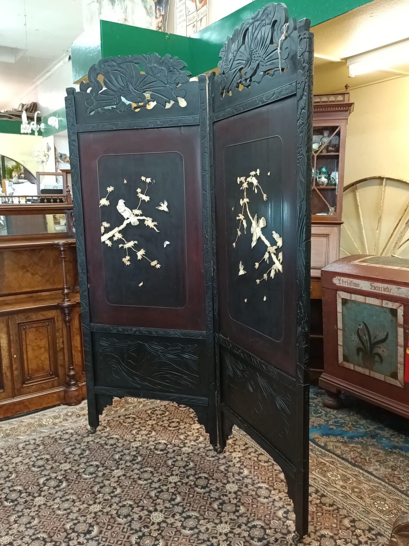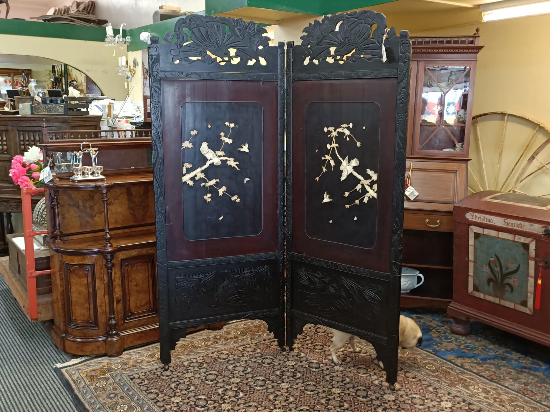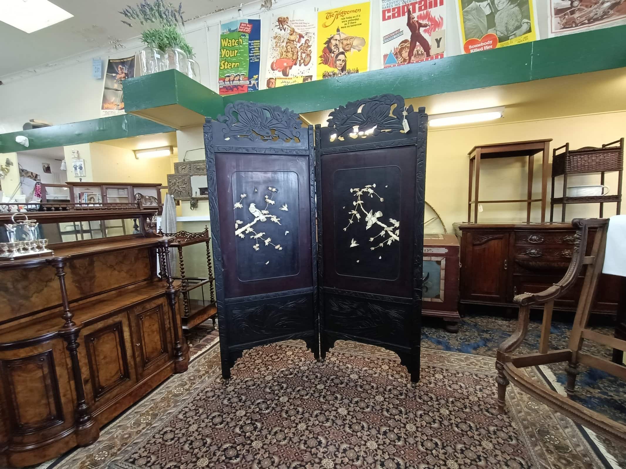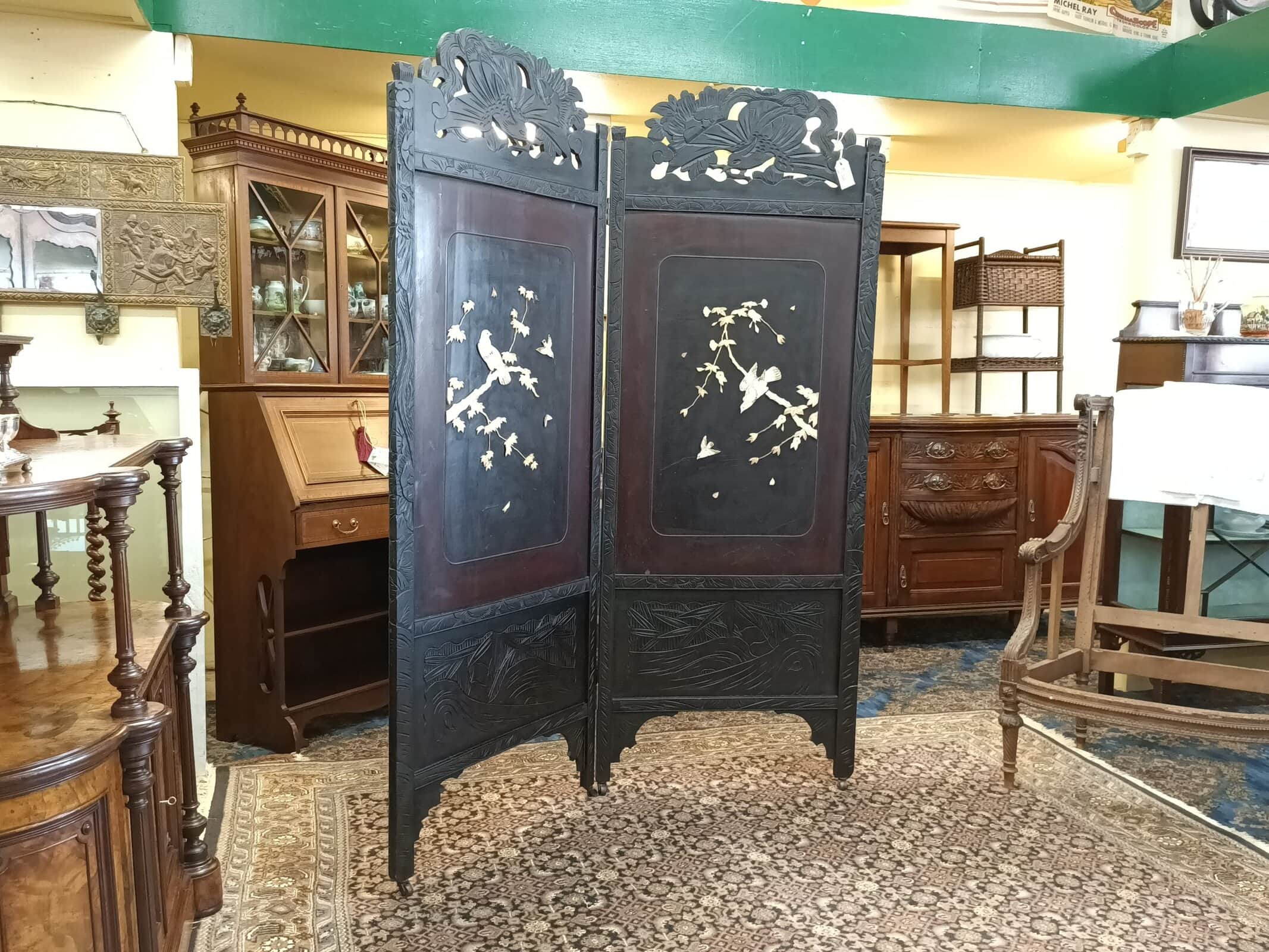 Mmm, love a bit of Chinoiserie me. This beautiful two partition English bedroom screen is fresh from a little resto and massive clean-up. Studded with carved bone birds in maple trees. Filigreed lyre bird tops. Upon castors. Ebonized. Could be a fantastic wall mounted bed head. Some bone losses and scuffs commensurate with age. Circa 1890.