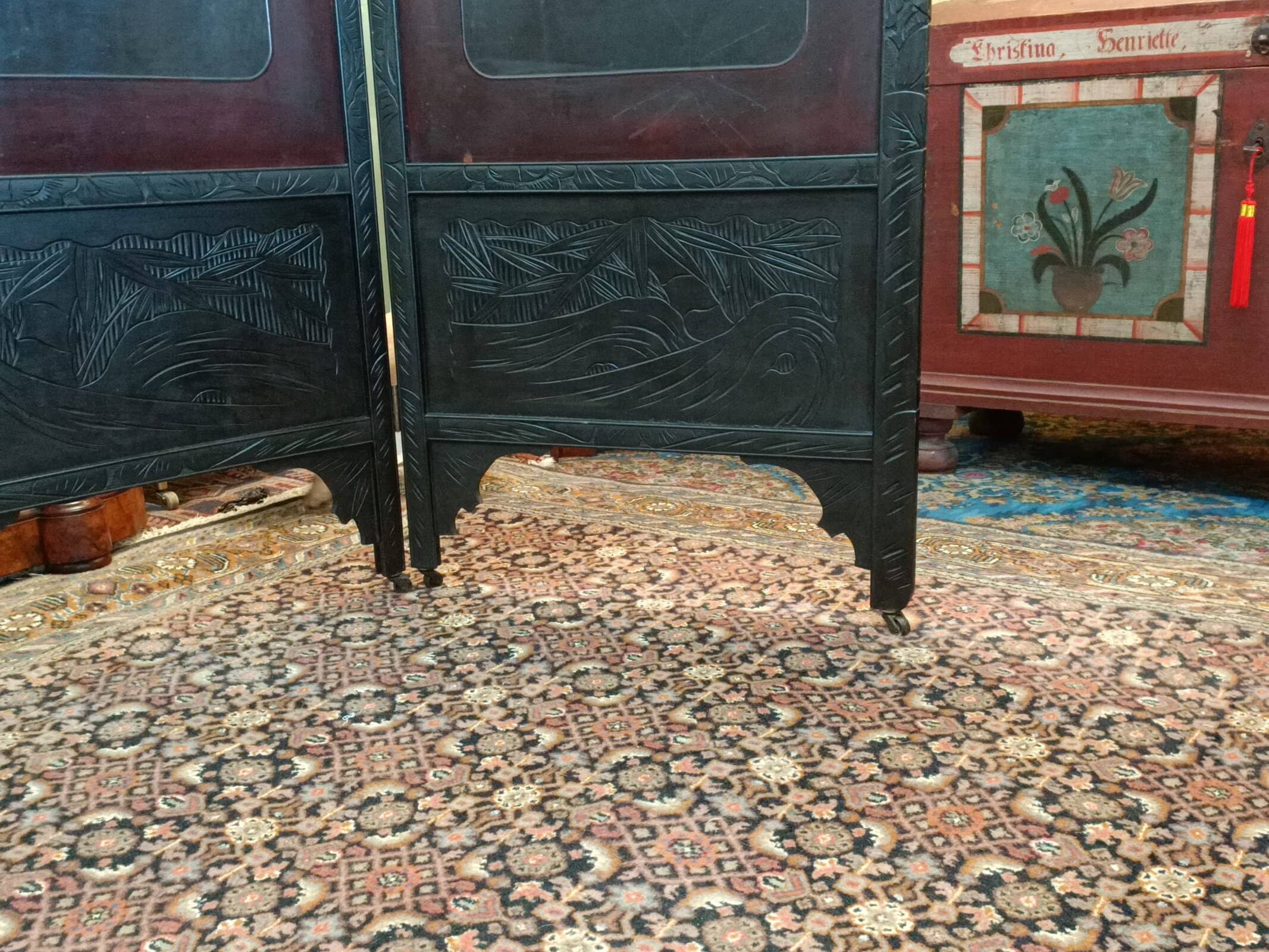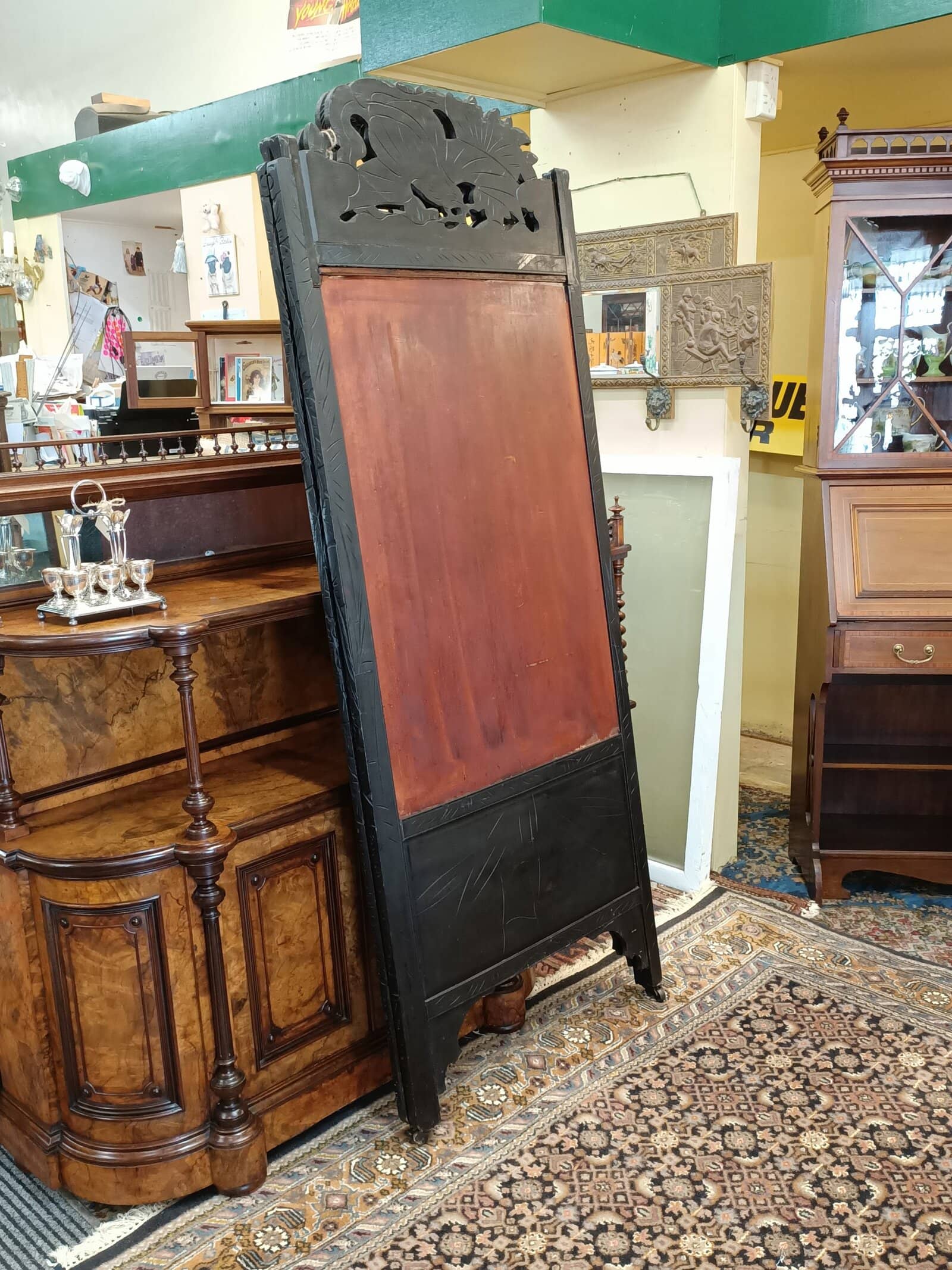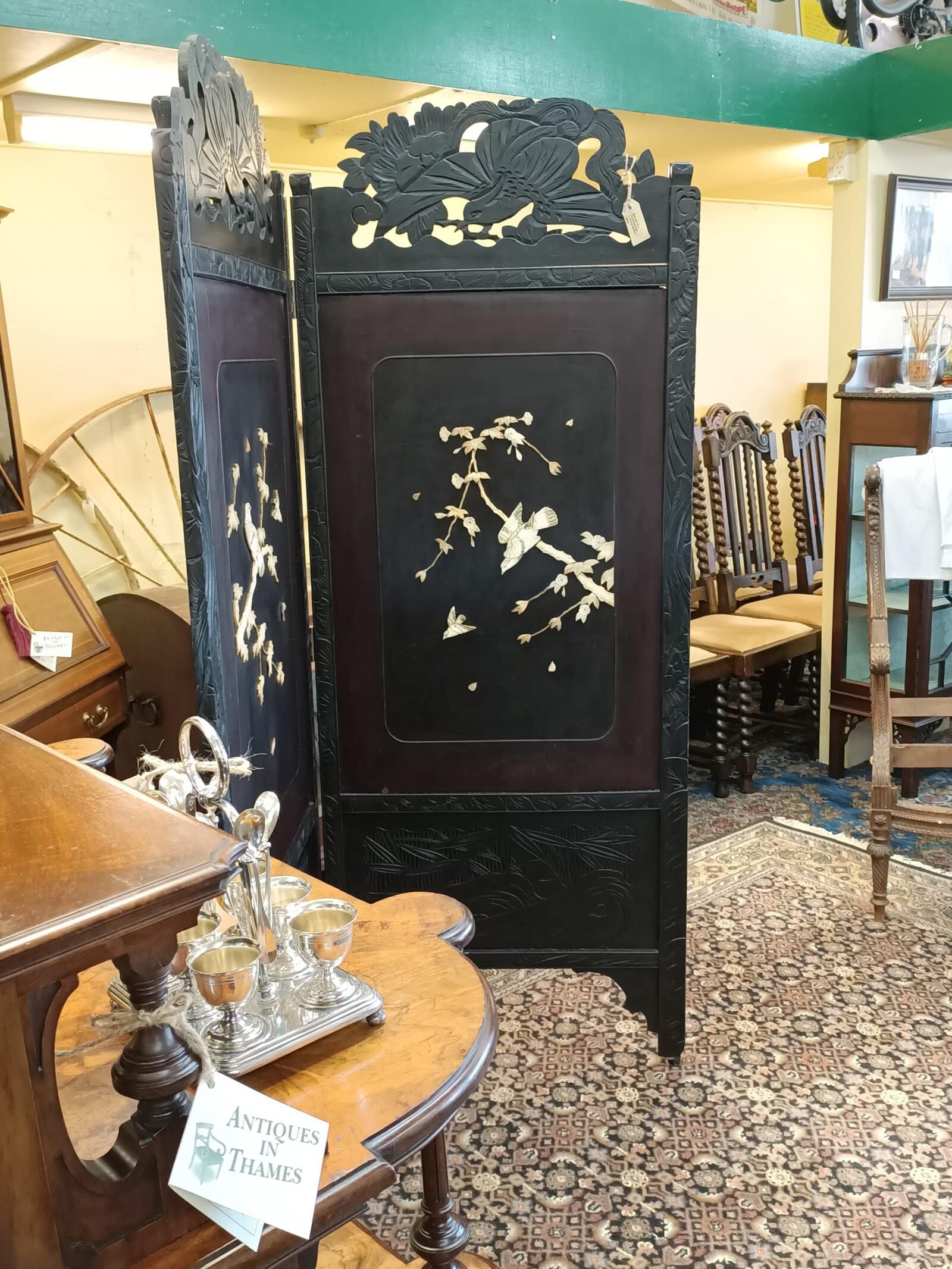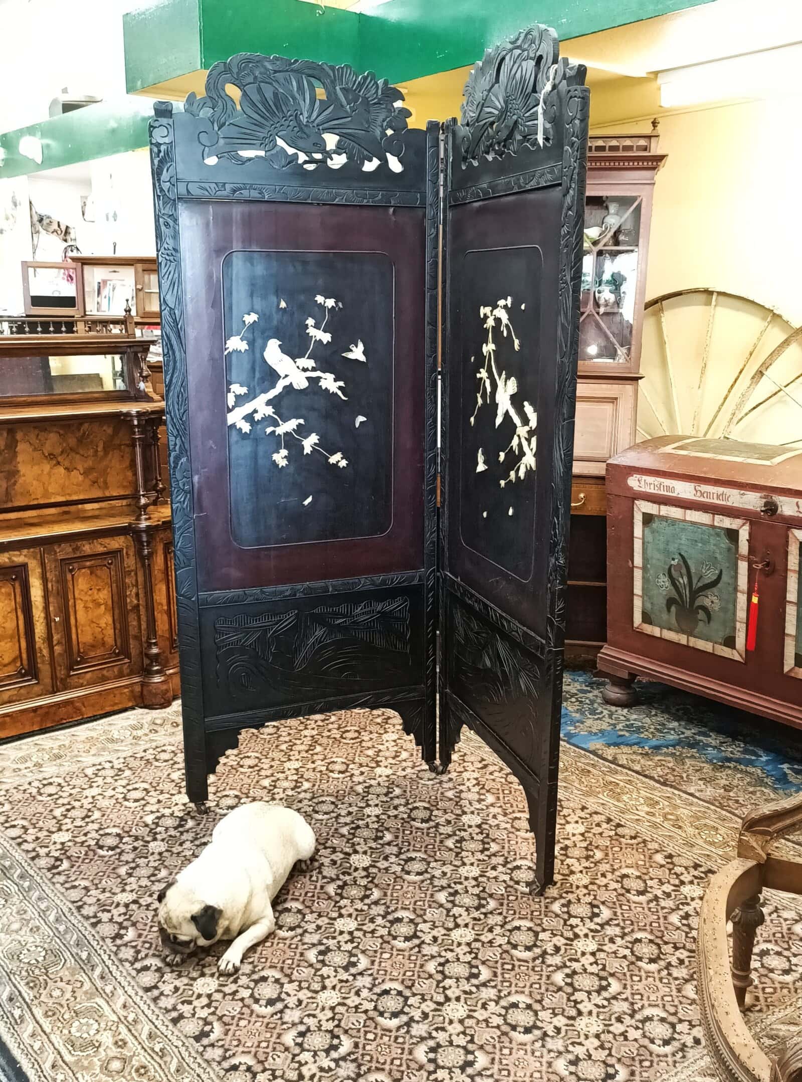 Mmm, love a bit of Chinoiserie me. This beautiful two partition English bedroom screen is fresh from a little resto and massive clean-up. Studded with carved bone birds in maple trees. Filigreed lyre bird tops. Upon castors. Ebonized. Could be a fantastic wall mounted bed head. Some bone losses and scuffs commensurate with age. Circa 1890.