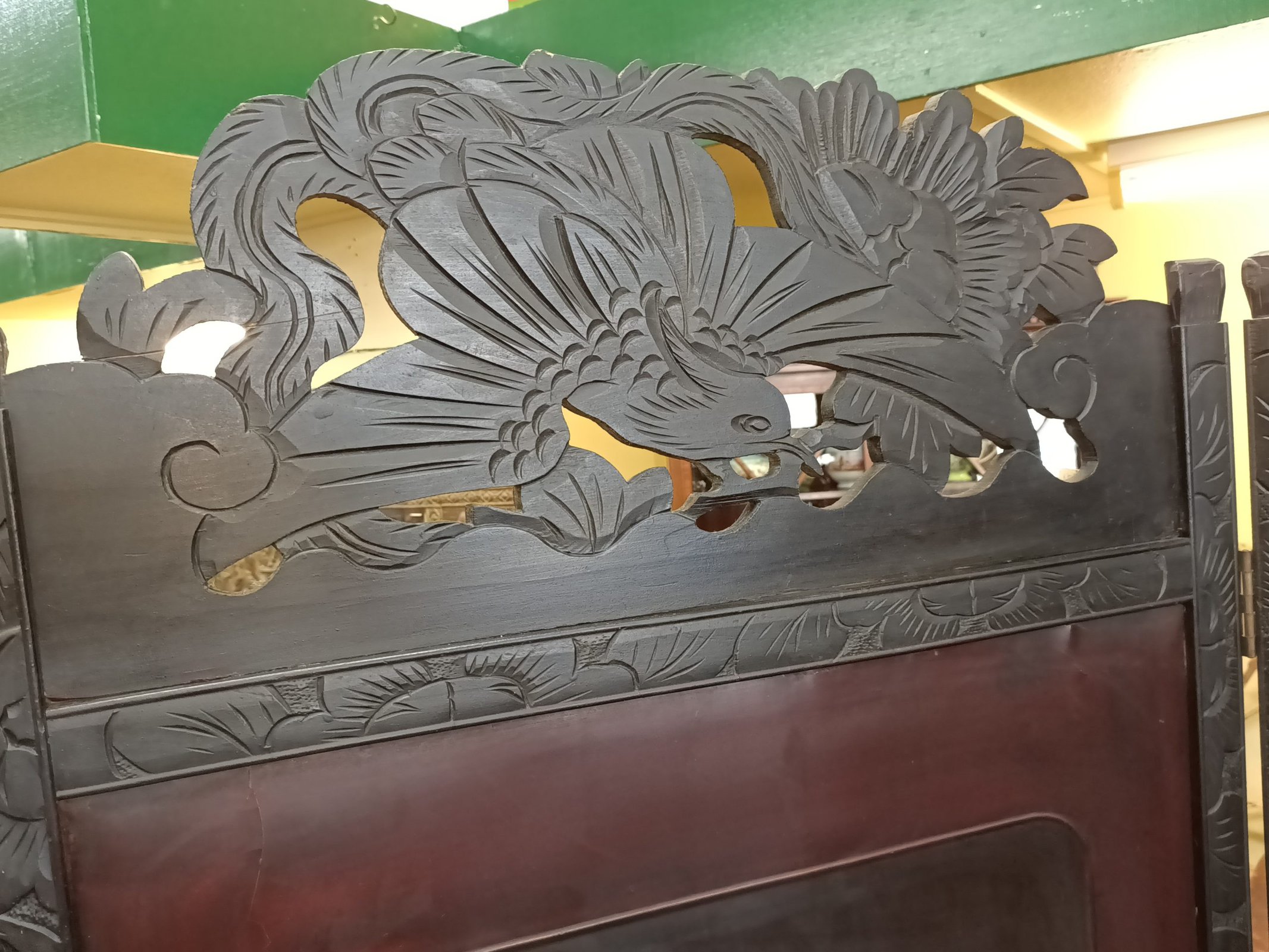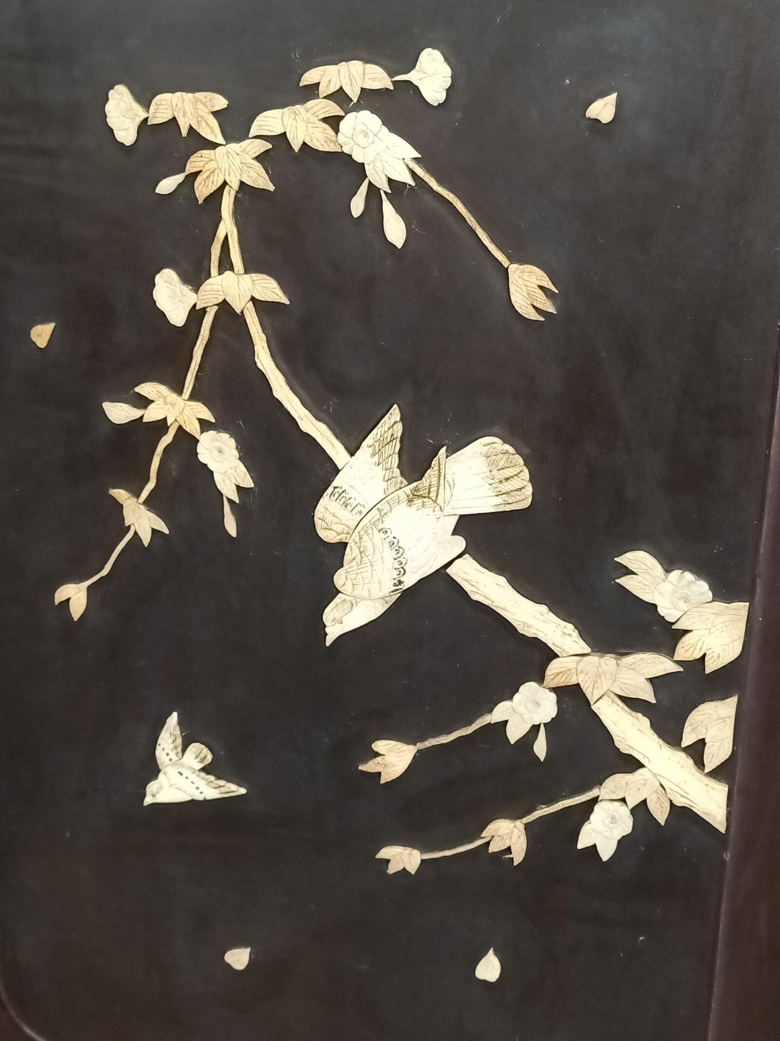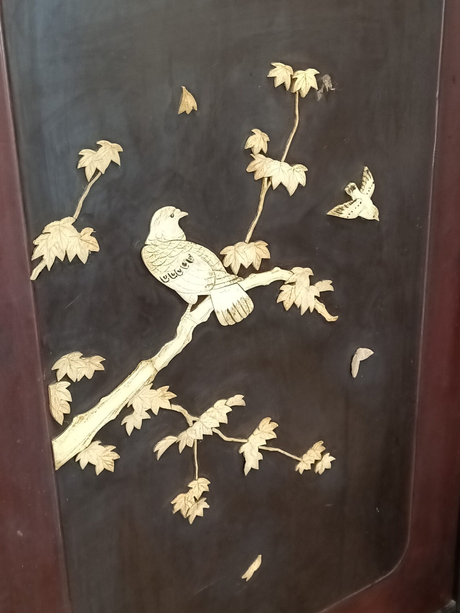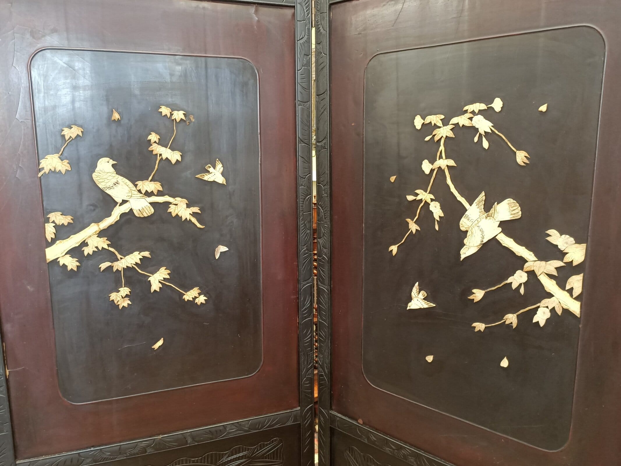 Mmm, love a bit of Chinoiserie me. This beautiful two partition English bedroom screen is fresh from a little resto and massive clean-up. Studded with carved bone birds in maple trees. Filigreed lyre bird tops. Upon castors. Ebonized. Could be a fantastic wall mounted bed head. Some bone losses and scuffs commensurate with age. Circa 1890.