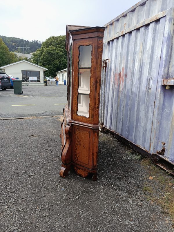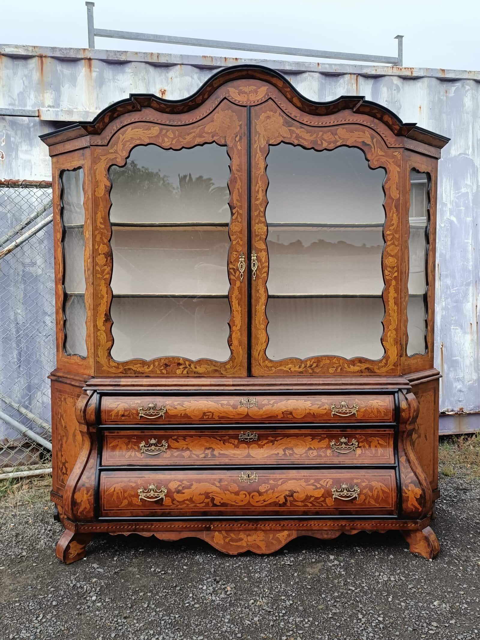 The BOMBE. A fantastic mid Century 20, Dutch all over marquetry cabinet and bombe drawers. Fantastical marquetry depicting jungle creatures and mythical animals, cherubs, flora, scrolls. Big wider upper cabinet freshly lined in neutral linen. Three lower graduated drawers. Upon curvy feet. Excellent condition, and ready to be filled with a sh*te load of gear. We have significantly improved this cabinet with new lining (no longer stretchy red velour), repairs to the marquetry, and toning down the orange. Stunning presentation of your glassware, dinner service, figurines, fossils, artefacts, books. This bombe baby needs a big space, so you can sit back and admire her! Circa 1950.