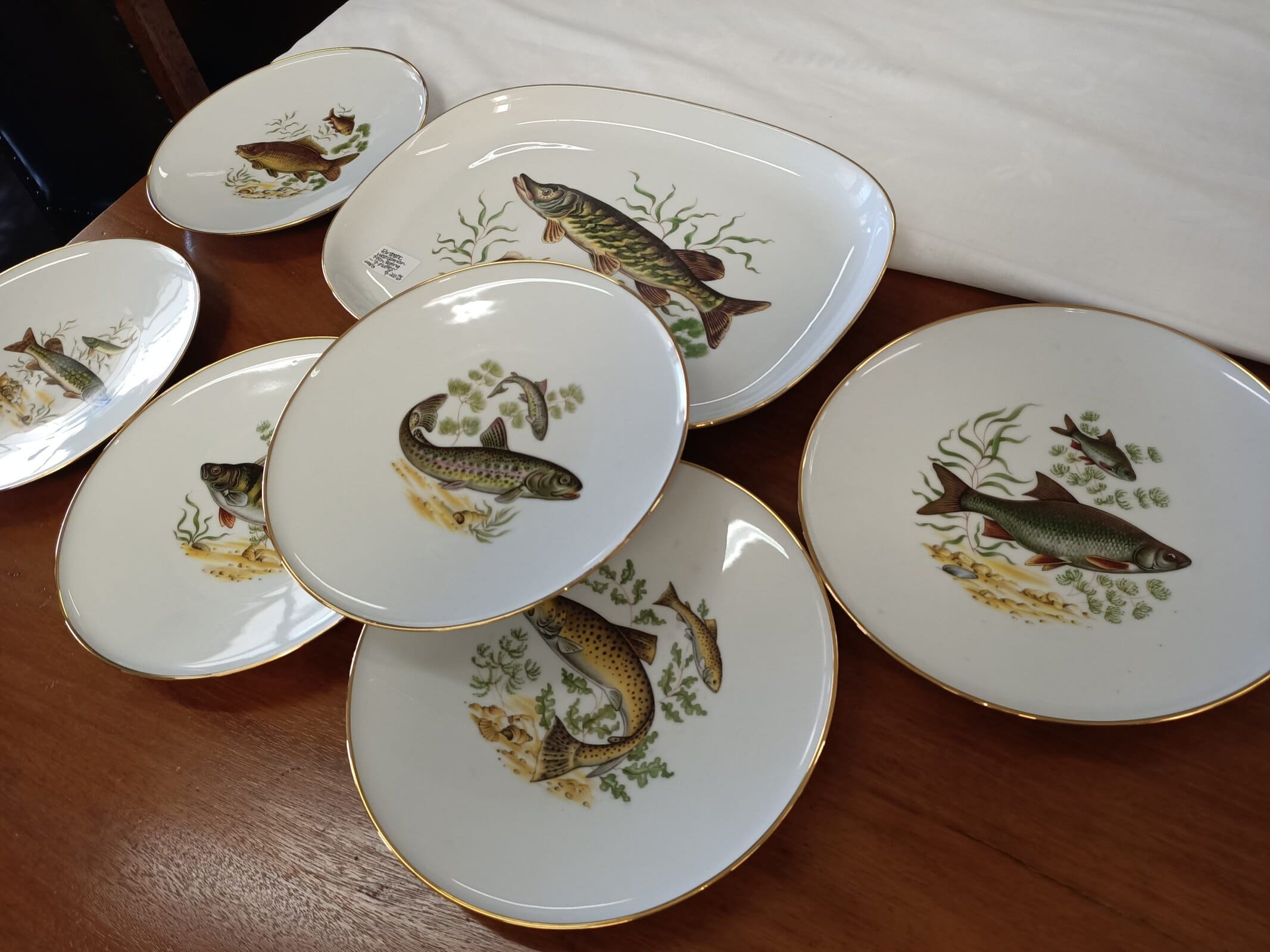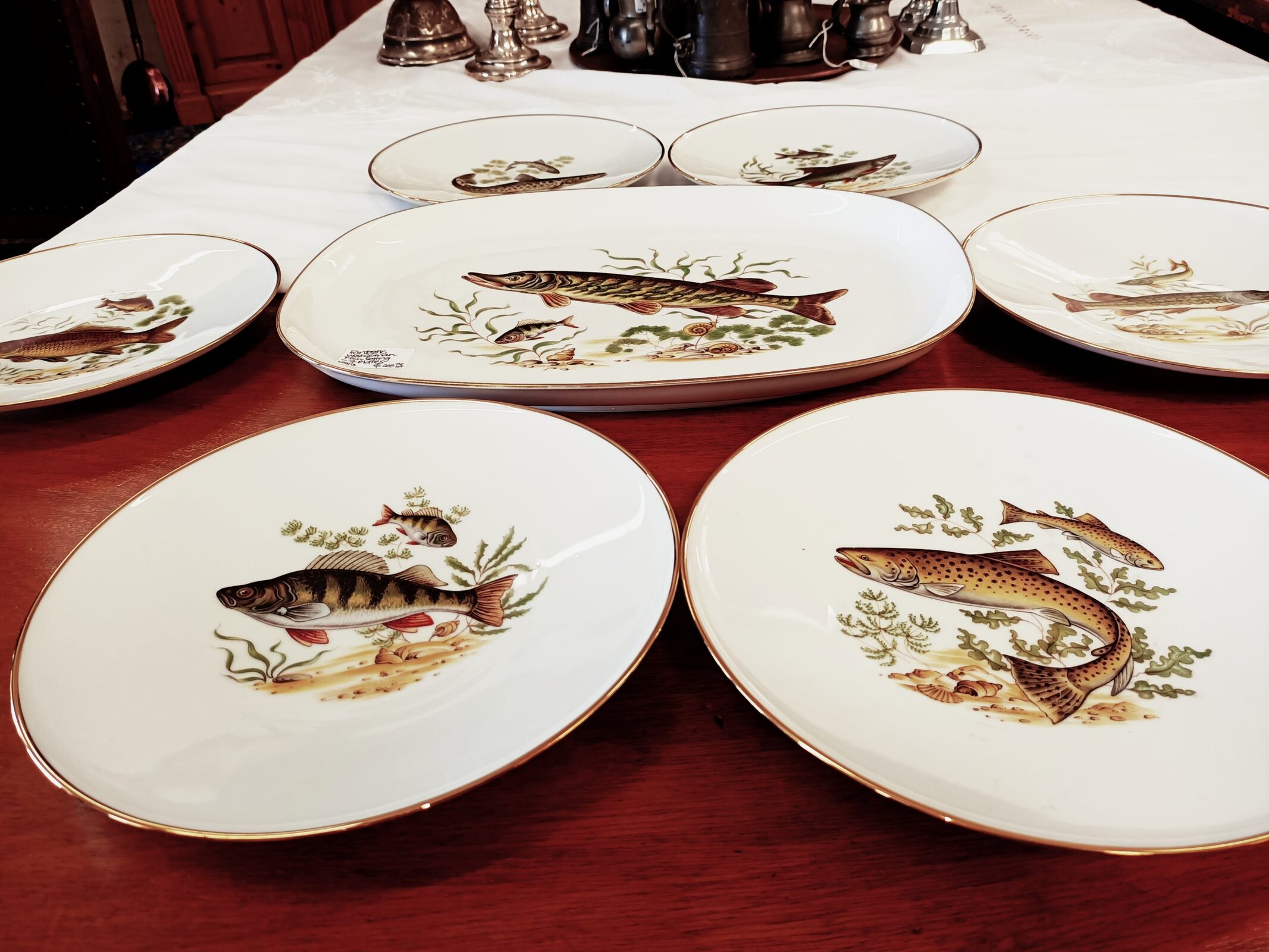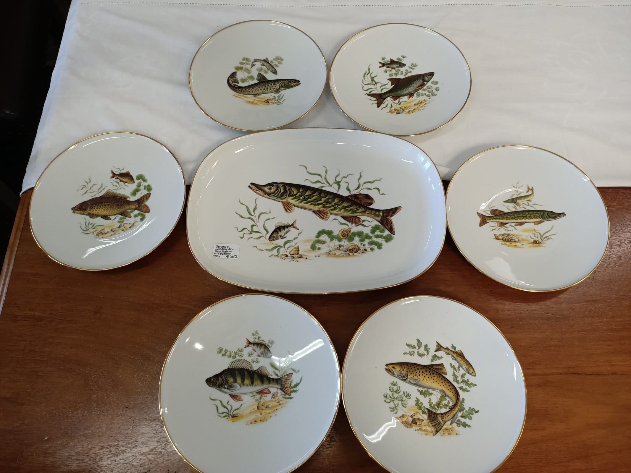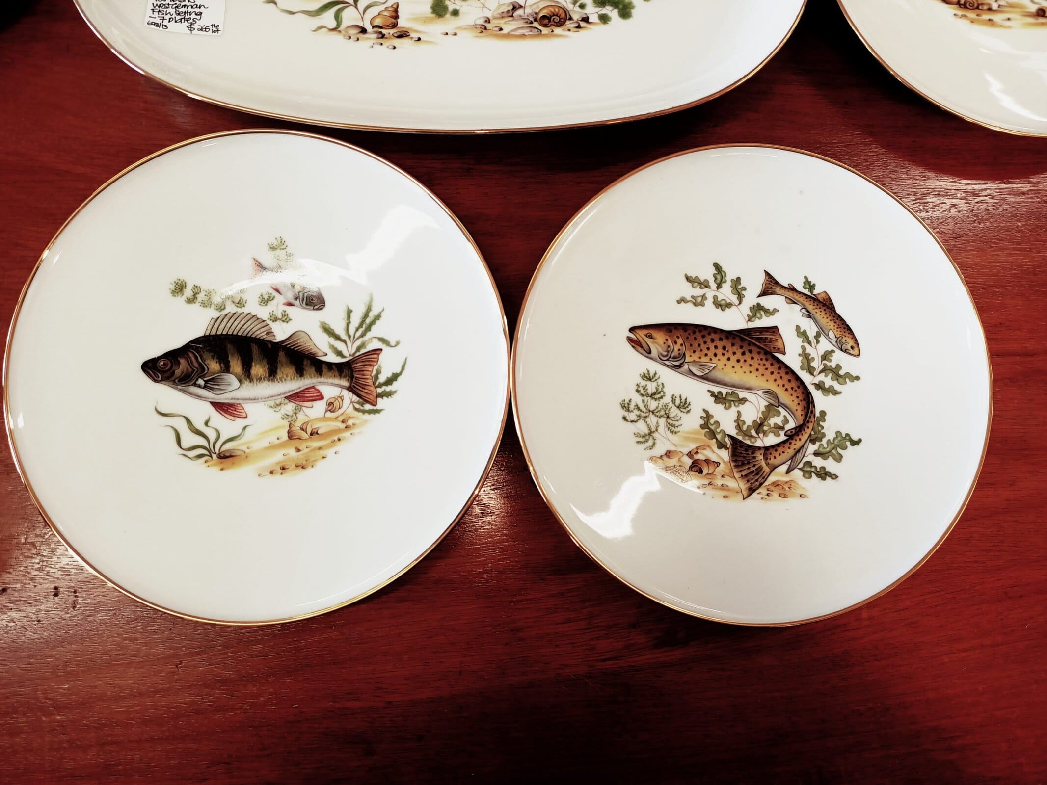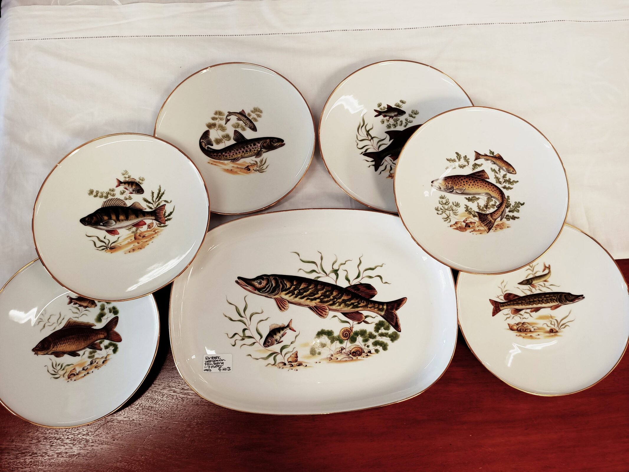 fush. Here's a set of West German freshwater fischen plates. Six round dinner plates 275 diameter plus a rectangular serving platter 400 long. Lovely life like graphics, and all-over excellent condition and gilding intact. a perfect set for the wall or display or using for special occasions. Handwash only. Circa 1950. Being sold as a set of seven for $265.00.