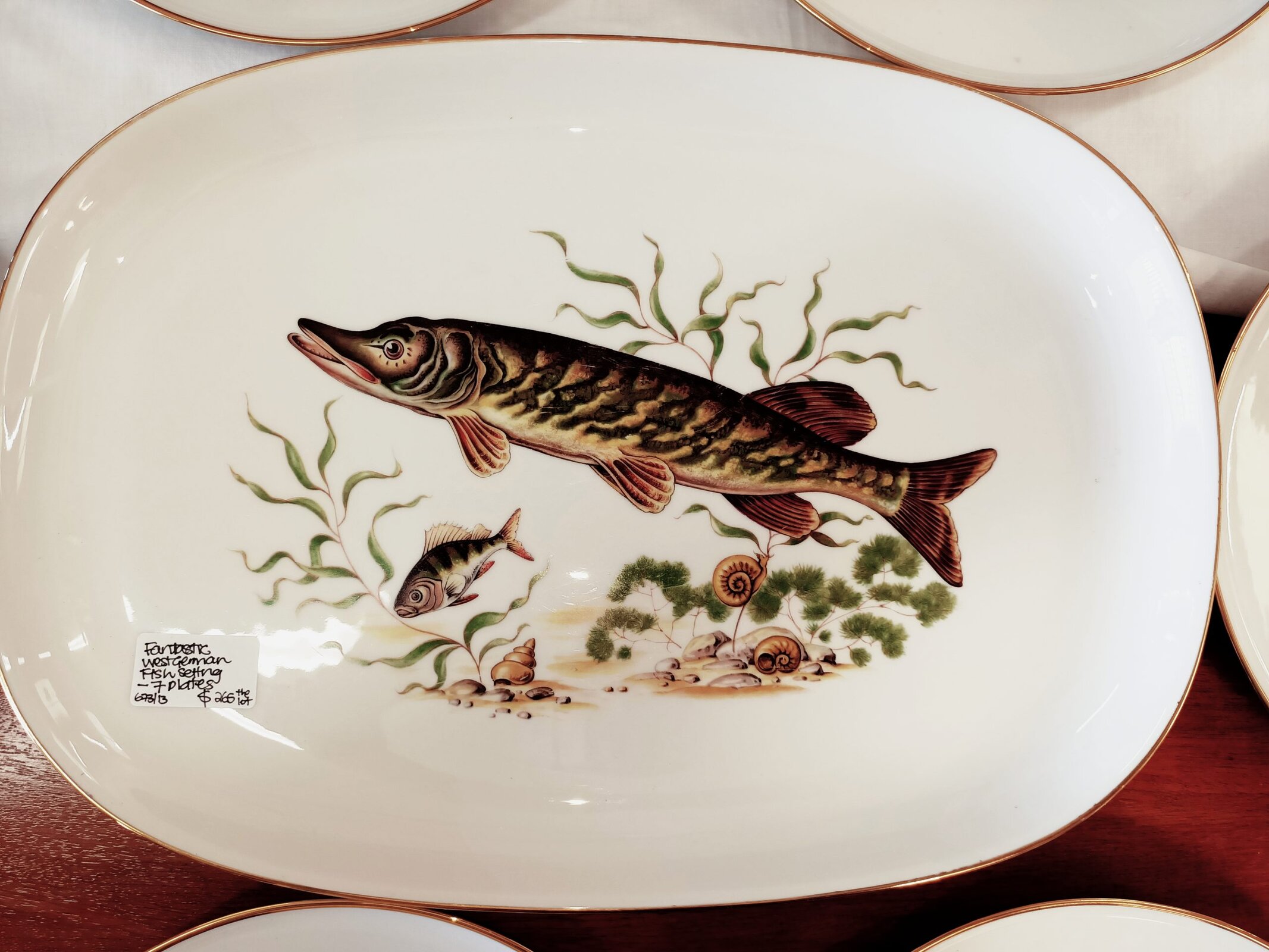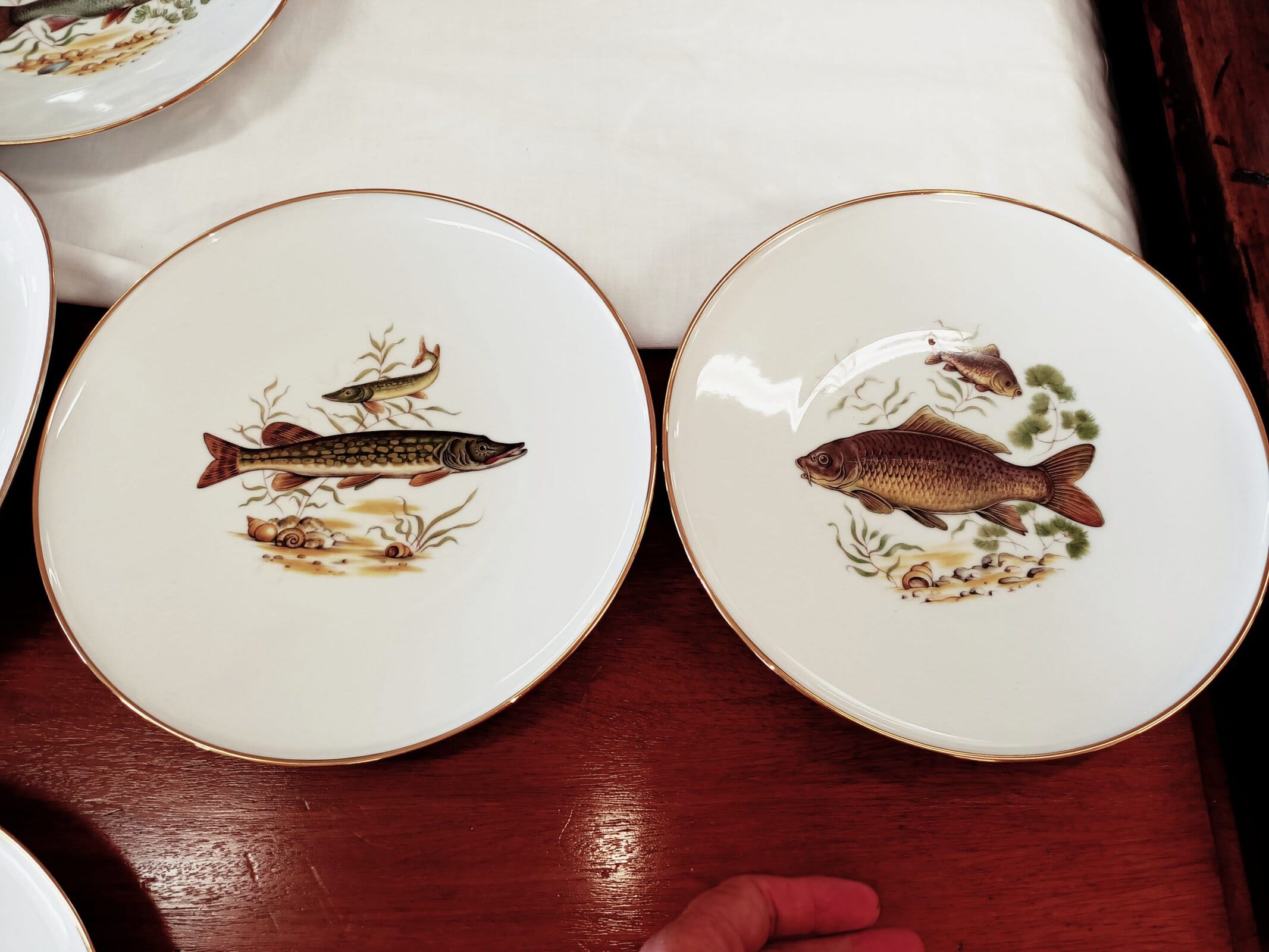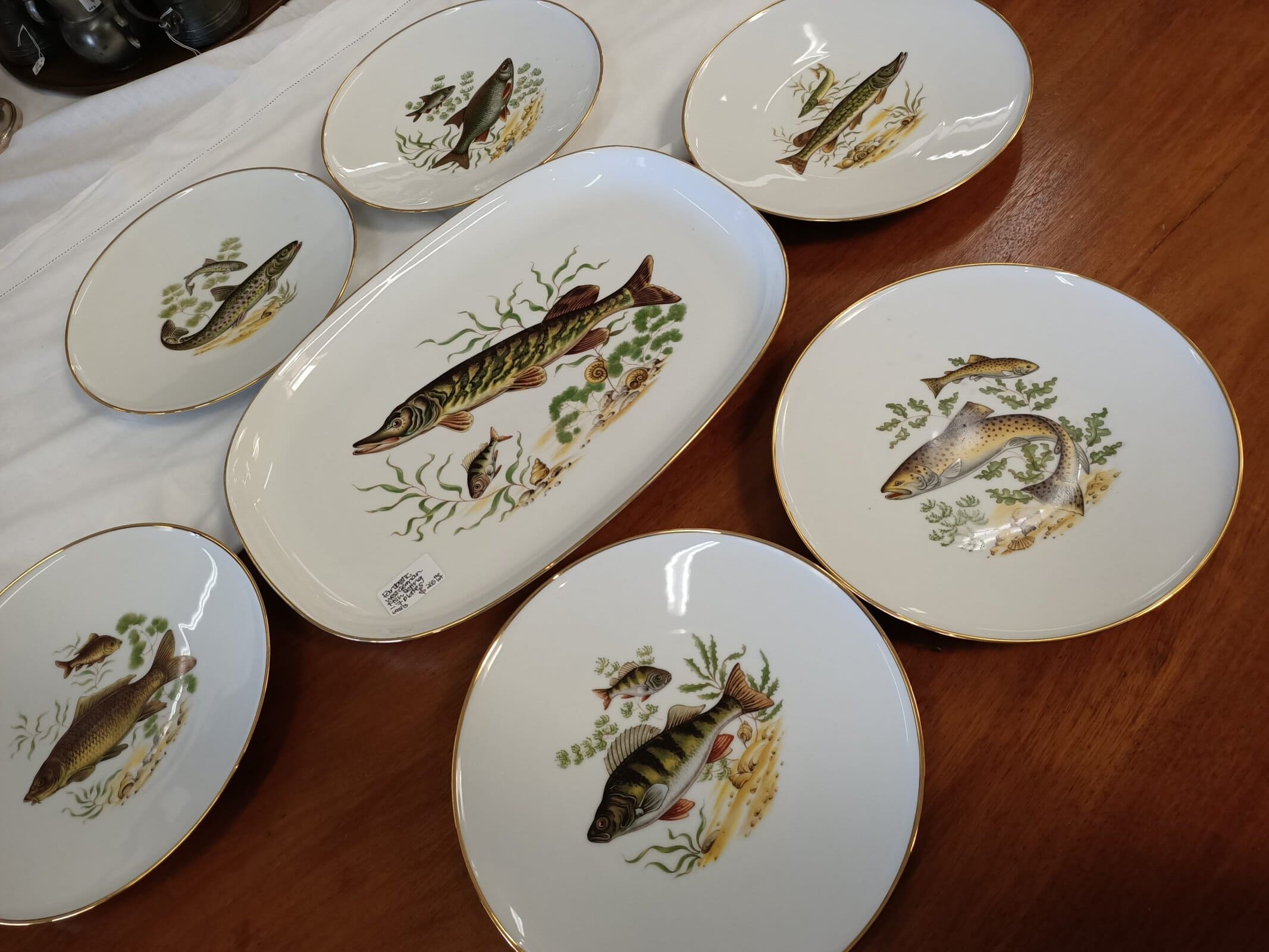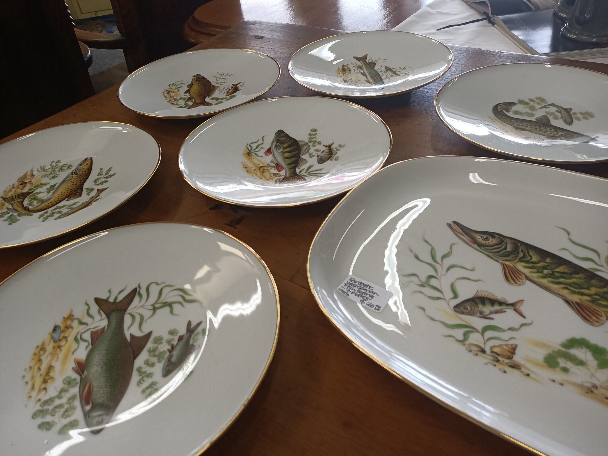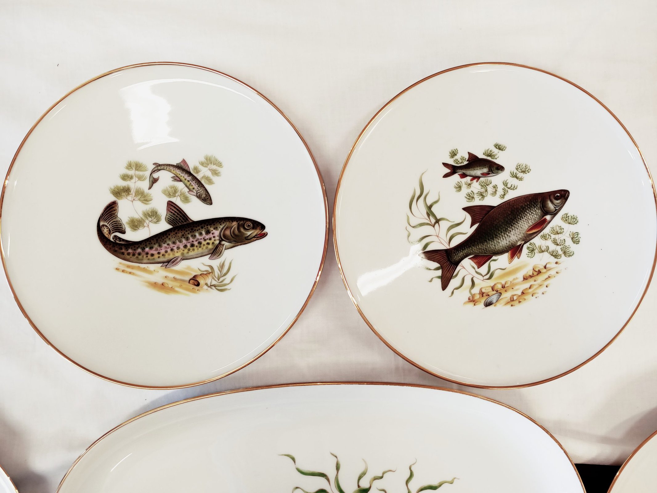 fush. Here's a set of West German freshwater fischen plates. Six round dinner plates 275 diameter plus a rectangular serving platter 400 long. Lovely life like graphics, and all-over excellent condition and gilding intact. a perfect set for the wall or display or using for special occasions. Handwash only. Circa 1950. Being sold as a set of seven for $265.00.