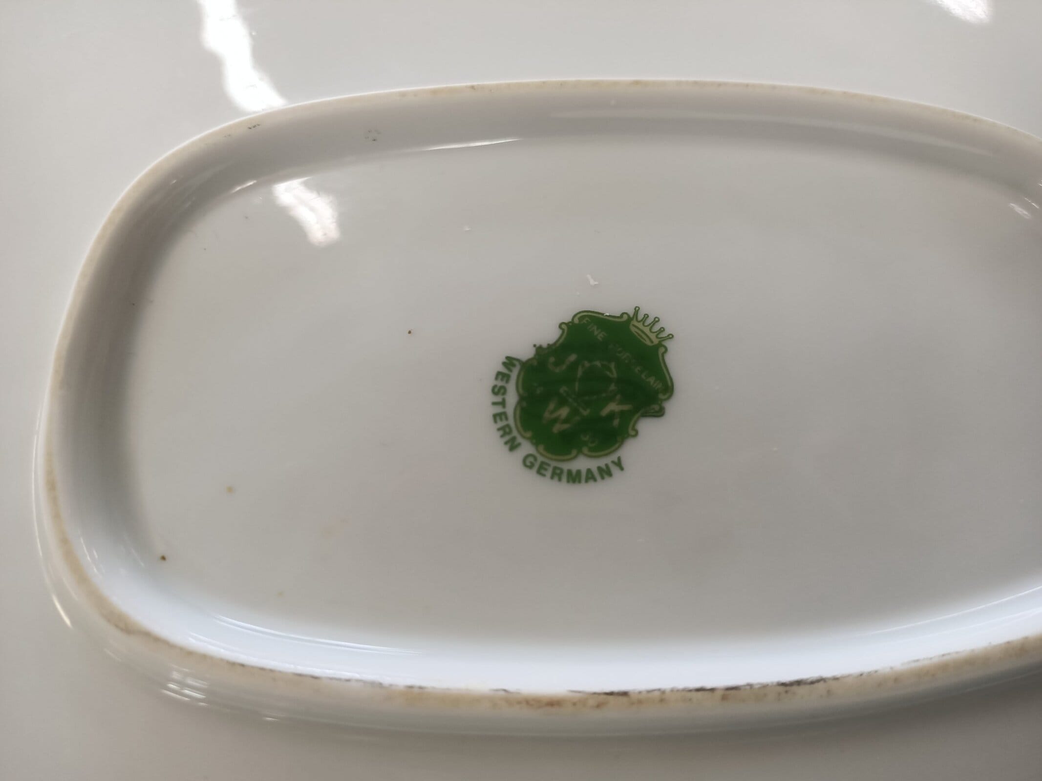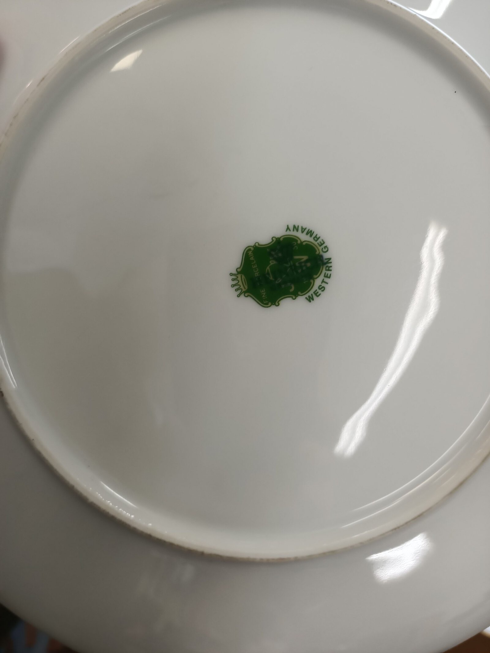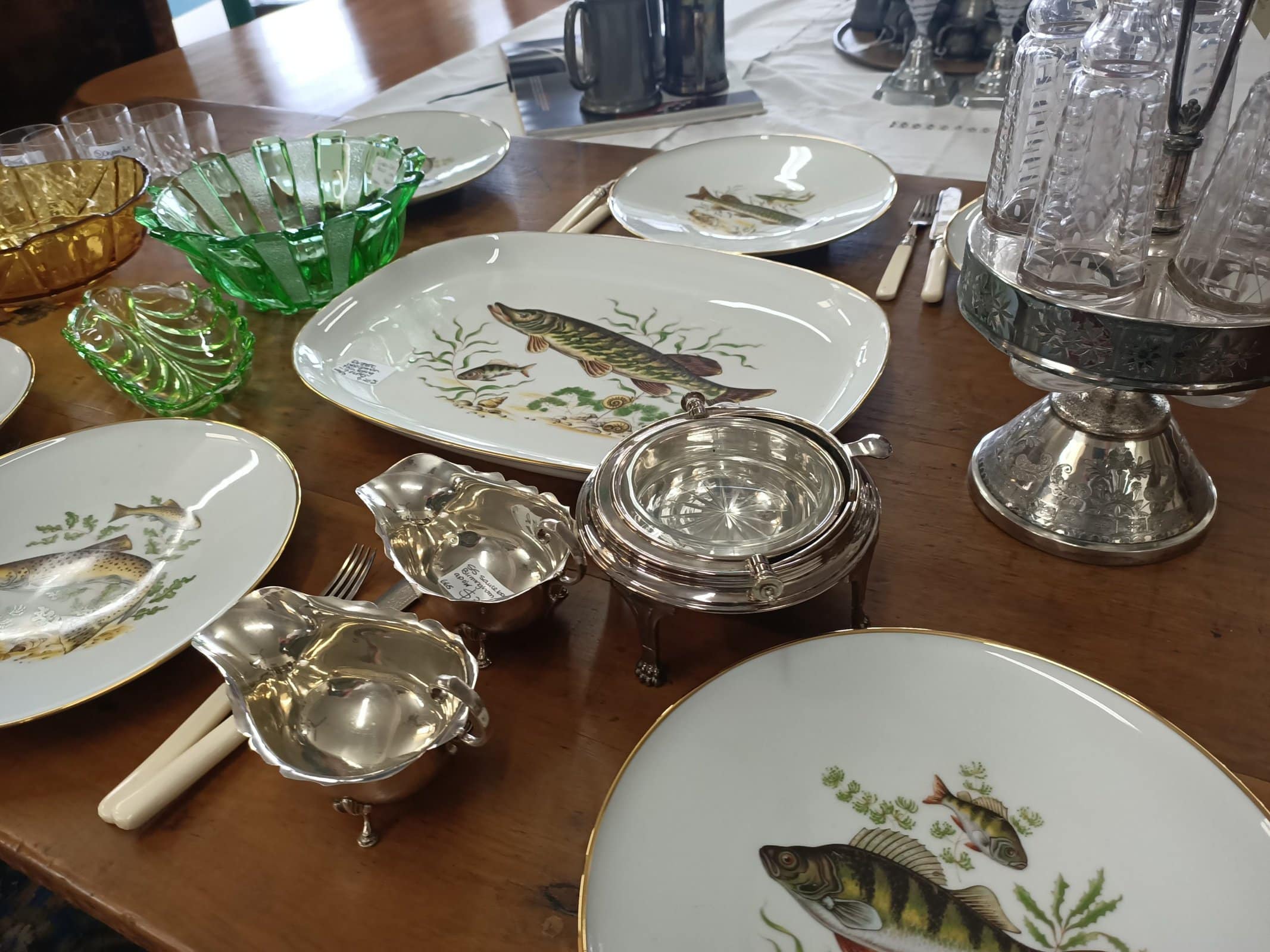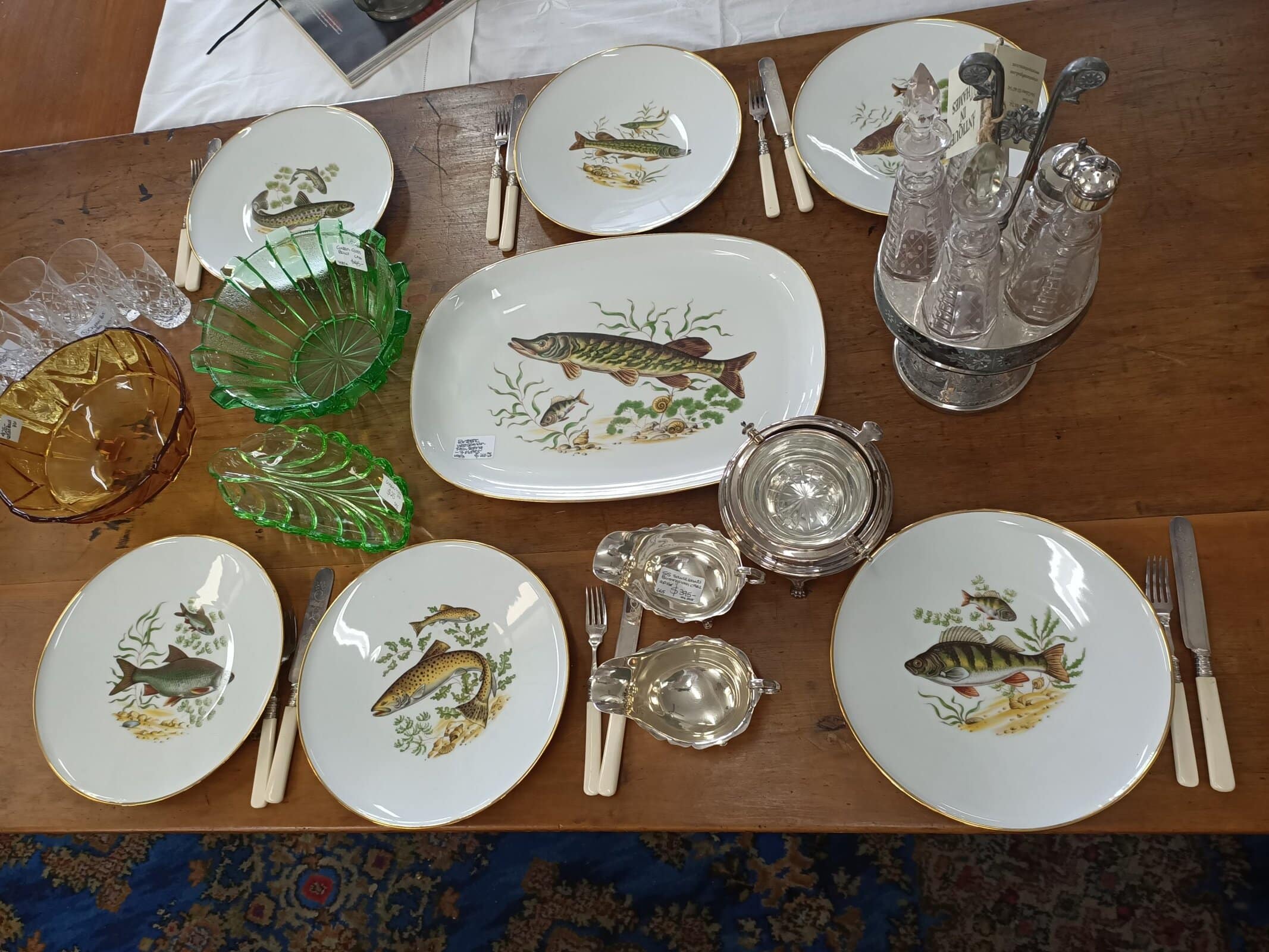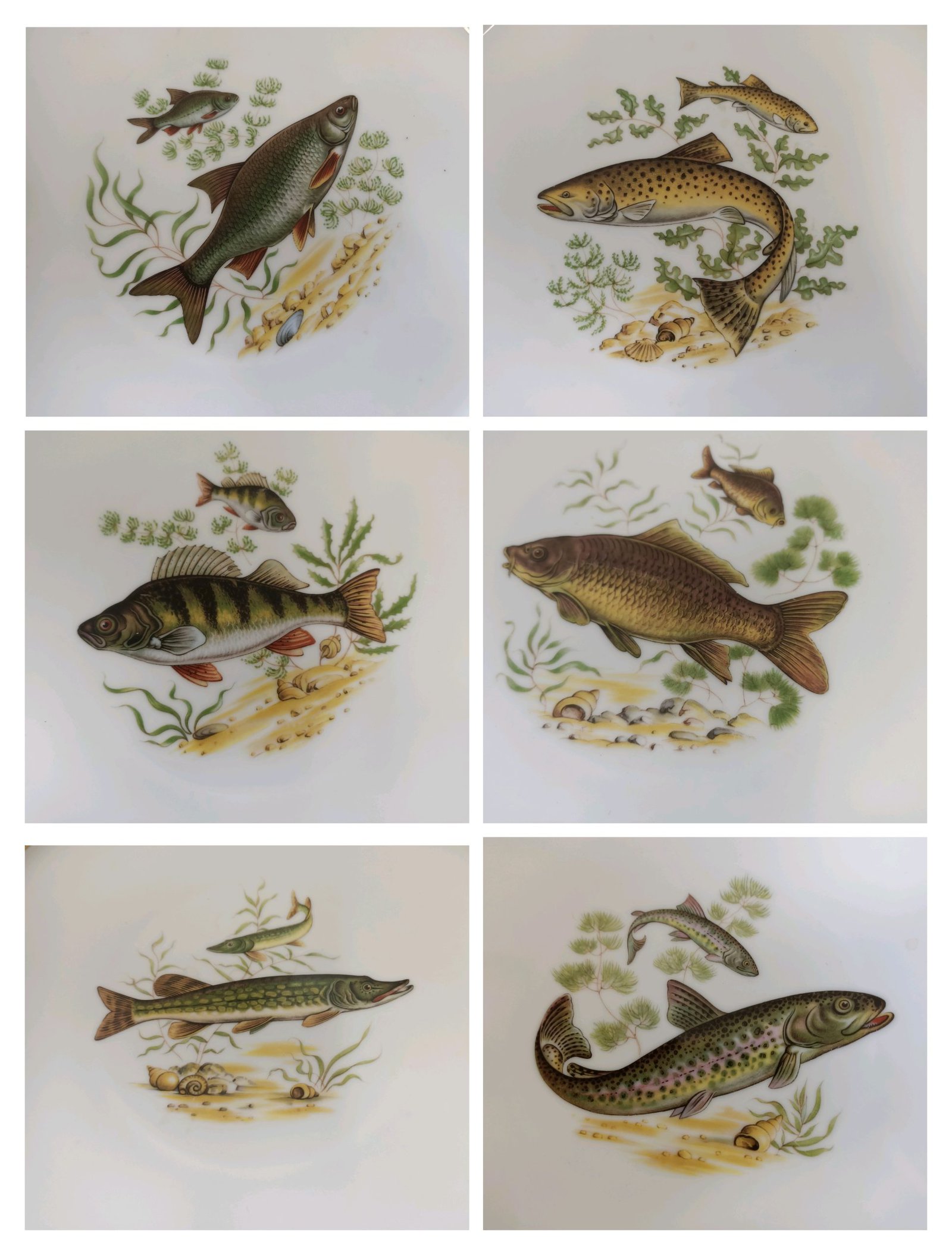 fush. Here's a set of West German freshwater fischen plates. Six round dinner plates 275 diameter plus a rectangular serving platter 400 long. Lovely life like graphics, and all-over excellent condition and gilding intact. a perfect set for the wall or display or using for special occasions. Handwash only. Circa 1950. Being sold as a set of seven for $265.00.