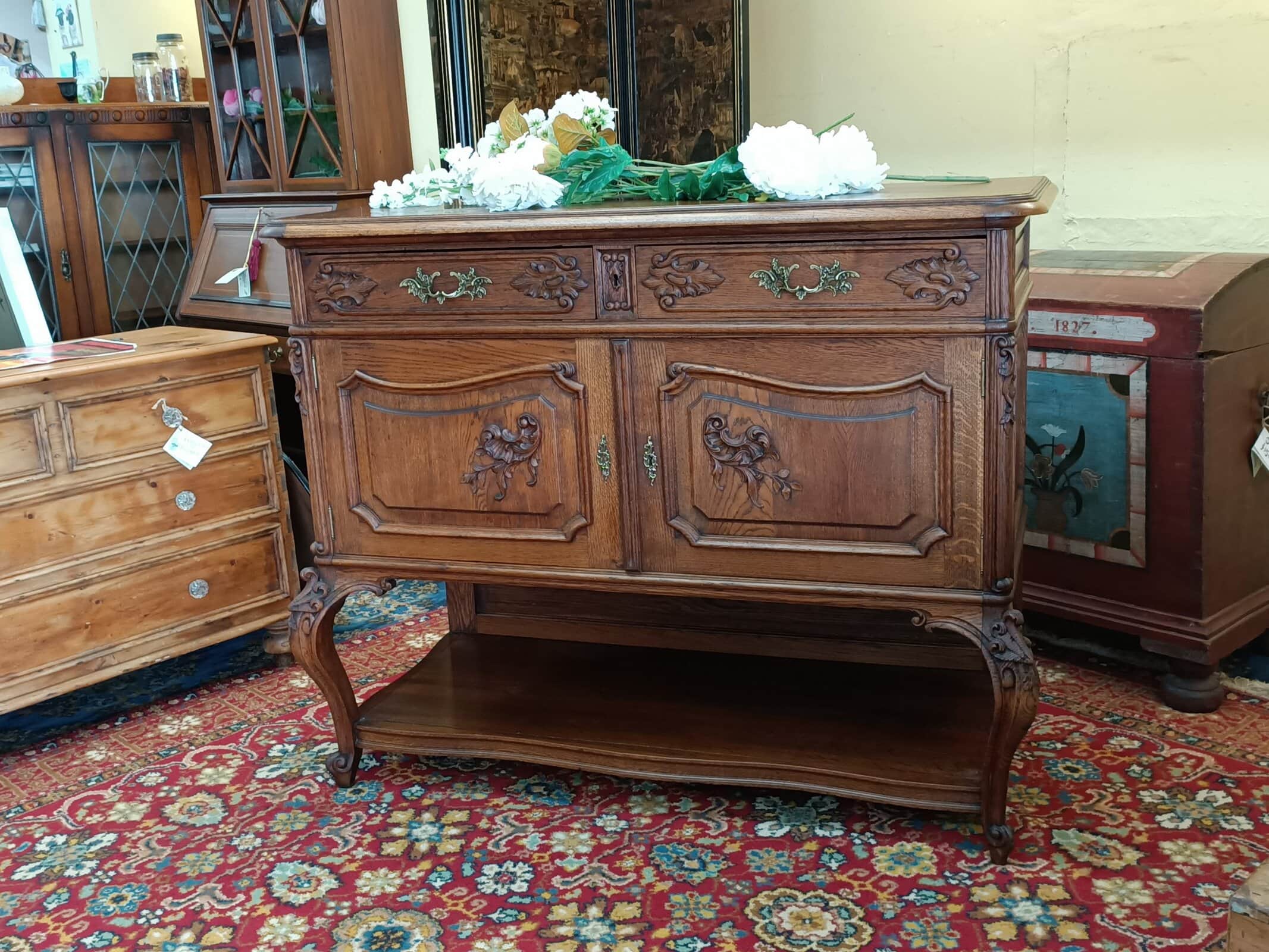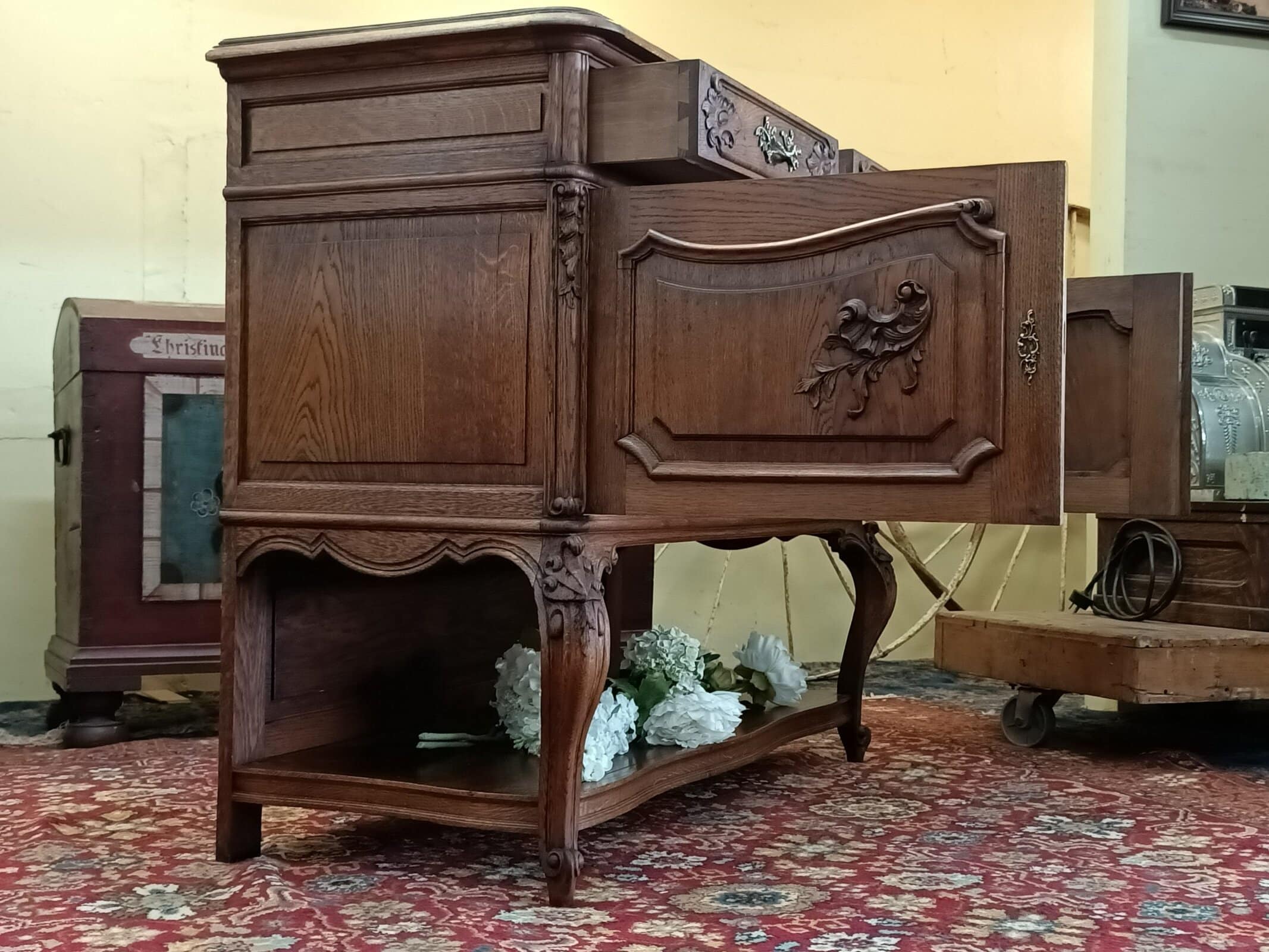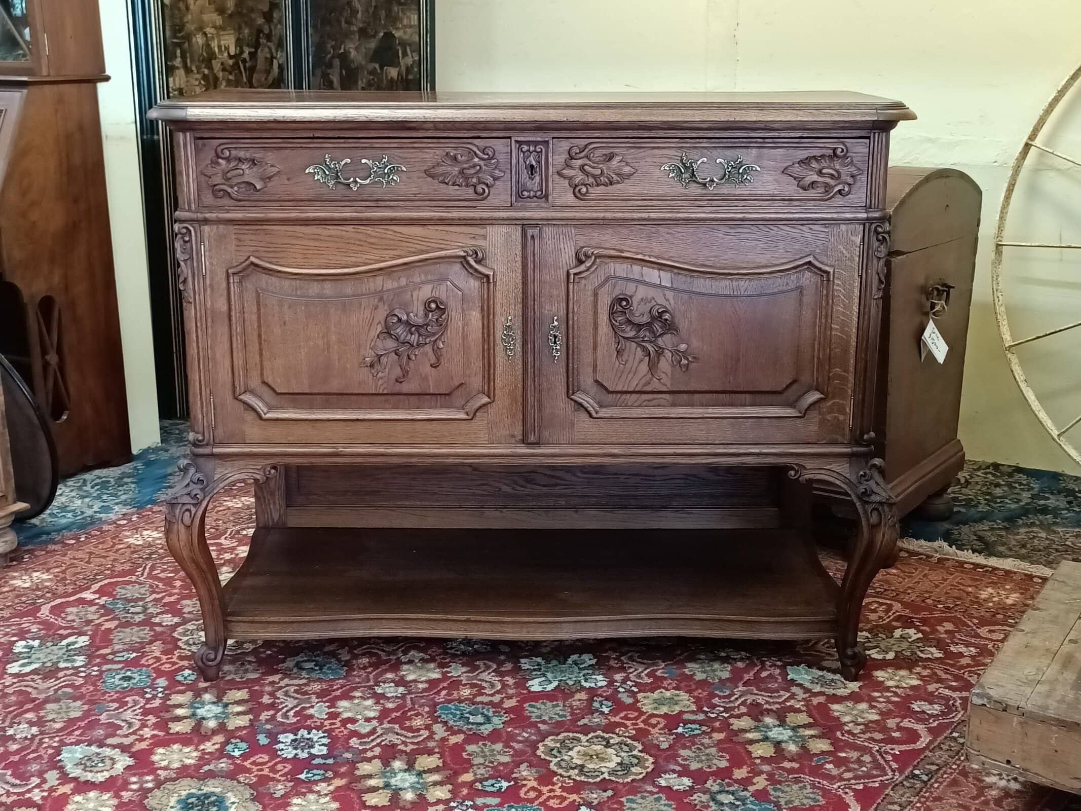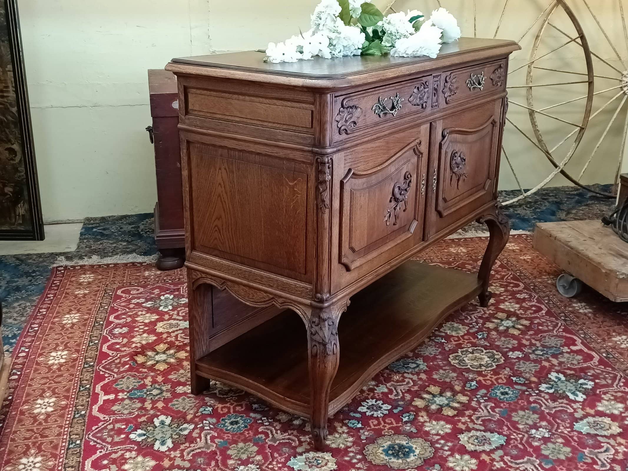 Grab yourself this French Provençal booffeee. Fudgey hued oak, with pretty scrolls and leave decals including those curvy Provençal legs. Two drawer, two cupboards and a lower potshelf; so, plenty of storage. Compact footprint to fit any wall, or back of a sofa. Pretty good condition, with good historic repairs across a top split plank and a leg repair and priced accordingly. She cleaned up gorgeous late 2025. Circa 1930.