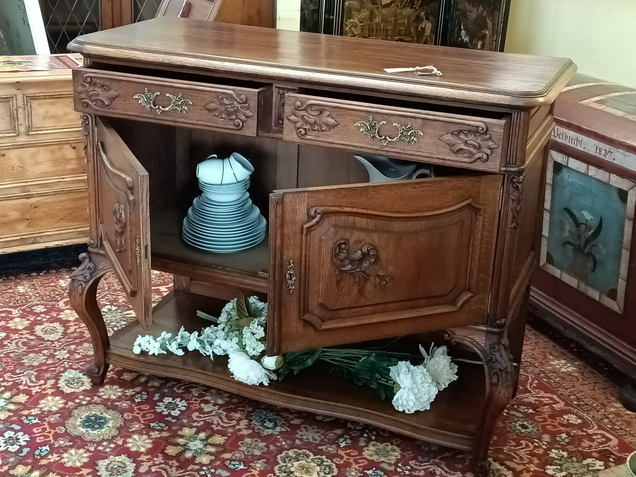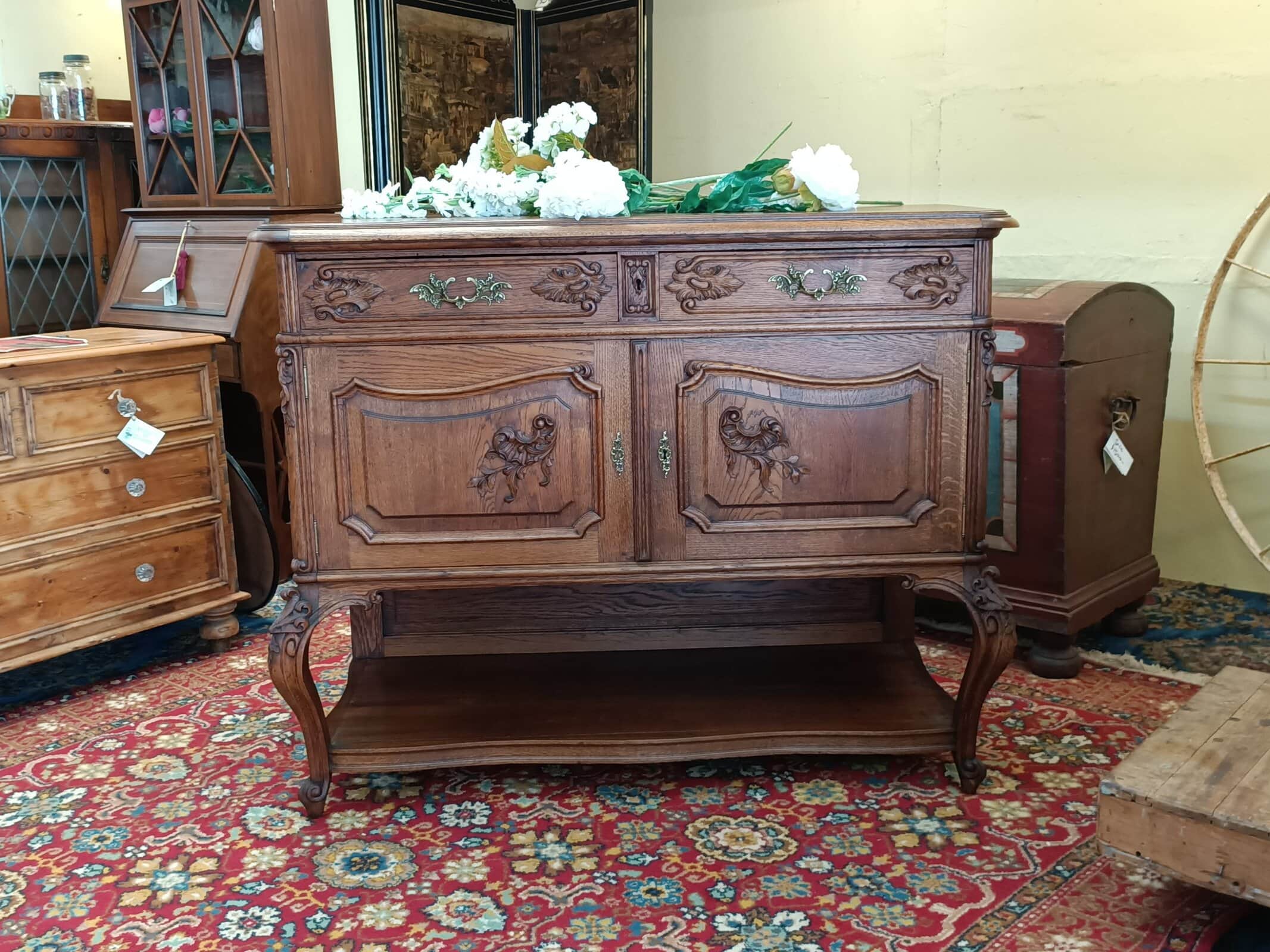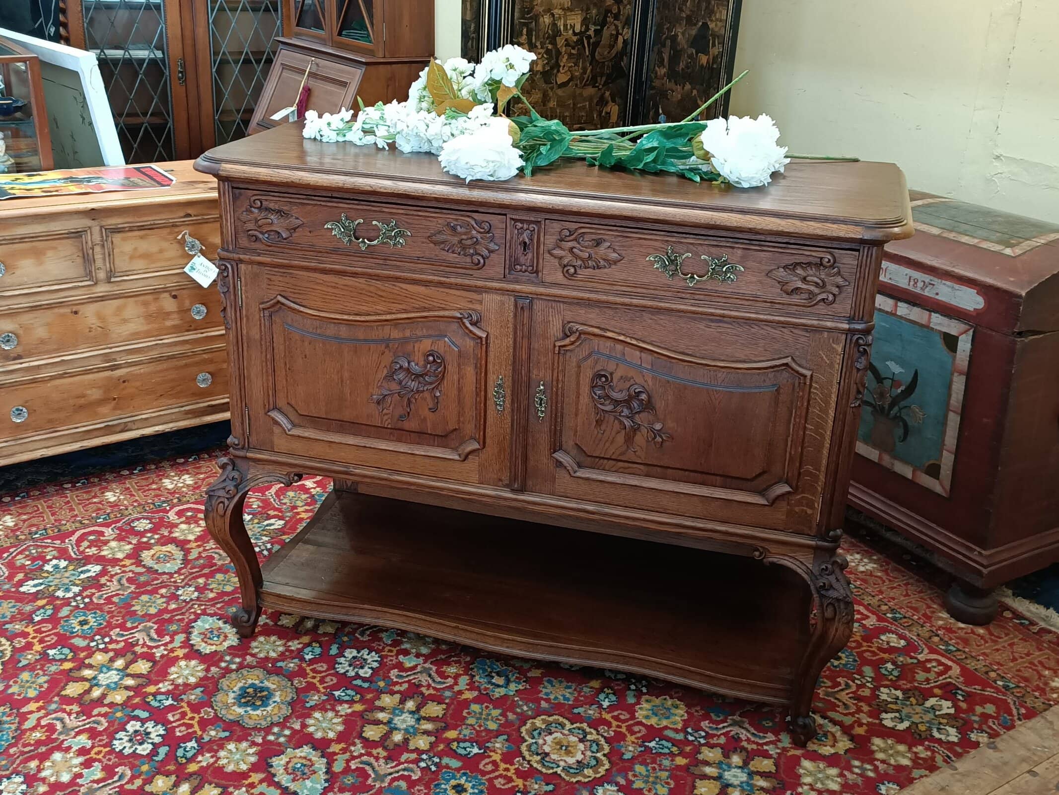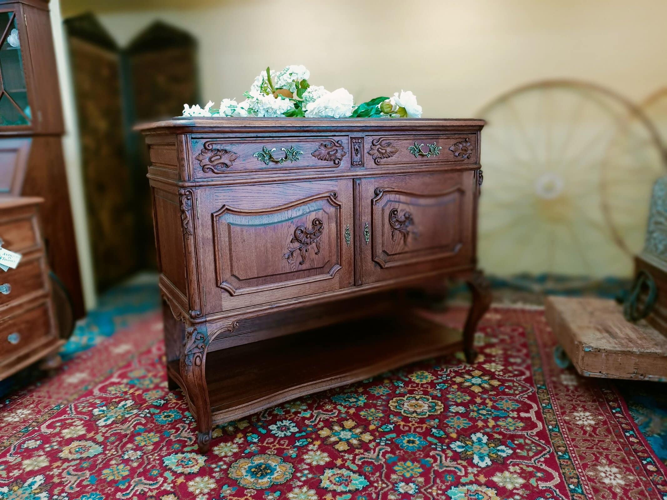 Grab yourself this French Provençal booffeee. Fudgey hued oak, with pretty scrolls and leave decals including those curvy Provençal legs. Two drawer, two cupboards and a lower potshelf; so, plenty of storage. Compact footprint to fit any wall, or back of a sofa. Pretty good condition, with good historic repairs across a top split plank and a leg repair and priced accordingly. She cleaned up gorgeous late 2025. Circa 1930.