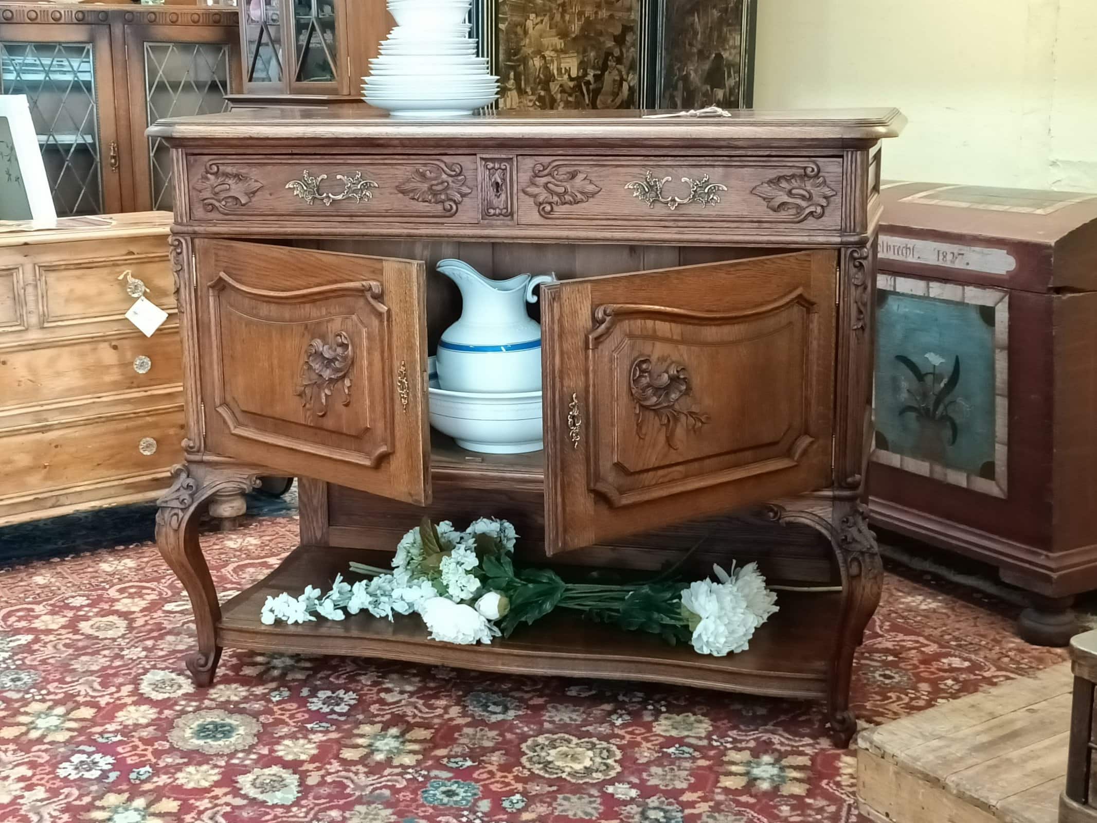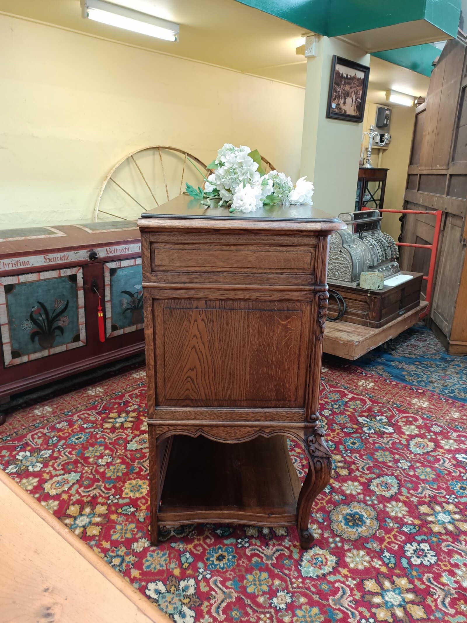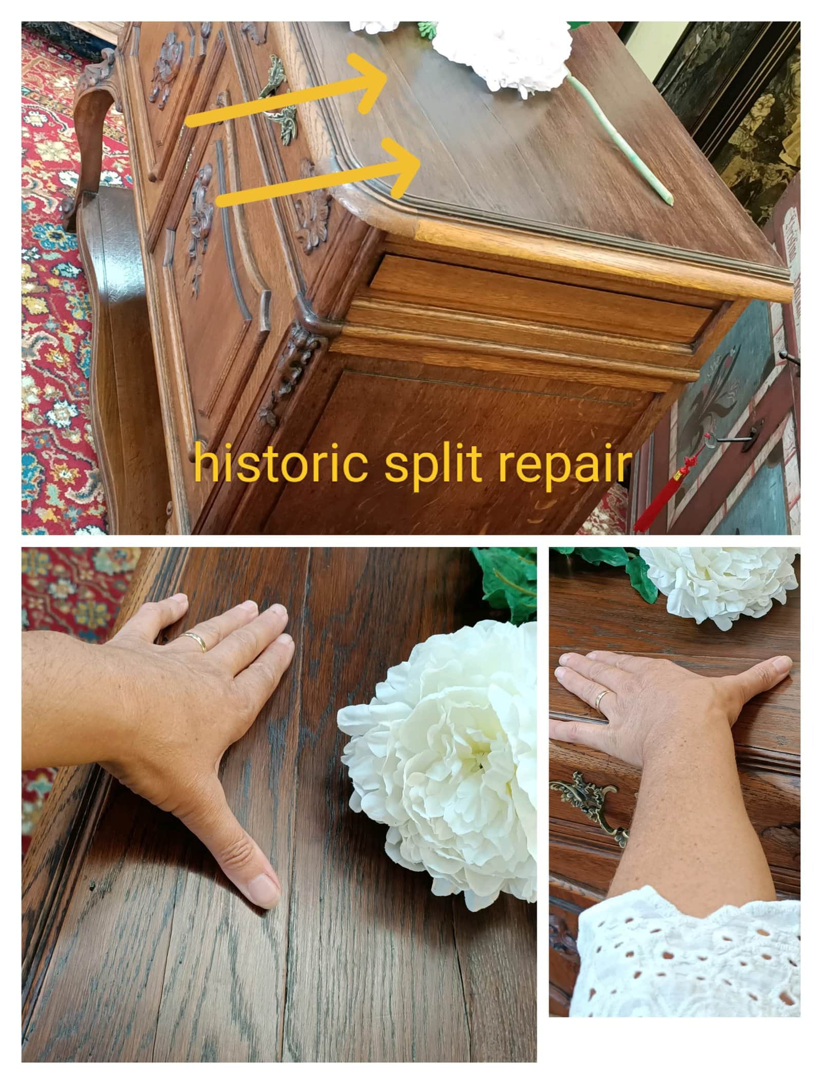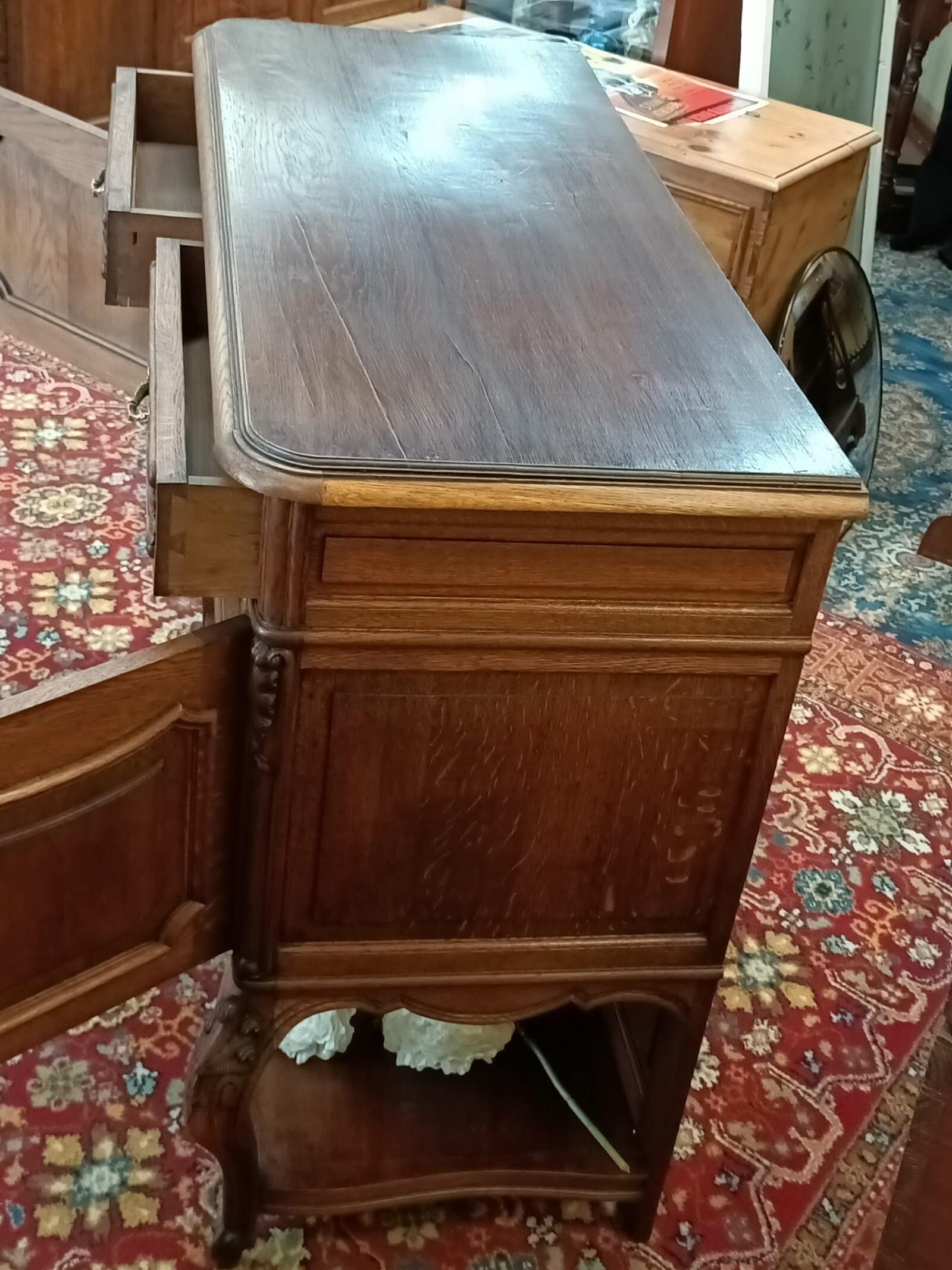 Grab yourself this French Provençal booffeee. Fudgey hued oak, with pretty scrolls and leave decals including those curvy Provençal legs. Two drawer, two cupboards and a lower potshelf; so, plenty of storage. Compact footprint to fit any wall, or back of a sofa. Pretty good condition, with good historic repairs across a top split plank and a leg repair and priced accordingly. She cleaned up gorgeous late 2025. Circa 1930.