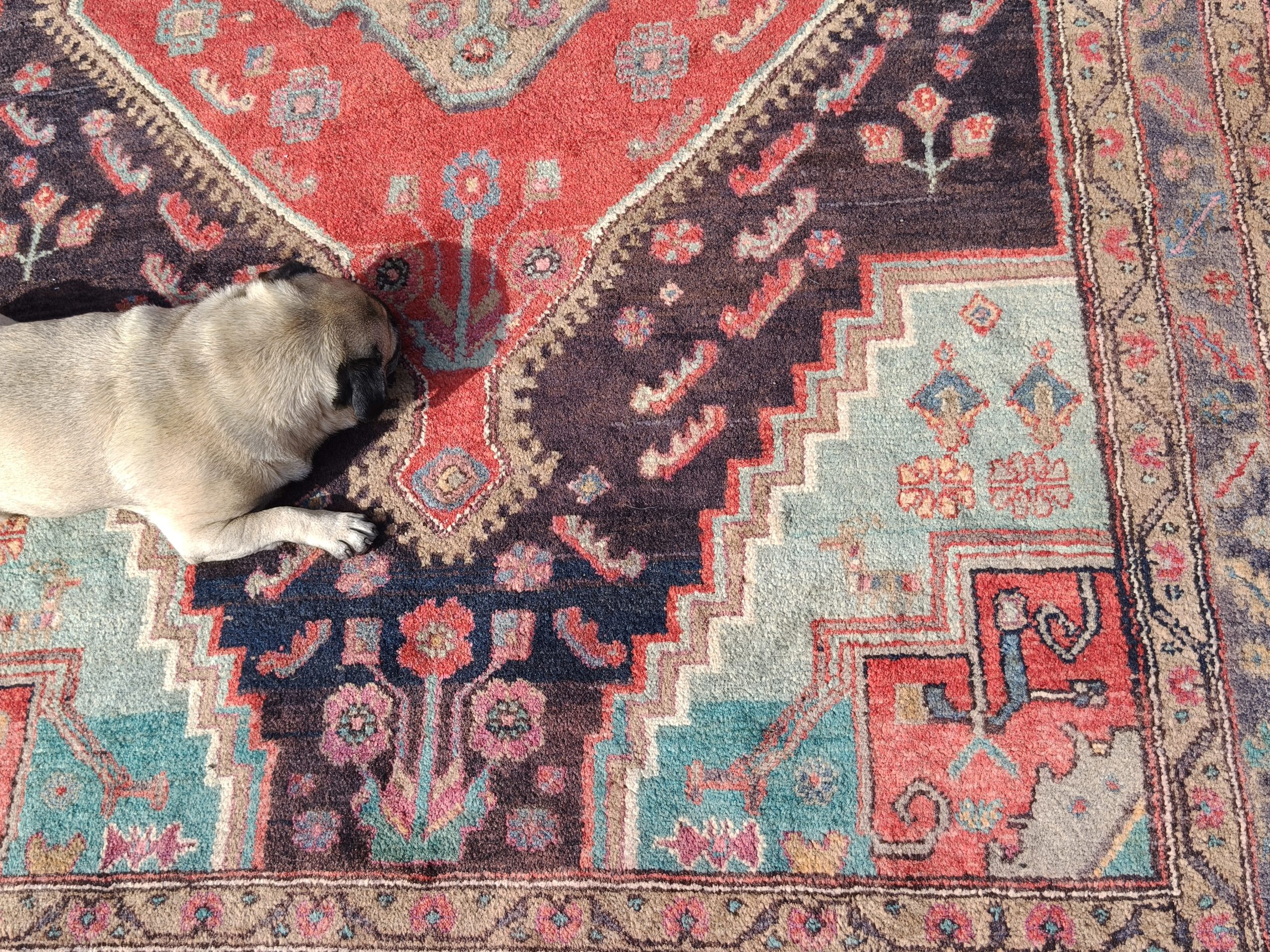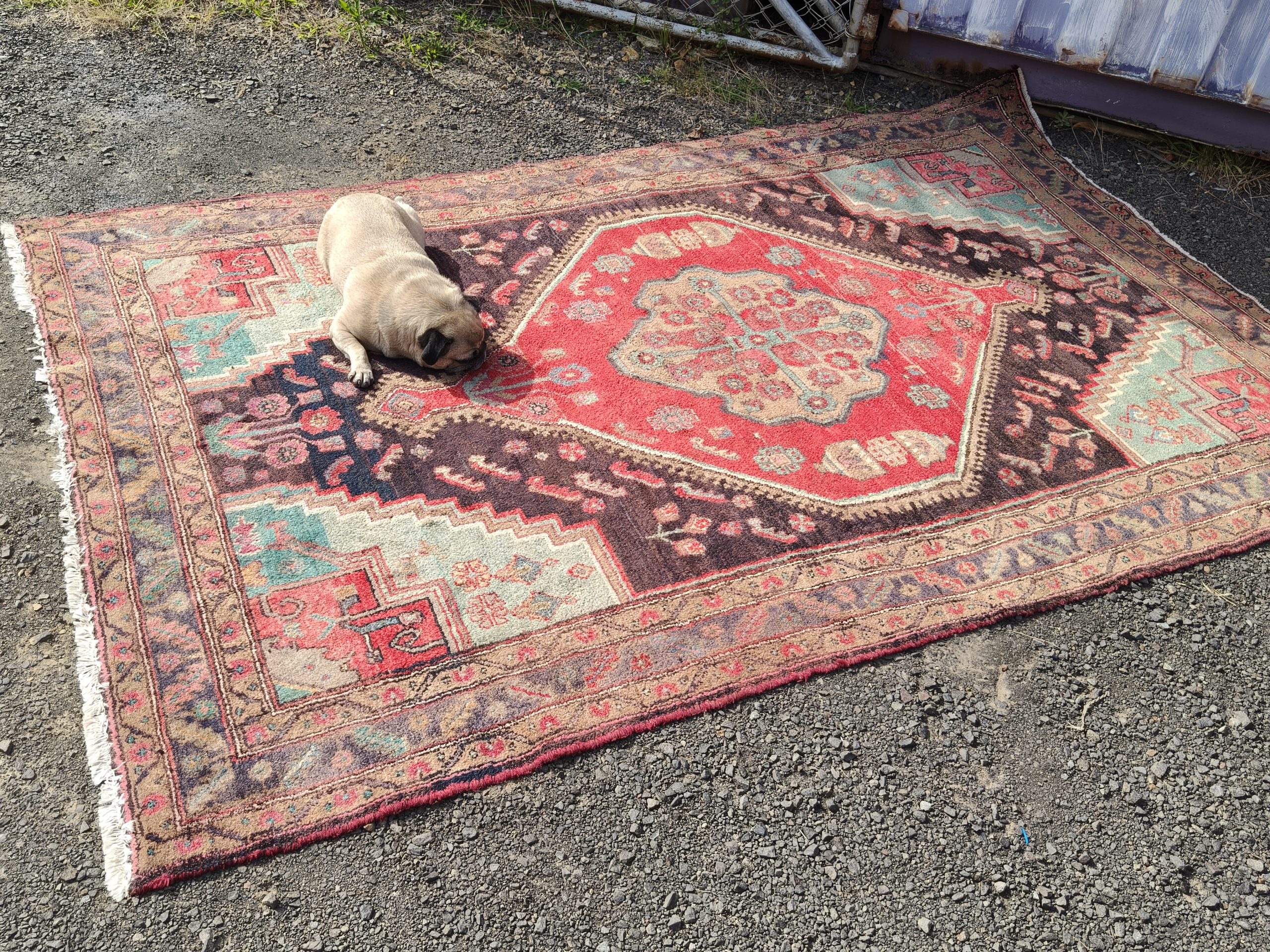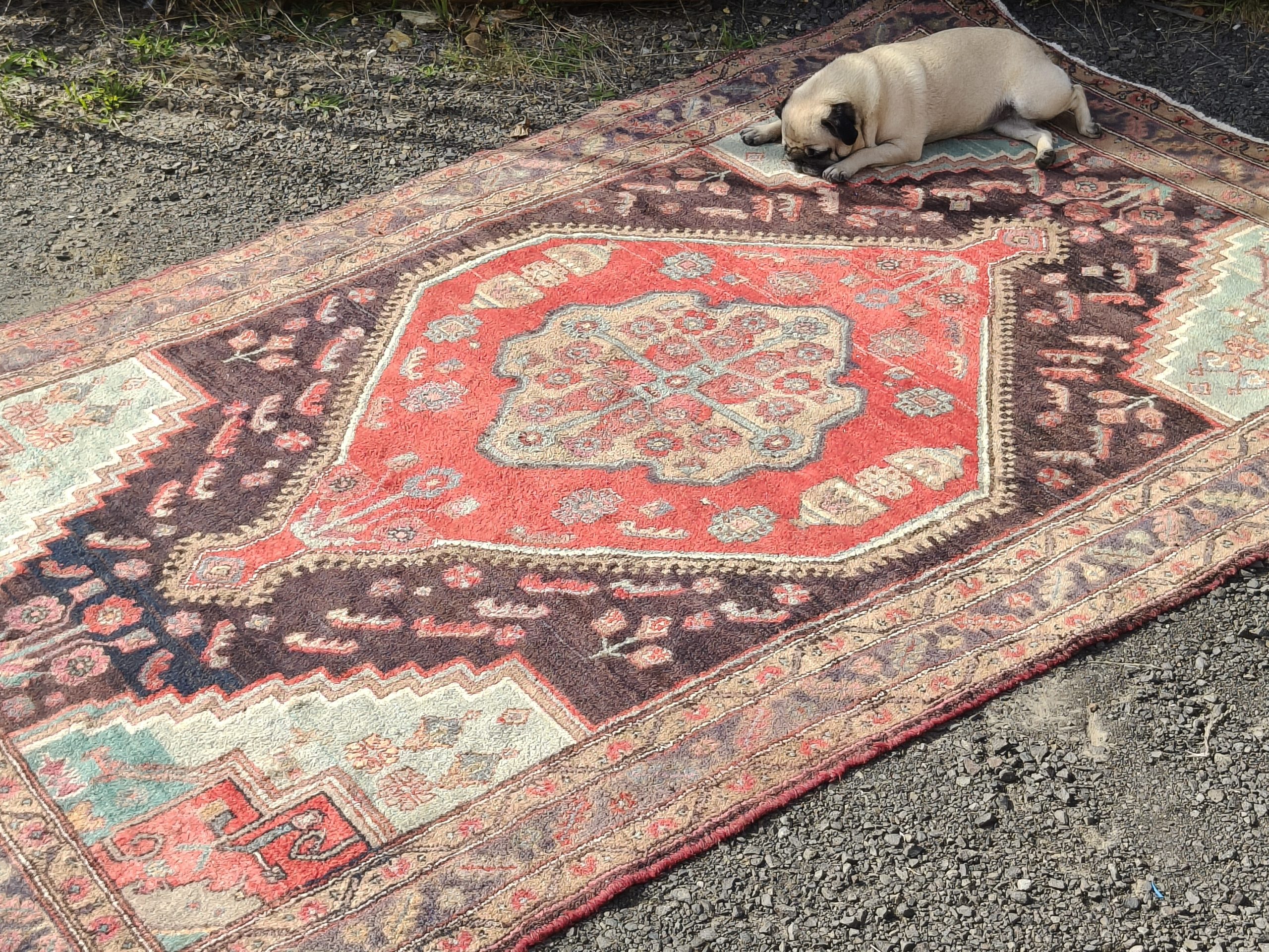 It's ok, I don't really expect you to... but do you remember, the extinct but, my absolute favourite "Snifter" lolly? Chewy chocolatey minty nougaty crunchy candy? Well, this Anatolian vintage carpet imbues not only the "Snifter but also "Jaffa" loll loll. Dusky red, mint and brown backgrounds with a big creamy central gull, patterned all over with abstract flora. Hand woven, wool on cotton, medium length knap. Great condition. Circa 1970.