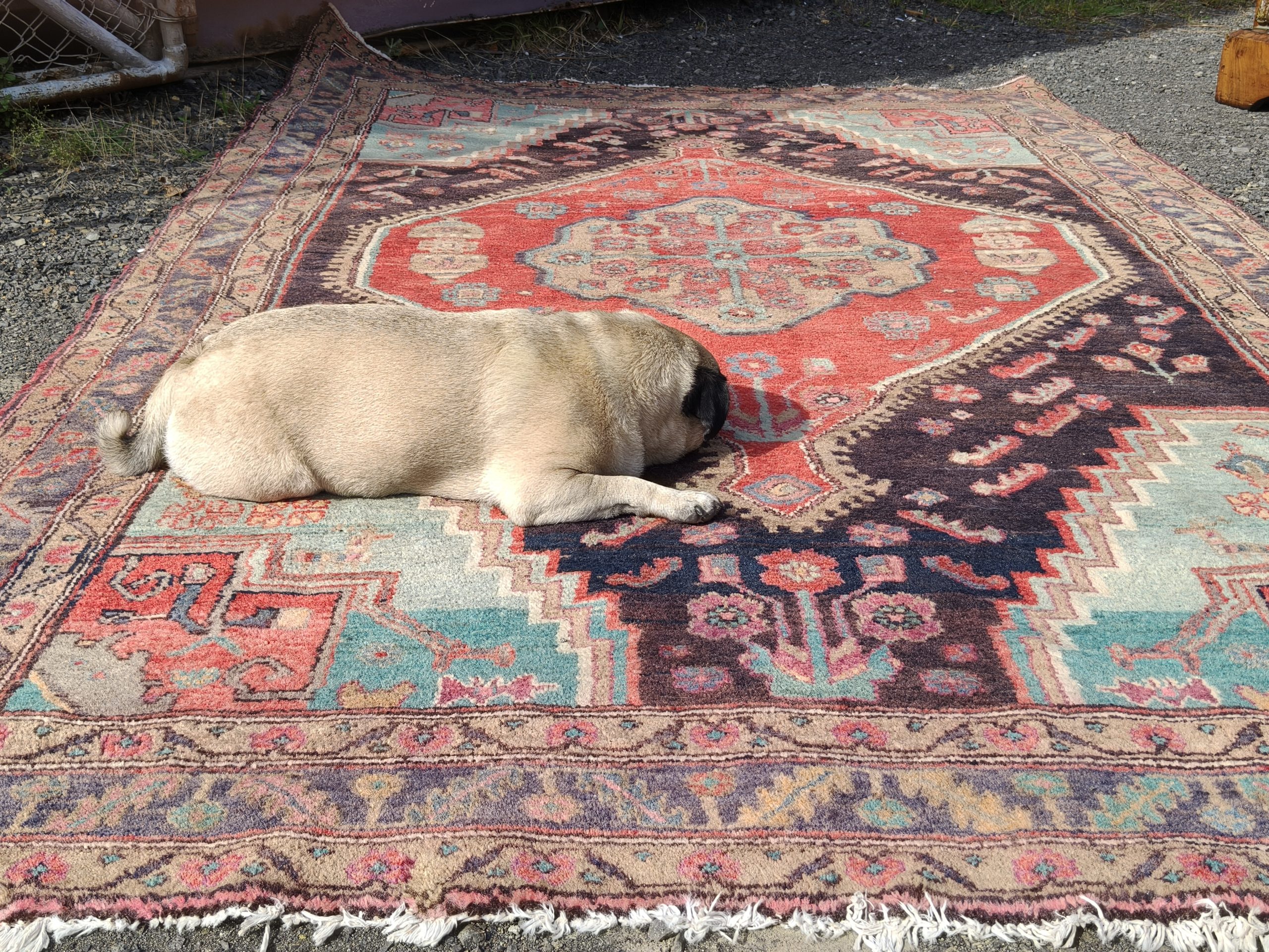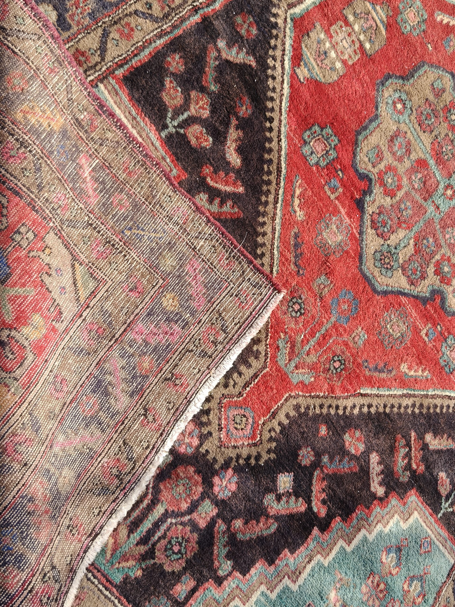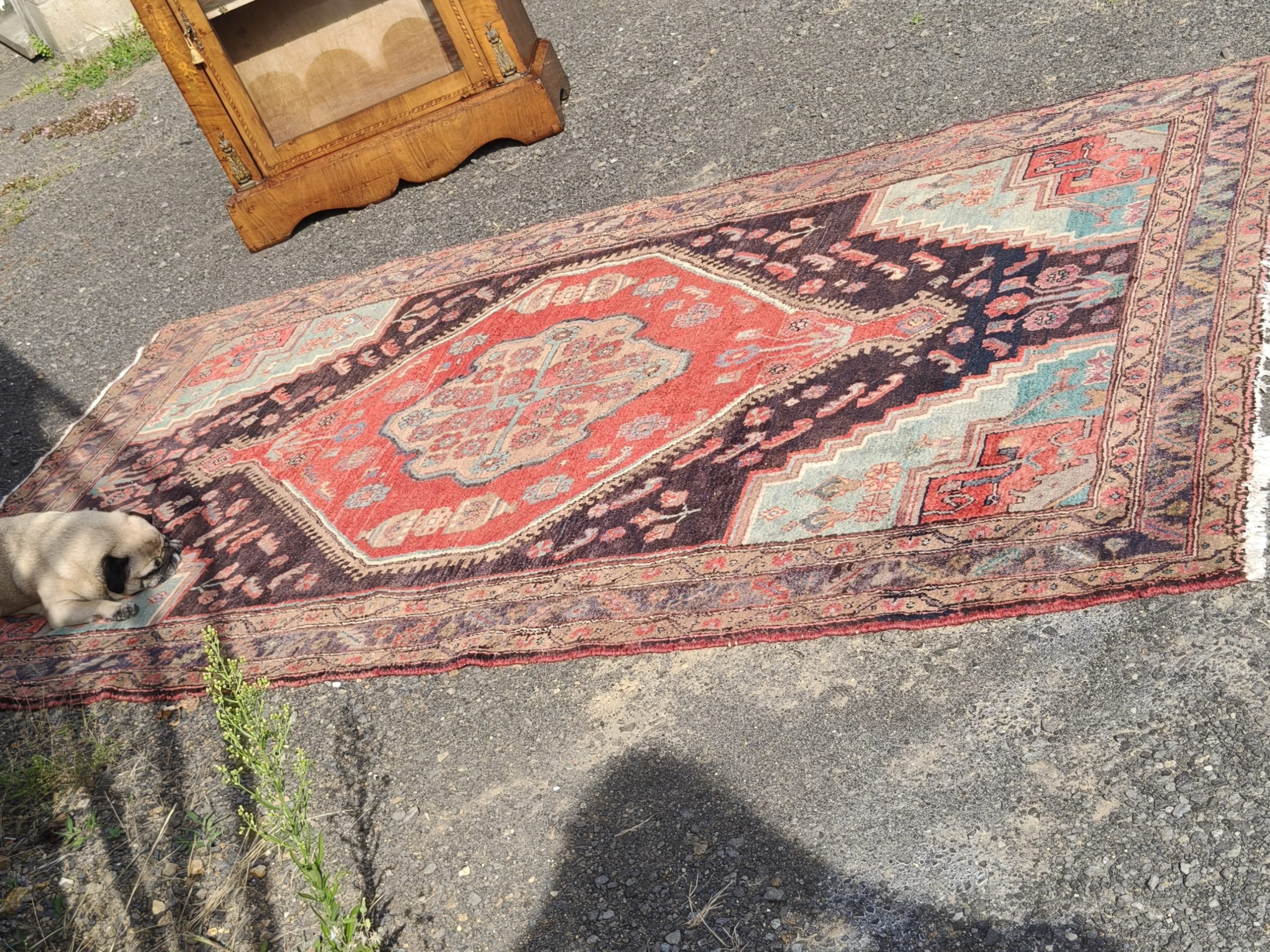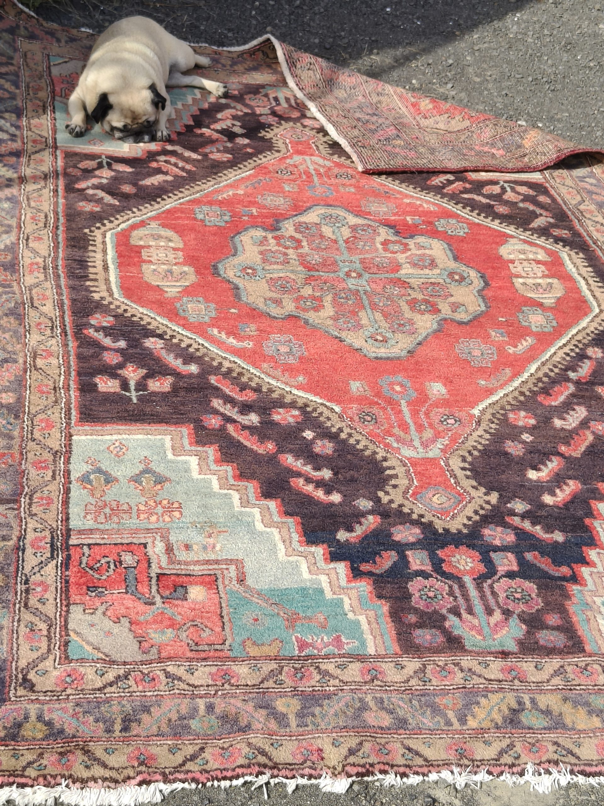 It's ok, I don't really expect you to... but do you remember, the extinct but, my absolute favourite "Snifter" lolly? Chewy chocolatey minty nougaty crunchy candy? Well, this Anatolian vintage carpet imbues not only the "Snifter but also "Jaffa" loll loll. Dusky red, mint and brown backgrounds with a big creamy central gull, patterned all over with abstract flora. Hand woven, wool on cotton, medium length knap. Great condition. Circa 1970.