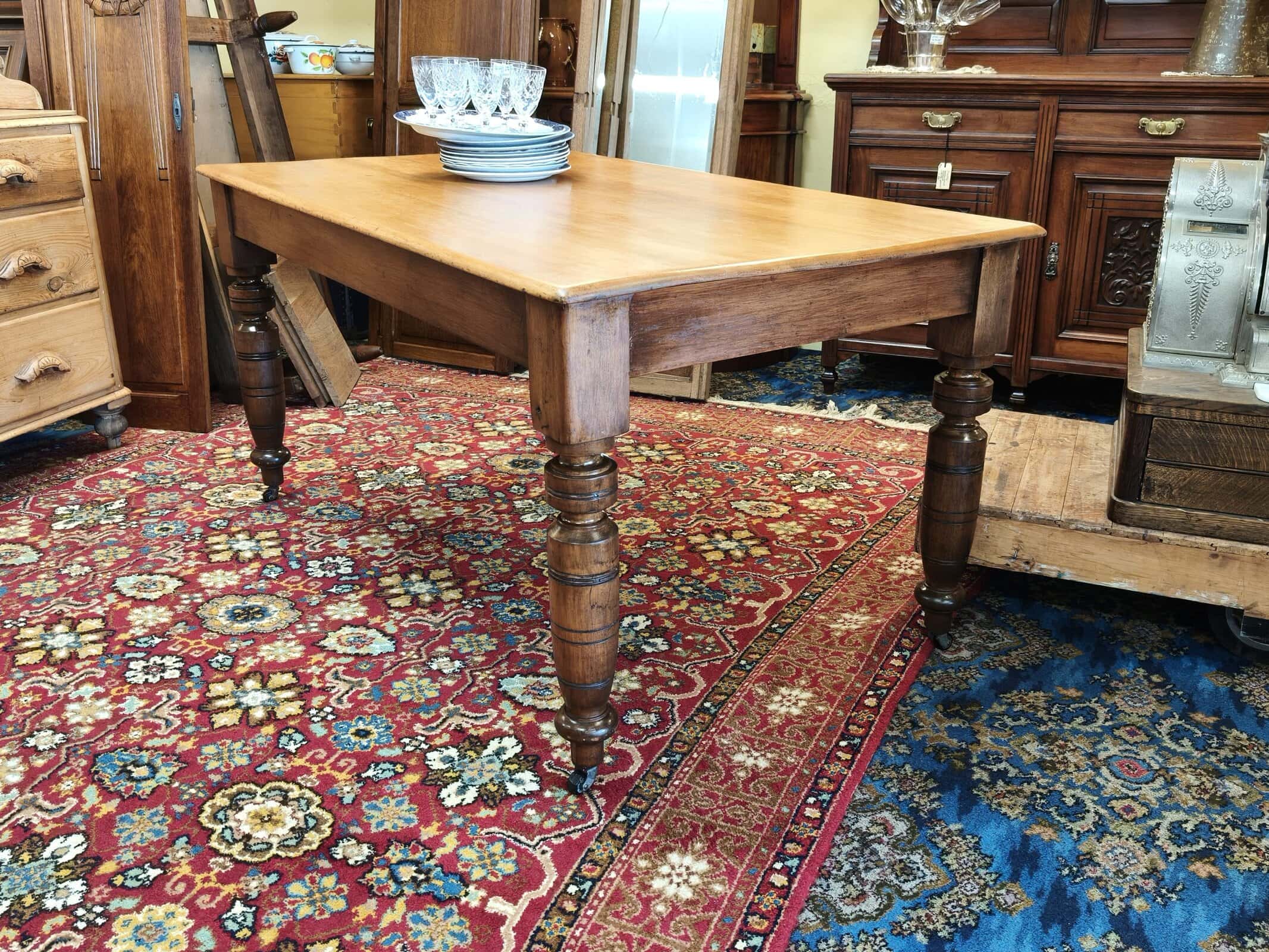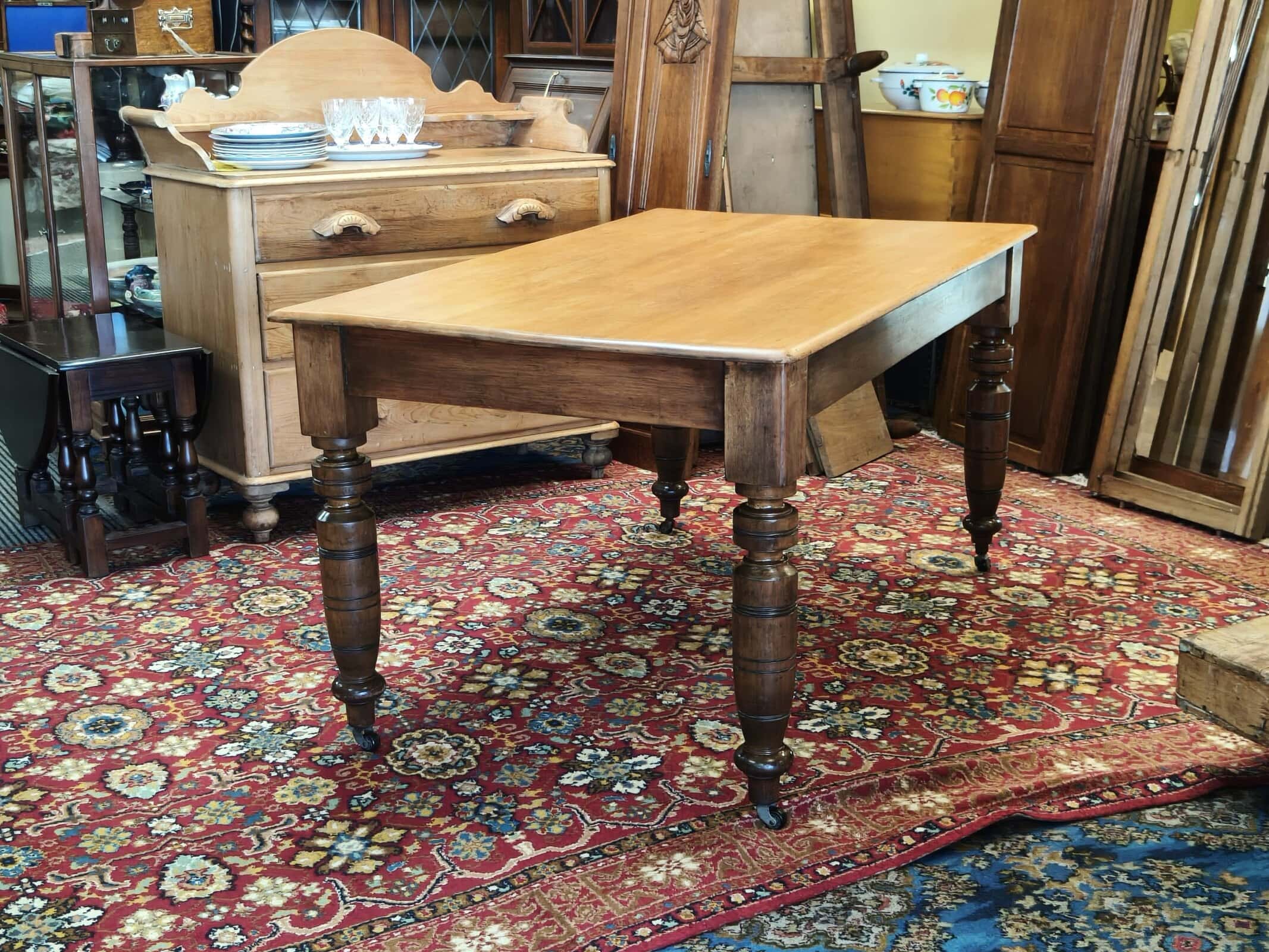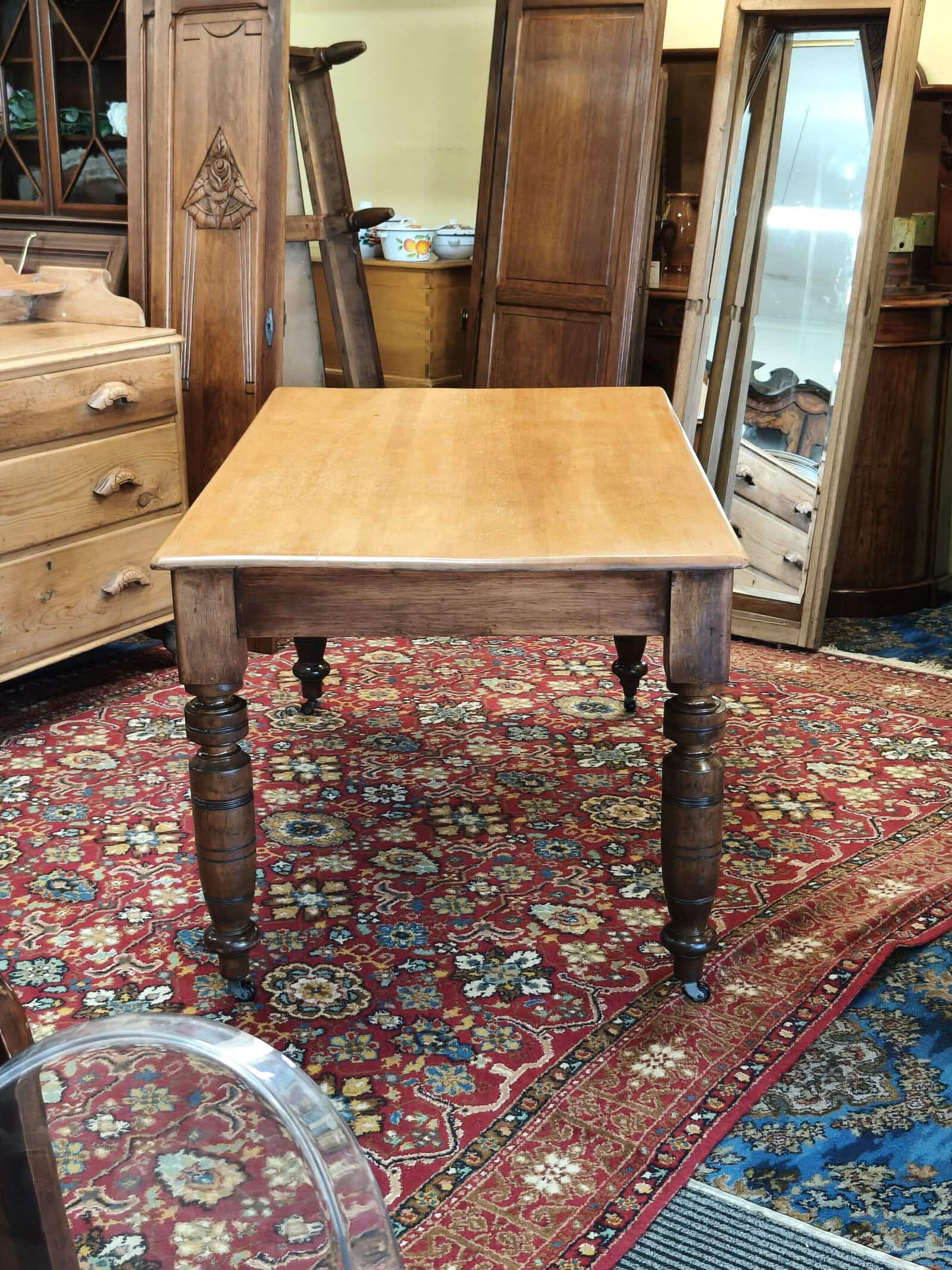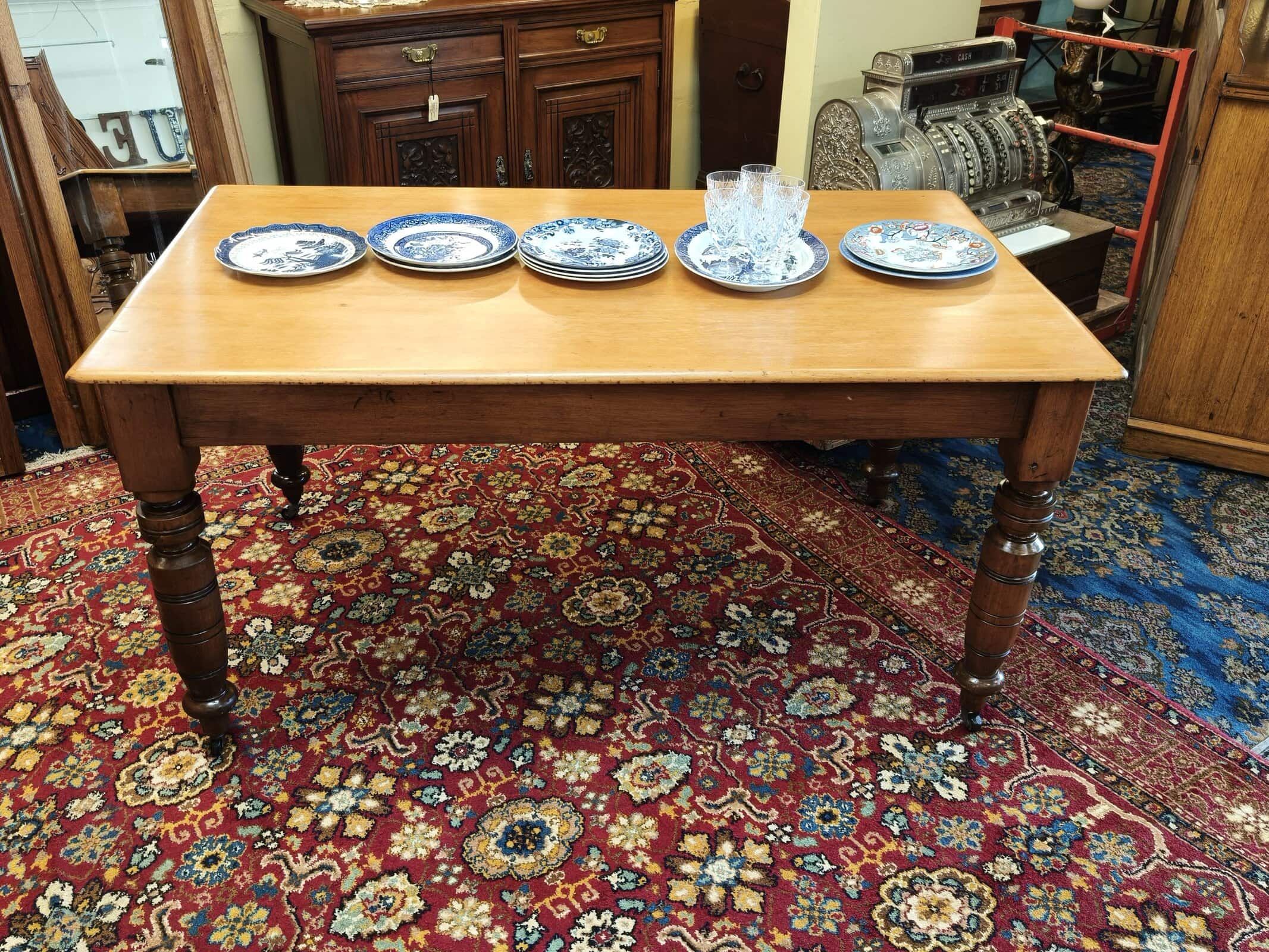 MMM, she was a bit sad on arrival; but this kauri kitchen table responded exceptionally well to some stripping, scrubbing and waxing. Now a waxed top with slightly darker turned legs and on castors, seats six. Quite lightweight due to plank top being 20mm thick, commensurate, structurally sound hairline splits on two legs, also one wooden block slightly narrower than the others. Usual patina of 140years. Circa 1890.