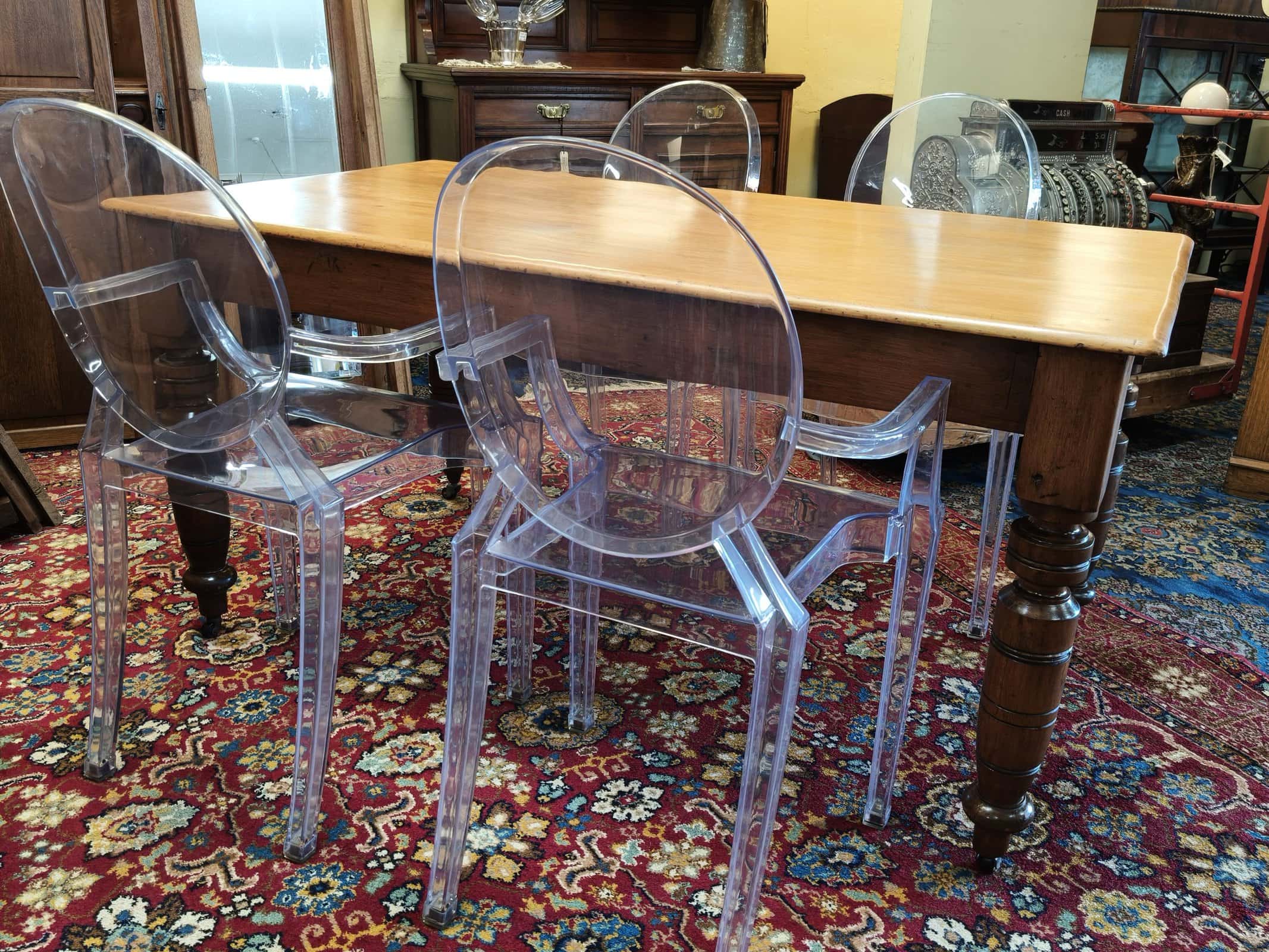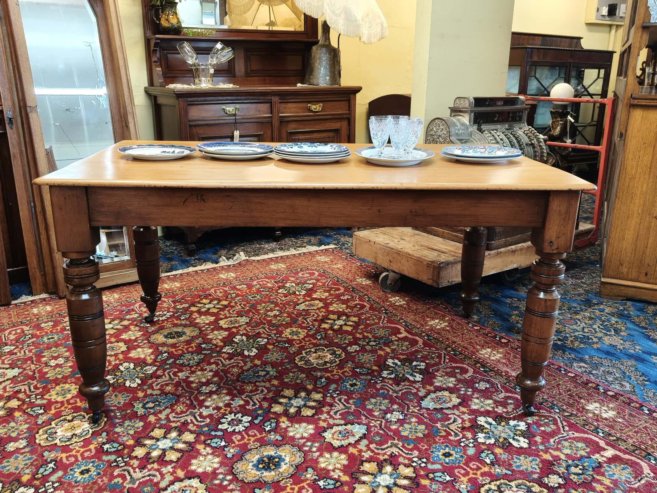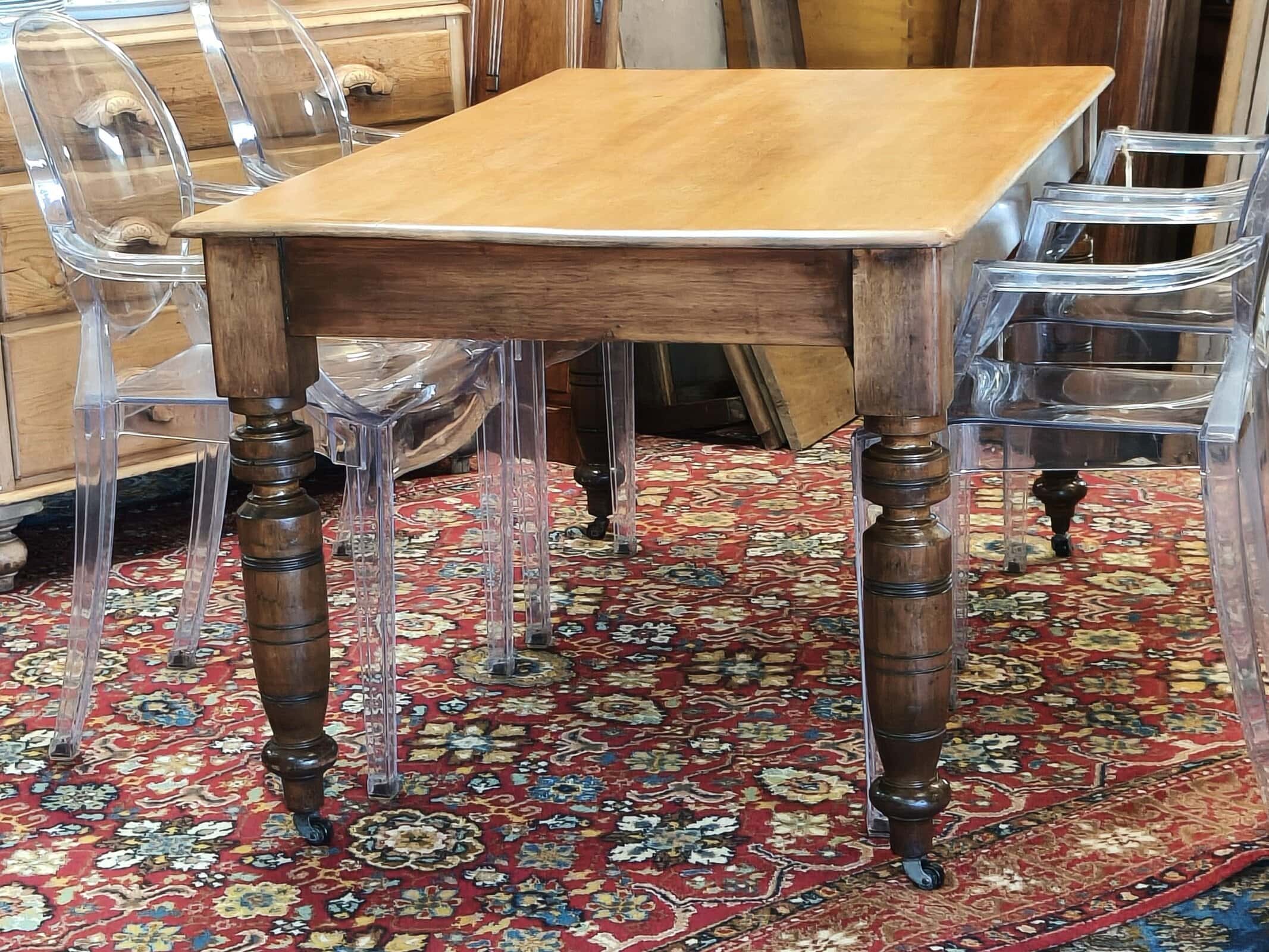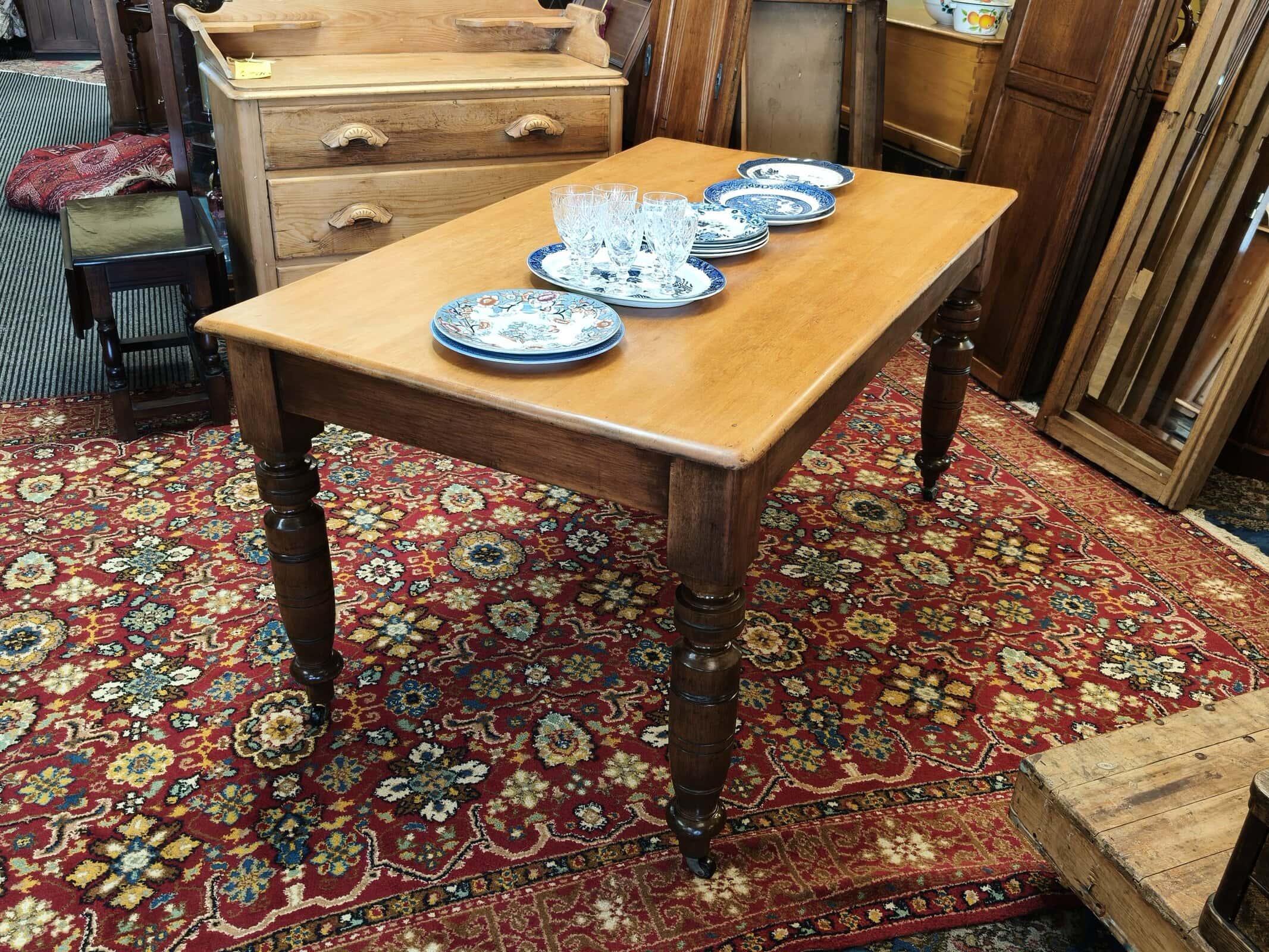 MMM, she was a bit sad on arrival; but this kauri kitchen table responded exceptionally well to some stripping, scrubbing and waxing. Now a waxed top with slightly darker turned legs and on castors, seats six. Quite lightweight due to plank top being 20mm thick, commensurate, structurally sound hairline splits on two legs, also one wooden block slightly narrower than the others. Usual patina of 140years. Circa 1890.