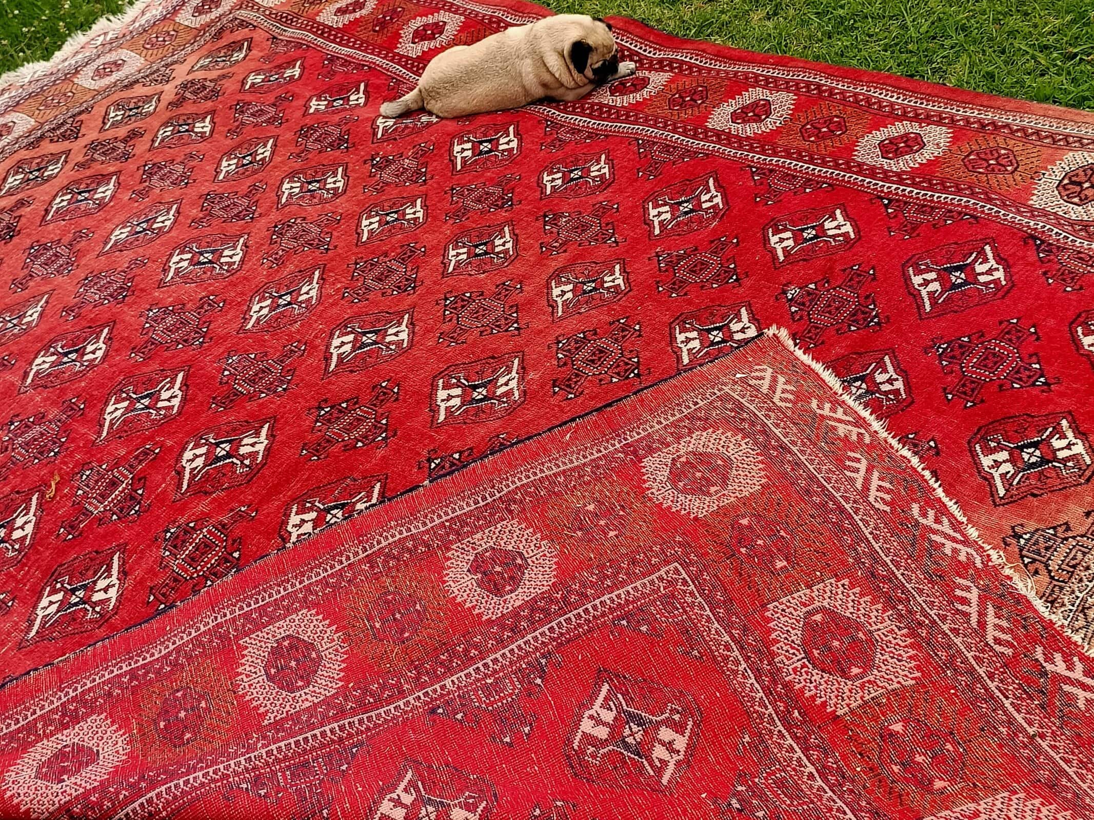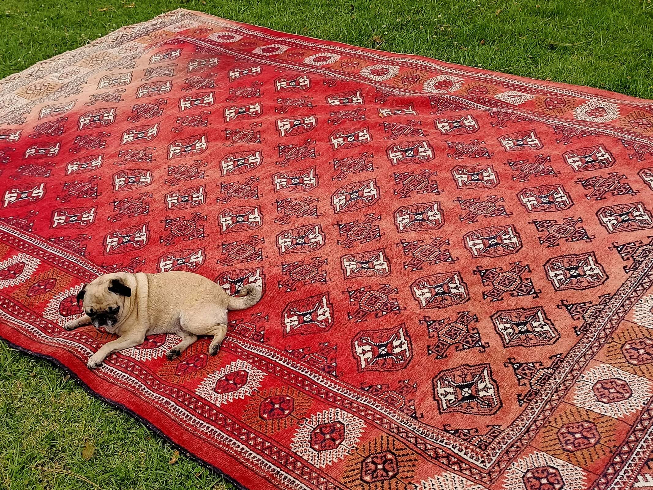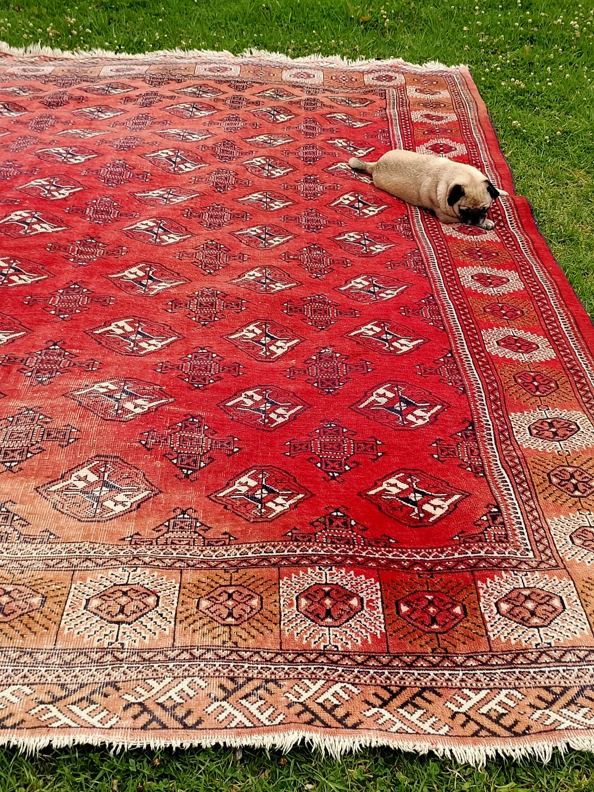 We have only just bought this BIG vintage Bokhara rug, and she is absolutely lovely.  Red background with fading and wear to each end.  Short nap, wool on wool with a large grid of series of black and cream 200mm geometric guls.  Looks great under modern and old and accentuates most hues, including Pugster's!  Circa 1930.