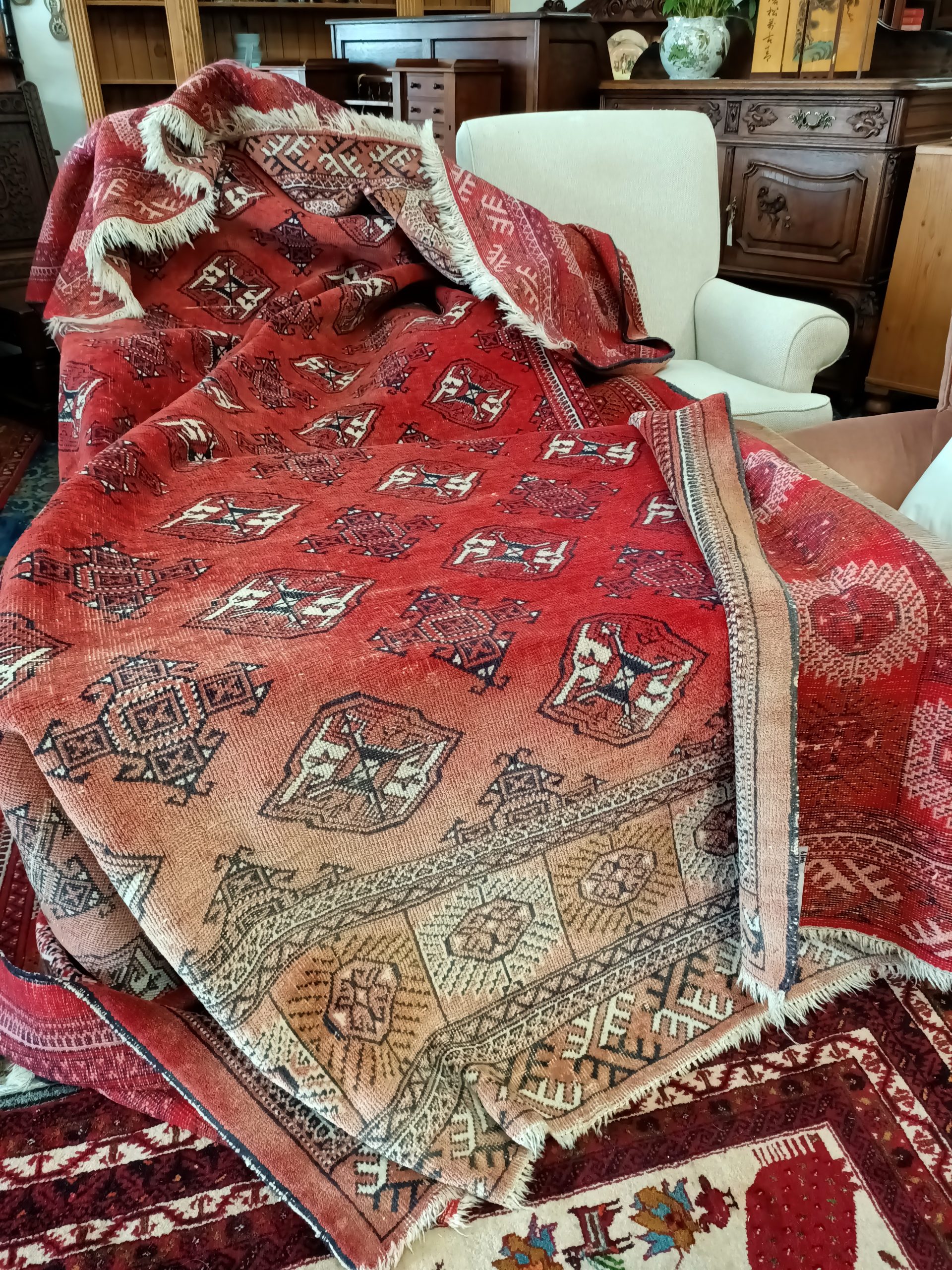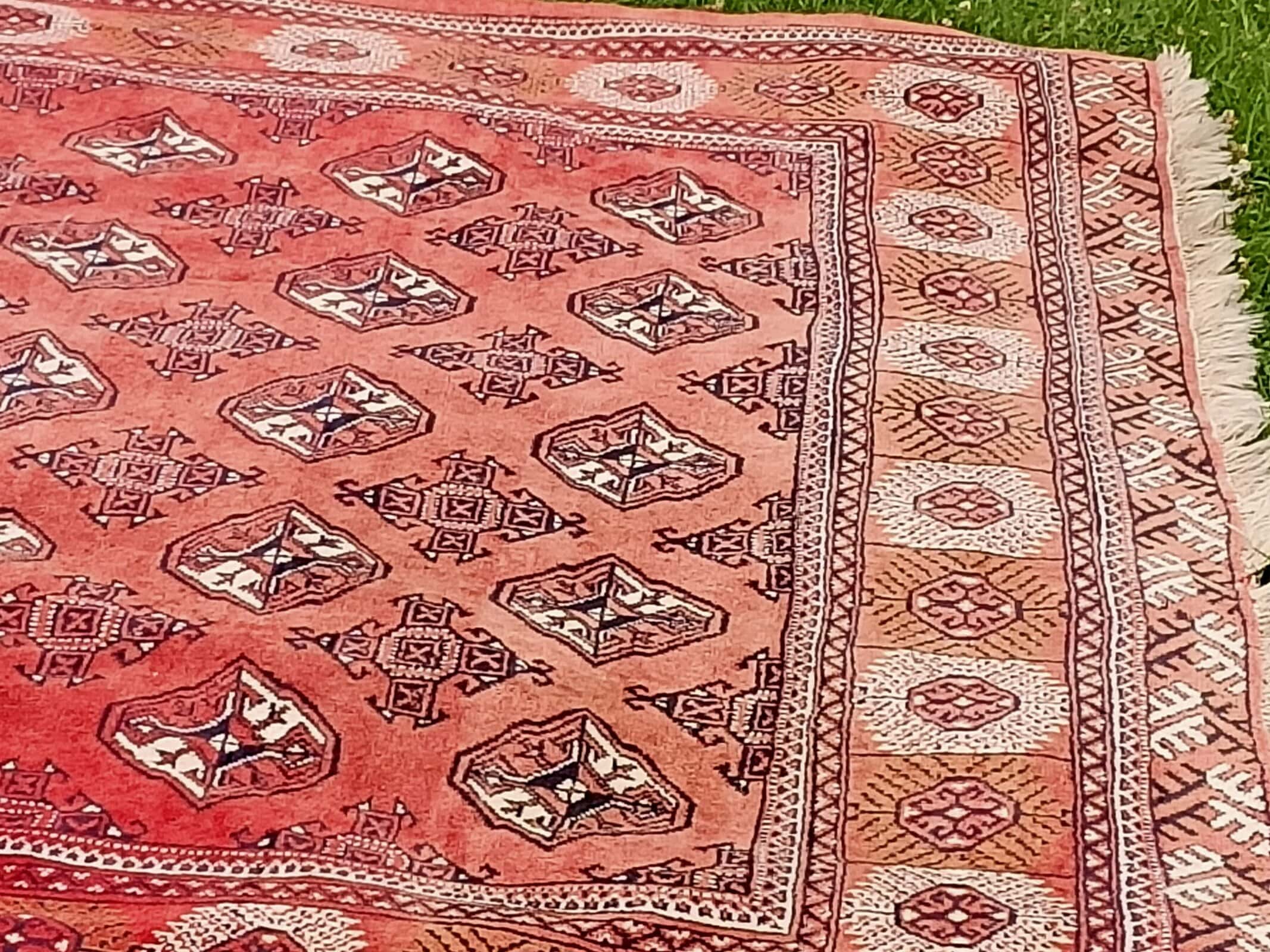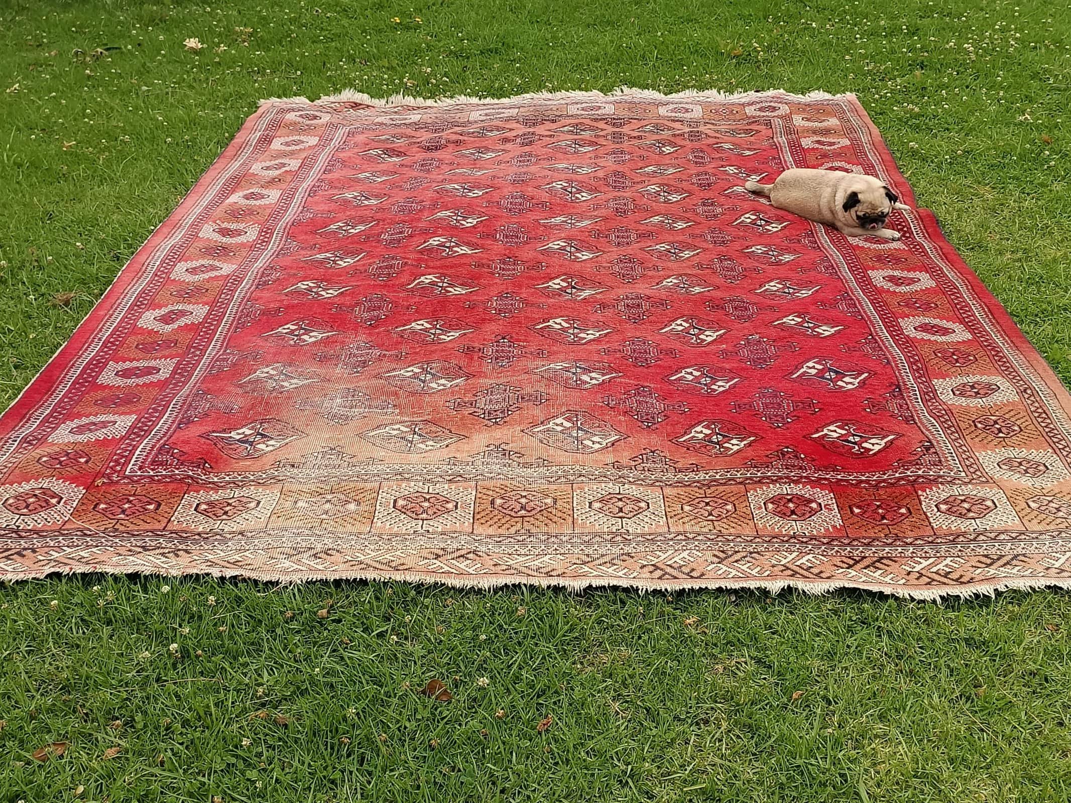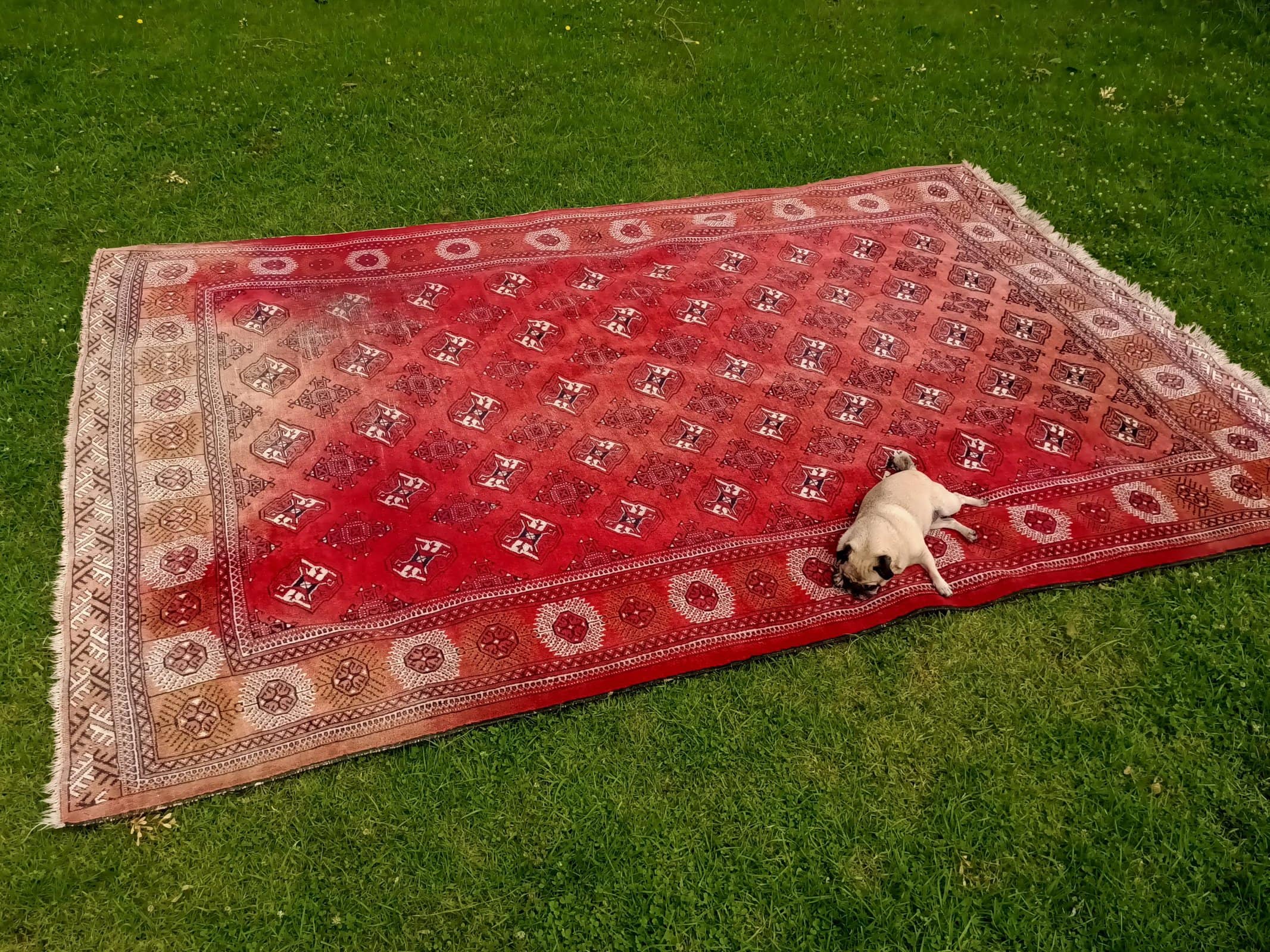We have only just bought this BIG vintage Bokhara rug, and she is absolutely lovely.  Red background with fading and wear to each end.  Short nap, wool on wool with a large grid of series of black and cream 200mm geometric guls.  Looks great under modern and old and accentuates most hues, including Pugster's!  Circa 1930.
