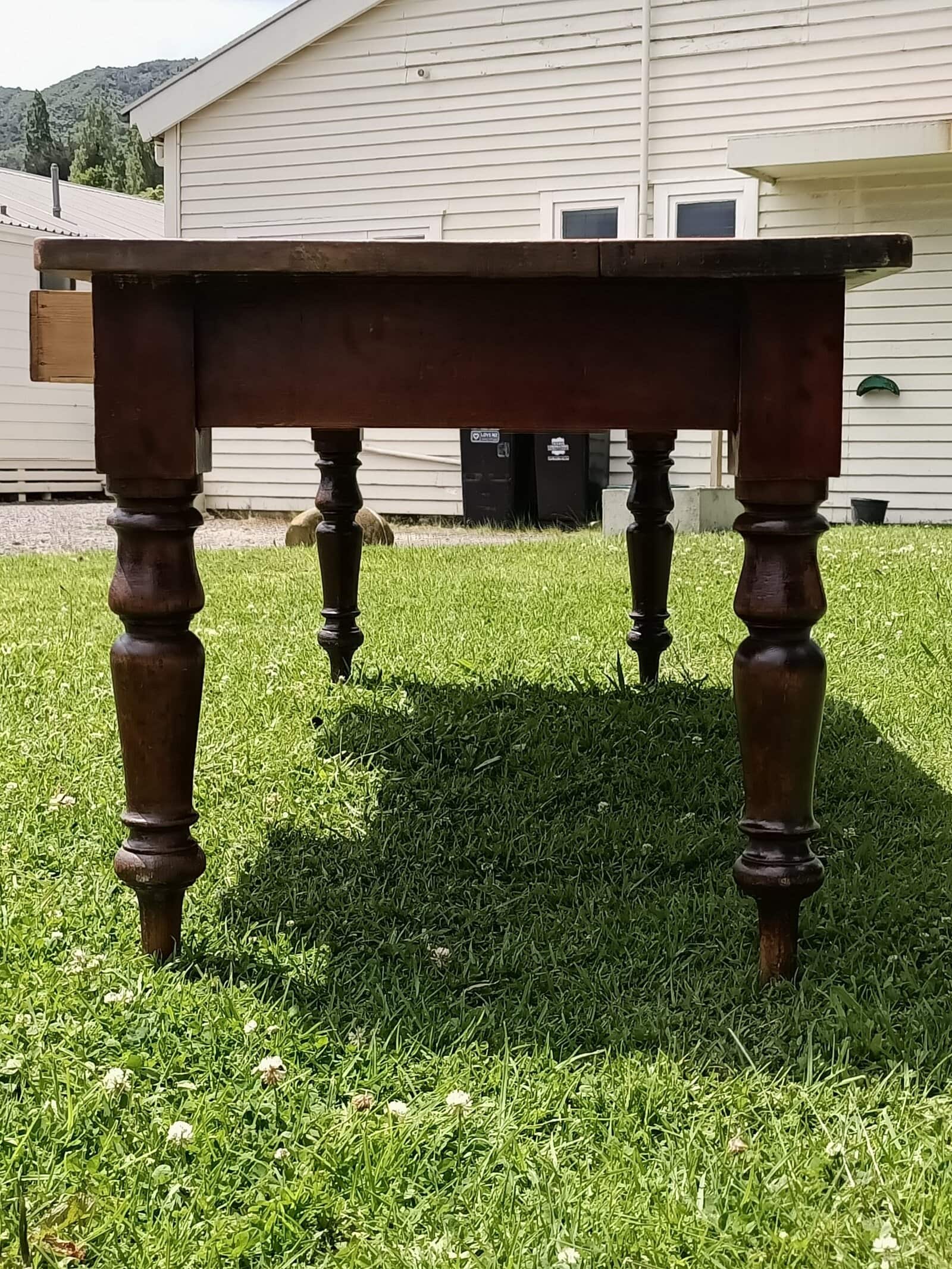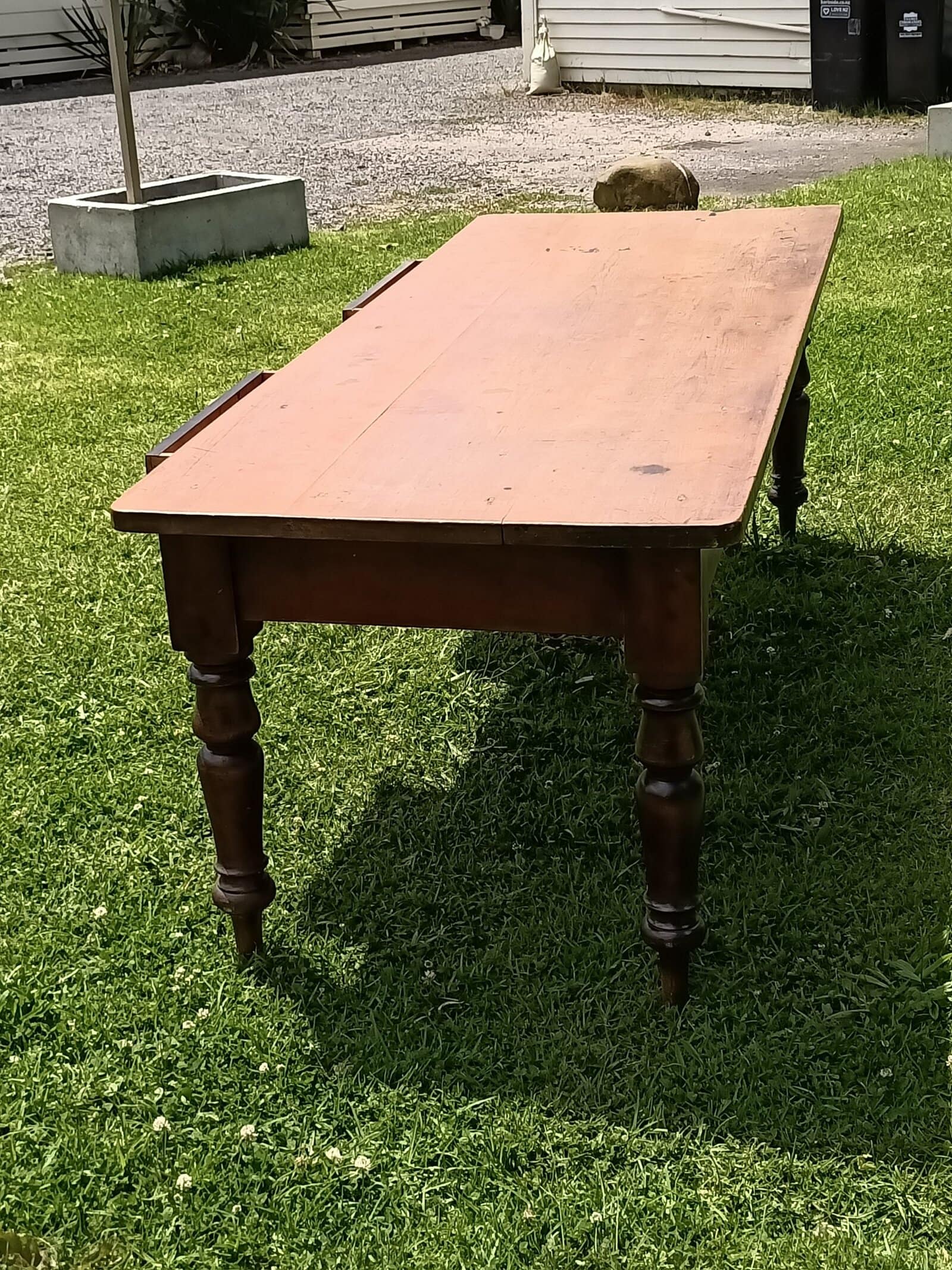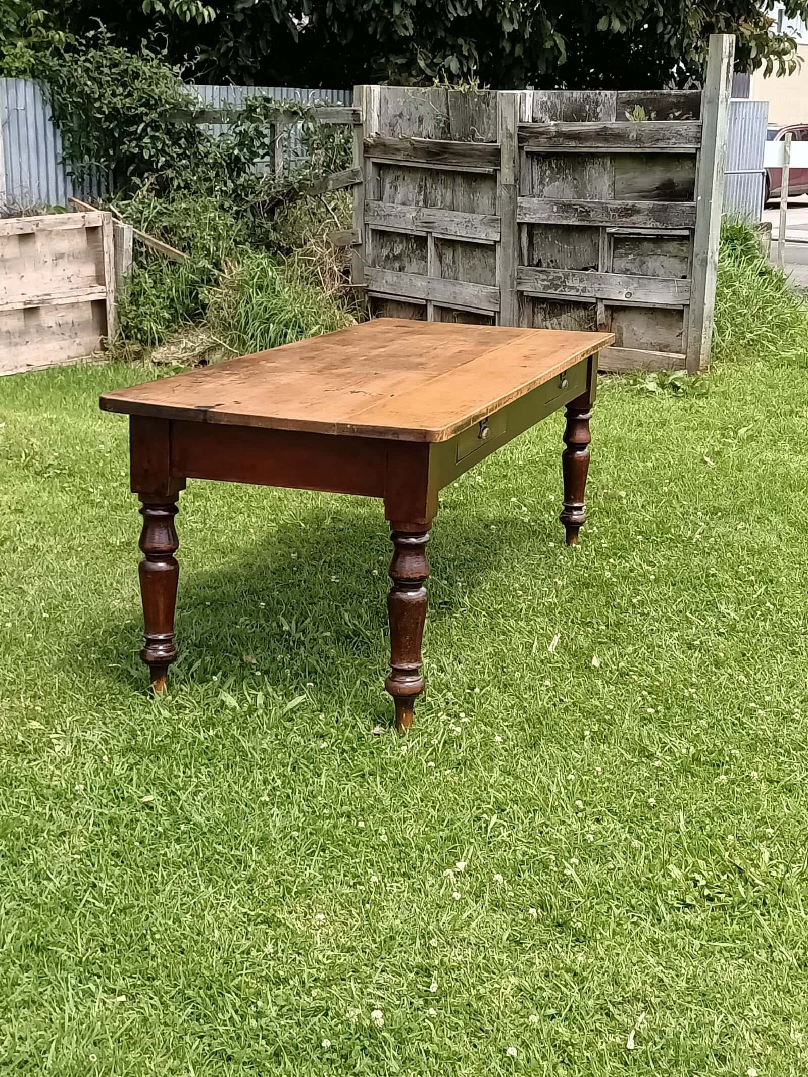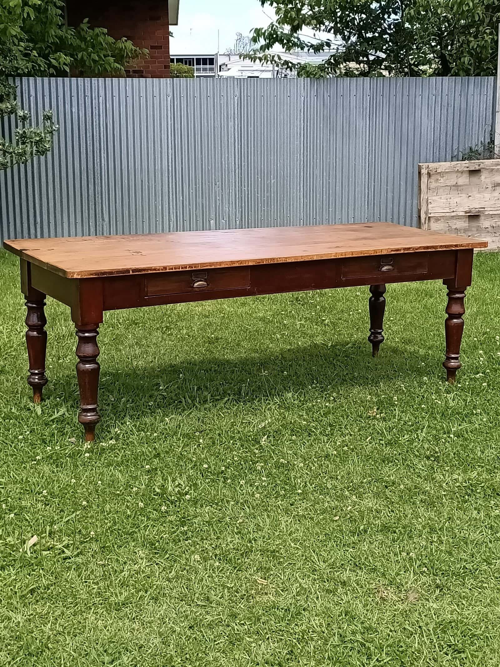 Get your crew around this divine, long kauri dining table.  Heavy set, thick planks, rounded corners, twin cutlery drawers and lovely turned legs.  Seen plenty of diners and workers which gives it the most amazing CENTURY and a HALF of human patina ...ink, scratches, knicks, dents and LOVING.  Washed and waxed top, scrubbed legs, and freshly restored with patina intact.  Will happily seat ten to a dozen diners.   Circa 1880.