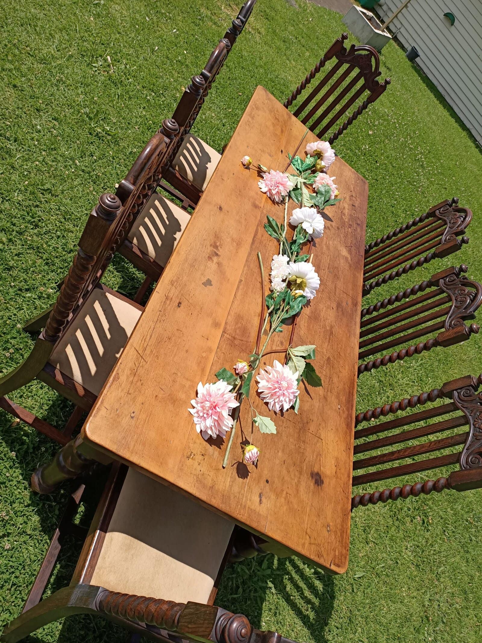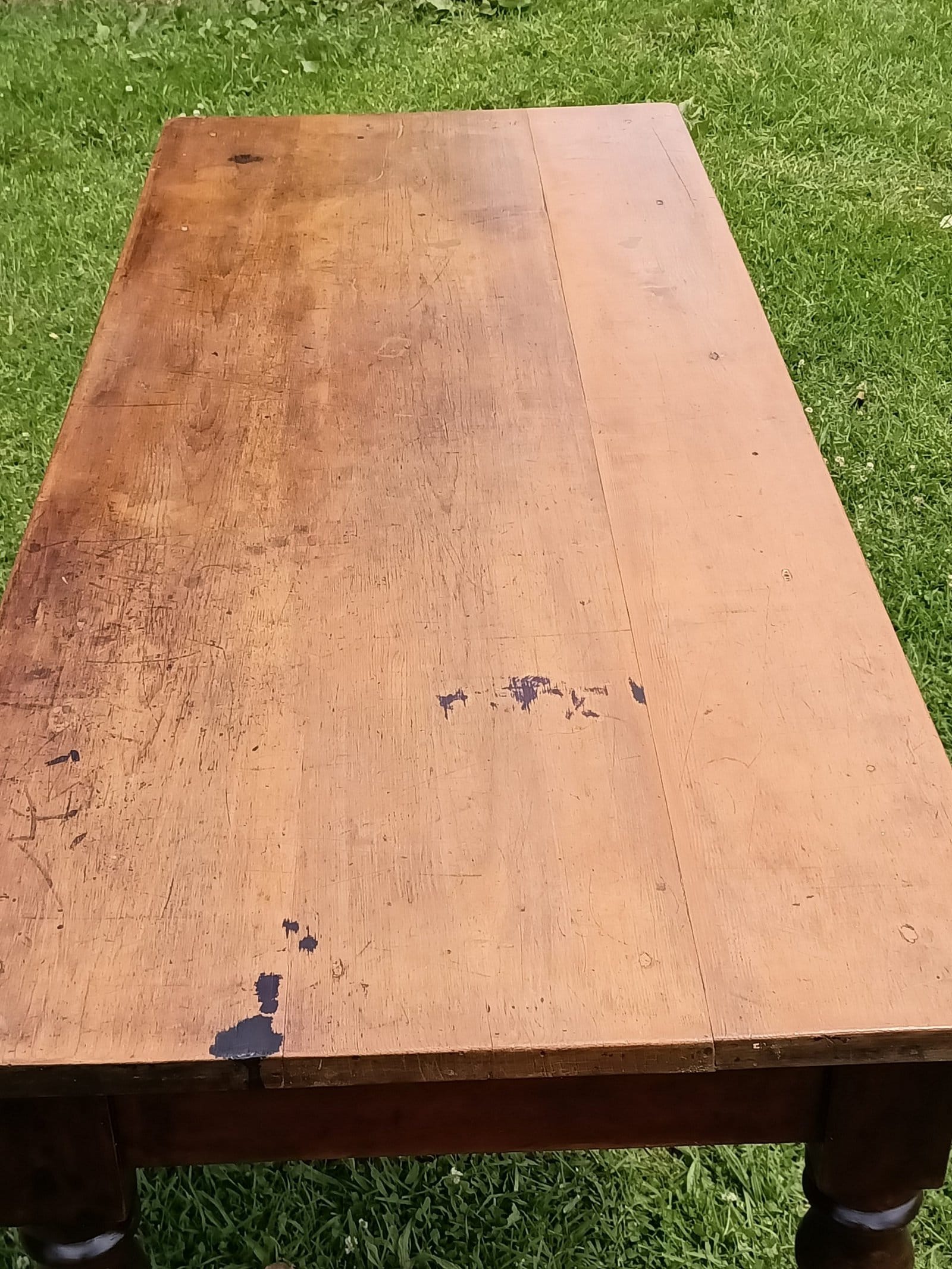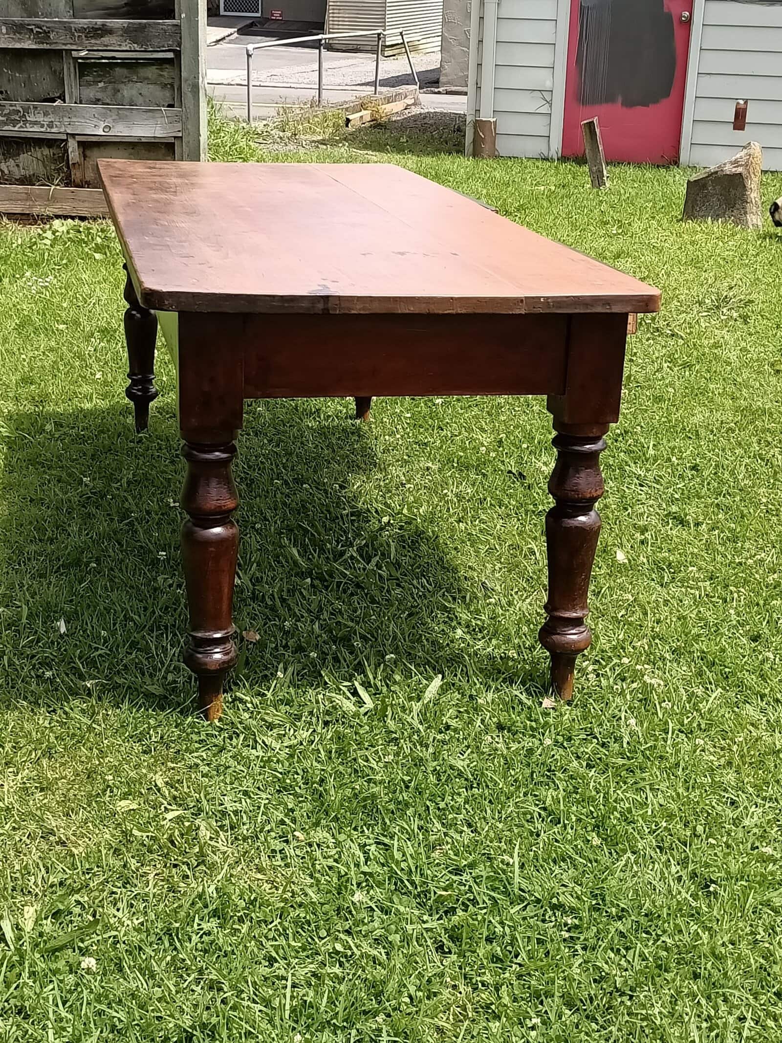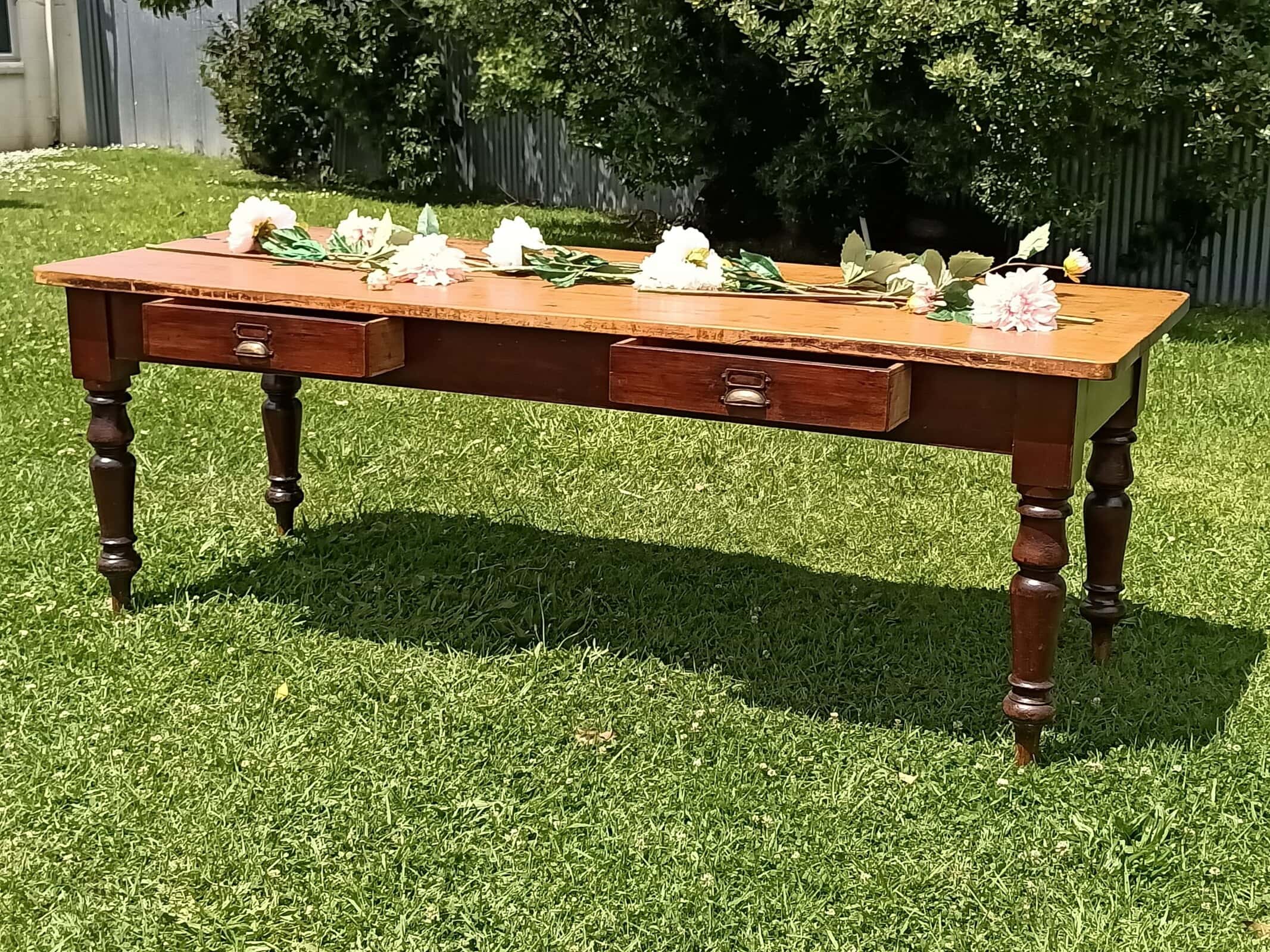 Get your crew around this divine, long kauri dining table.  Heavy set, thick planks, rounded corners, twin cutlery drawers and lovely turned legs.  Seen plenty of diners and workers which gives it the most amazing CENTURY and a HALF of human patina ...ink, scratches, knicks, dents and LOVING.  Washed and waxed top, scrubbed legs, and freshly restored with patina intact.  Will happily seat ten to a dozen diners.   Circa 1880.