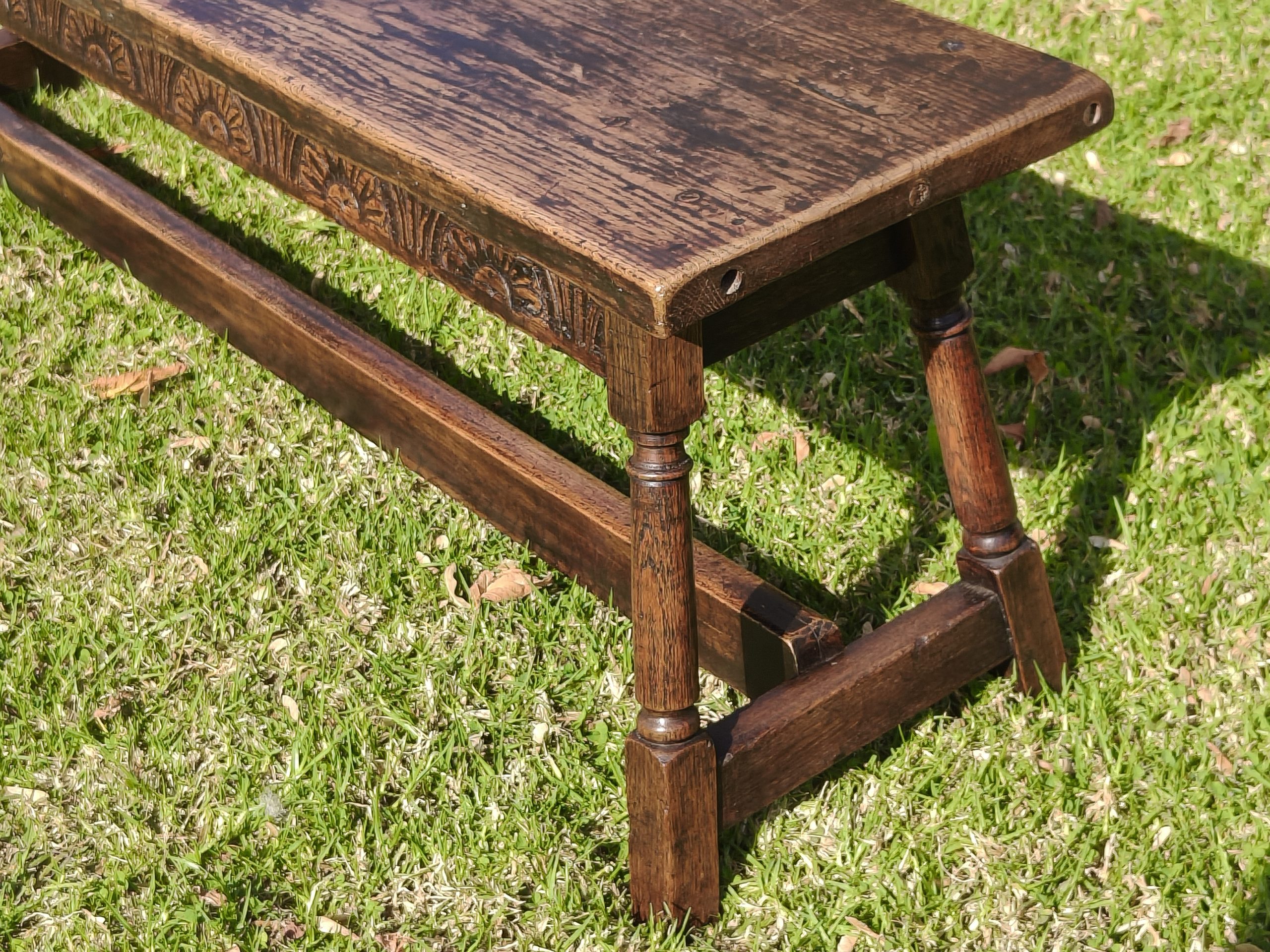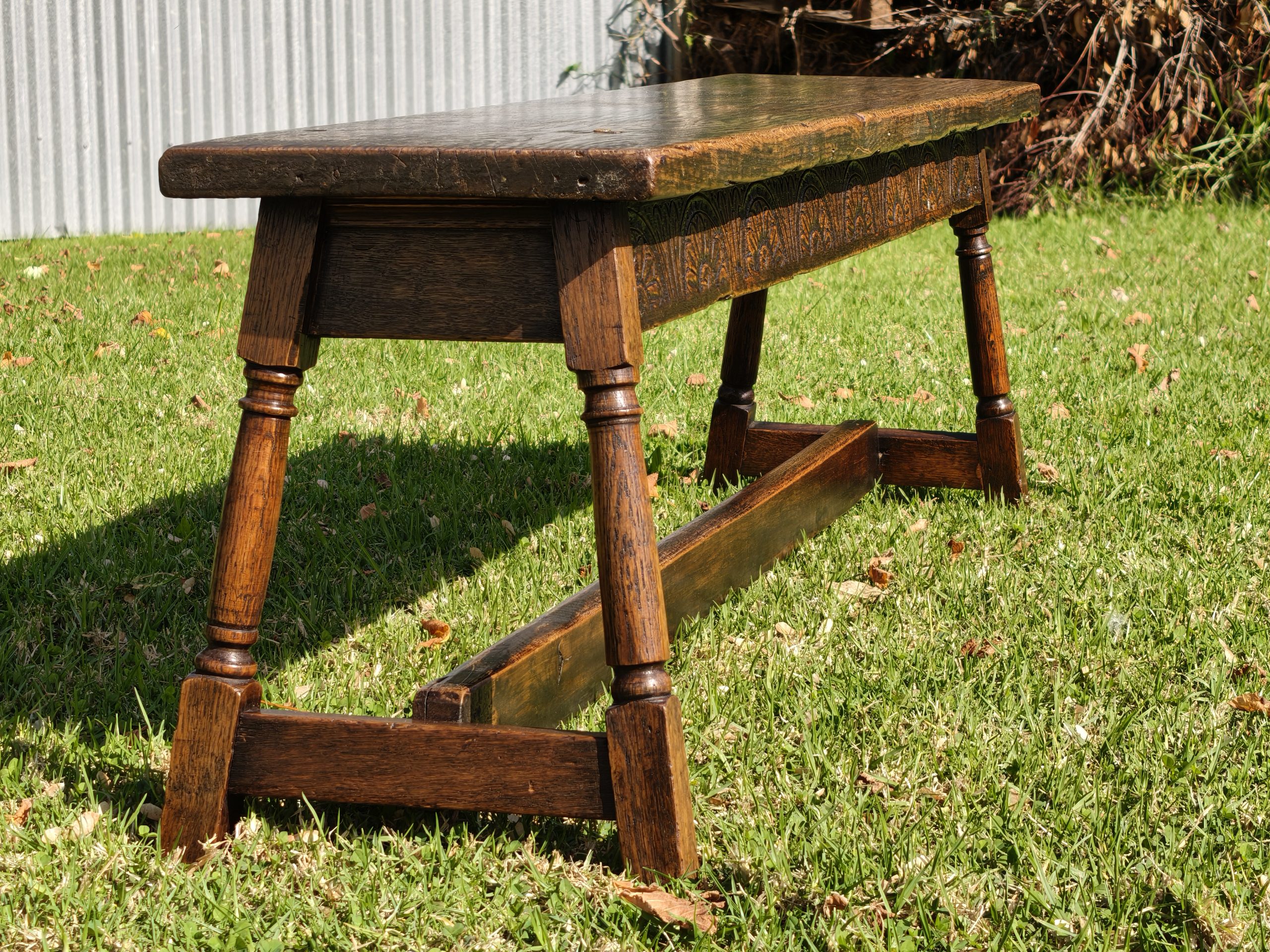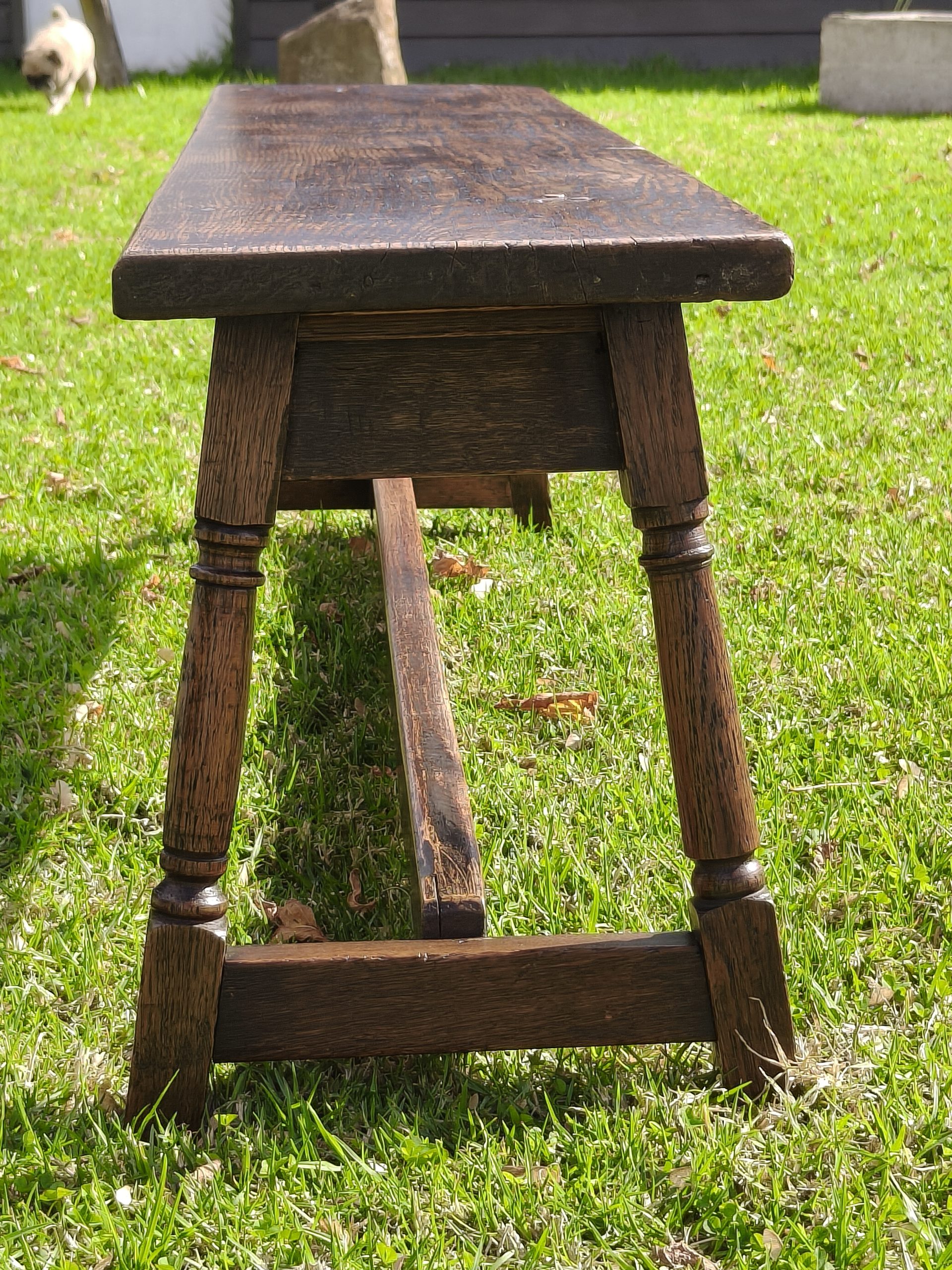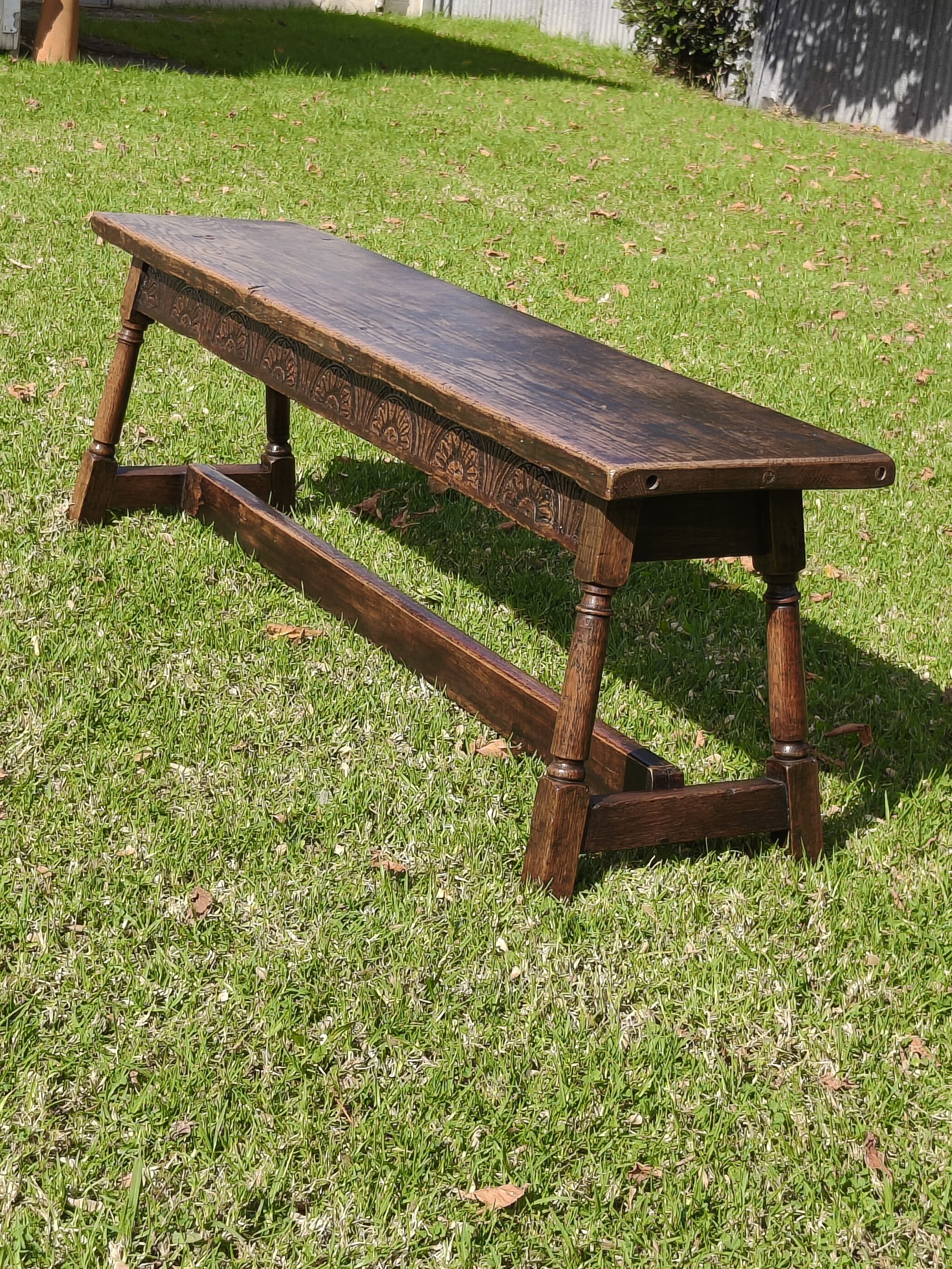 May we preserve our Earth. It's quite possible... just gotta get the psychopaths outta the top jobs AND the rest of us will keep up the furniture recycling. This gorgeous long oak joint stool is just a divine piece of recycle! Splayed refectory legs, decent depth seat plank. Half arched daisy chain frieze along the seat apron. Good condition, patina, a dash of super old worm holes and small historic repairs. Goes anywhere with anything with her rustic charm and fudgy hues. Circa 1880, possibly some parts are older.