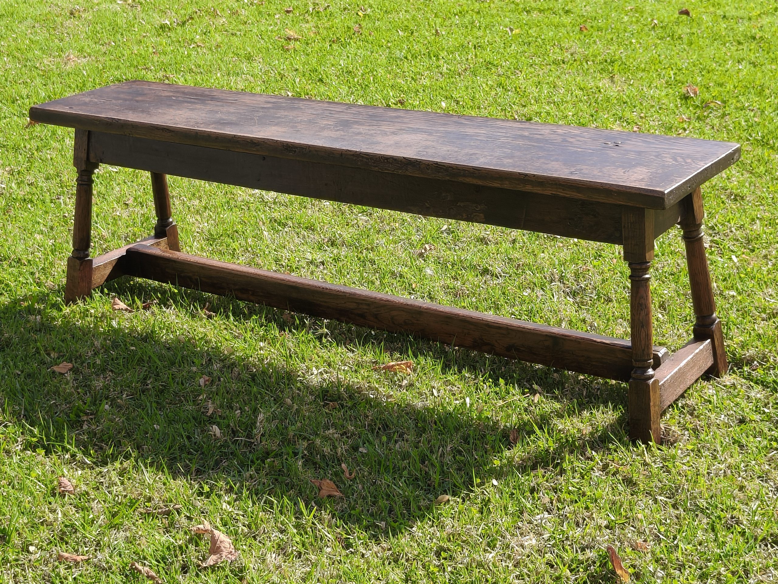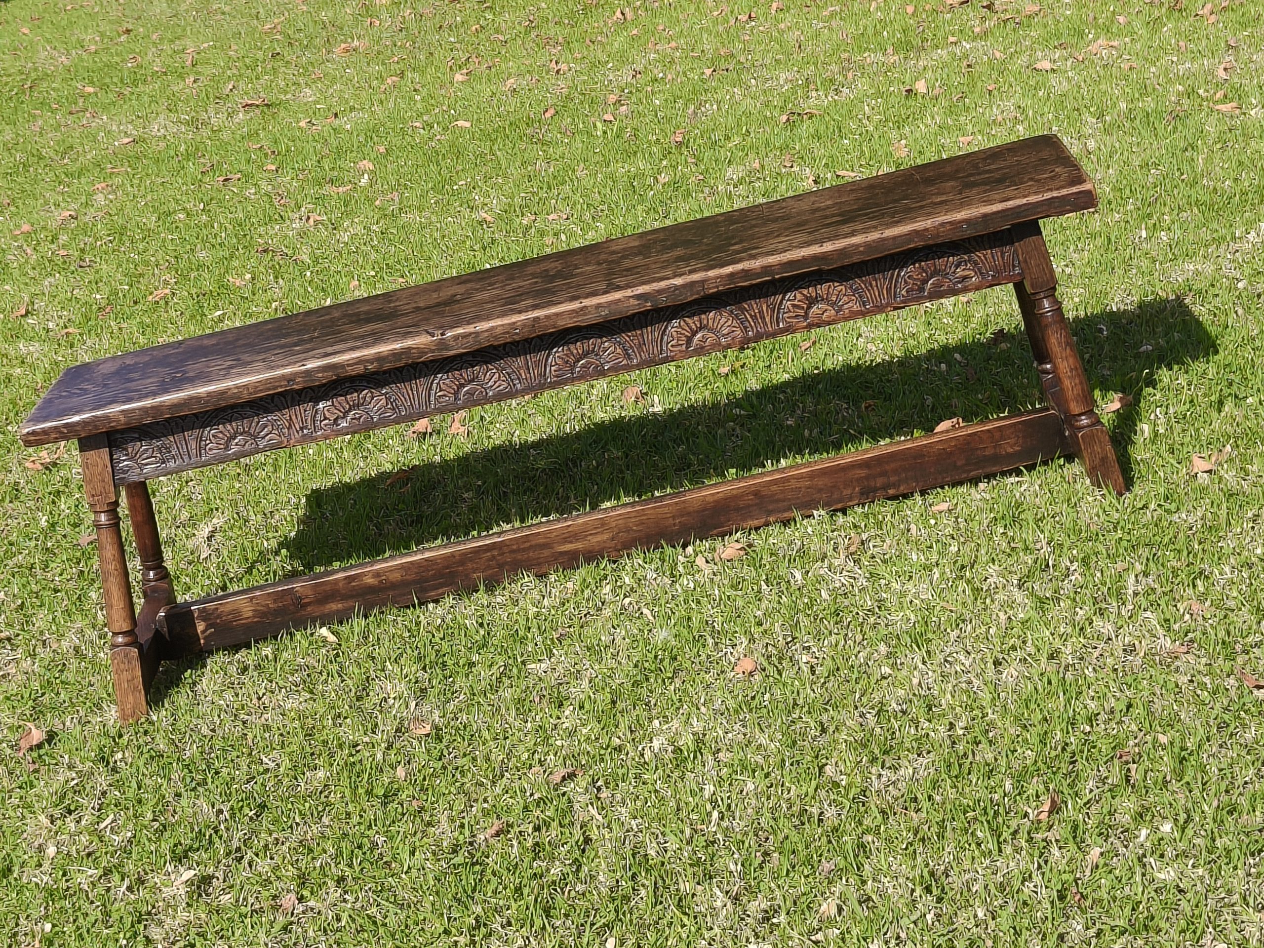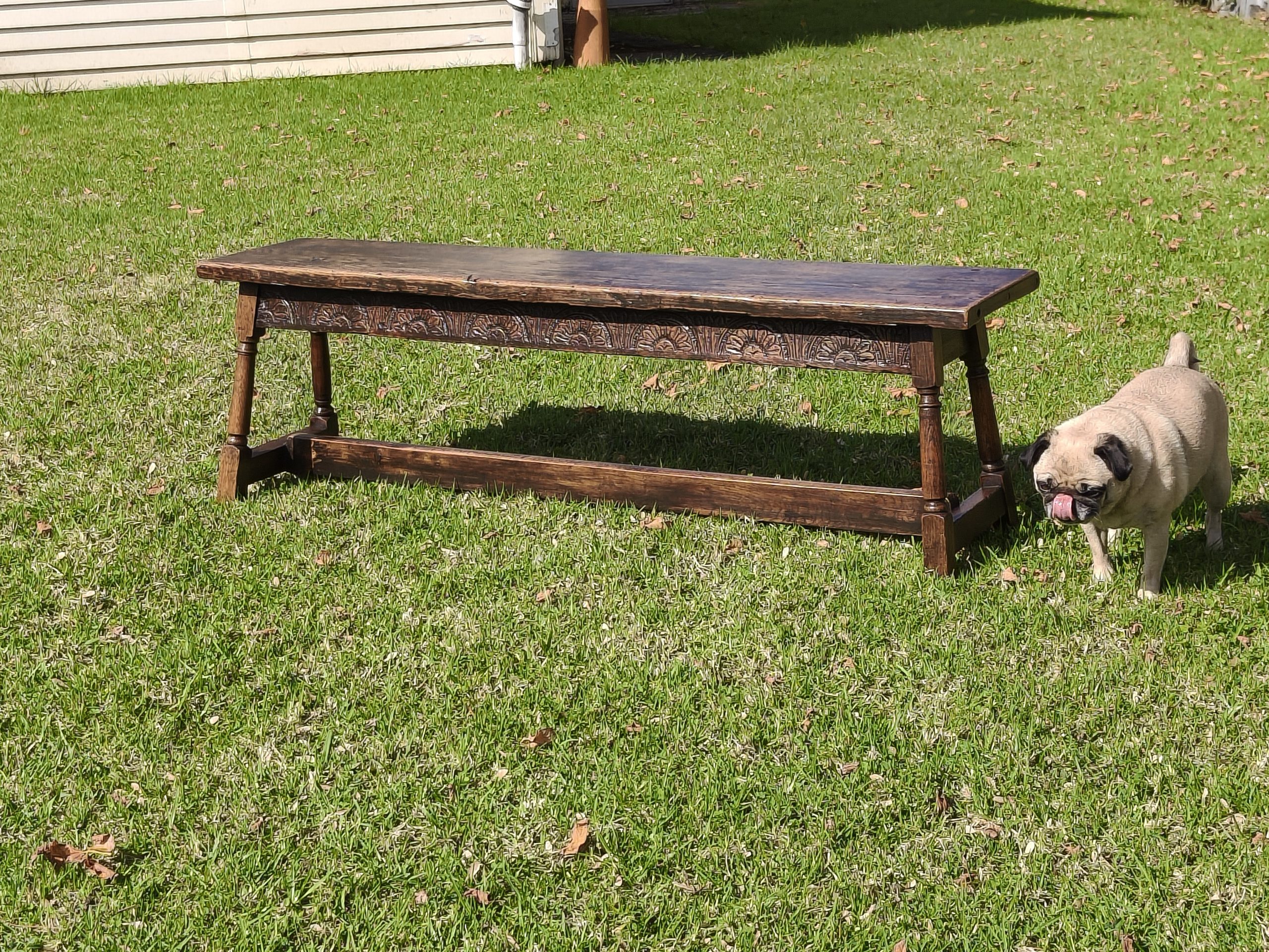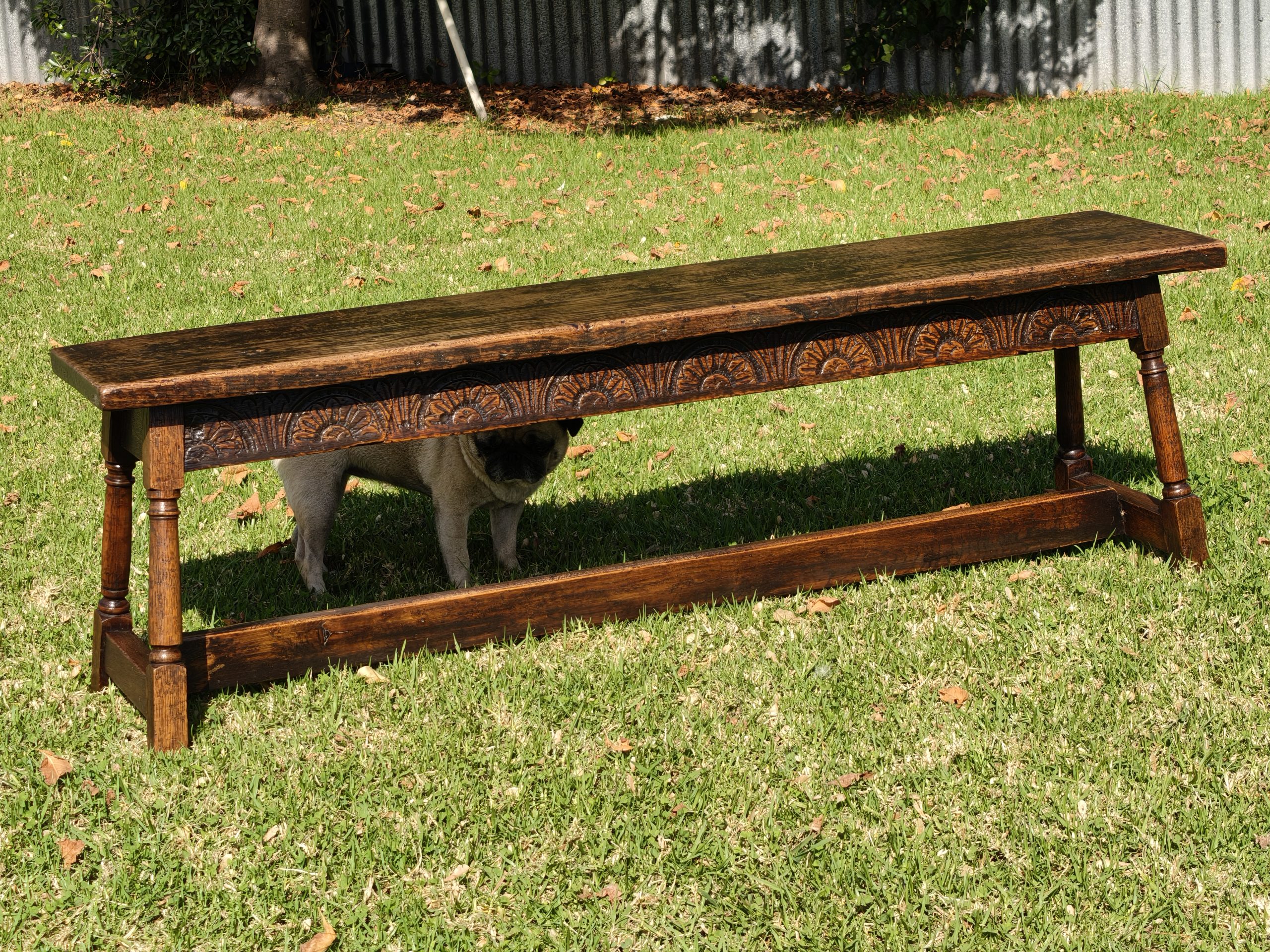 May we preserve our Earth. It's quite possible... just gotta get the psychopaths outta the top jobs AND the rest of us will keep up the furniture recycling. This gorgeous long oak joint stool is just a divine piece of recycle! Splayed refectory legs, decent depth seat plank. Half arched daisy chain frieze along the seat apron. Good condition, patina, a dash of super old worm holes and small historic repairs. Goes anywhere with anything with her rustic charm and fudgy hues. Circa 1880, possibly some parts are older.