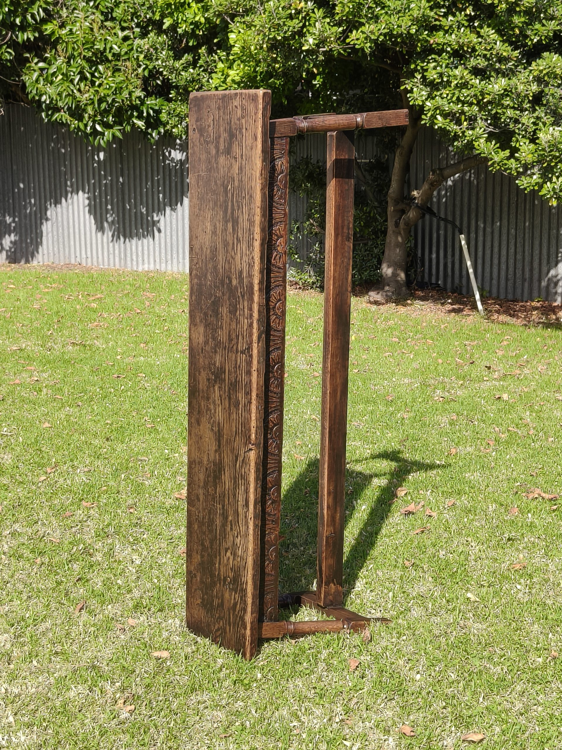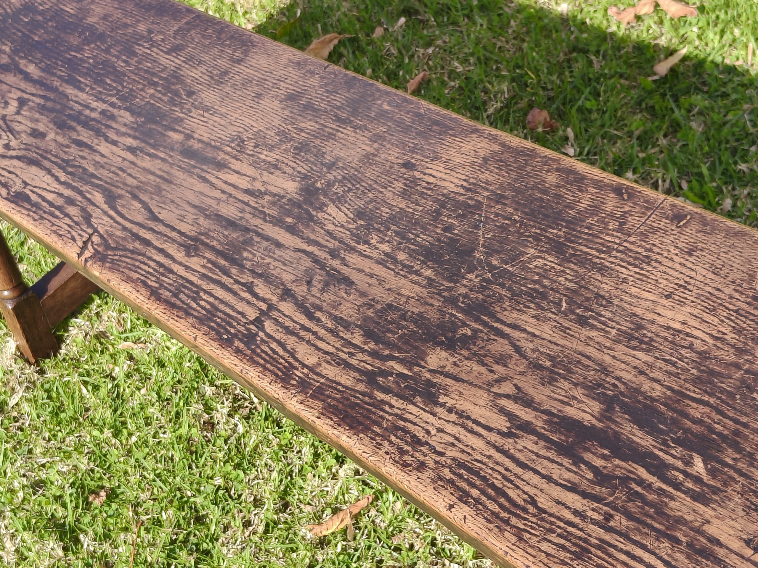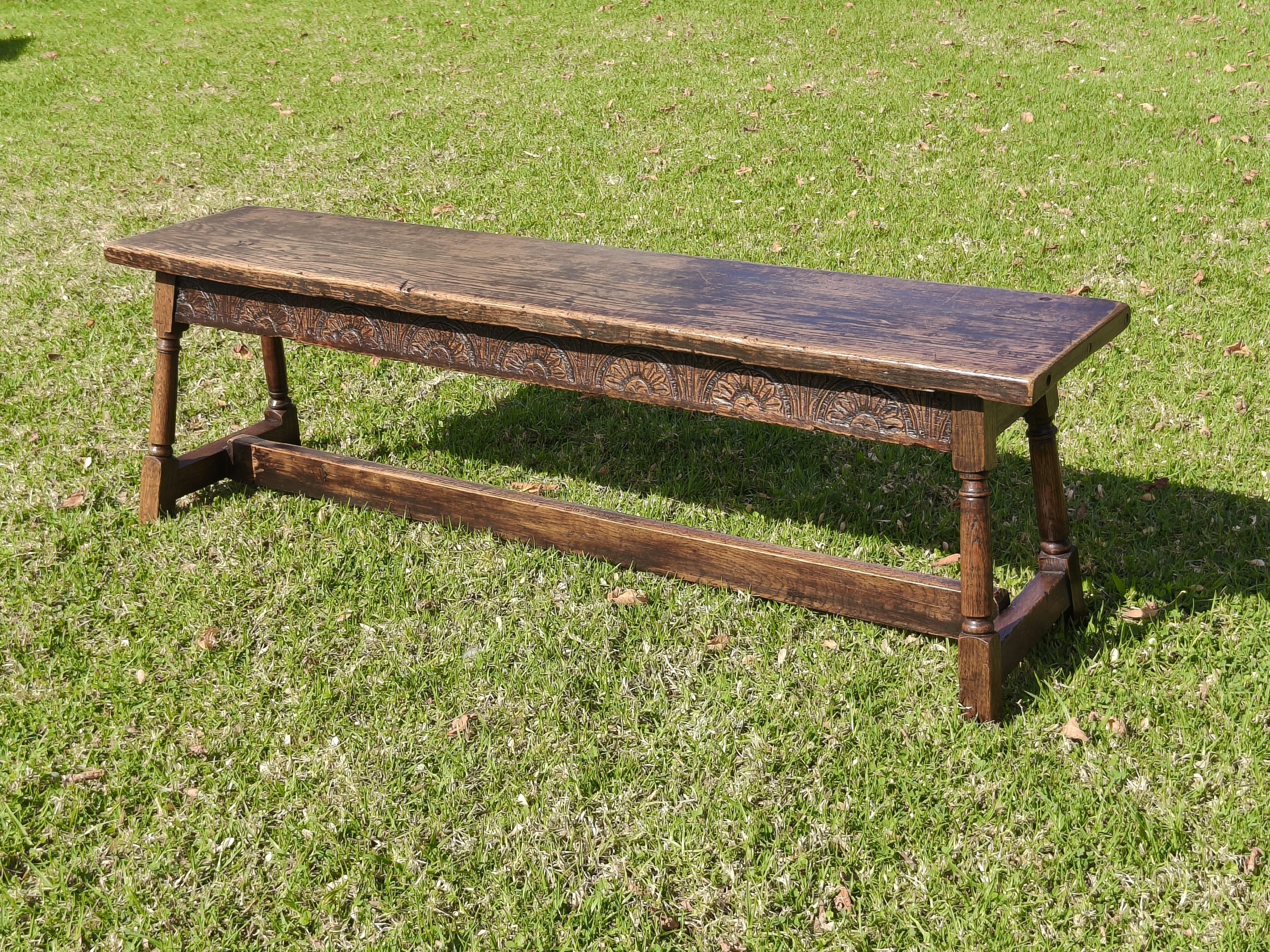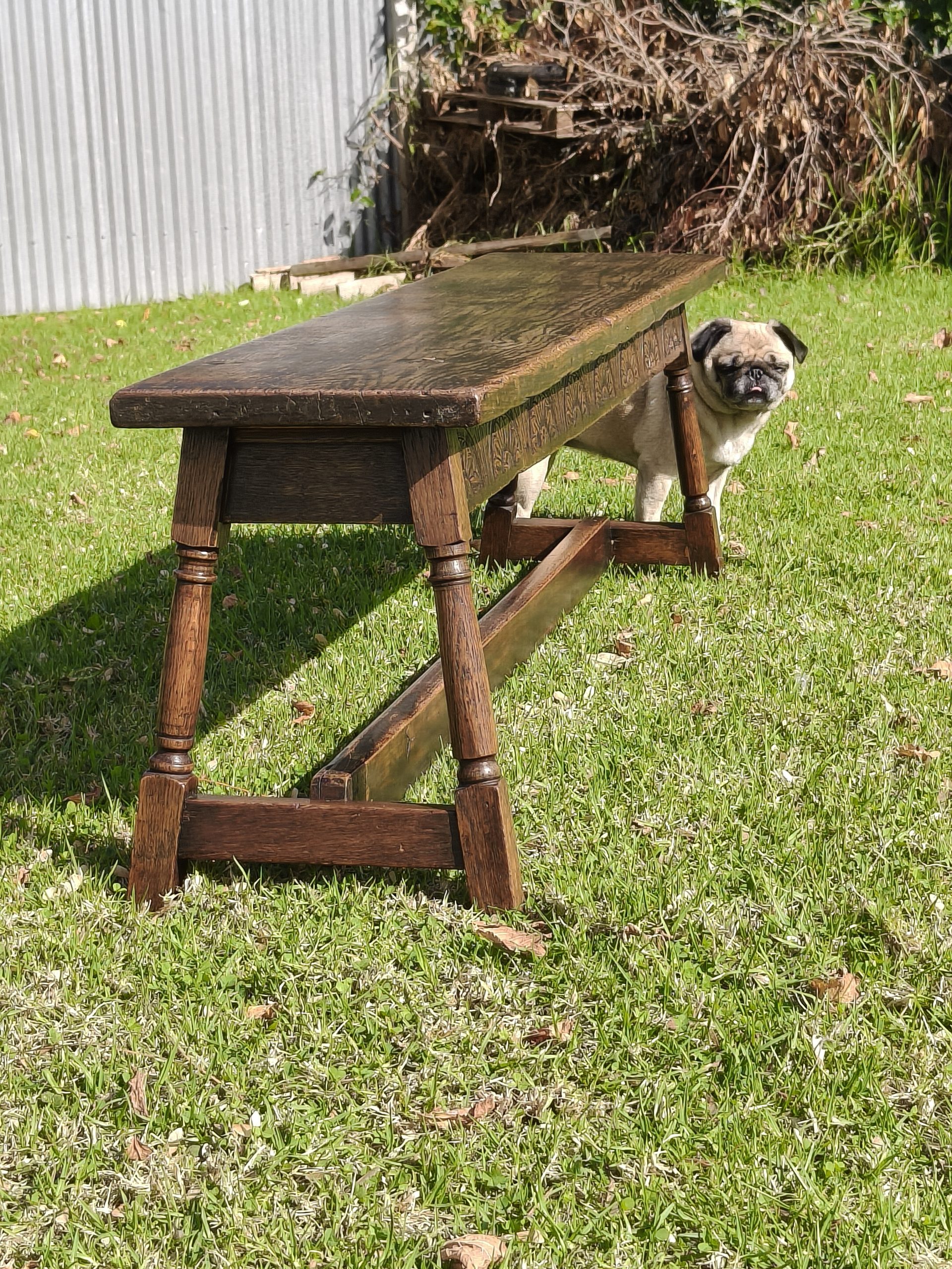 May we preserve our Earth. It's quite possible... just gotta get the psychopaths outta the top jobs AND the rest of us will keep up the furniture recycling. This gorgeous long oak joint stool is just a divine piece of recycle! Splayed refectory legs, decent depth seat plank. Half arched daisy chain frieze along the seat apron. Good condition, patina, a dash of super old worm holes and small historic repairs. Goes anywhere with anything with her rustic charm and fudgy hues. Circa 1880, possibly some parts are older.
