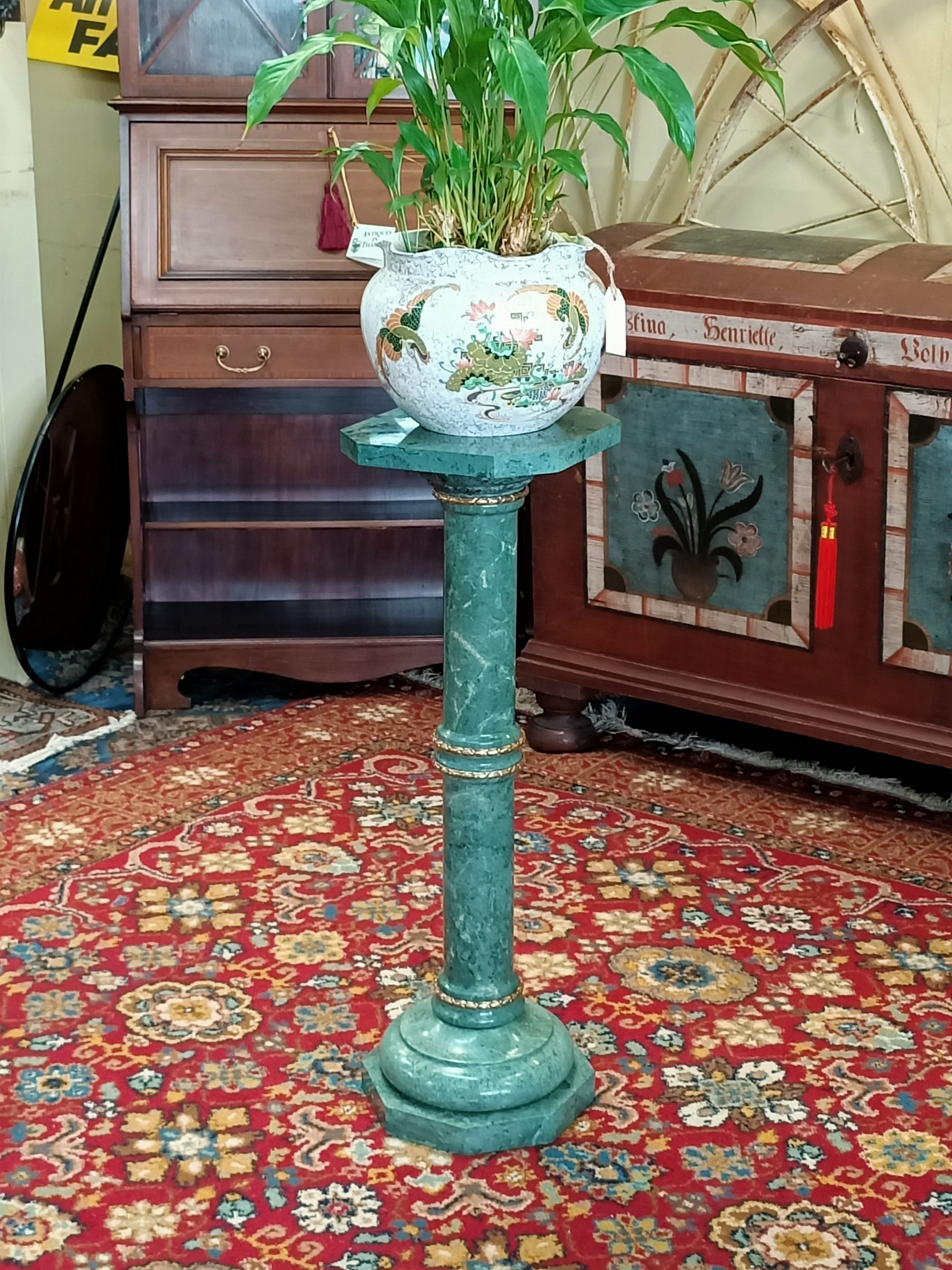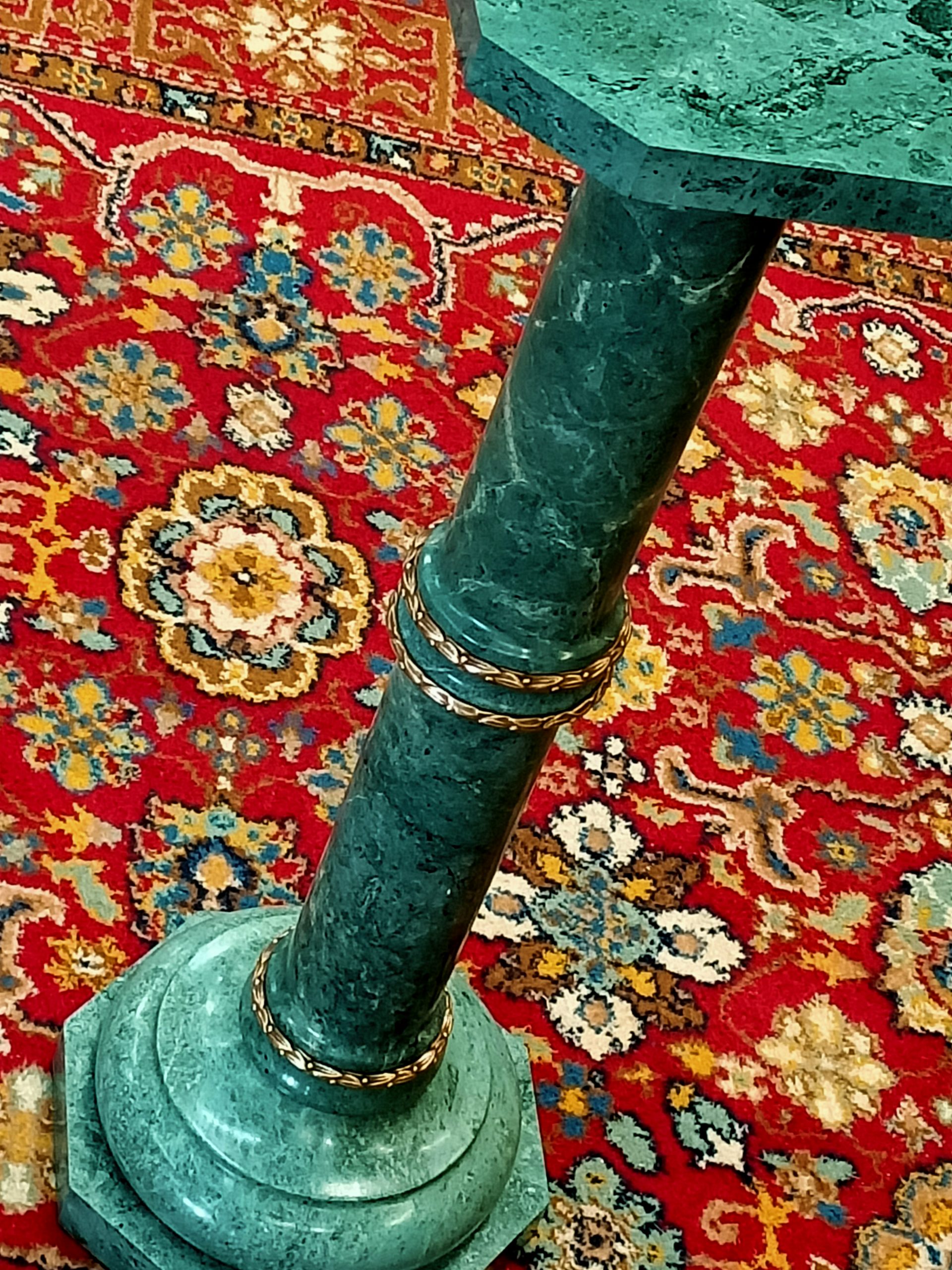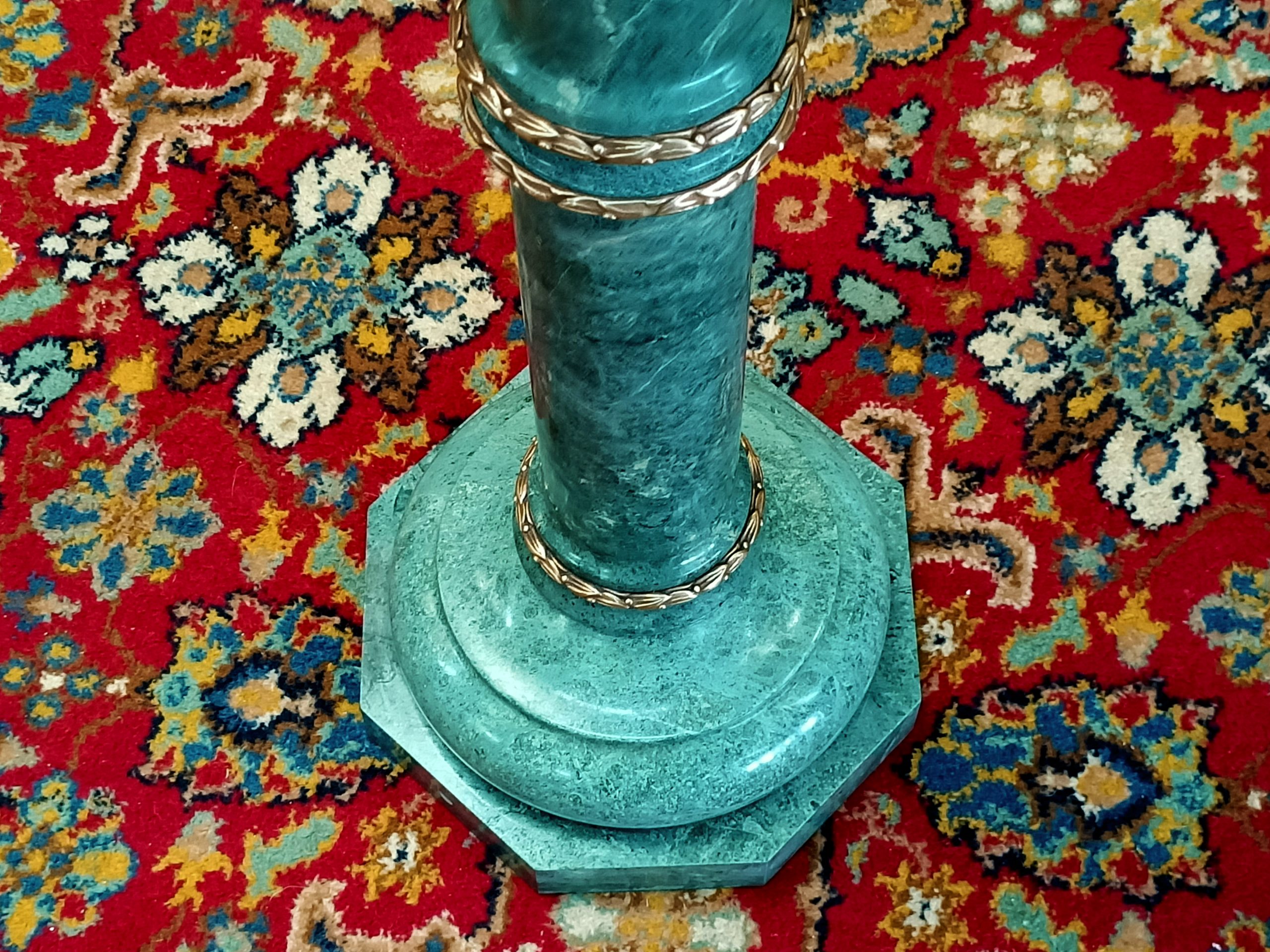 A marble column; cylindrical, slightly tapered, upon an octagonal base, with a fat marble upper plate. Gorgeous grainy sage-verdigris hued green marble, trimmed with ormolu bands on the joins. Top with a bust or big tendrilled plant. Yummy. Heavy. Excellent condition. The Laird thinks this started life as a standard lamp base (hence the wiring tunnel in the base). Circa 1990.