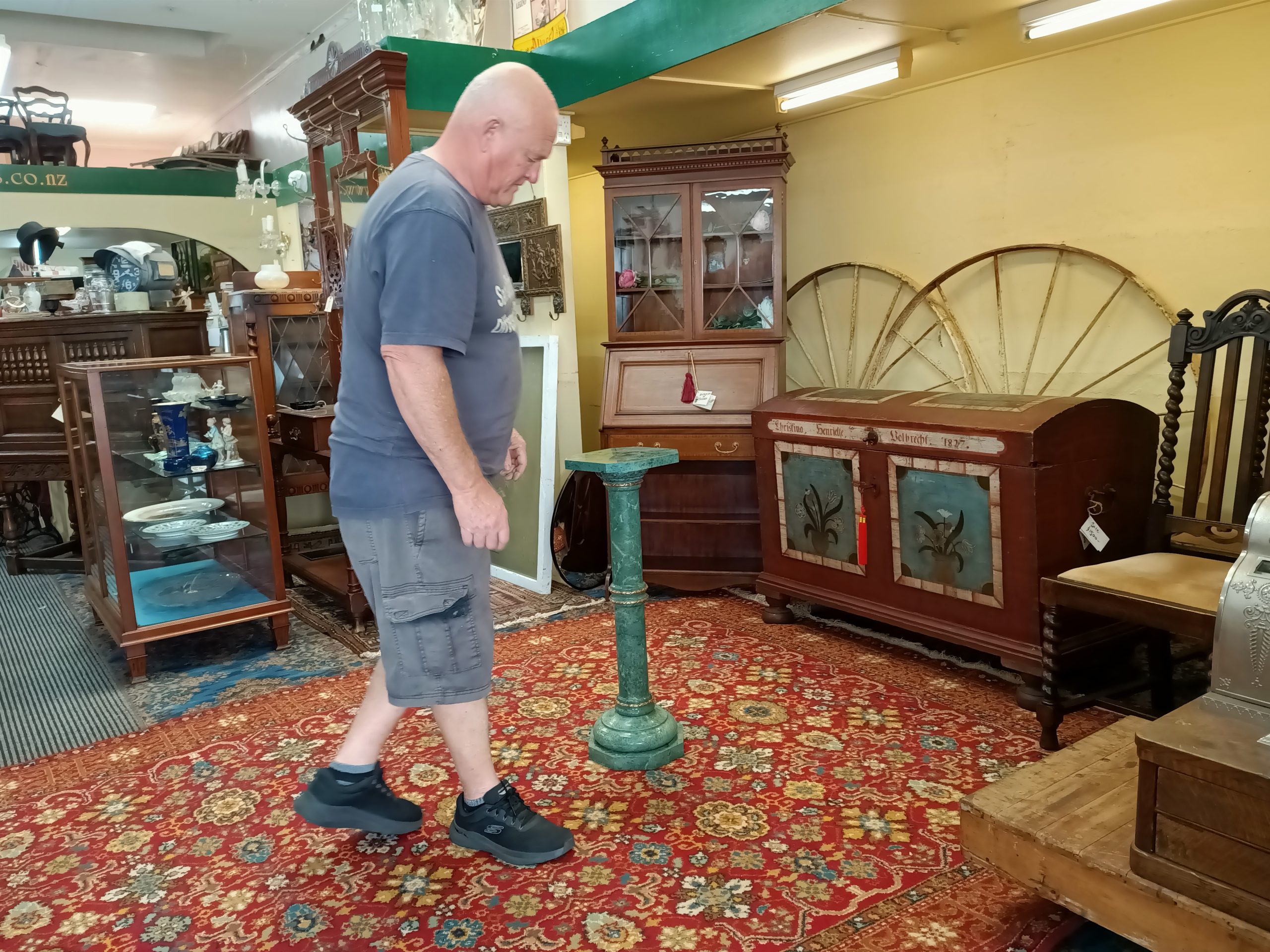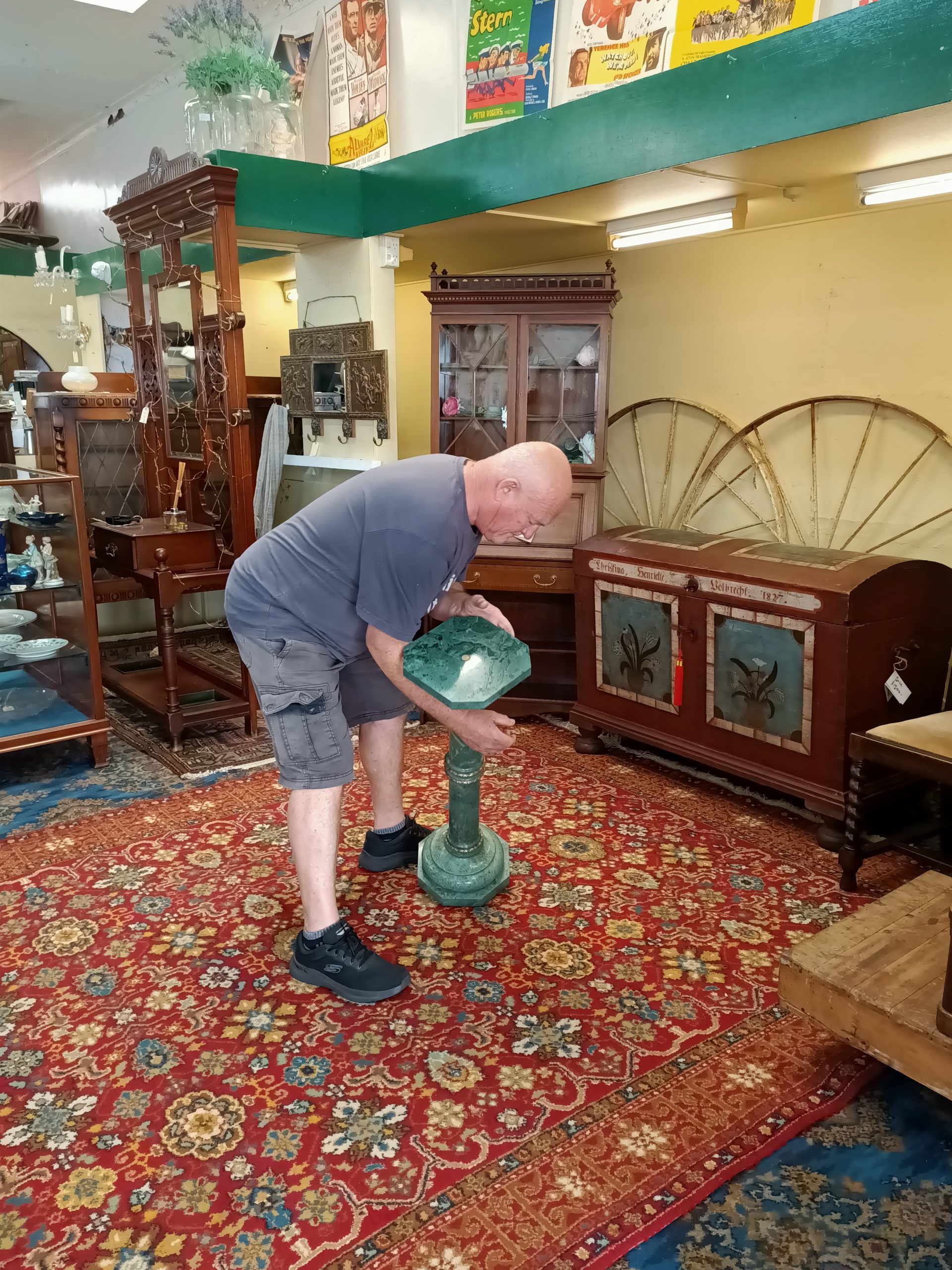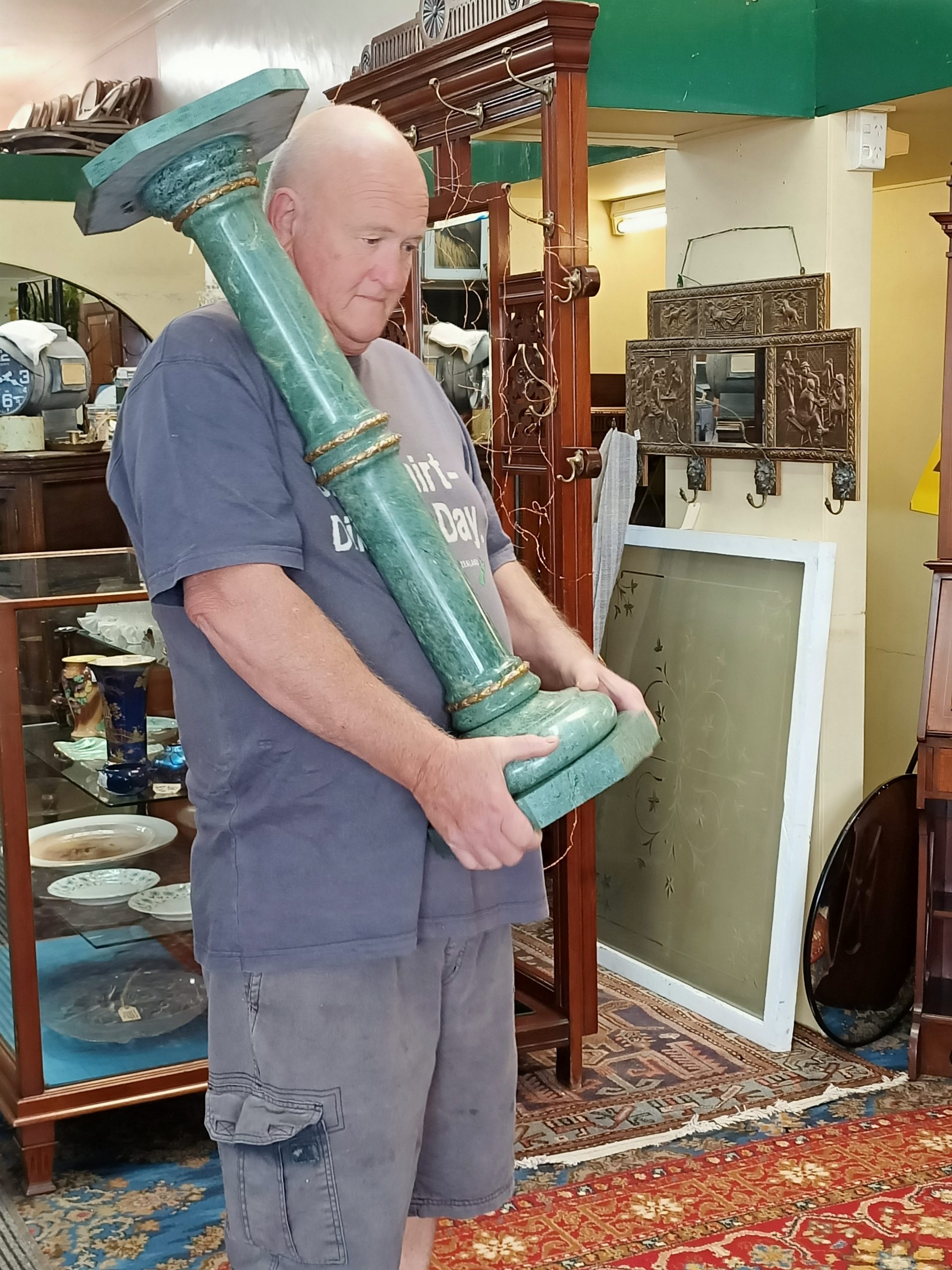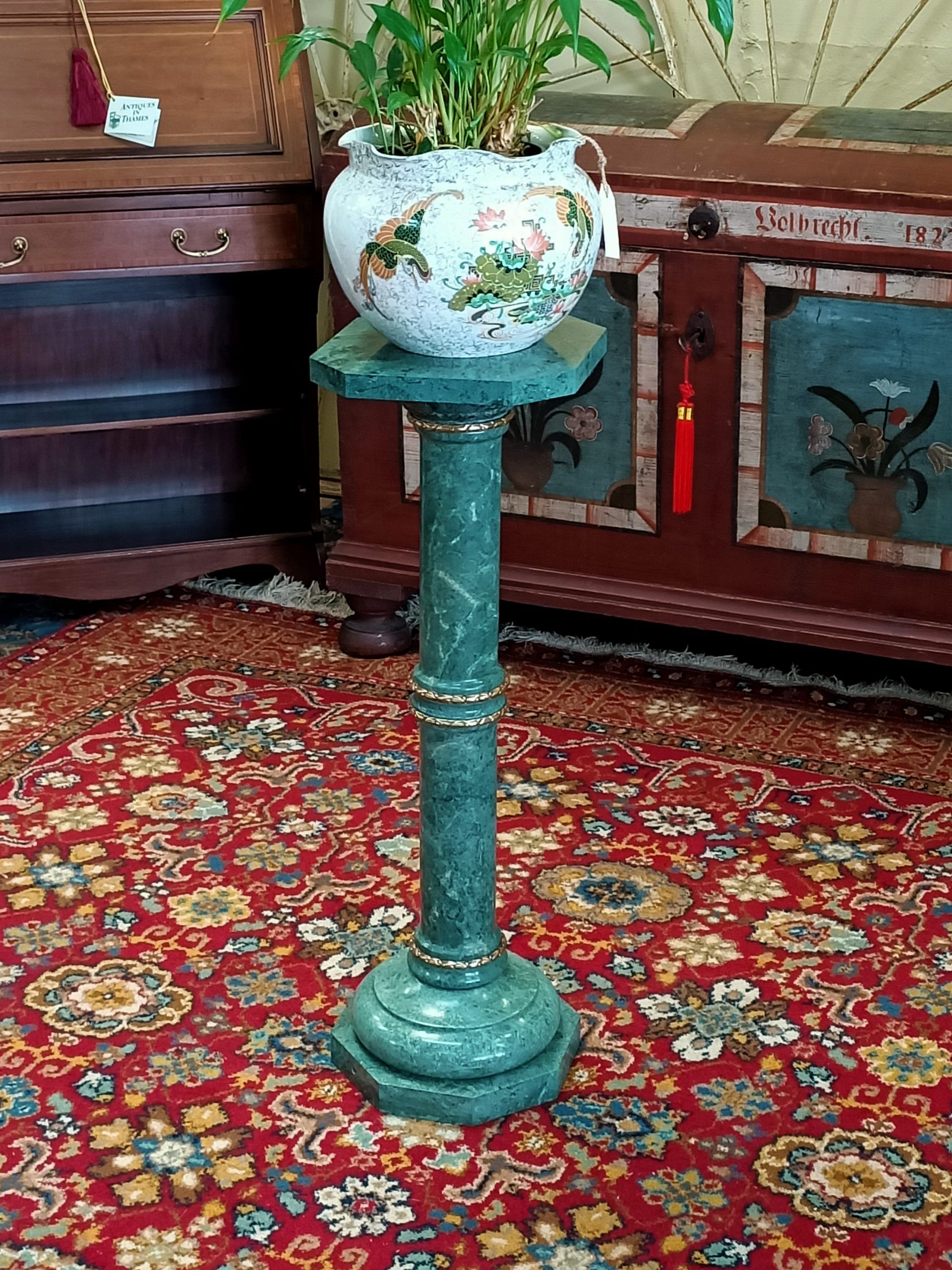 A marble column; cylindrical, slightly tapered, upon an octagonal base, with a fat marble upper plate. Gorgeous grainy sage-verdigris hued green marble, trimmed with ormolu bands on the joins. Top with a bust or big tendrilled plant. Yummy. Heavy. Excellent condition. The Laird thinks this started life as a standard lamp base (hence the wiring tunnel in the base). Circa 1990.