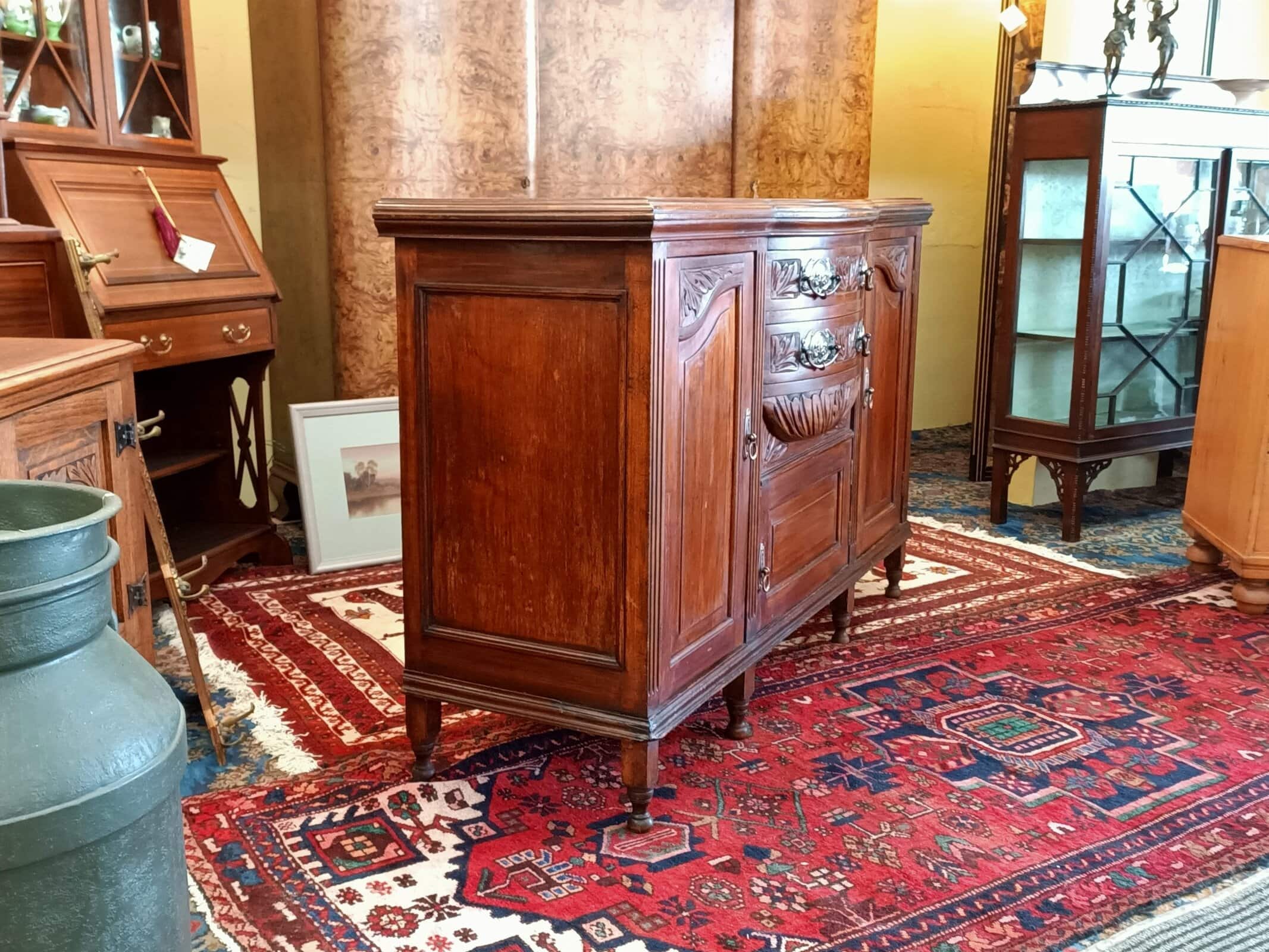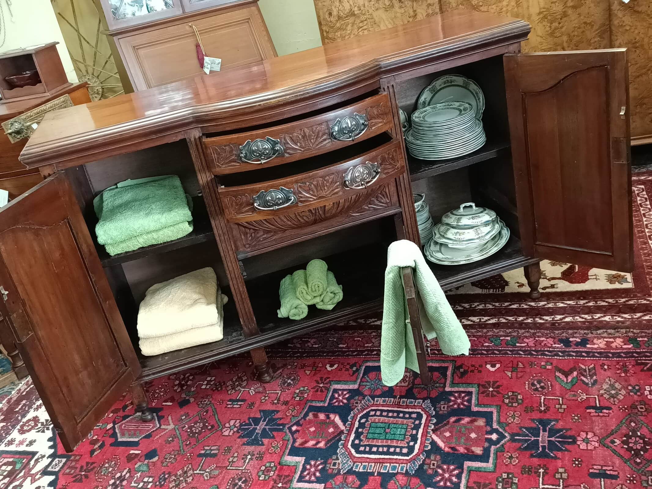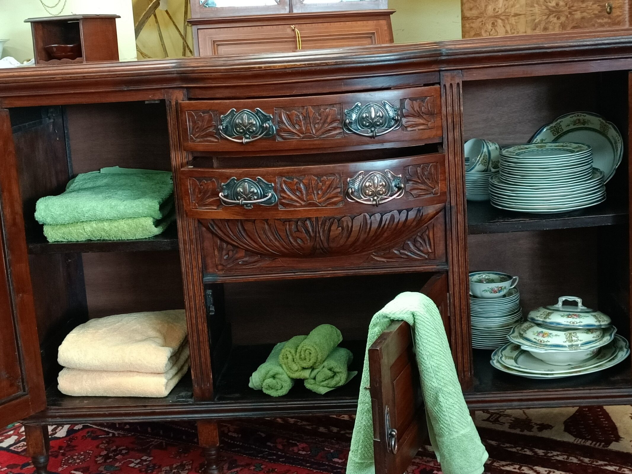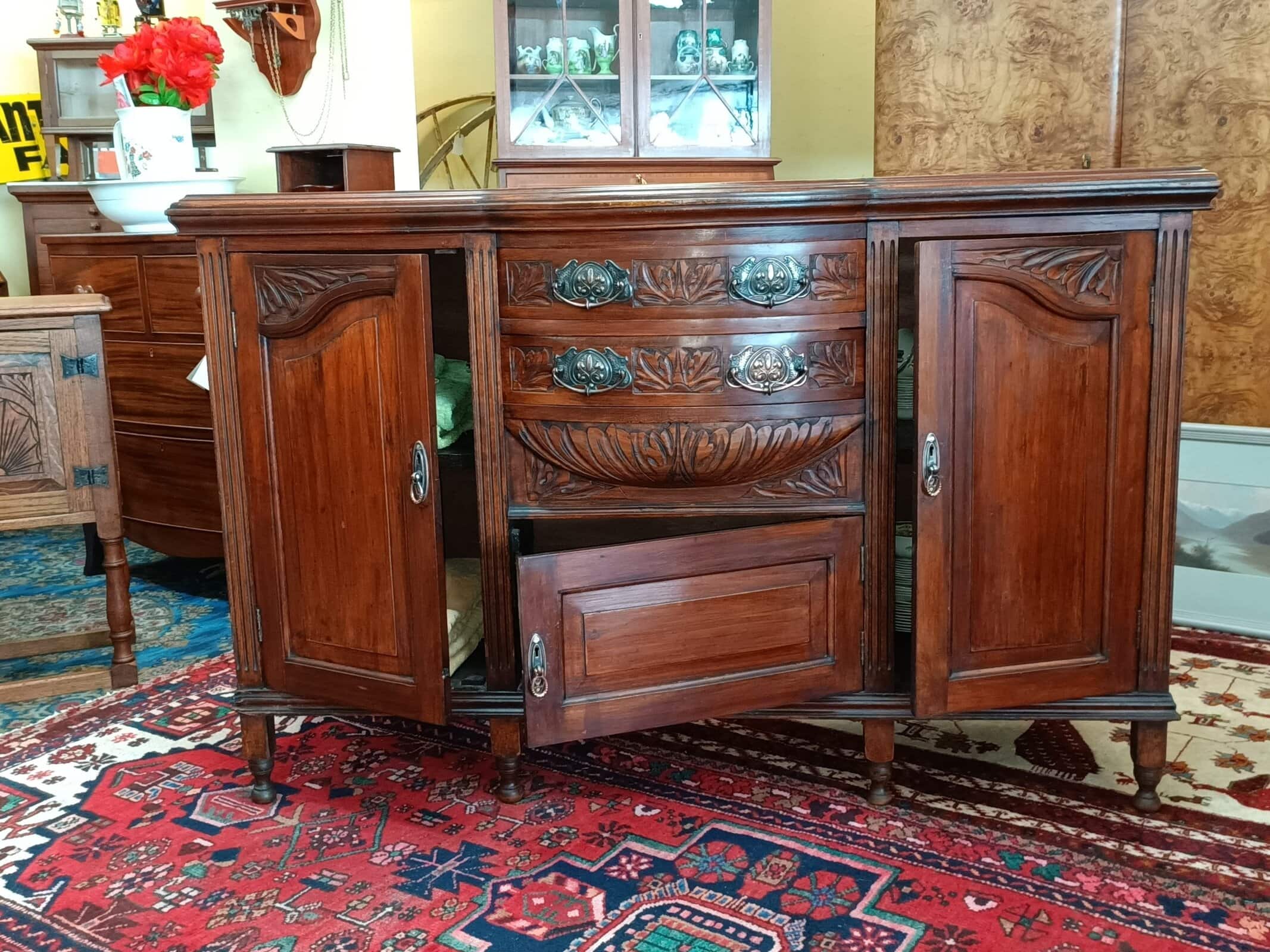 Get ya belly filled laughing, it helps to soften the crazy world we live in. Moreover, check out this rustic American walnut bellyfront sideboard. Russet hues, garland drawer panels, art nouveau copper on tin handles, all-storage with central bowed drawers and lower cupboards. Up on little turned legs. Got some knicks and bumps, so priced accordingly. Clean. YOU could modify this for a vanity by amputating legs and lifting top off for a basin top. Circa 1890.