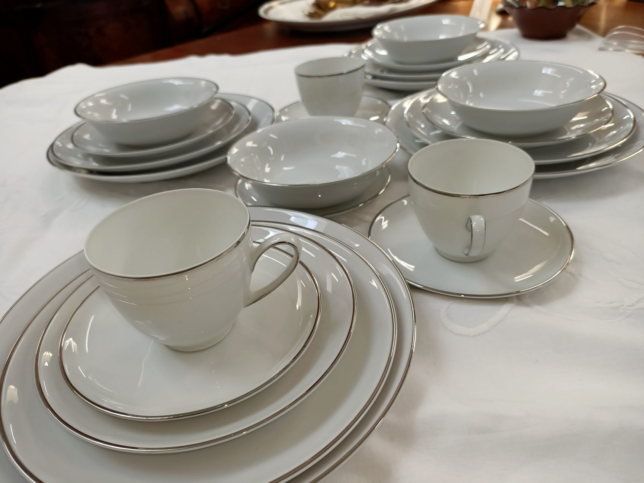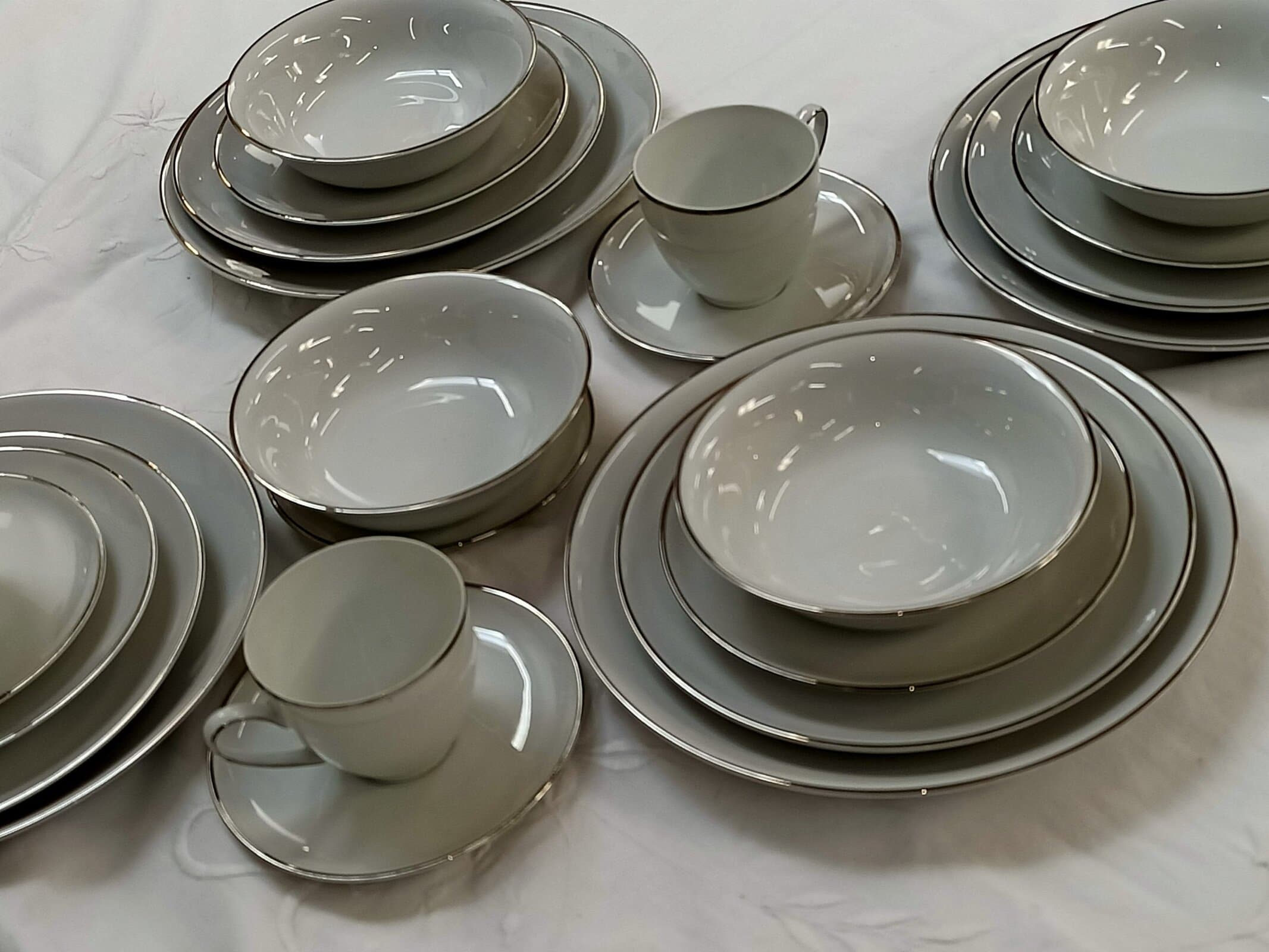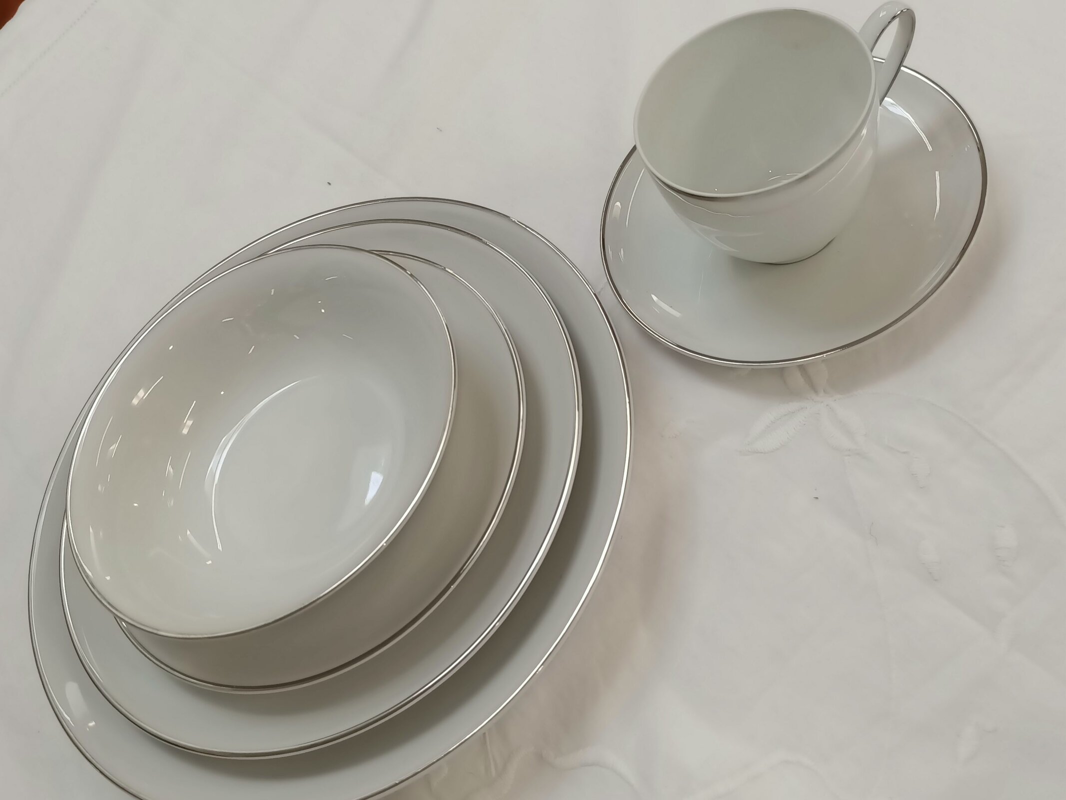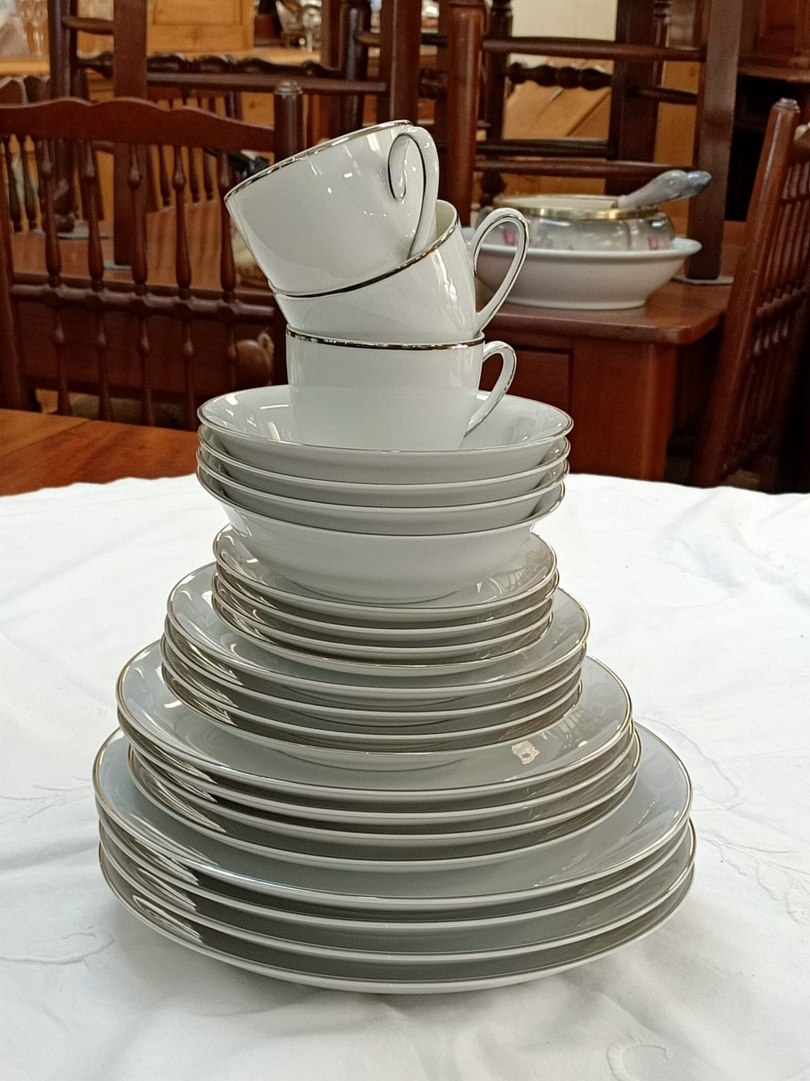 Well, these are cheaper than a visit to the supermarket... and certainly lovelier! A part, mostly four place setting of Hutschenreuther's simple white china with platinum rimmed set. Four each of dinner, luncheon, bread and butter, bowls, three cups and saucers. Sorry, one cup missing. but everything present in perfect order. Teams up with any other pattern because of its simplicity. Circa 1990.