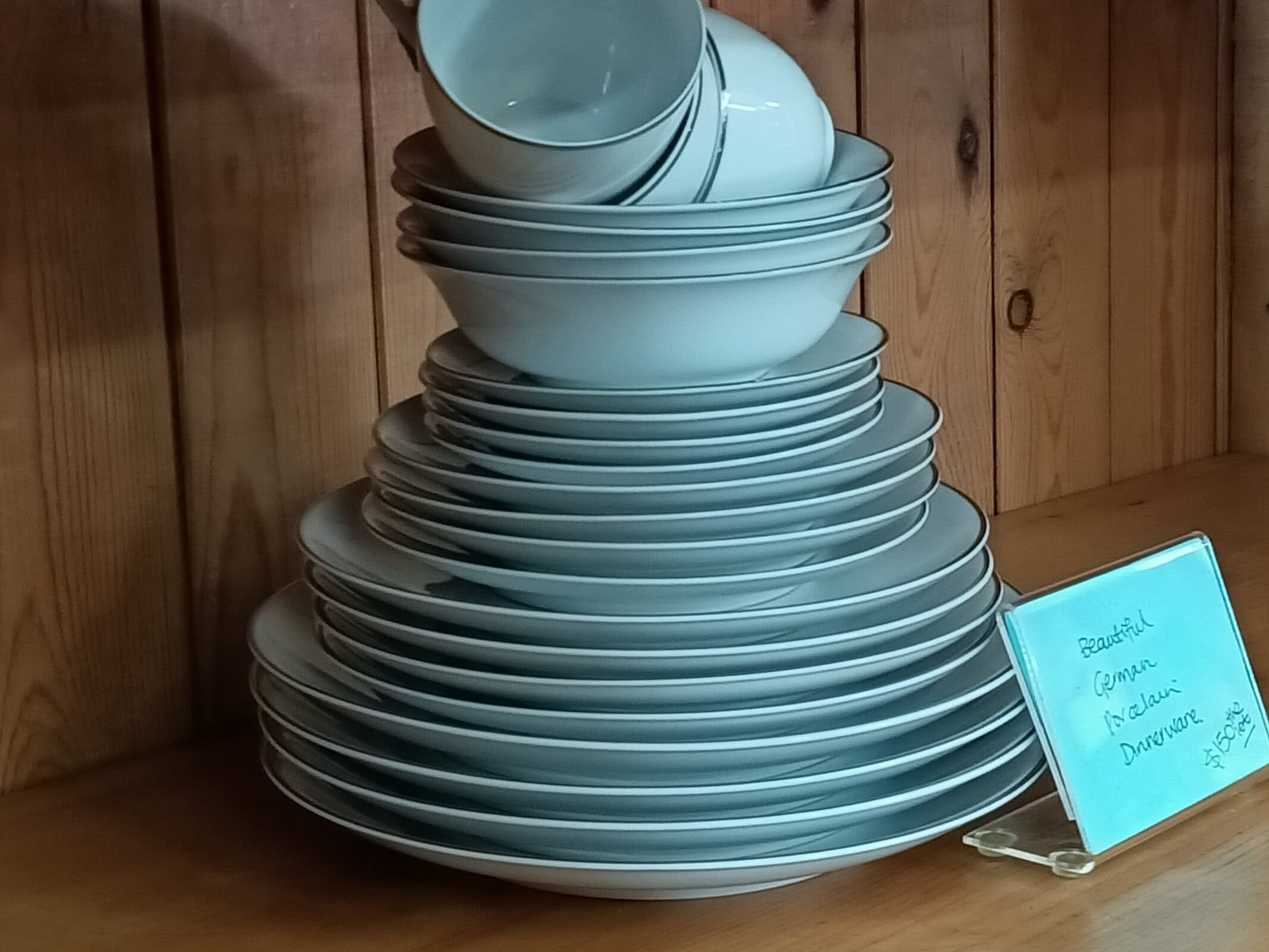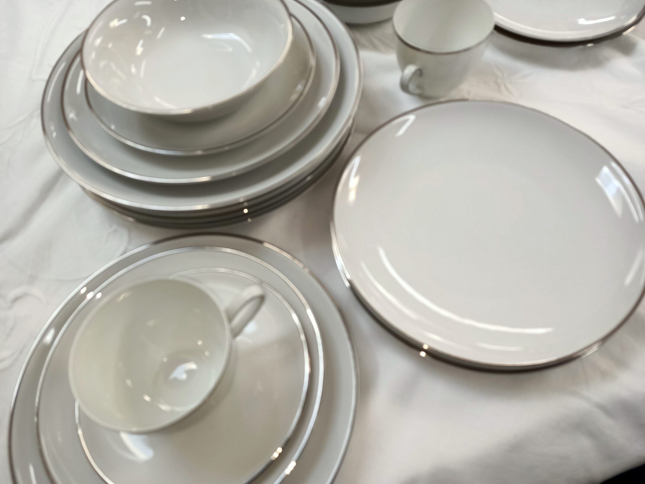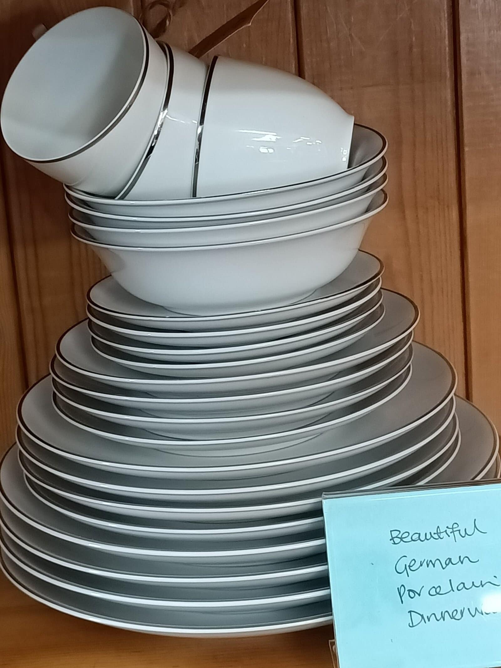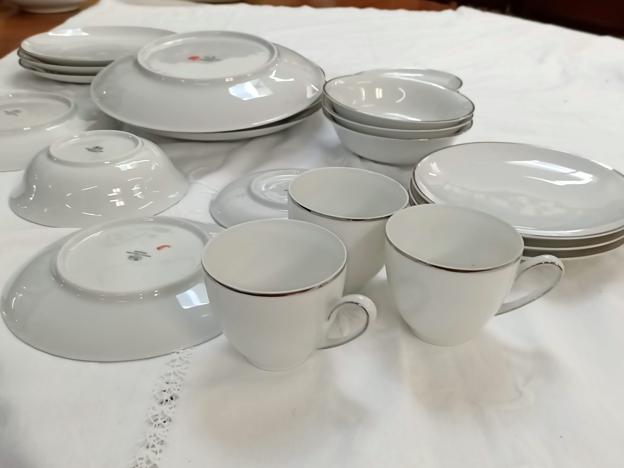 Well, these are cheaper than a visit to the supermarket... and certainly lovelier! A part, mostly four place setting of Hutschenreuther's simple white china with platinum rimmed set. Four each of dinner, luncheon, bread and butter, bowls, three cups and saucers. Sorry, one cup missing. but everything present in perfect order. Teams up with any other pattern because of its simplicity. Circa 1990.