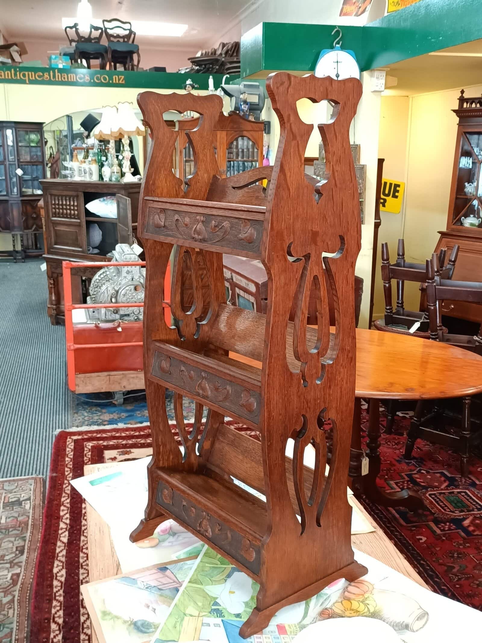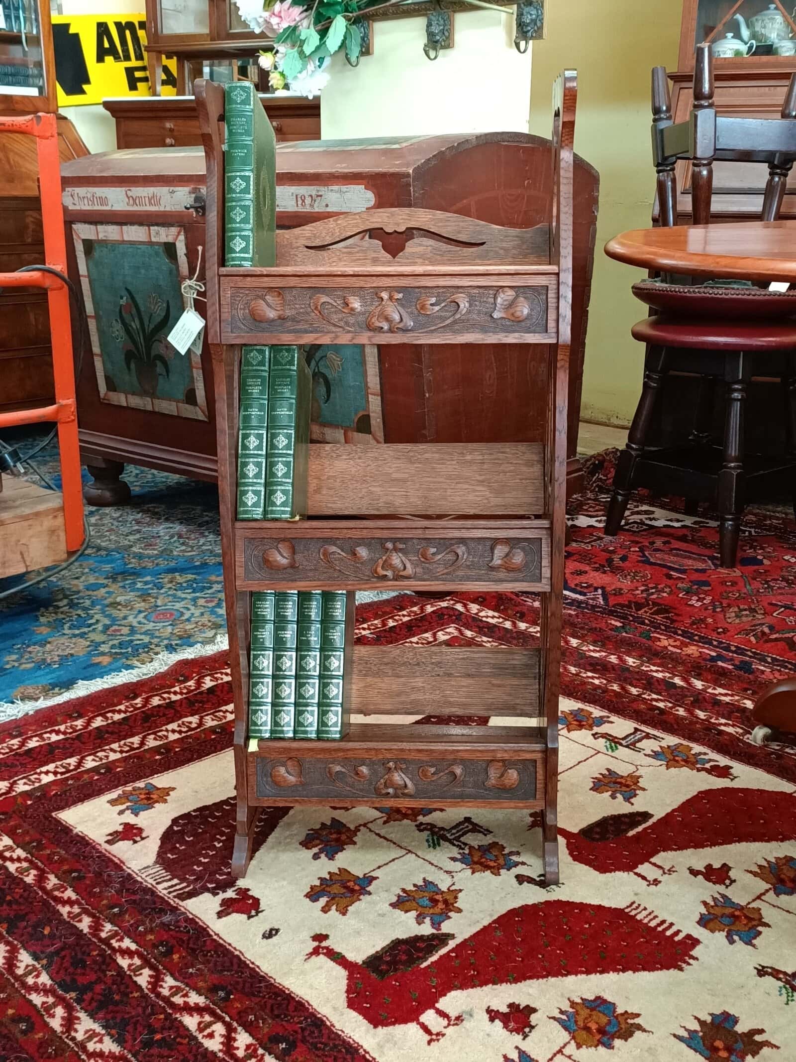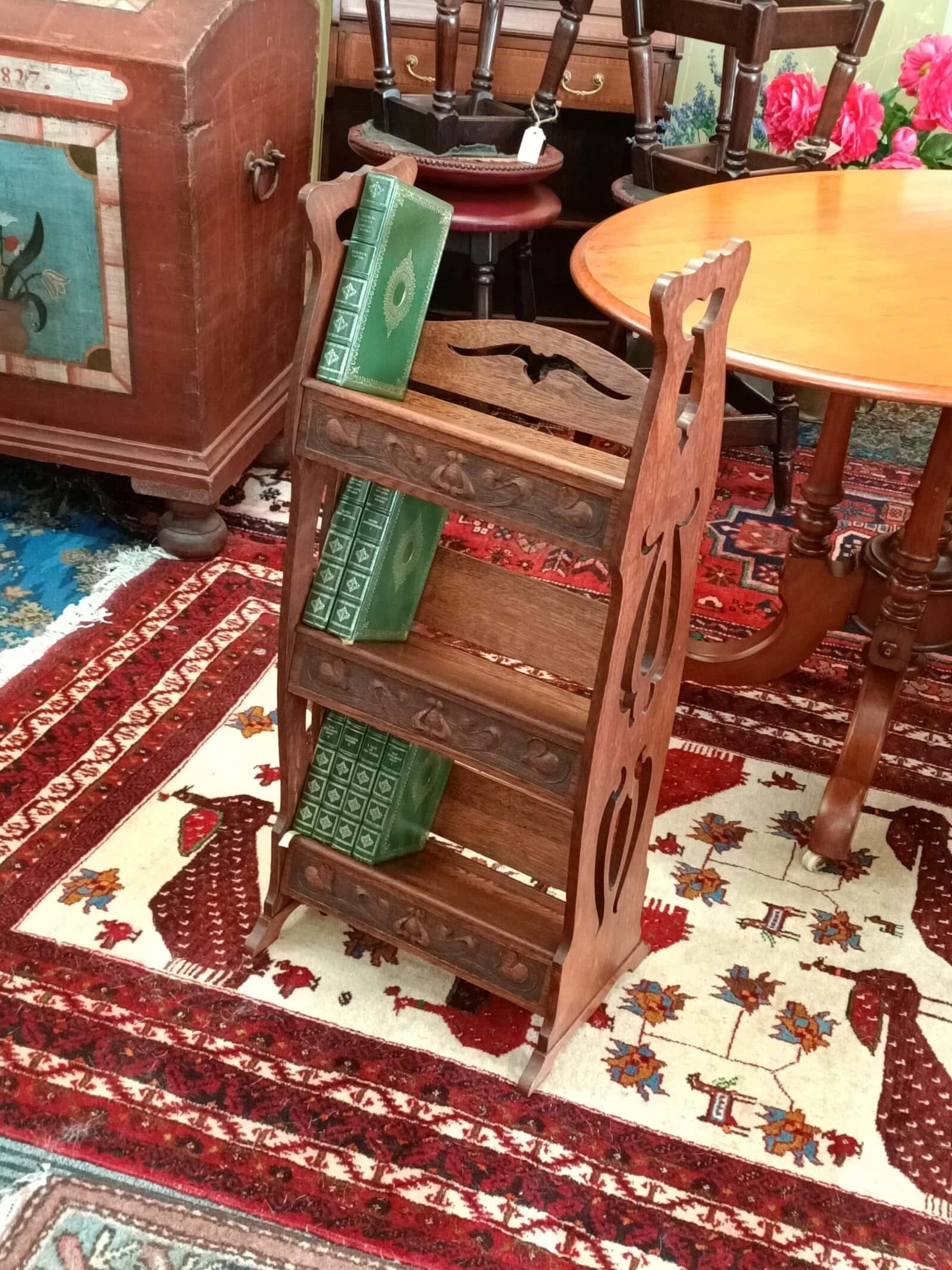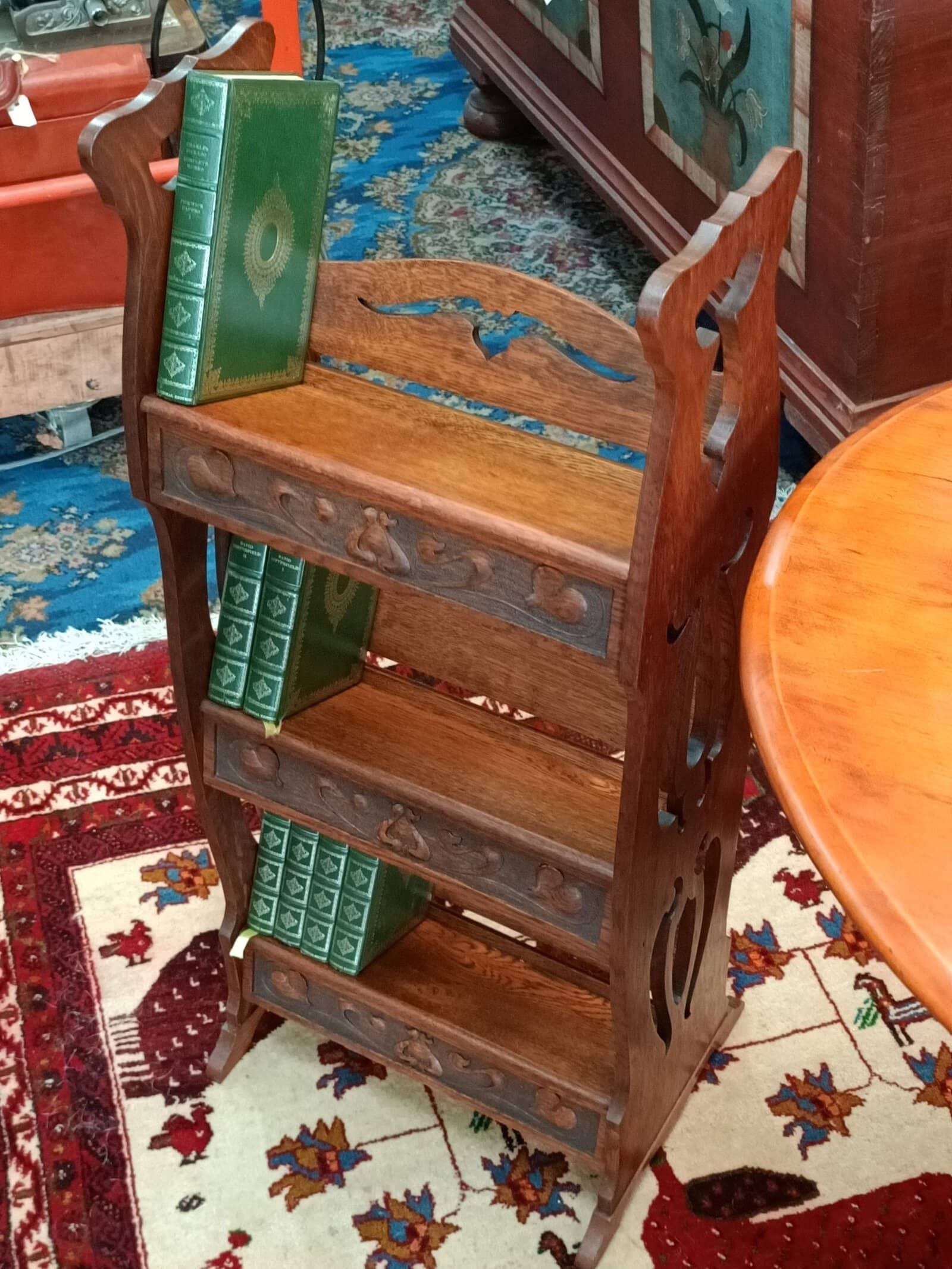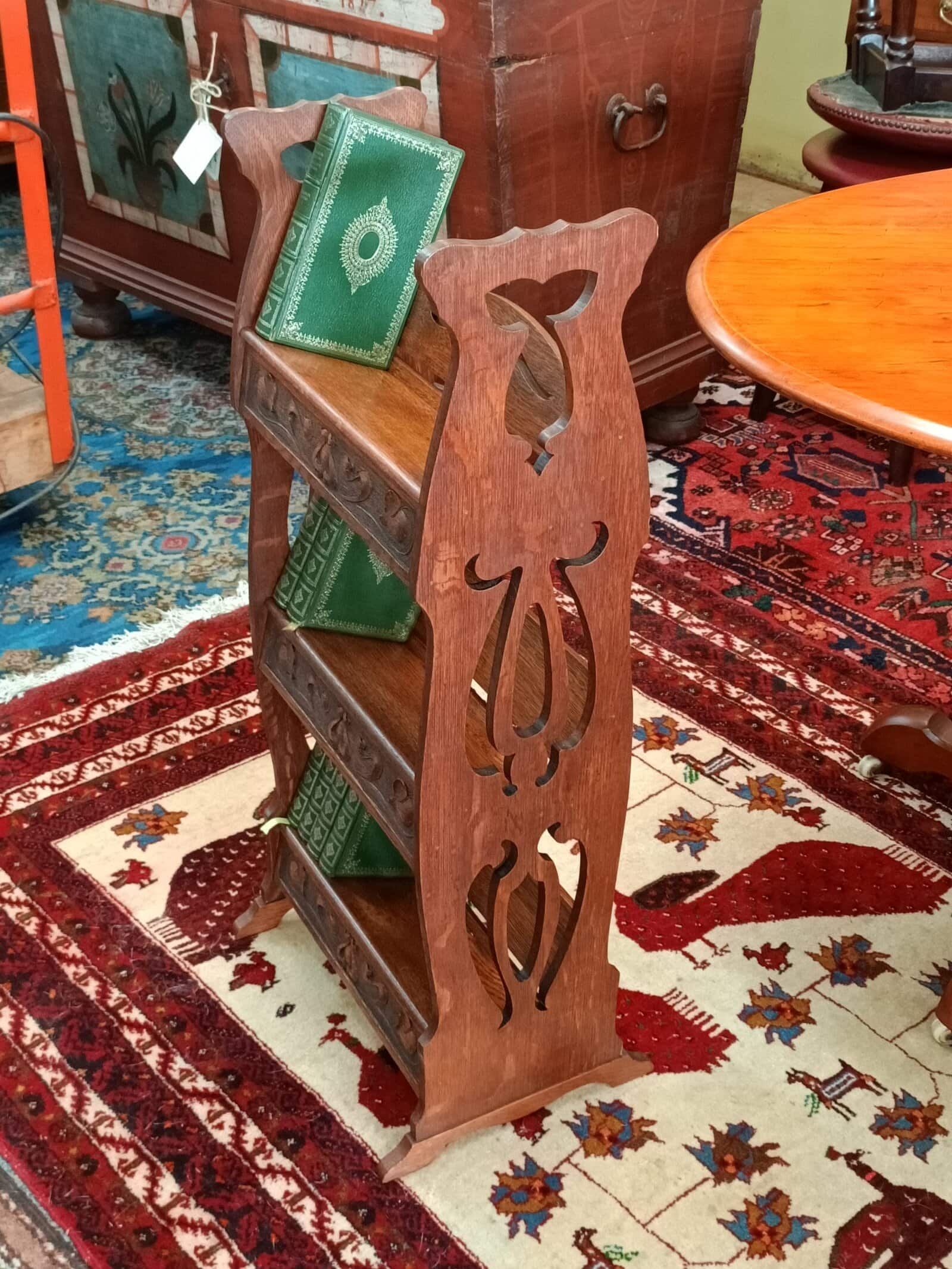 A book lover's delight! Here's a dear little three tier quarter-cut oak book trough. Sturdy yet light weight; styled with fretworked ends and nouveau carved fronts. A rich ginger cake colour. Will take a decent amount of reading books (130 is the depth for the book's case width), which will slide onto their sloped-shelf floors. Excellent condition. Circa 1910.