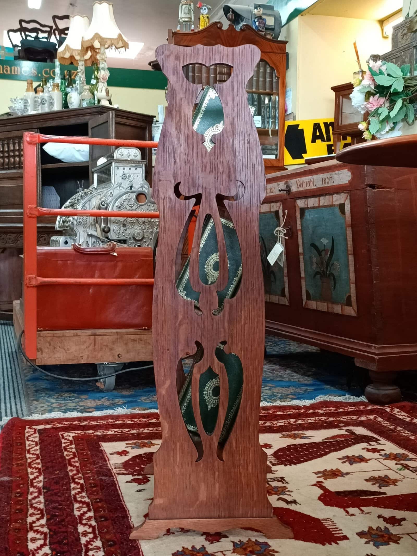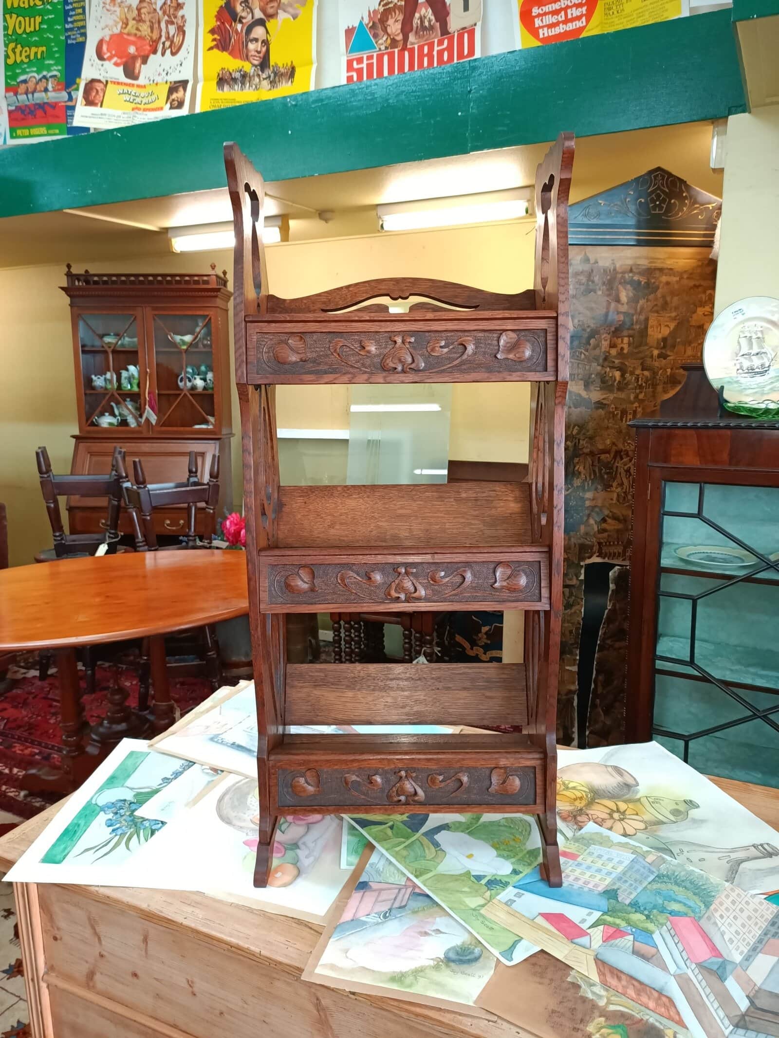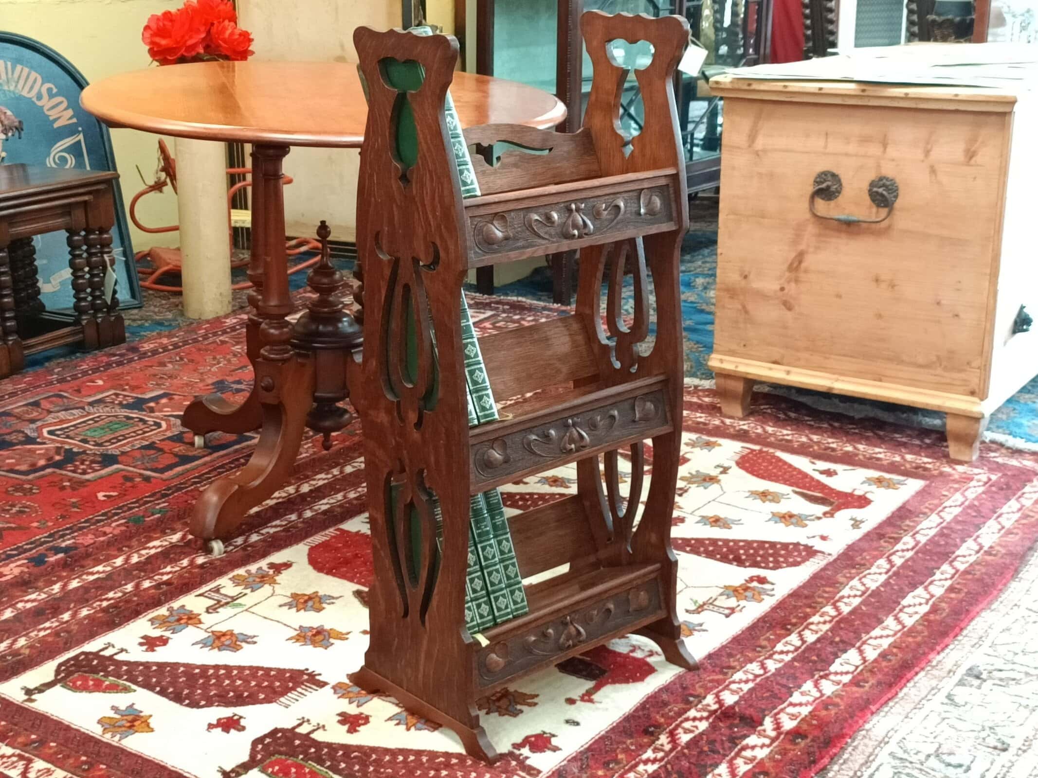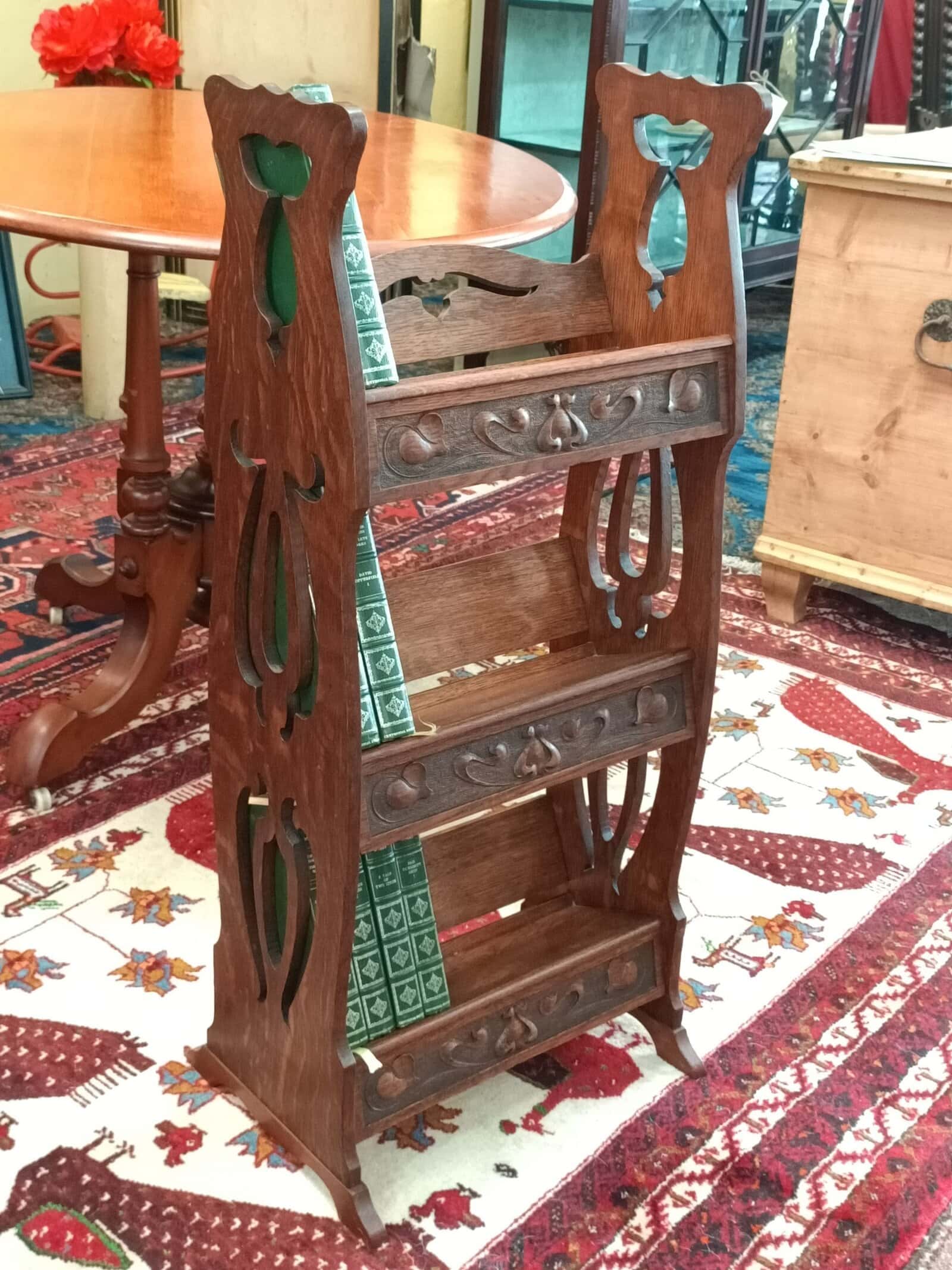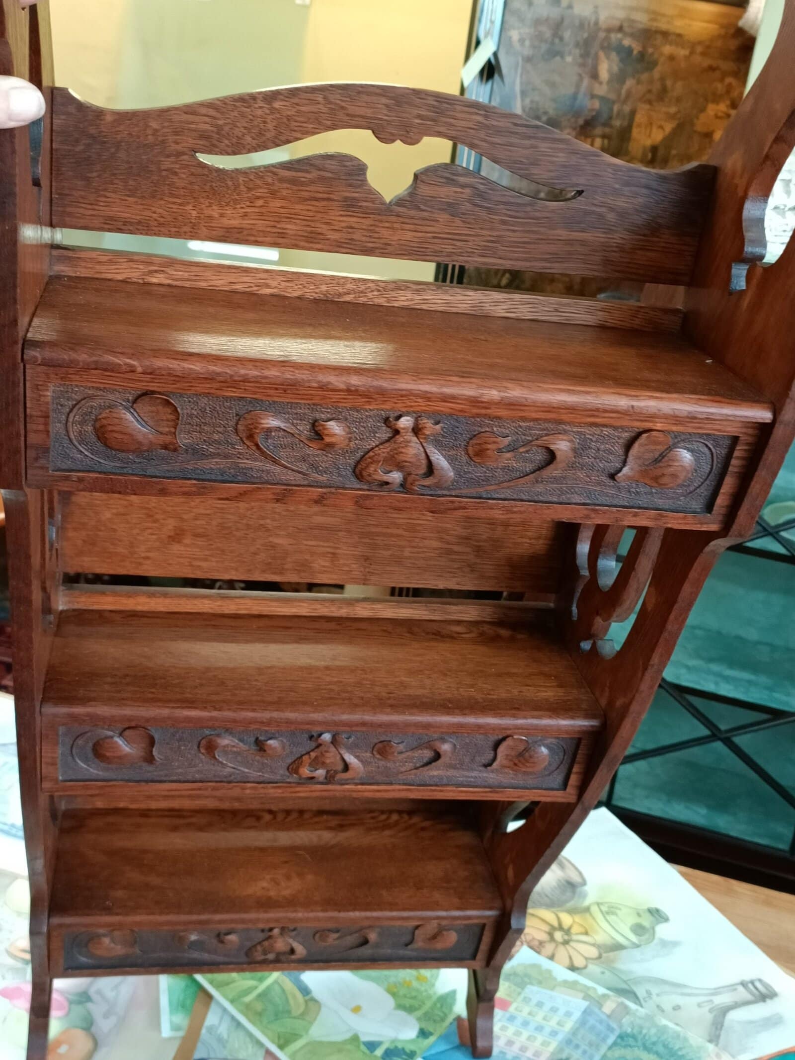 A book lover's delight! Here's a dear little three tier quarter-cut oak book trough. Sturdy yet light weight; styled with fretworked ends and nouveau carved fronts. A rich ginger cake colour. Will take a decent amount of reading books (130 is the depth for the book's case width), which will slide onto their sloped-shelf floors. Excellent condition. Circa 1910.