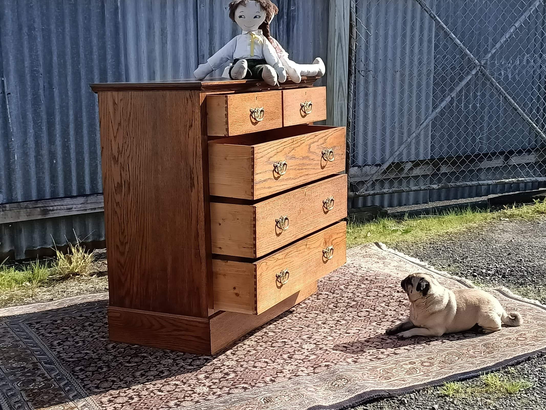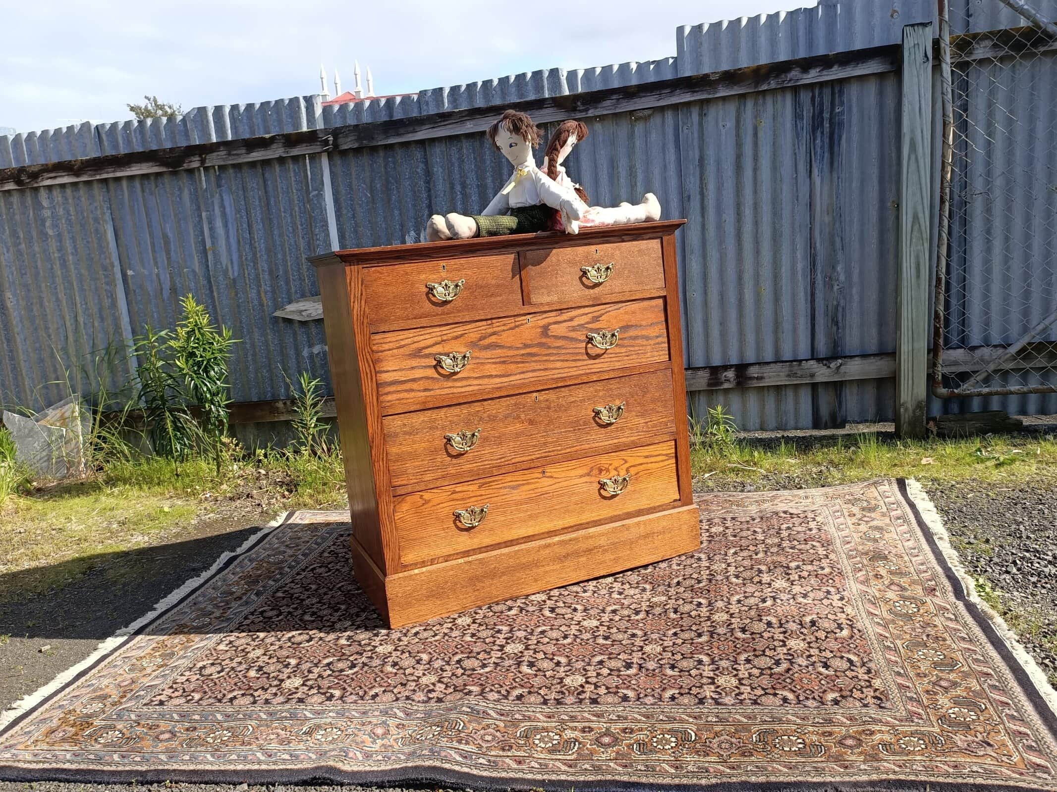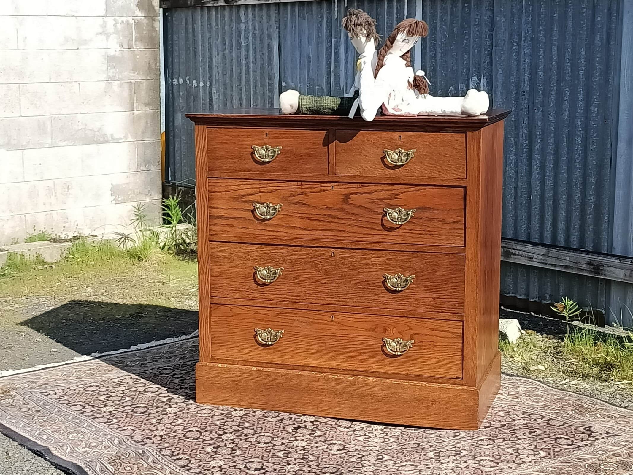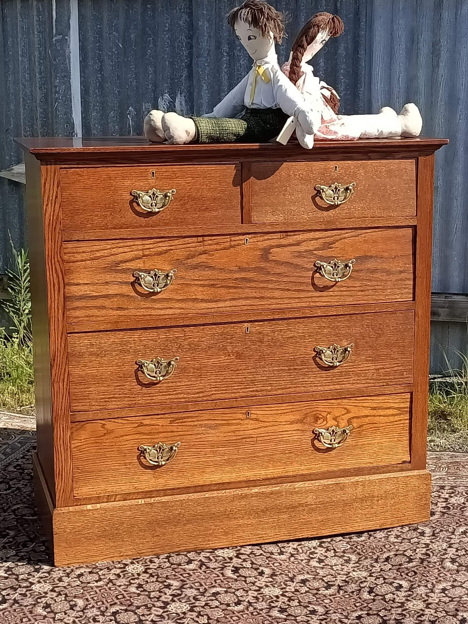 Oakidoki, a simple and OAK-so elegant chest of drawers. Two over Three drawer configuration on a plinth base. Chunky brass handles roasted peanut colour , and an elm sort of grain. One drawer has a front slight bow, a character spot, see the close-up picture. Drawers rerun. Restored October 2025. Circa 1900.