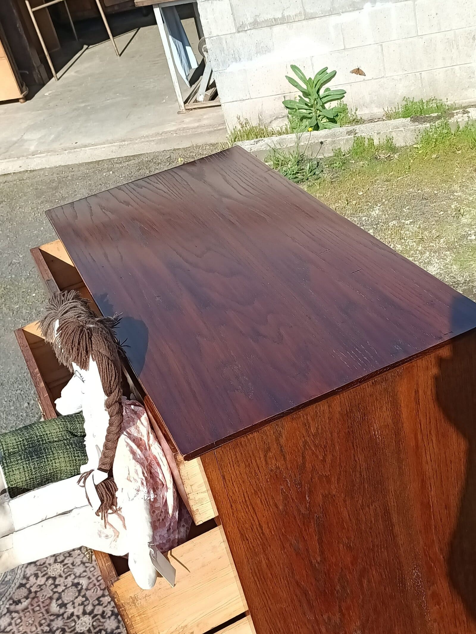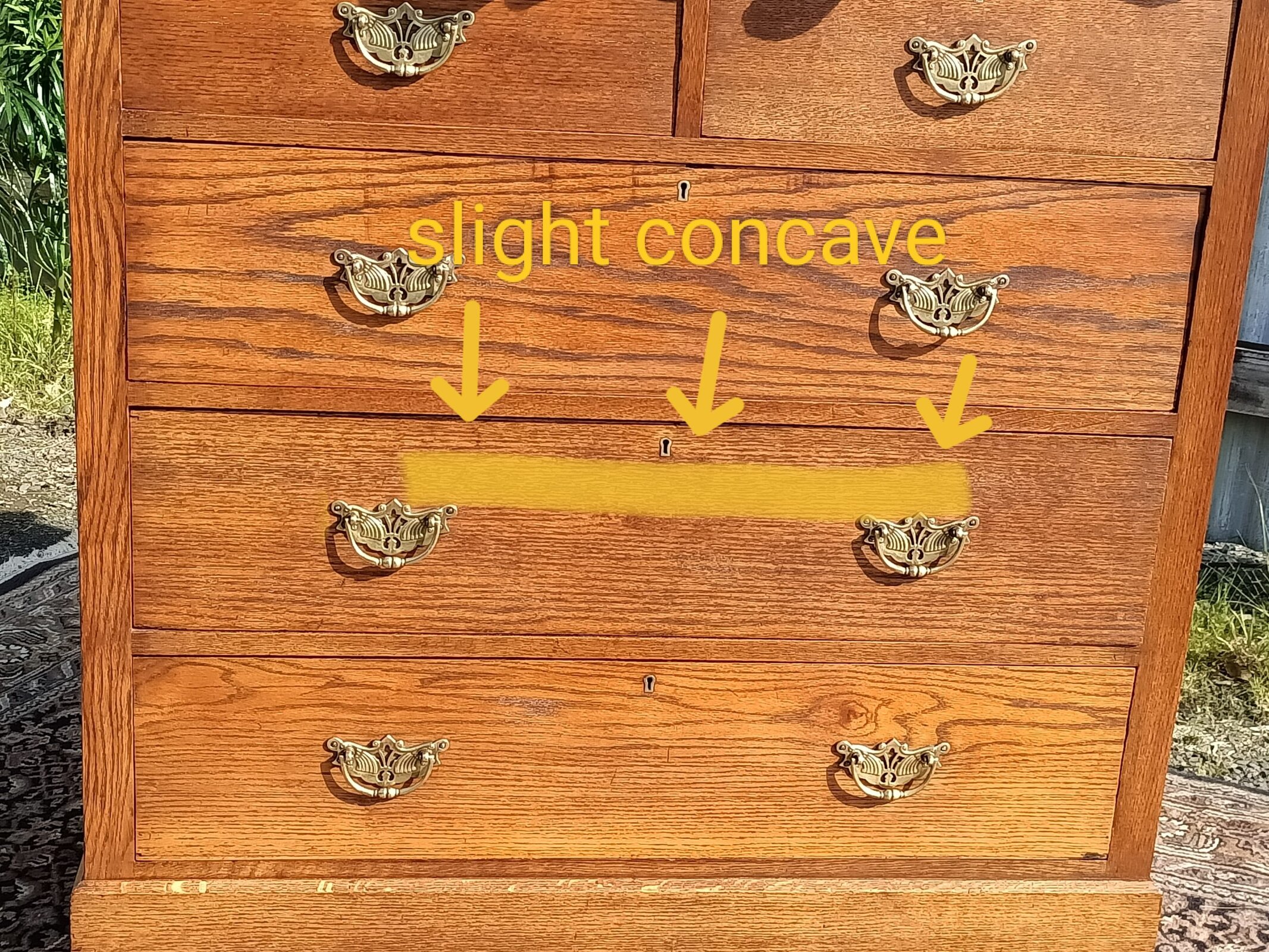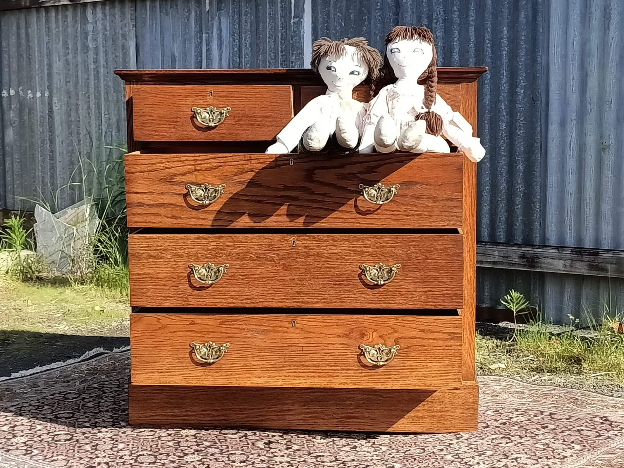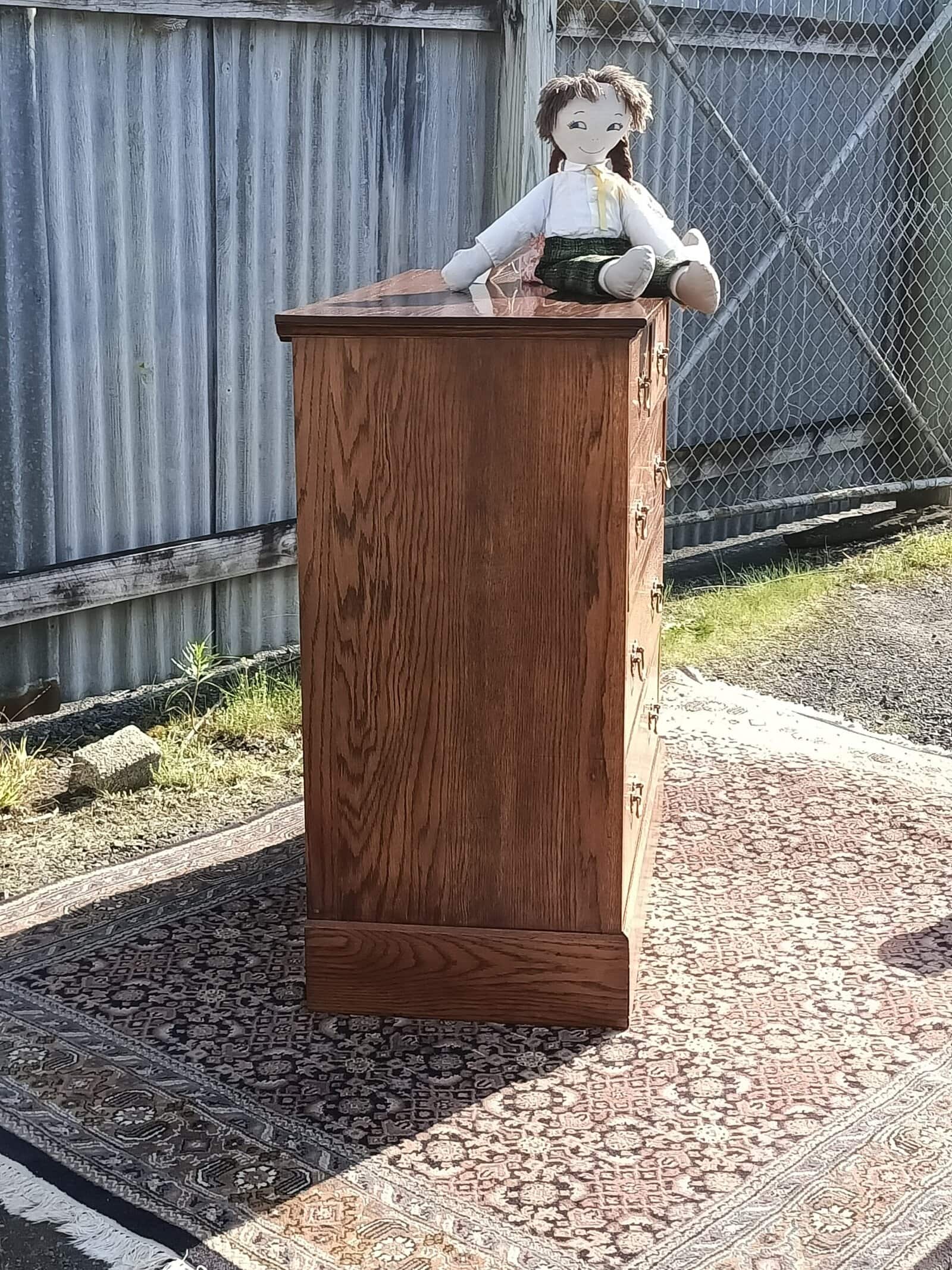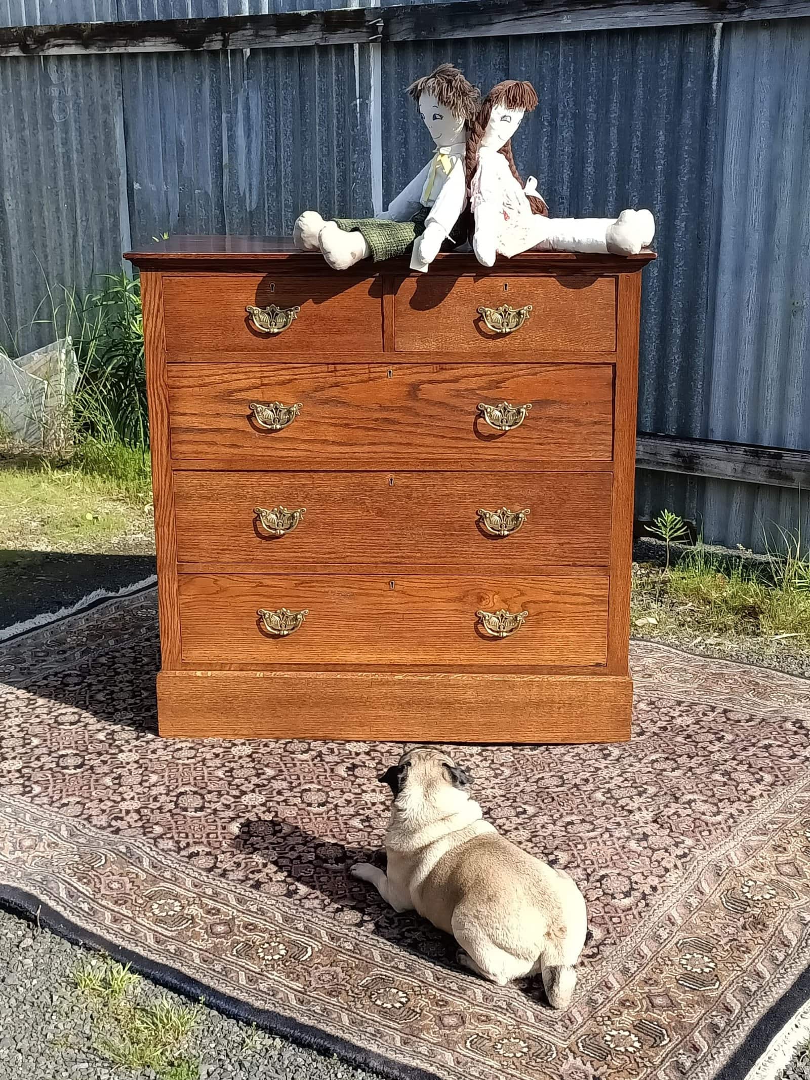 Oakidoki, a simple and OAK-so elegant chest of drawers. Two over Three drawer configuration on a plinth base. Chunky brass handles roasted peanut colour , and an elm sort of grain. One drawer has a front slight bow, a character spot, see the close-up picture. Drawers rerun. Restored October 2025. Circa 1900.