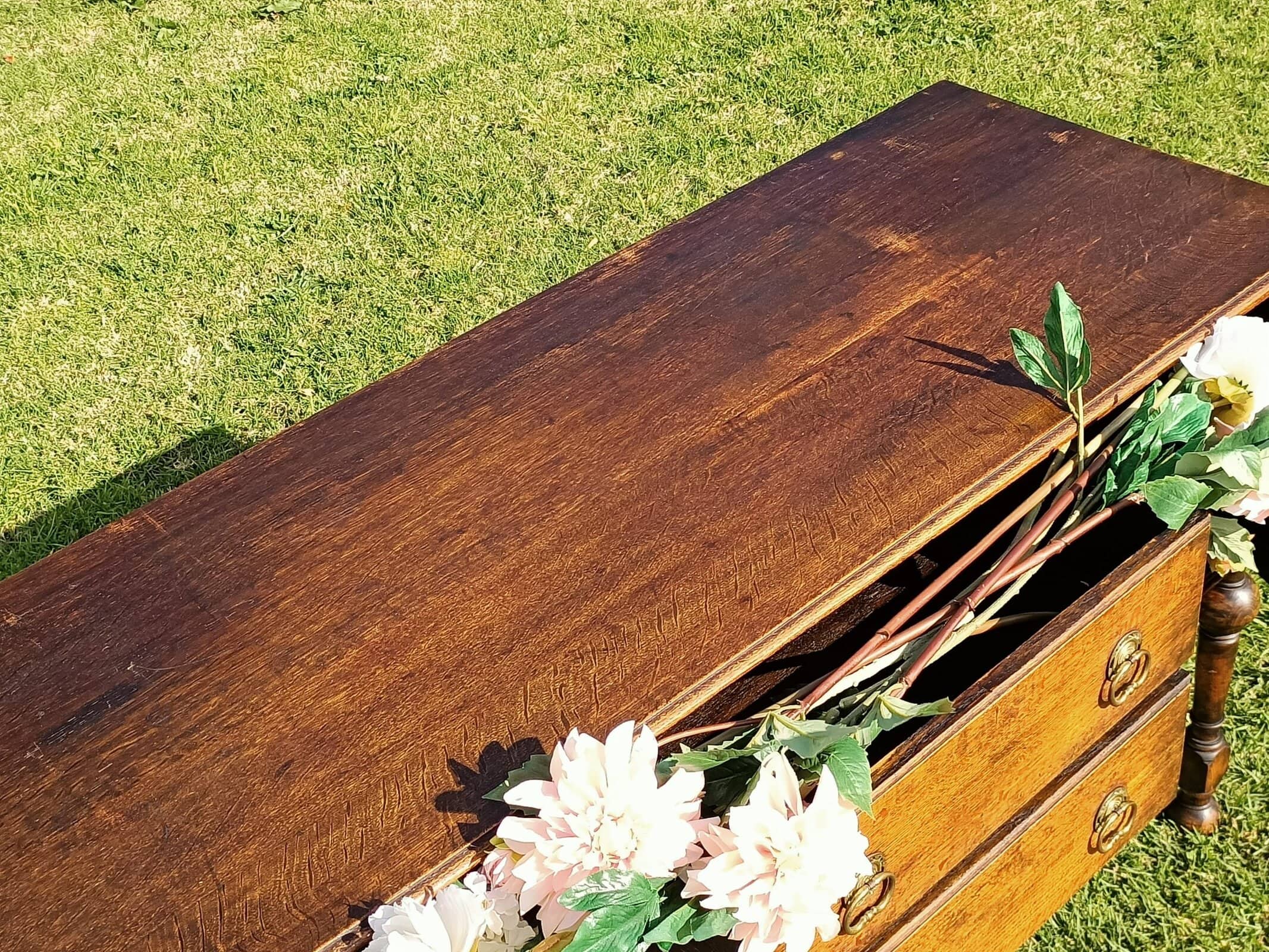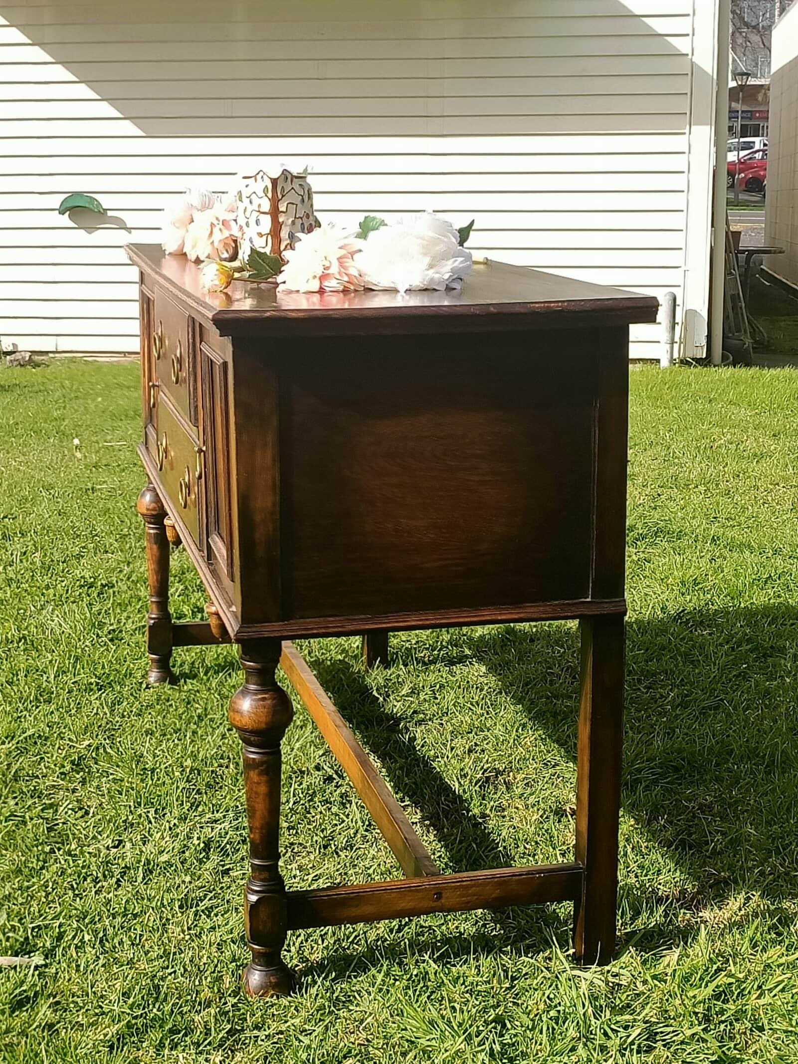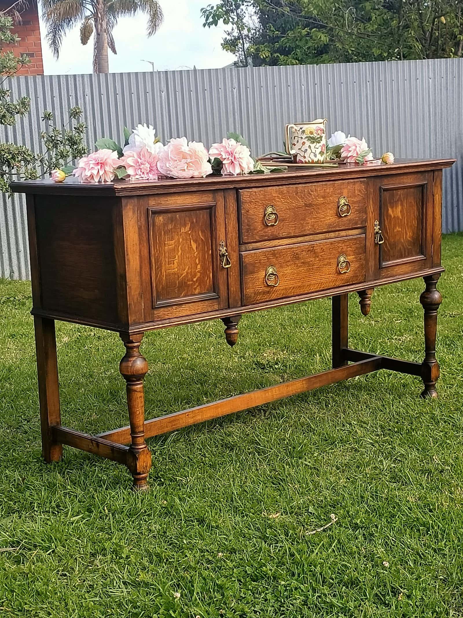 Looking for a hall table, or a tv table or something to look great and hide the crap in? Does this milky fudgy coloured, English oak dresser base do the trick? Simple door panels, up on turned front legs and stretched. Two cupboards two drawers. Earthy n smart. Really good condition, a little patina of scratches here and there, clean. Circa 1920.