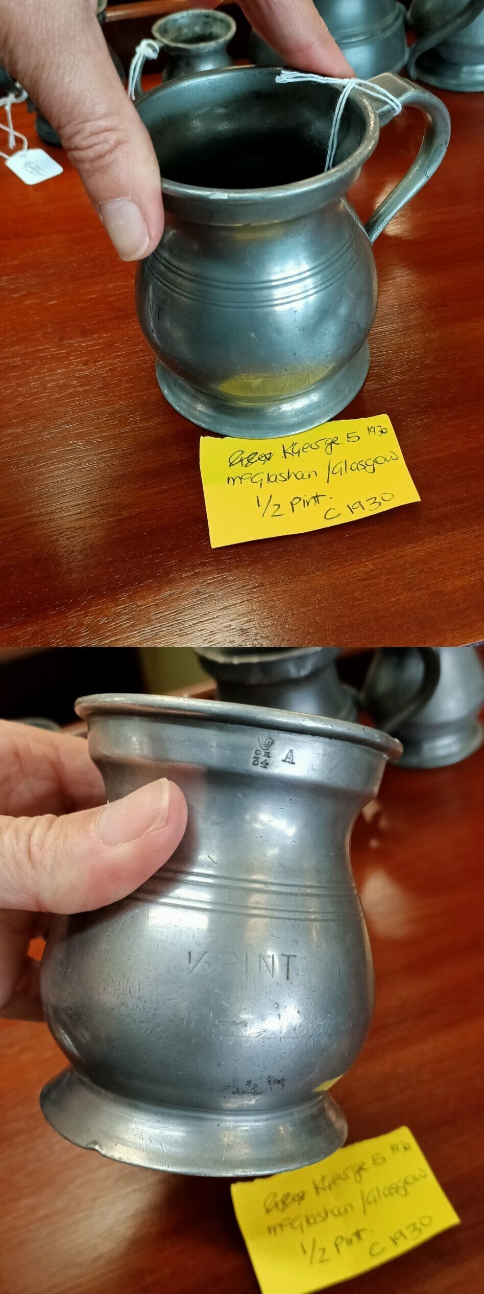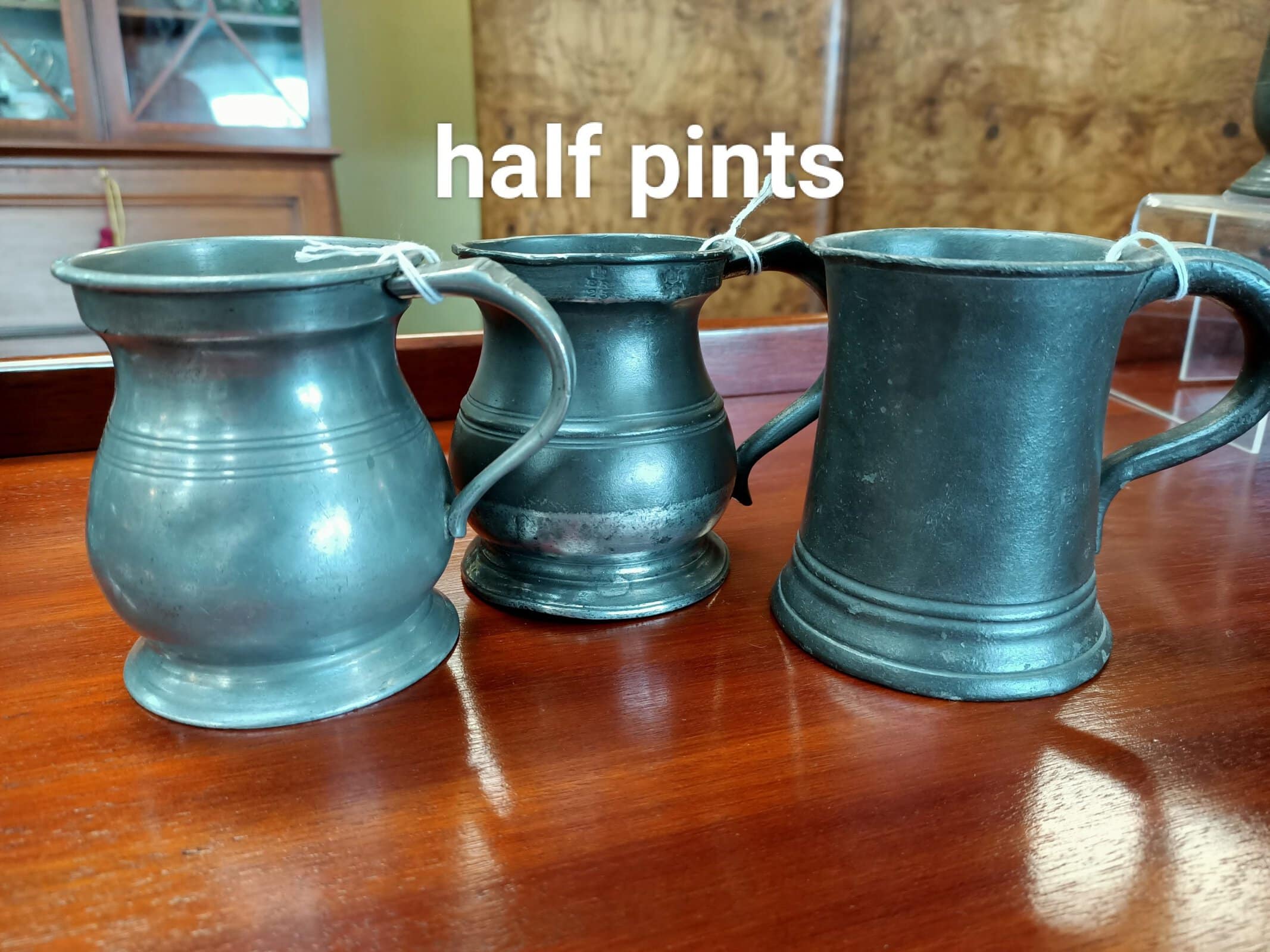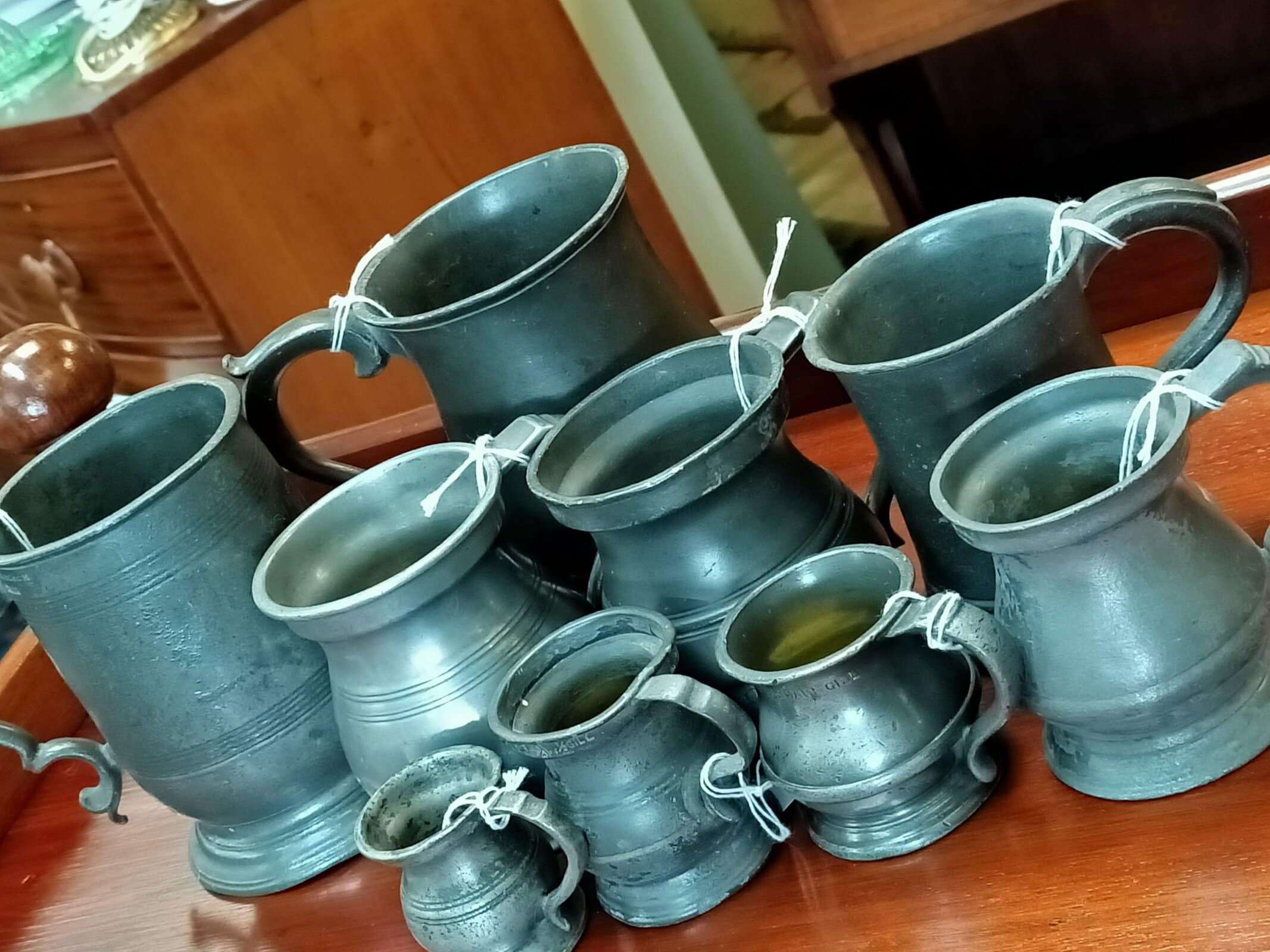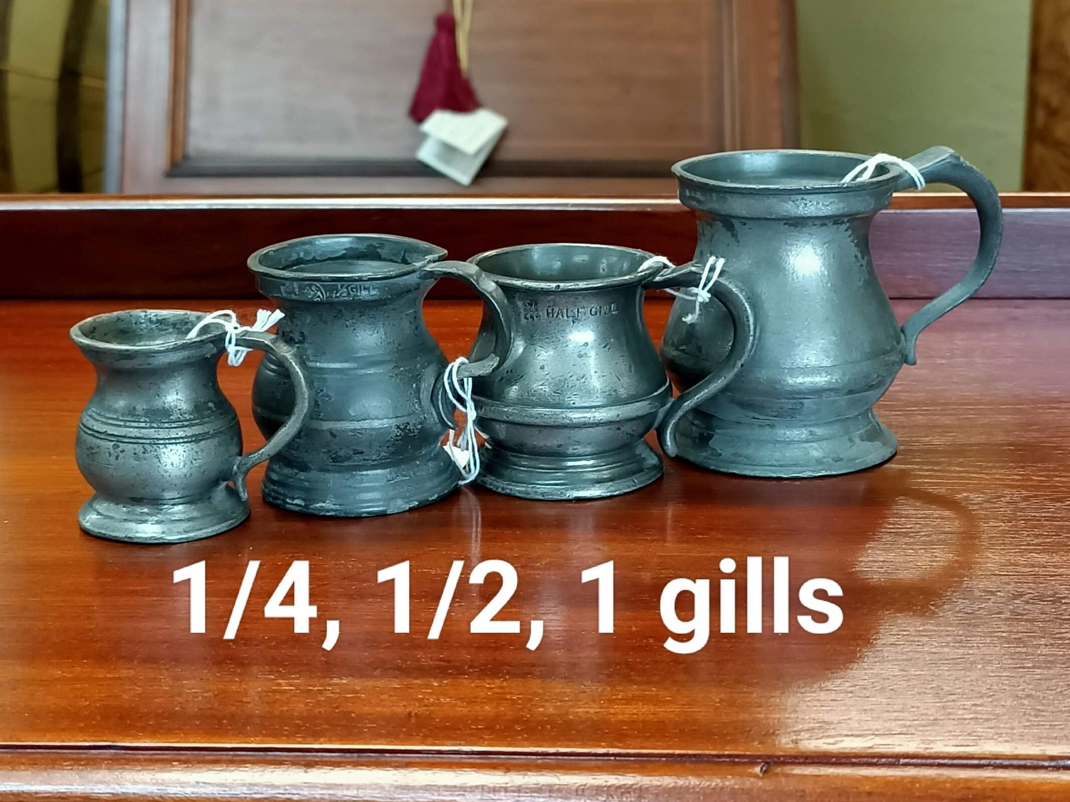 Here's a wee collection of pewter mugs; lil' stunners to collect and enjoy. This collection measure from quarter gill (a nip) upto one pint. Various British makers and condition, but all watertight. Circa 1850-1930.
