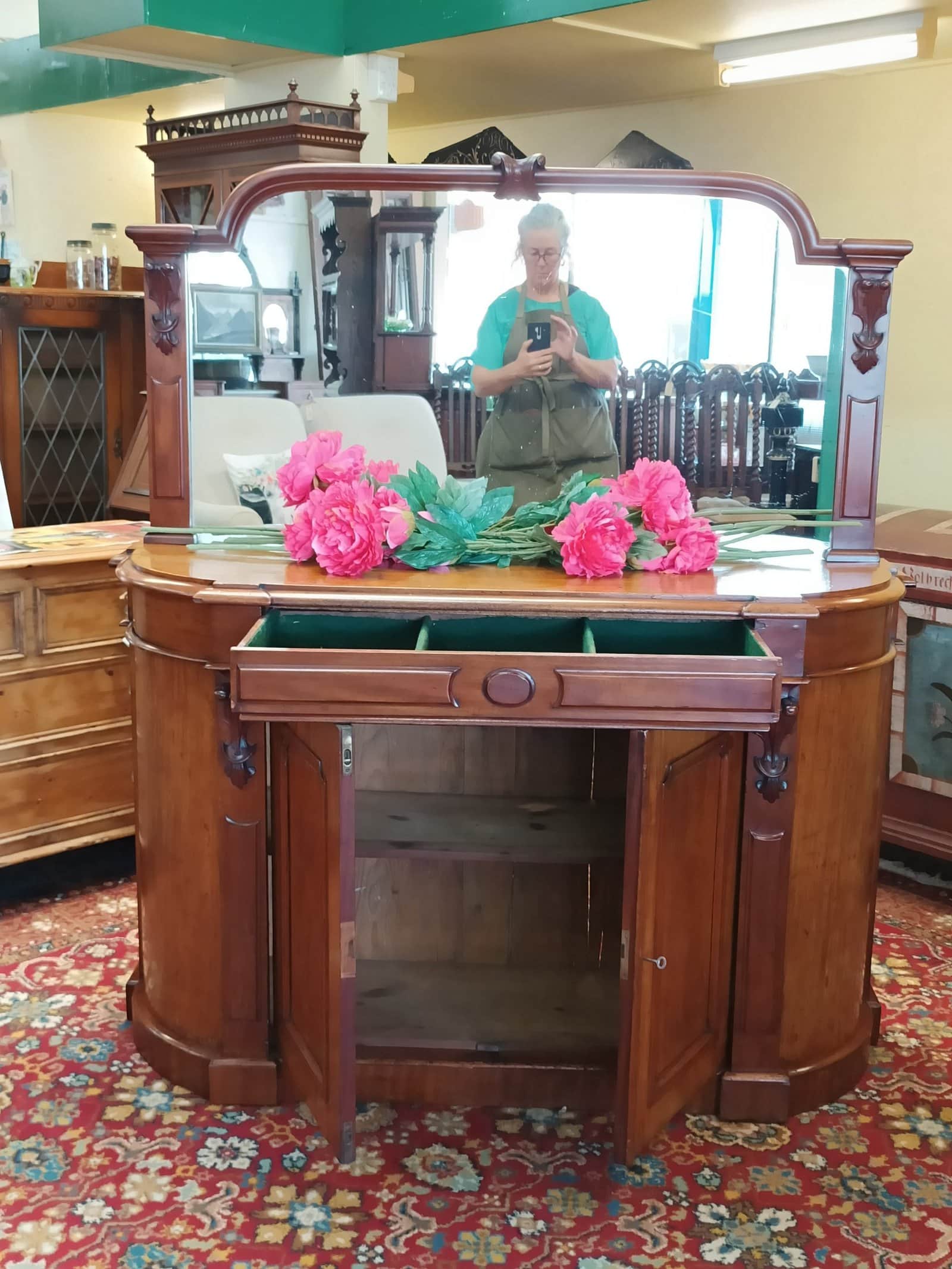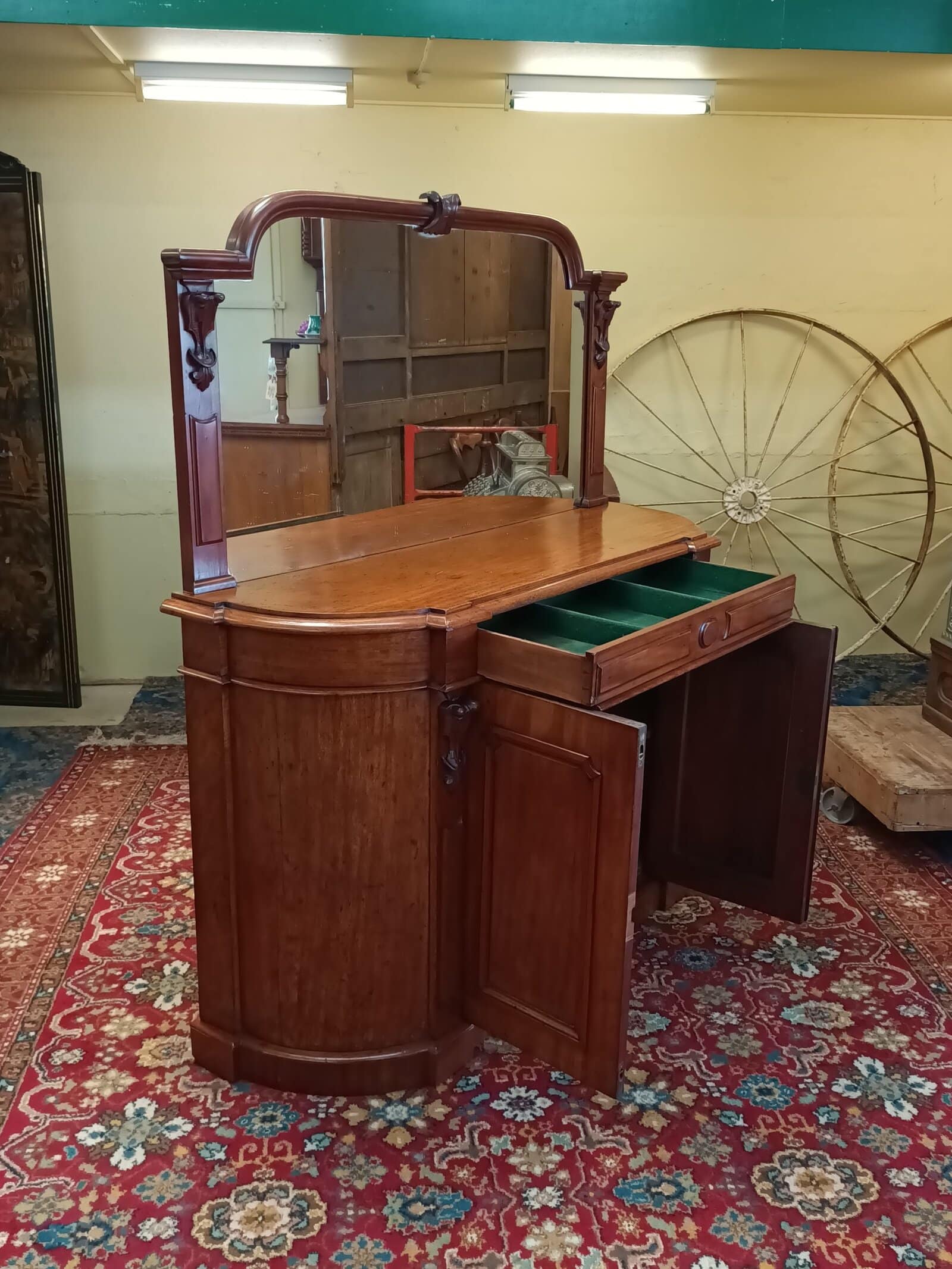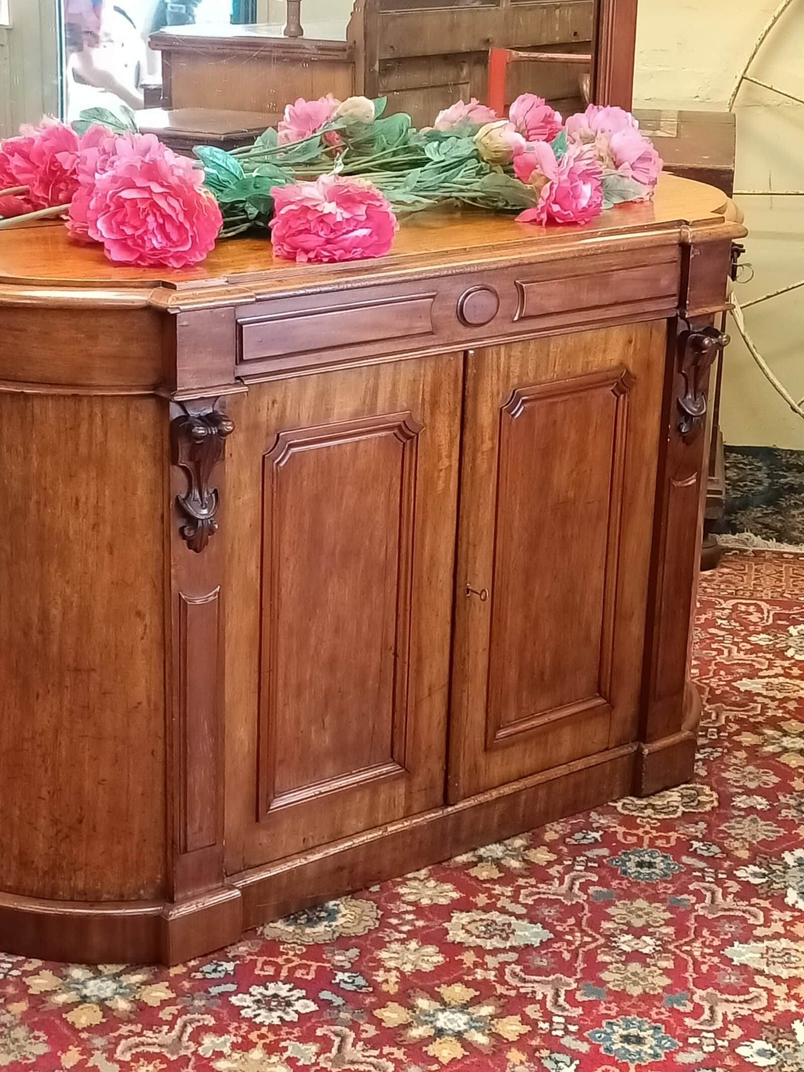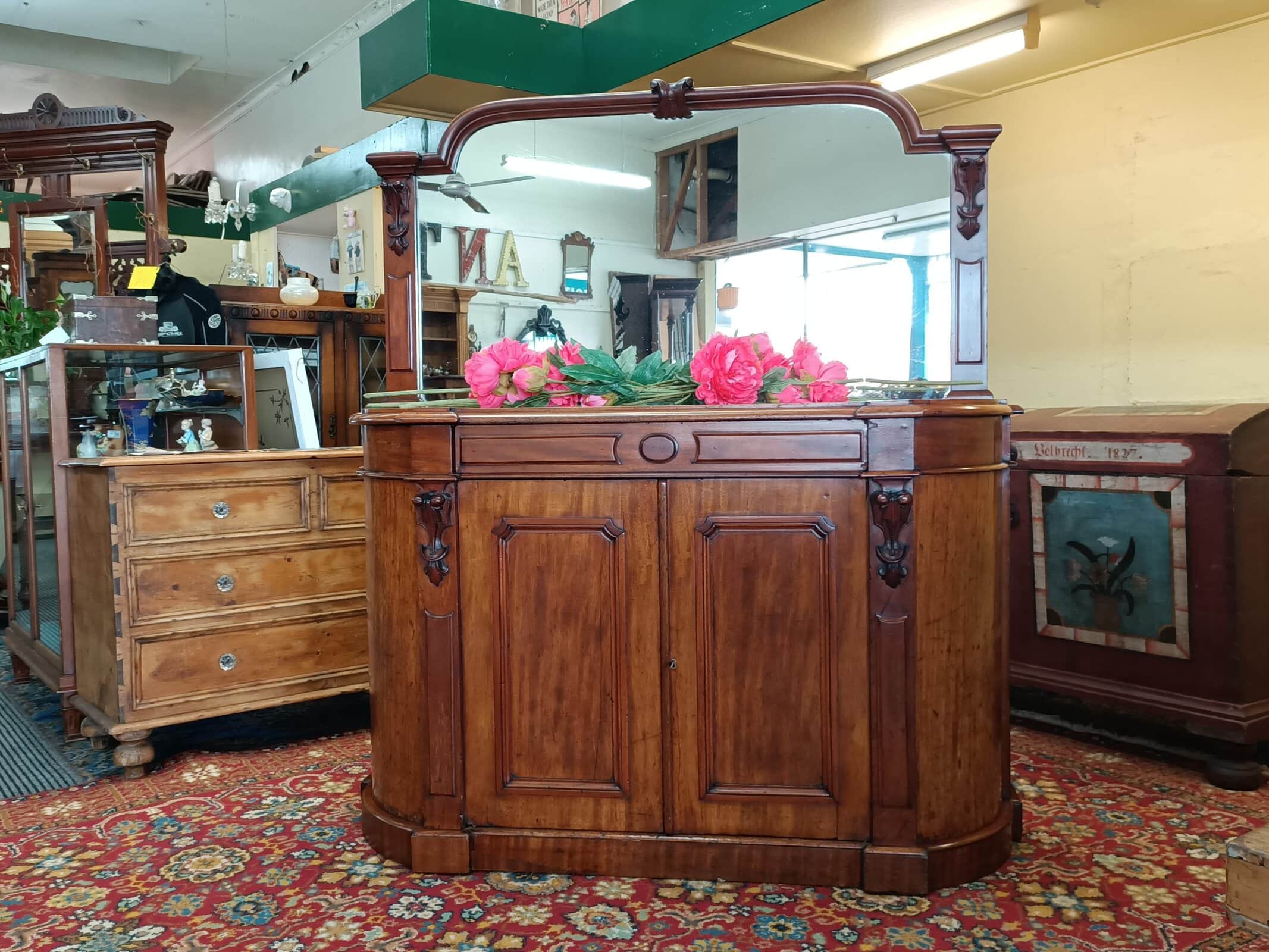 A storage sweetie pie.  This Victorian mahogany credenza is a nice compact size, and will sit against any wall, big or small, and be an elegant hold all in any room or hallway.  Rounded corners, corset shape corbels big cupboard and cutlery drawer, and generous mirror back, all upon a plinth base.     Patina with superficial scratches, on wood and a little on the mirror, clean.  She is a wonderful faded off manuka honey hue.   An early kiwi settler arriving here on the turn of the C20 with the grannie of her previous owner.   Freshly restored January 2026.  Circa 1875.