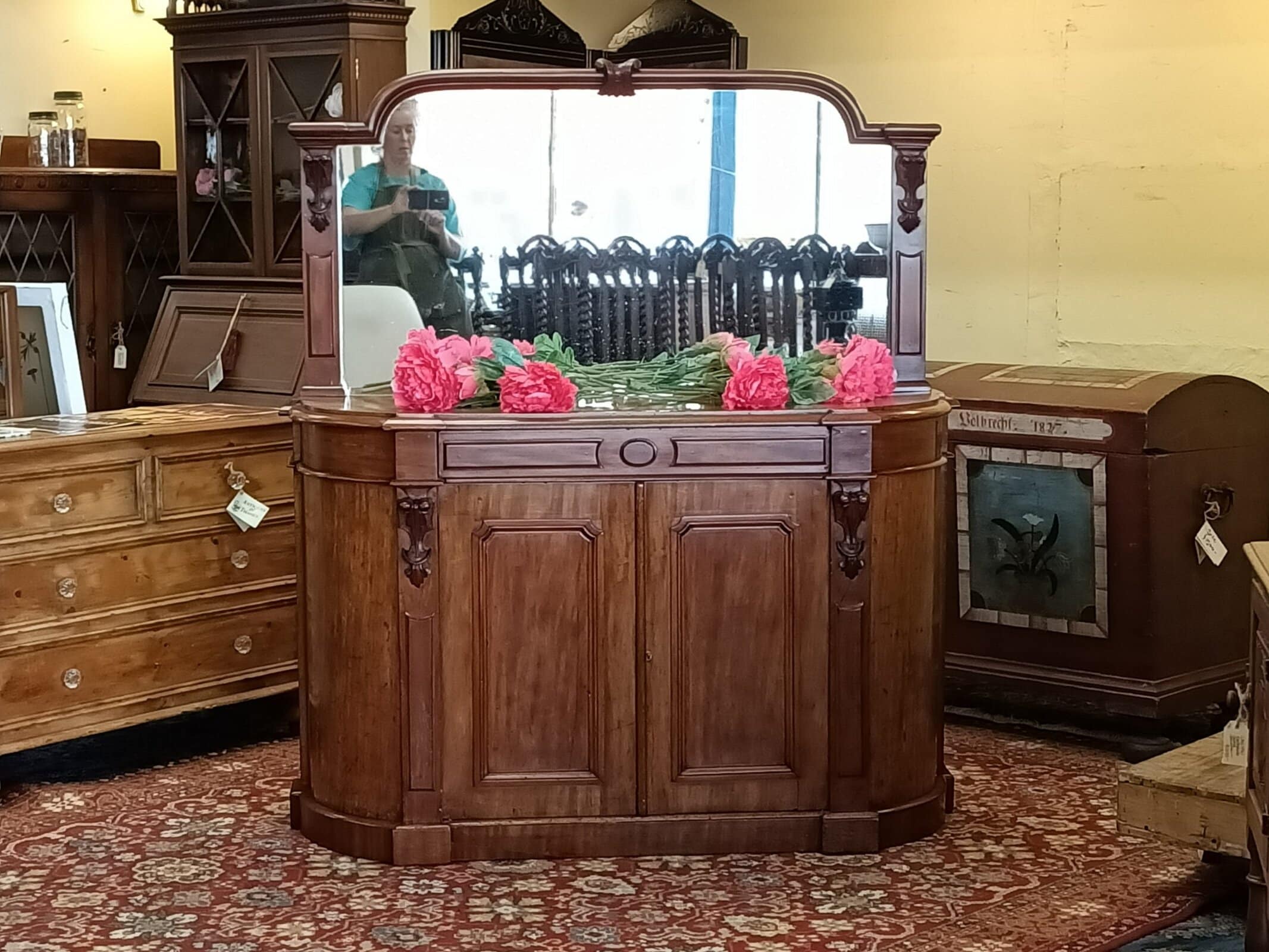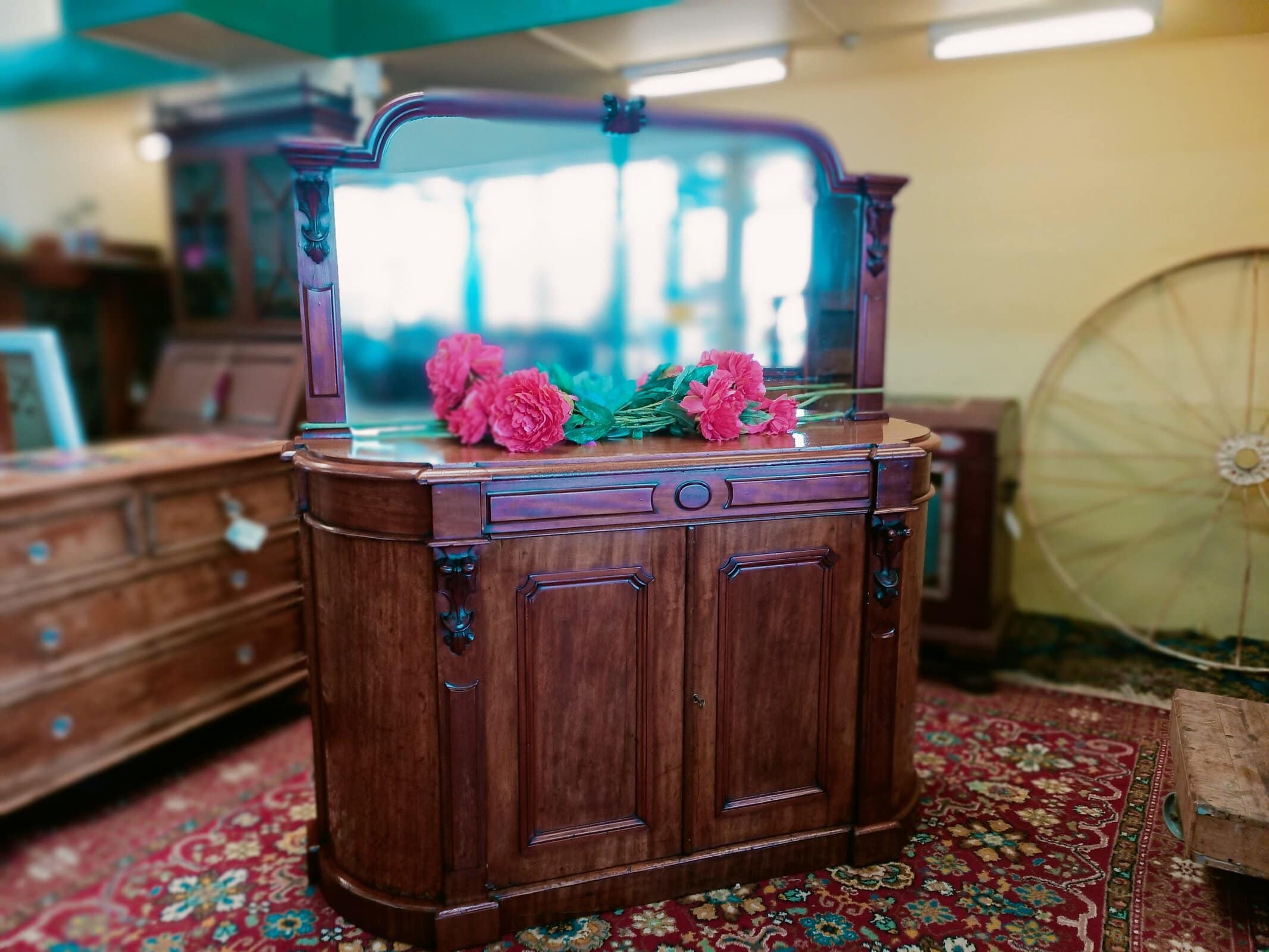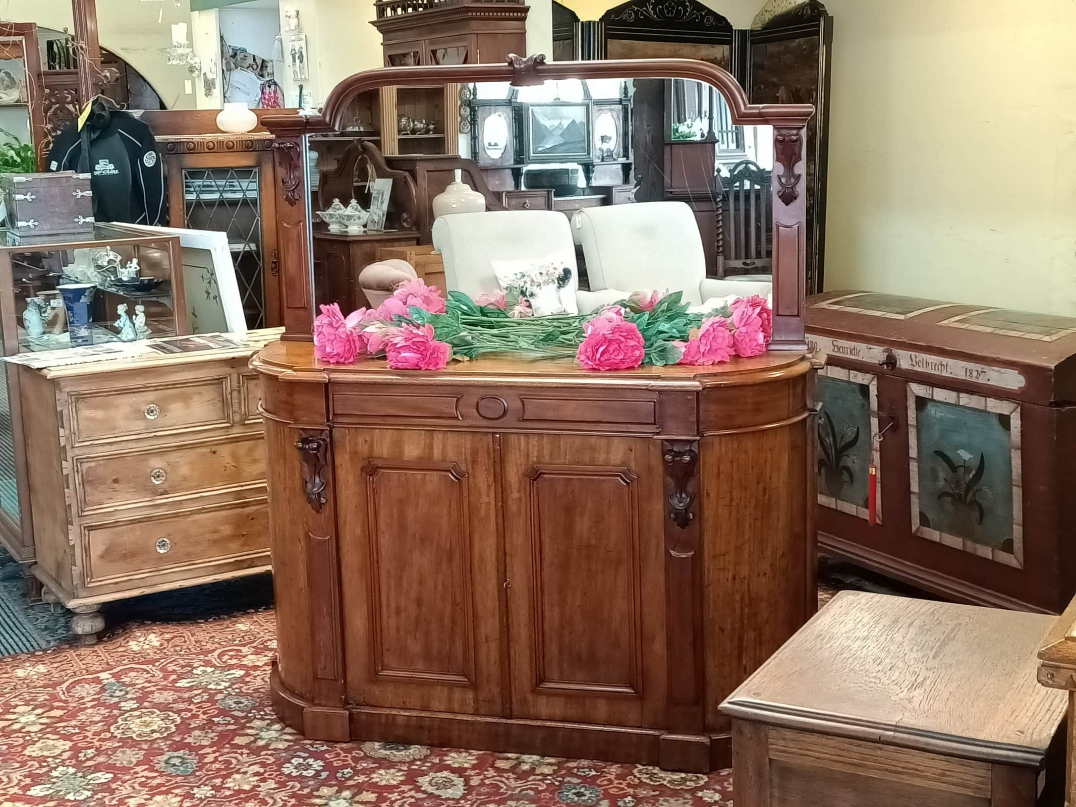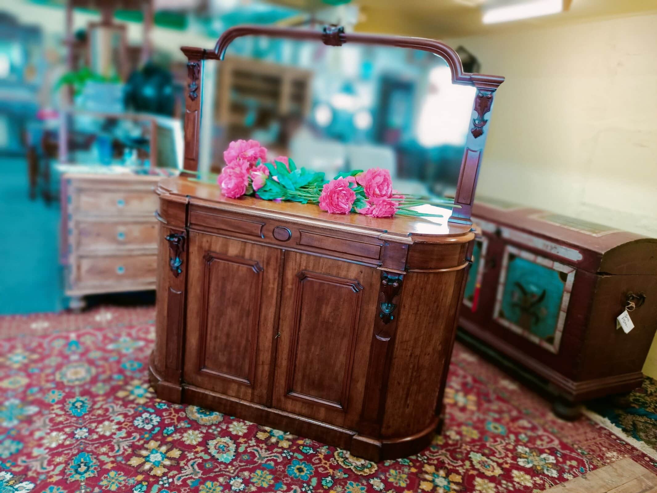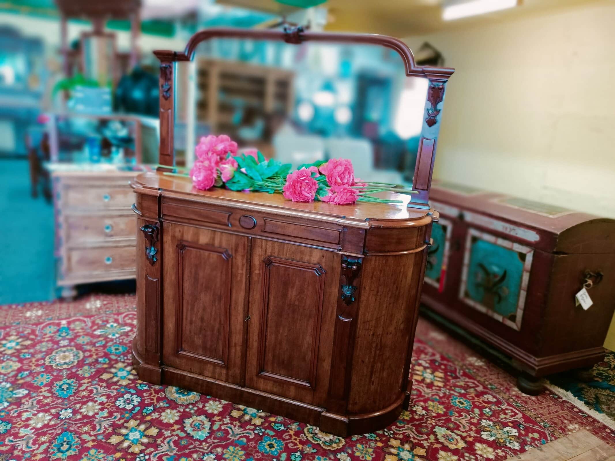 A storage sweetie pie.  This Victorian mahogany credenza is a nice compact size, and will sit against any wall, big or small, and be an elegant hold all in any room or hallway.  Rounded corners, corset shape corbels big cupboard and cutlery drawer, and generous mirror back, all upon a plinth base.     Patina with superficial scratches, on wood and a little on the mirror, clean.  She is a wonderful faded off manuka honey hue.   An early kiwi settler arriving here on the turn of the C20 with the grannie of her previous owner.   Freshly restored January 2026.  Circa 1875.