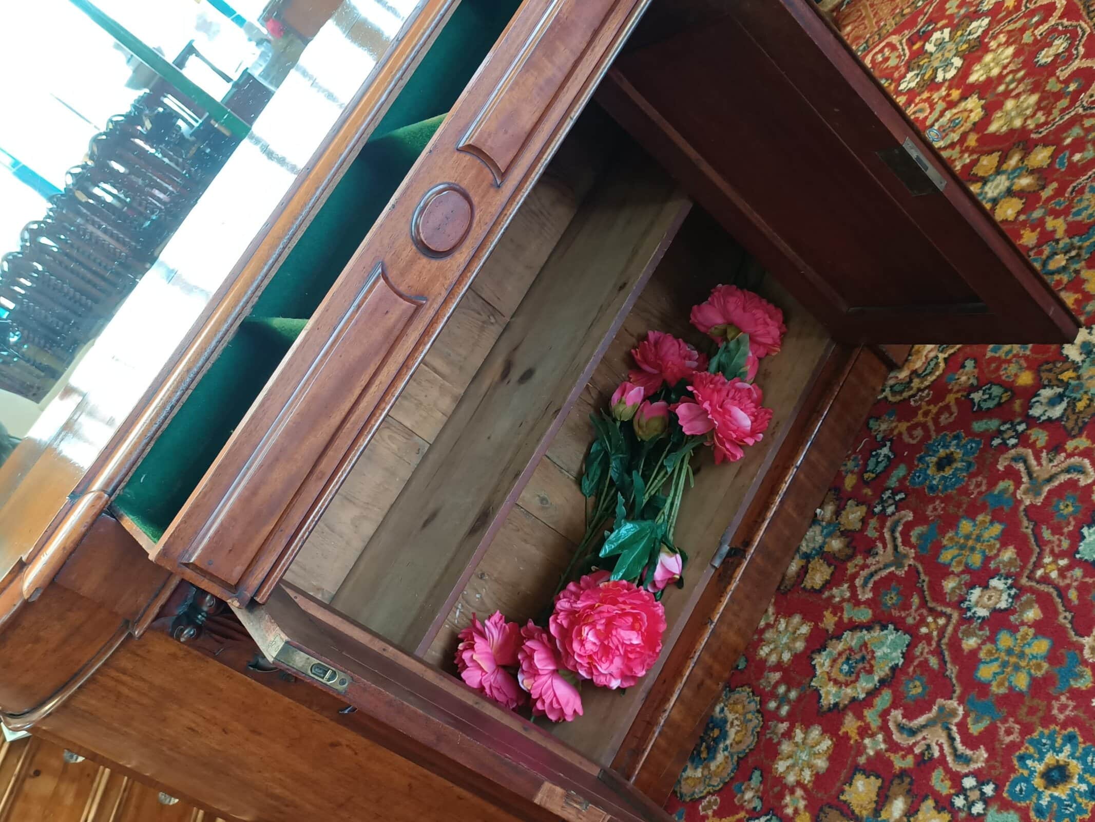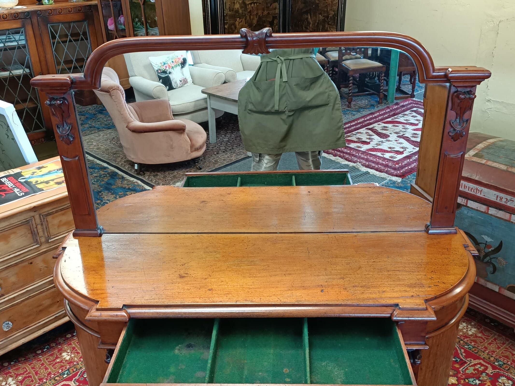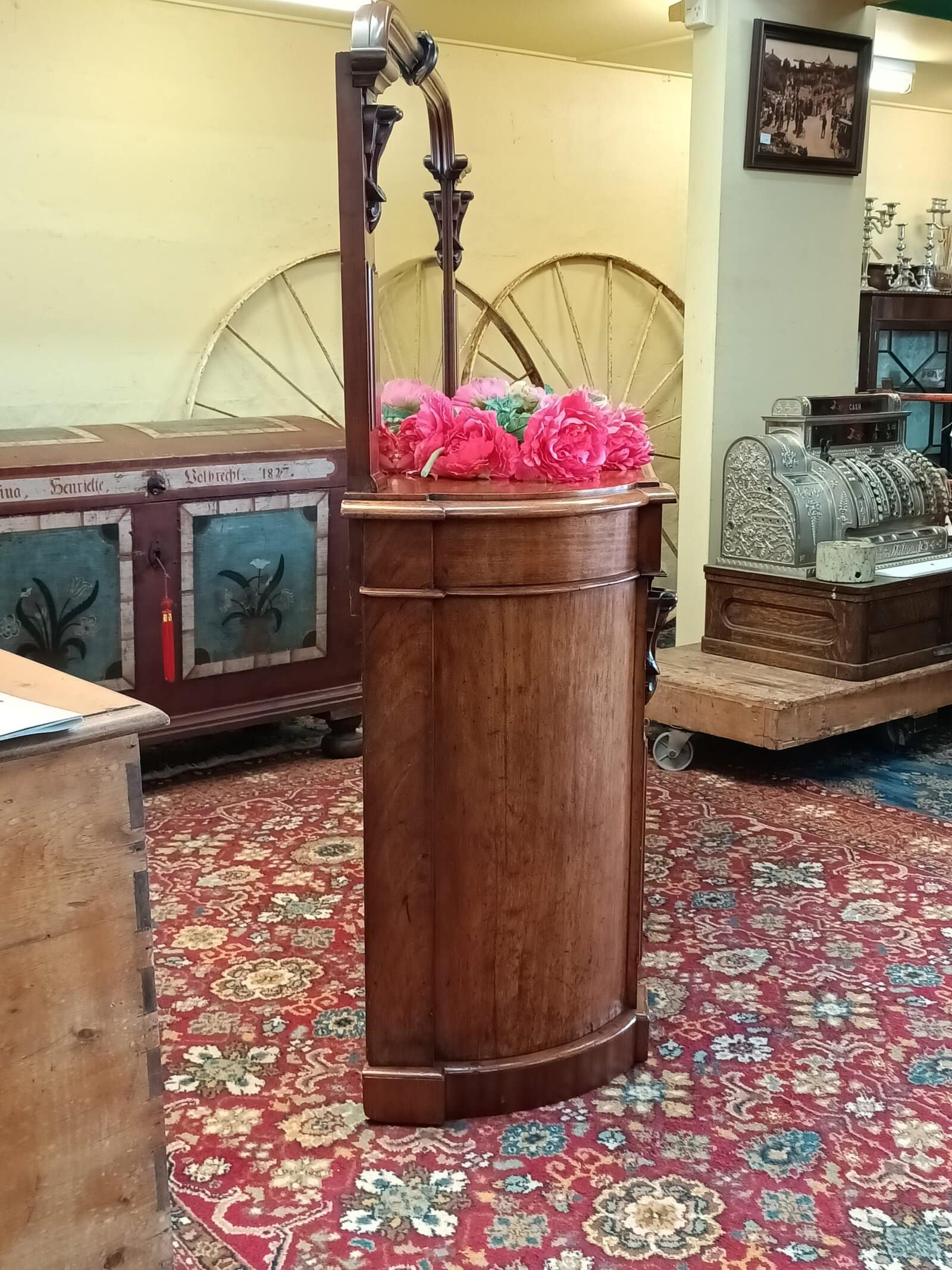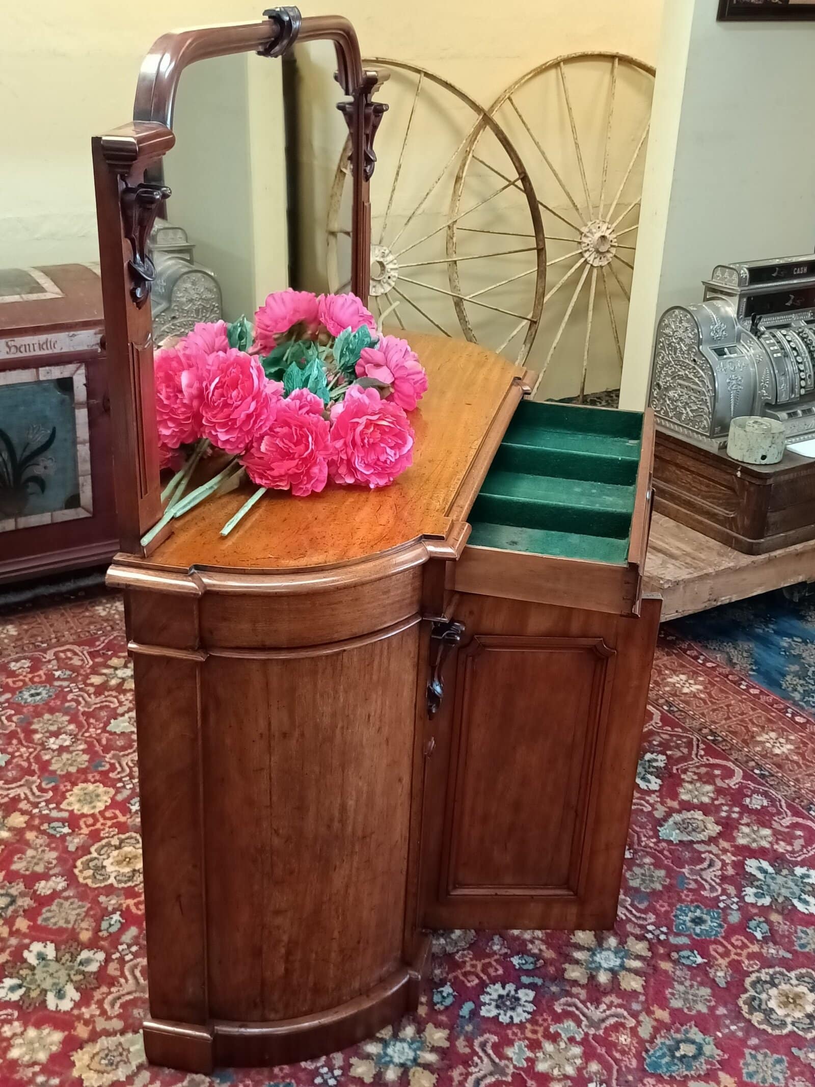 A storage sweetie pie.  This Victorian mahogany credenza is a nice compact size, and will sit against any wall, big or small, and be an elegant hold all in any room or hallway.  Rounded corners, corset shape corbels big cupboard and cutlery drawer, and generous mirror back, all upon a plinth base.     Patina with superficial scratches, on wood and a little on the mirror, clean.  She is a wonderful faded off manuka honey hue.   An early kiwi settler arriving here on the turn of the C20 with the grannie of her previous owner.   Freshly restored January 2026.  Circa 1875.