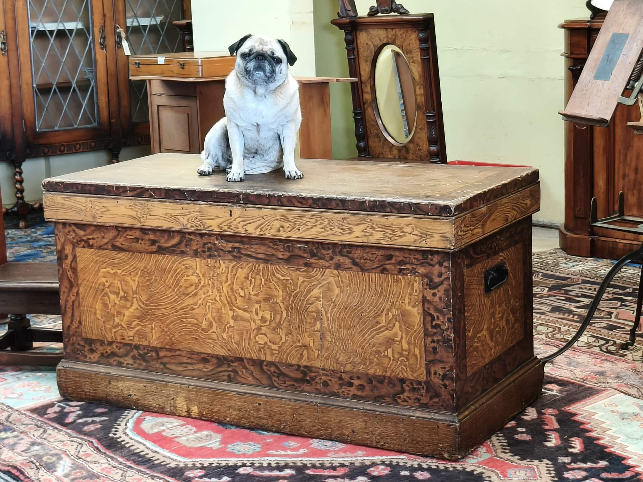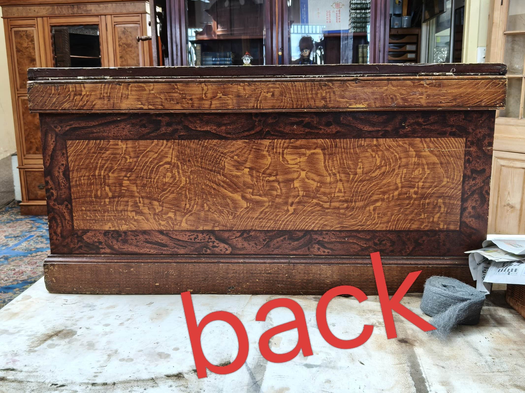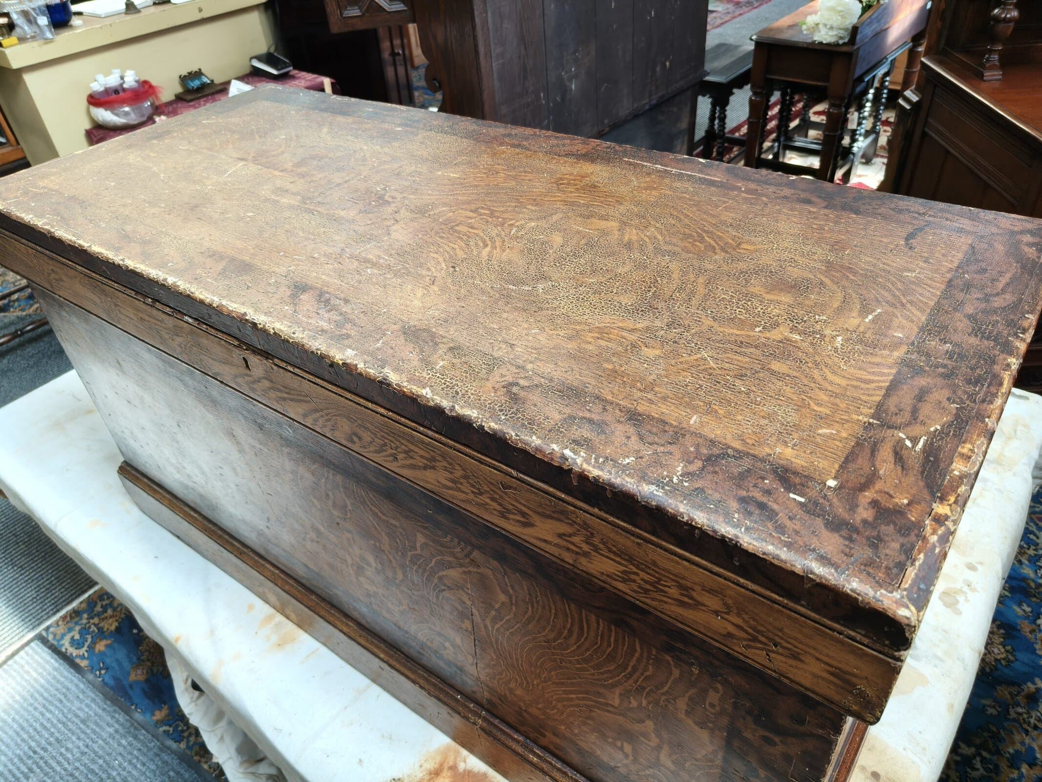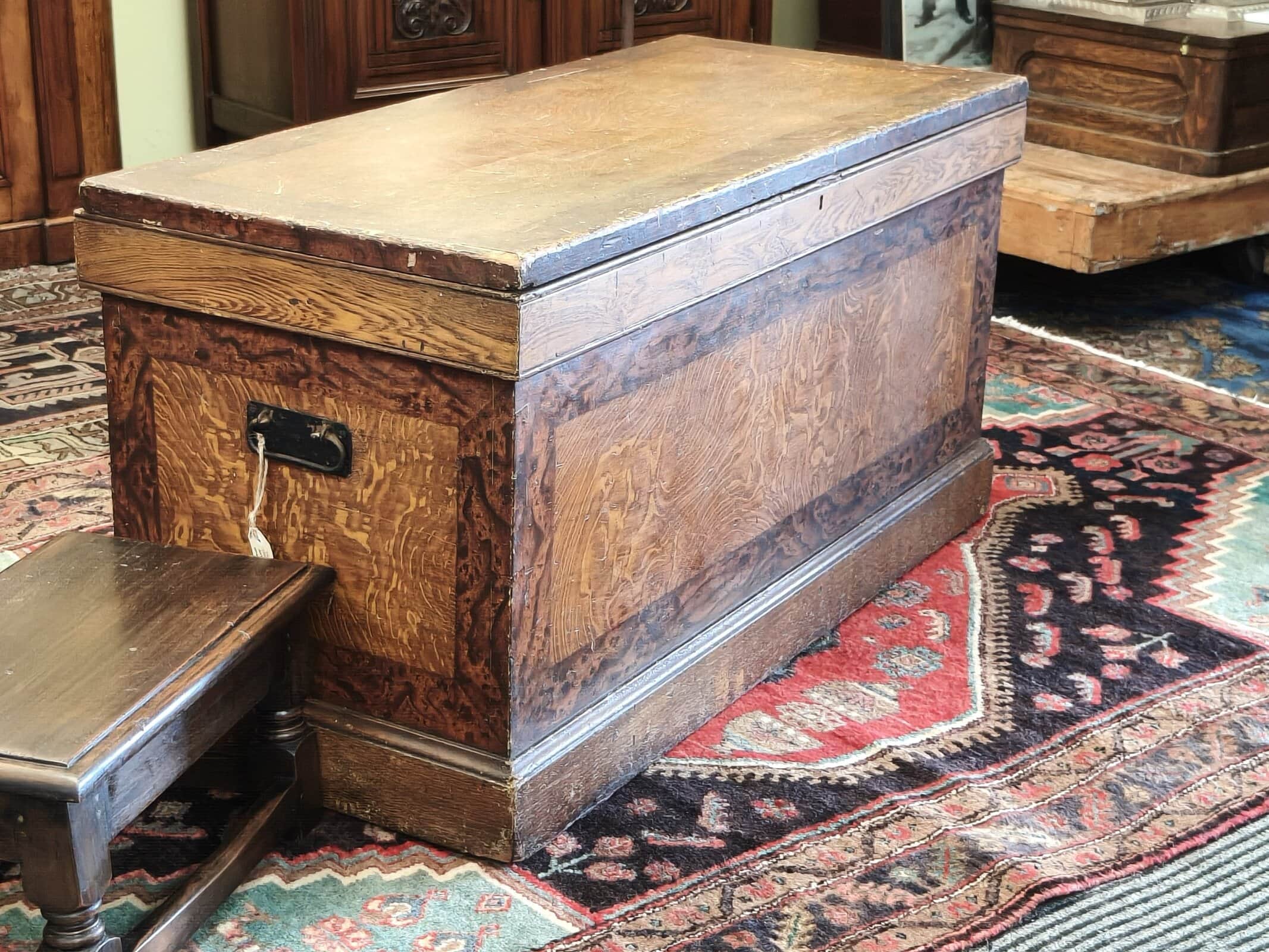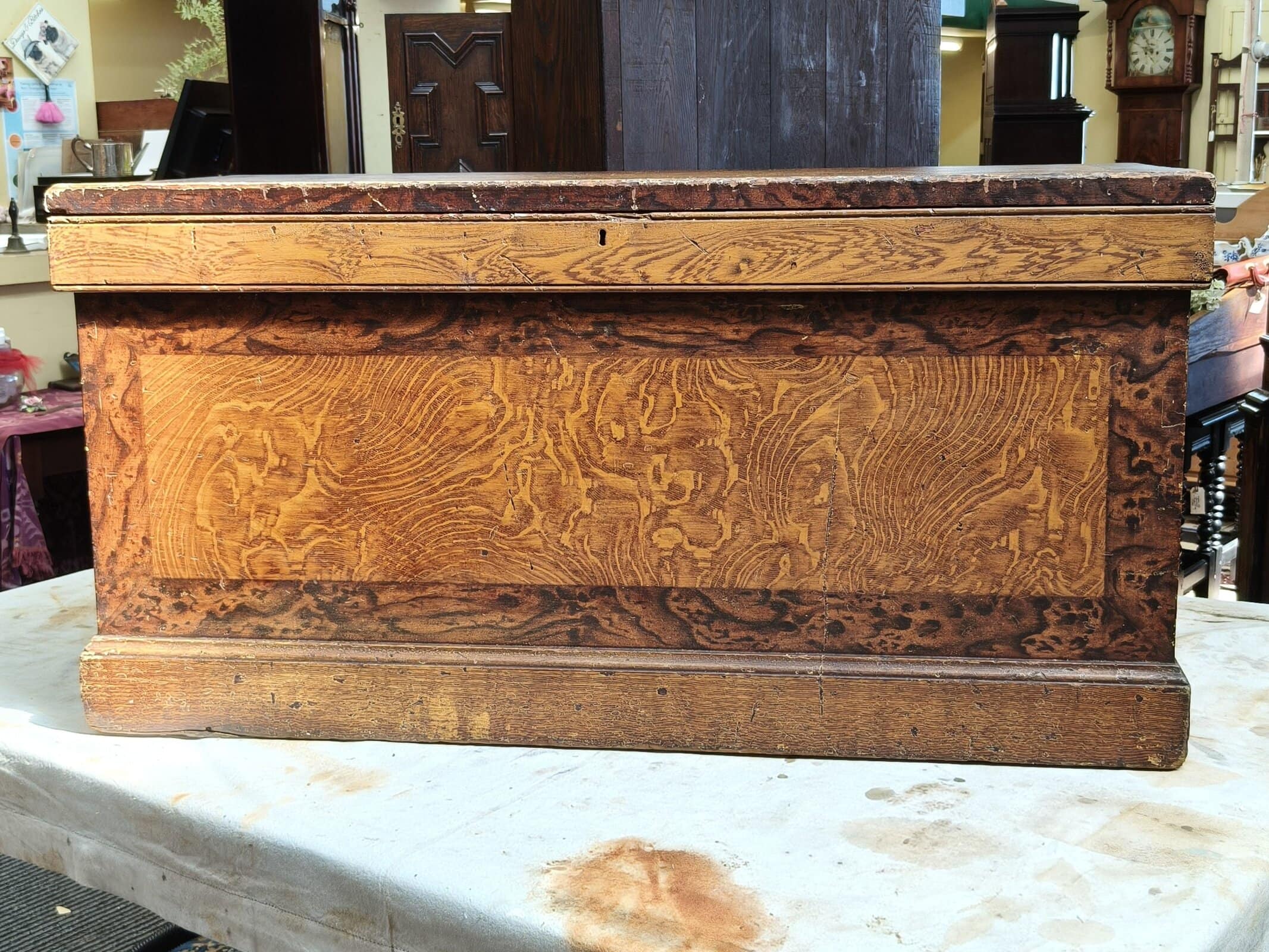 Victorian-aged grains of quarter cut oak, coromandel, pitch pine have been hand painted to decorate this pine sea trunk. The painting has saved the pine from bugs and knocks and rot. The interior is also painted., albeit a couple of plain paint layers. This trunk could sure tell some stories with her patina of knocks and bumps along with some the top surface suffering some melted paint from proximity to intense heat (perhaps a fire). Fantastic storage say end oh bed, or coffee table, or even in a foyer for all your outdoorsy stuff. Rubbed, cleaned and waxed to her best condition. Circa 1880.