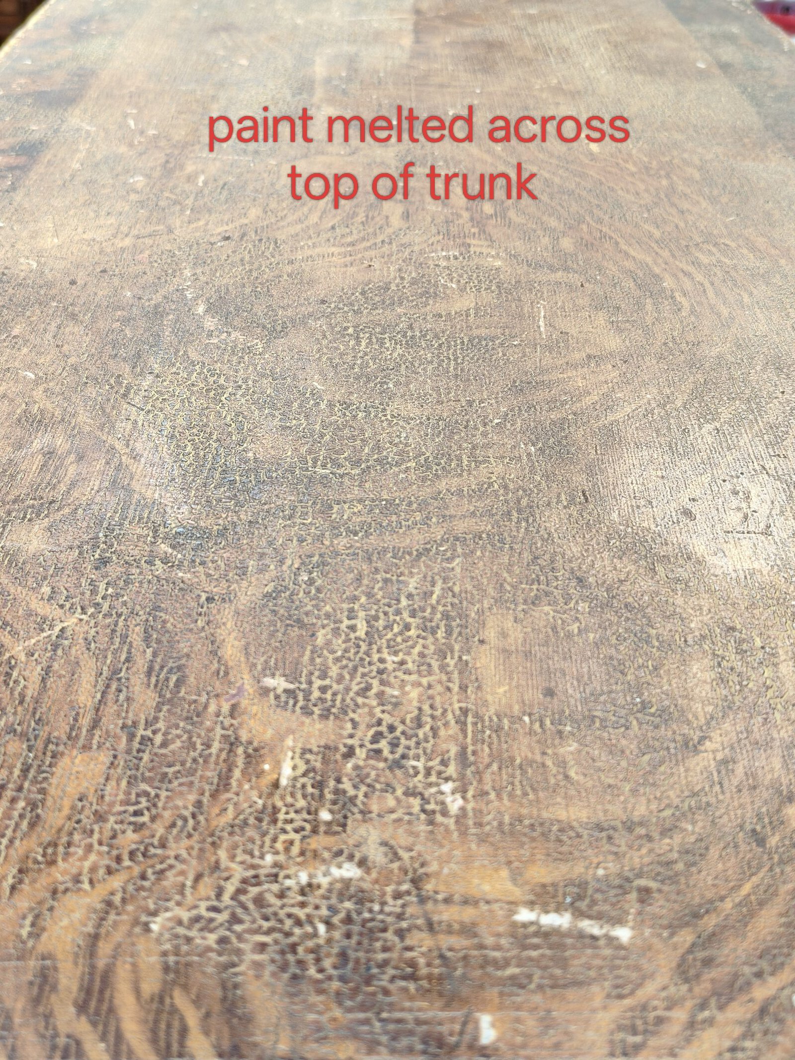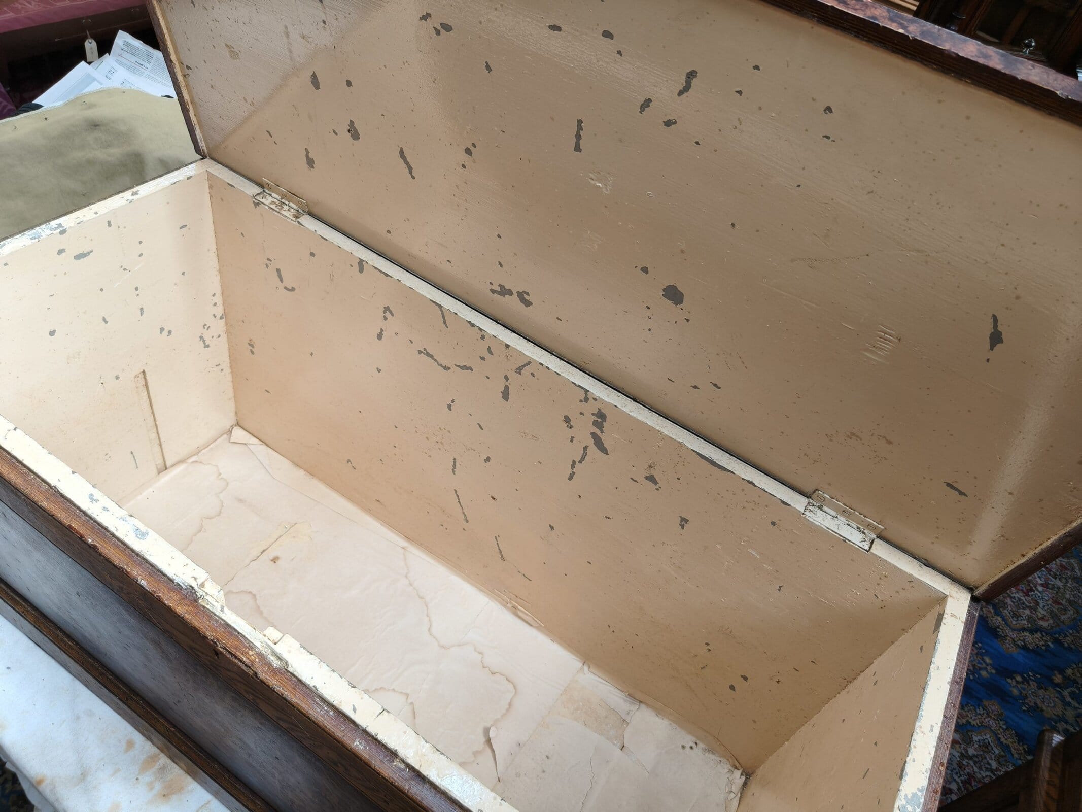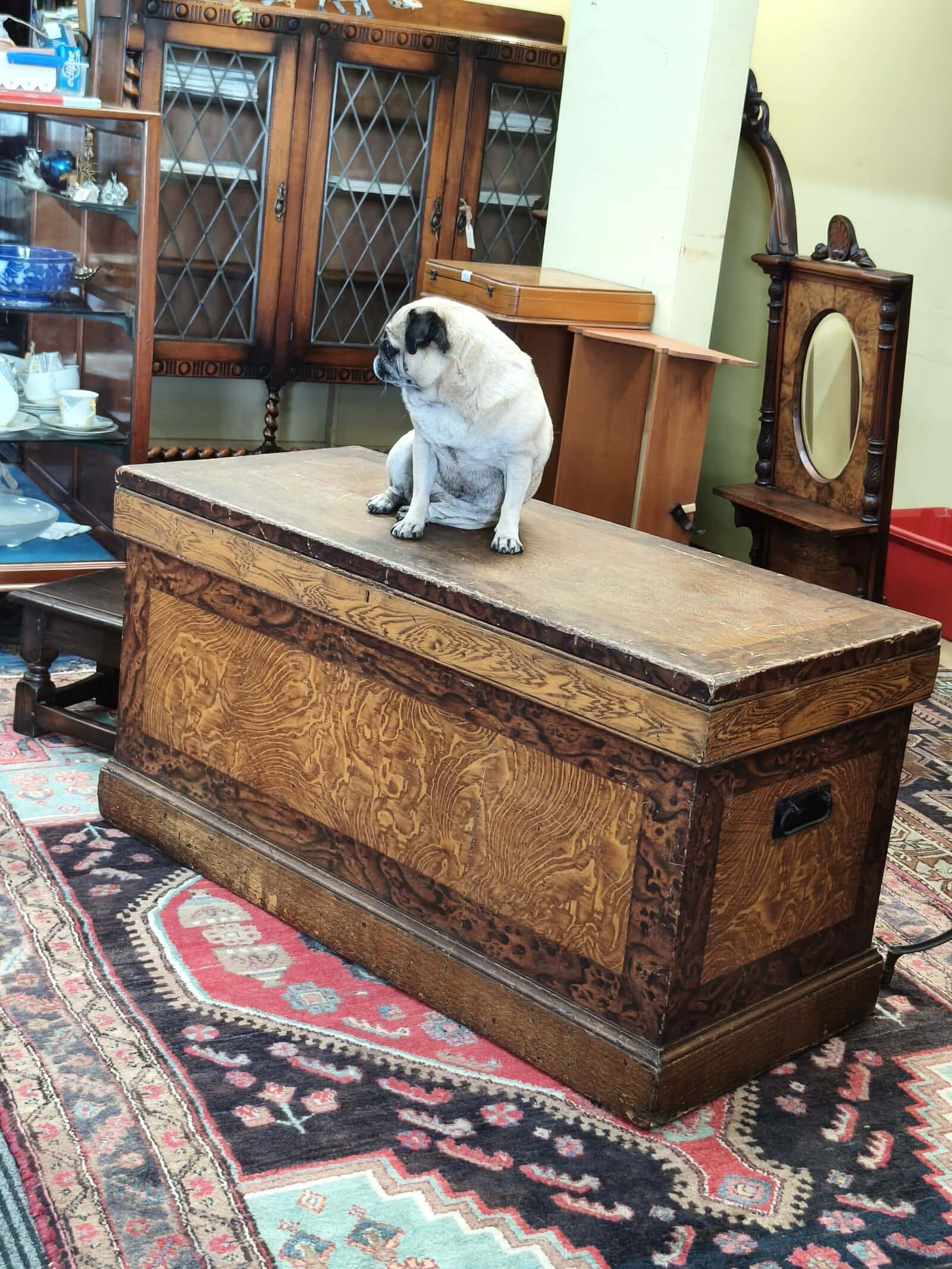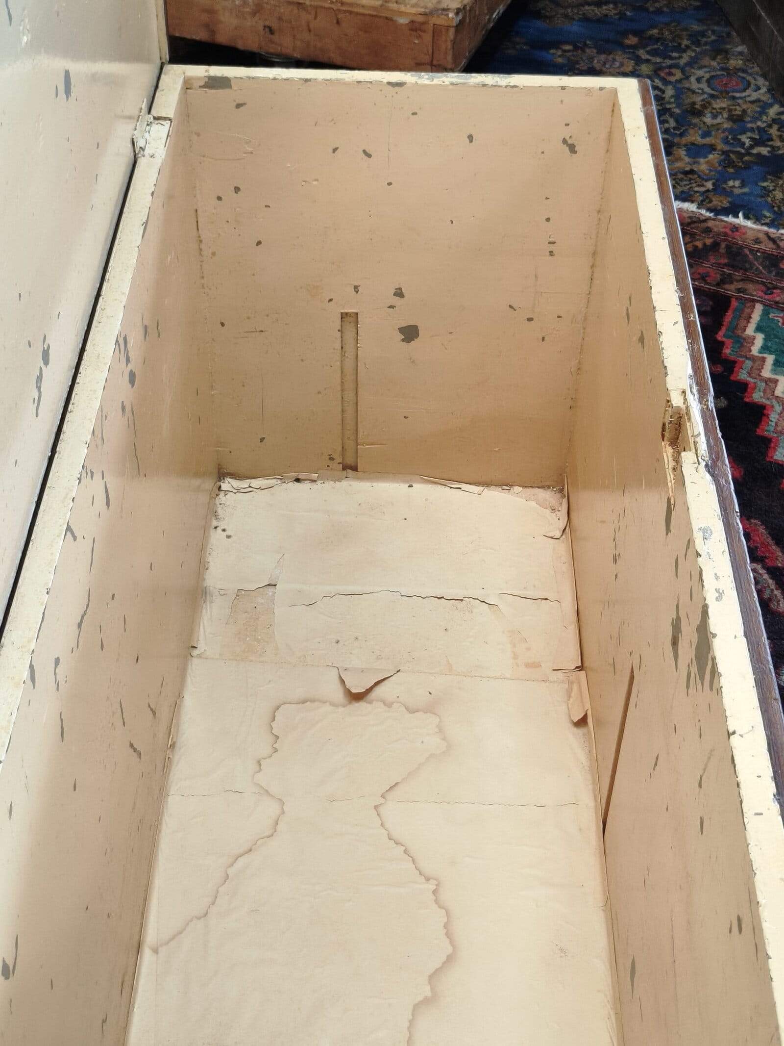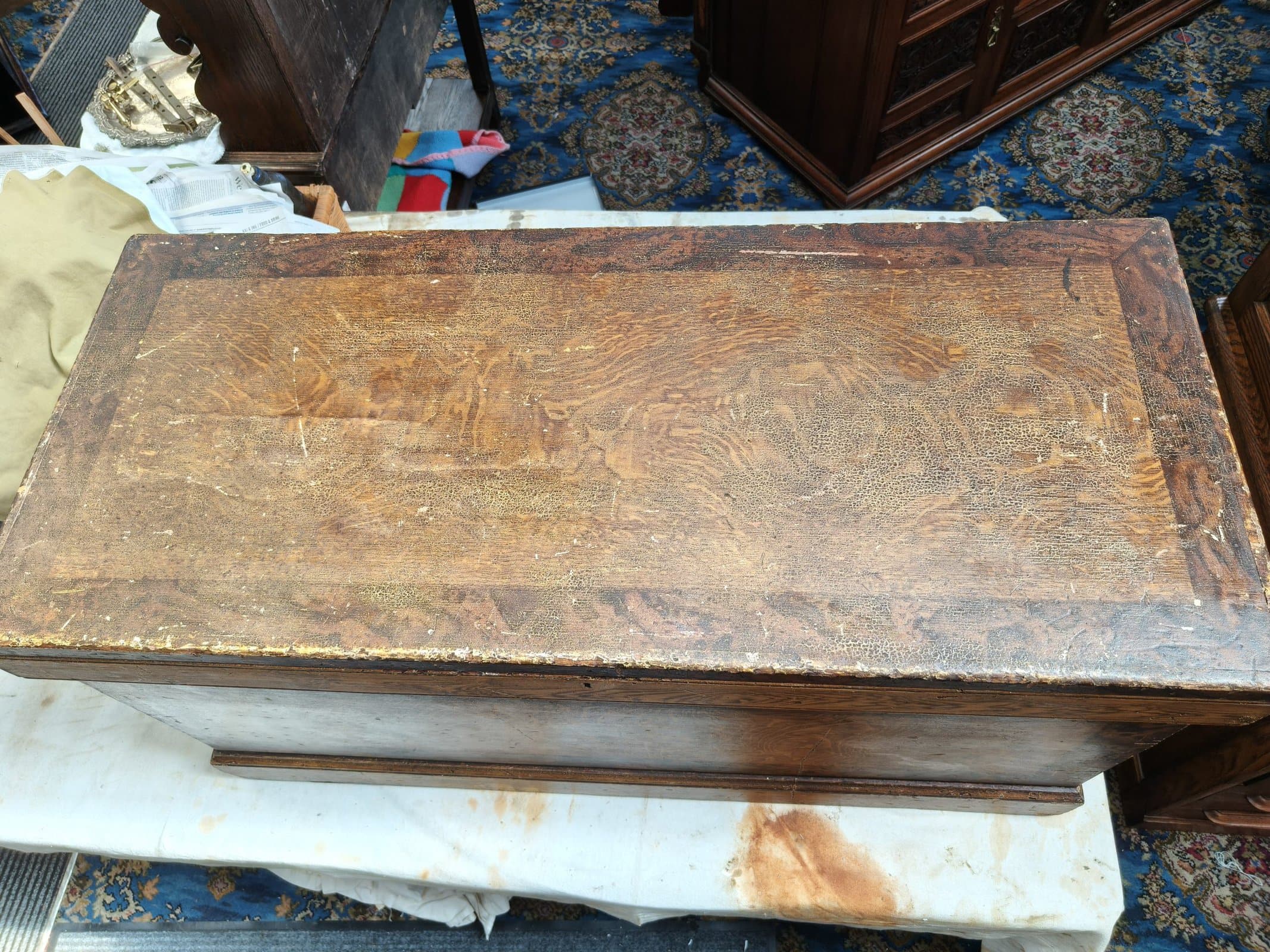 Victorian-aged grains of quarter cut oak, coromandel, pitch pine have been hand painted to decorate this pine sea trunk. The painting has saved the pine from bugs and knocks and rot. The interior is also painted., albeit a couple of plain paint layers. This trunk could sure tell some stories with her patina of knocks and bumps along with some the top surface suffering some melted paint from proximity to intense heat (perhaps a fire). Fantastic storage say end oh bed, or coffee table, or even in a foyer for all your outdoorsy stuff. Rubbed, cleaned and waxed to her best condition. Circa 1880.