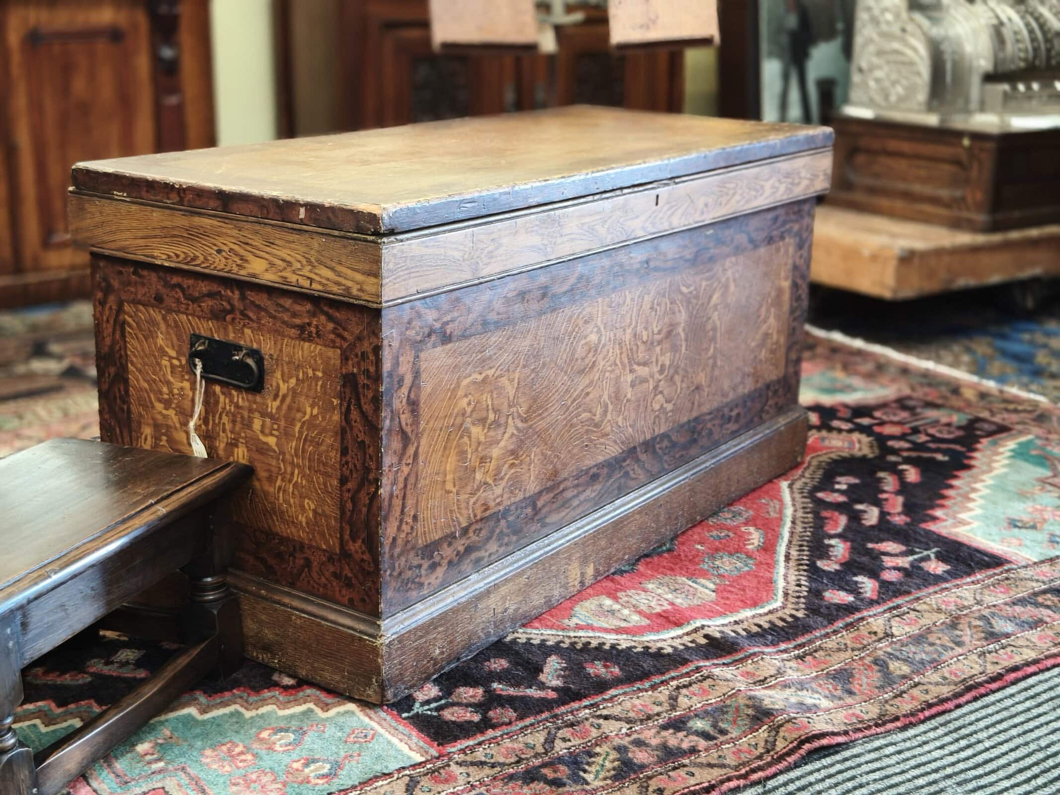 Victorian-aged grains of quarter cut oak, coromandel, pitch pine have been hand painted to decorate this pine sea trunk. The painting has saved the pine from bugs and knocks and rot. The interior is also painted, albeit a couple of plain paint layers. This trunk could sure tell some stories with her patina of knocks and bumps along with some the top surface suffering some melted paint from proximity to intense heat (perhaps a fire). Fantastic storage say end oh bed, or coffee table, or even in a foyer for all your outdoorsy stuff. Rubbed, cleaned and waxed to her best condition. Circa 1880.