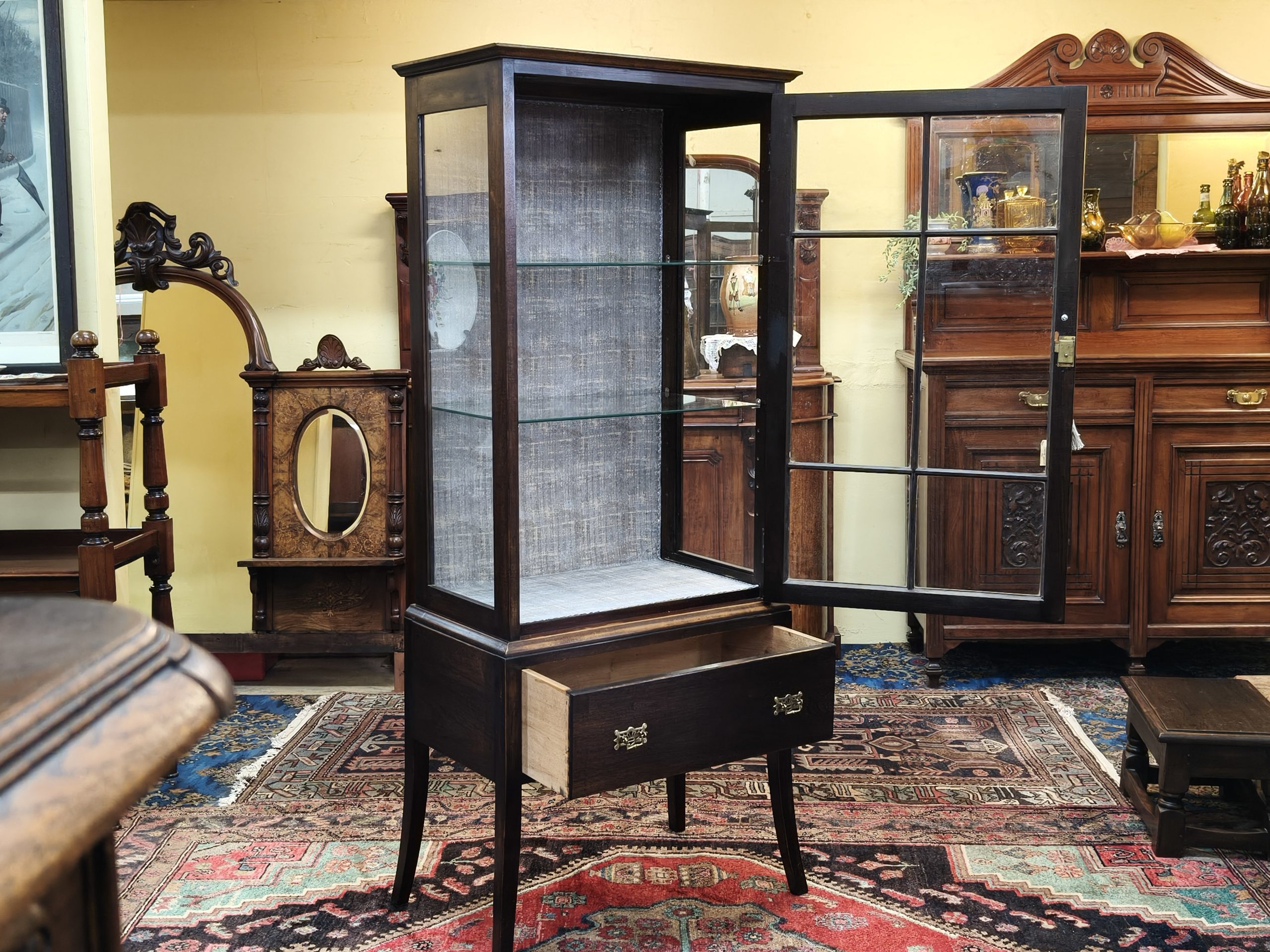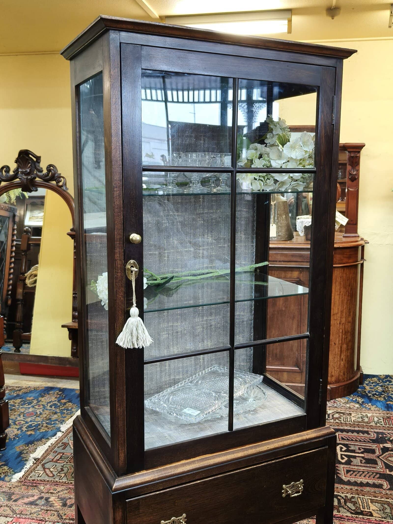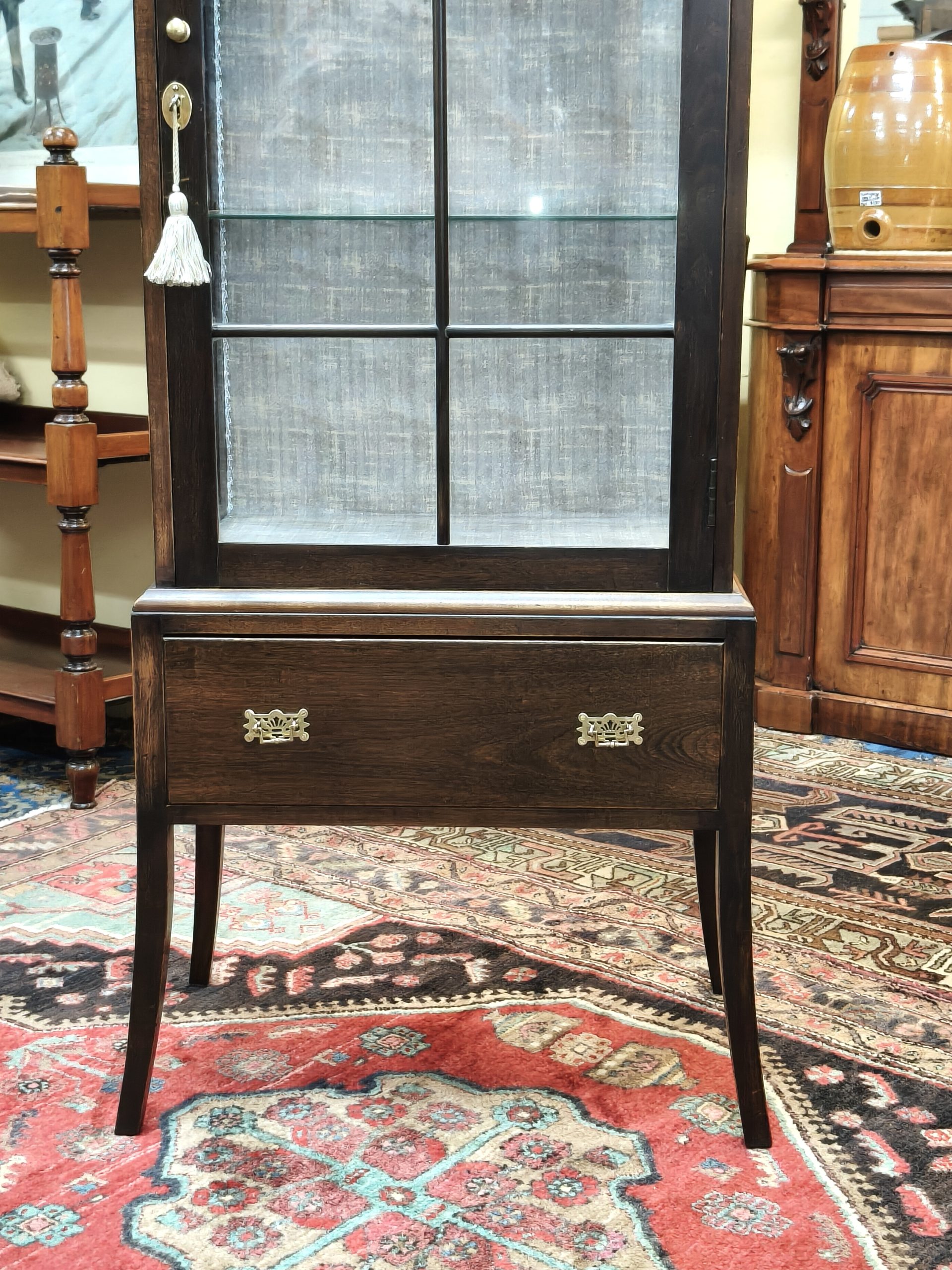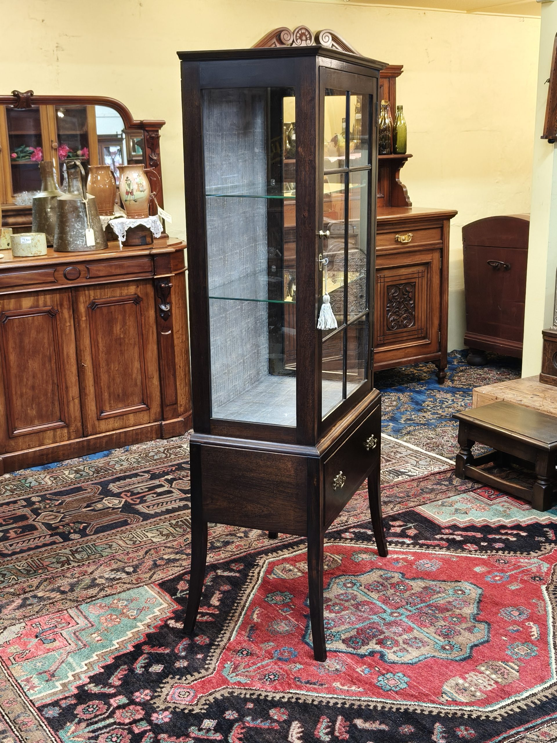 Dinky mahogany, Shaker-style china cabinet. Originally sold by Smith and Caughey...I imagine cost a sweet penny. Neat size for any space. Two adjustable shelves and a floor make for three layers of treasure housing. A lower drawer. Some sun fading, in a Bay colour and slight patina; otherwise, great condition and a new lined interior. Circa 1950.