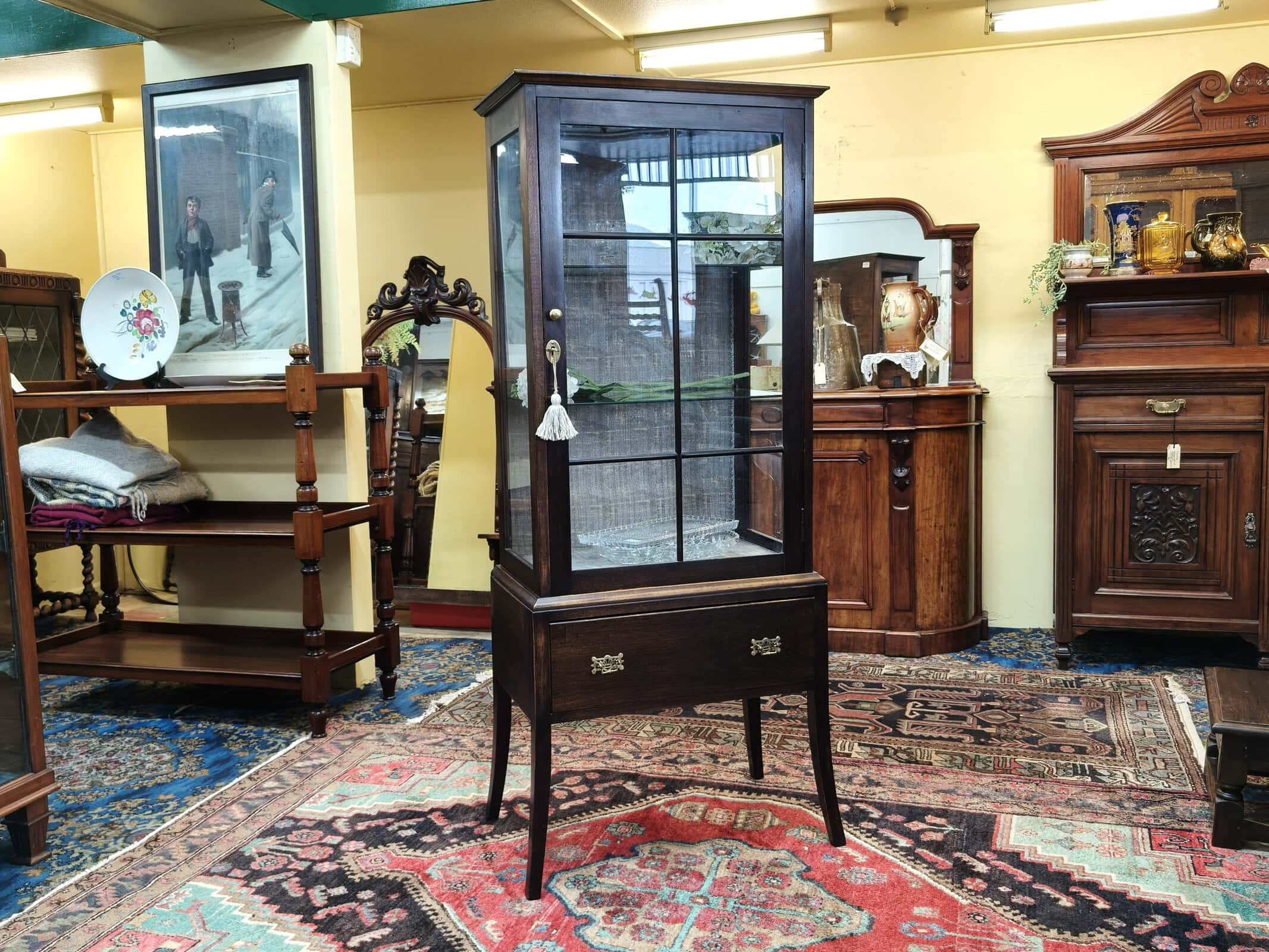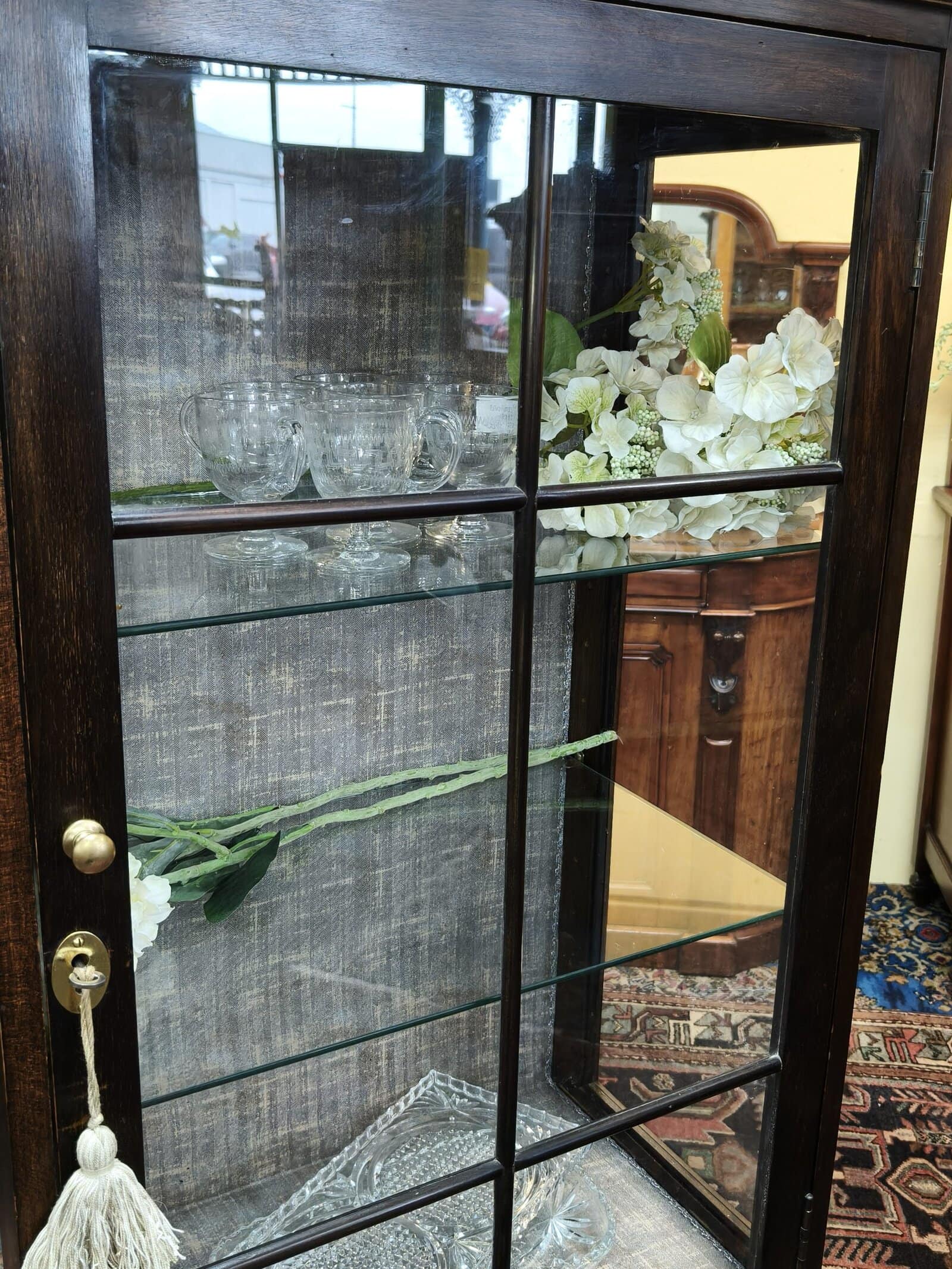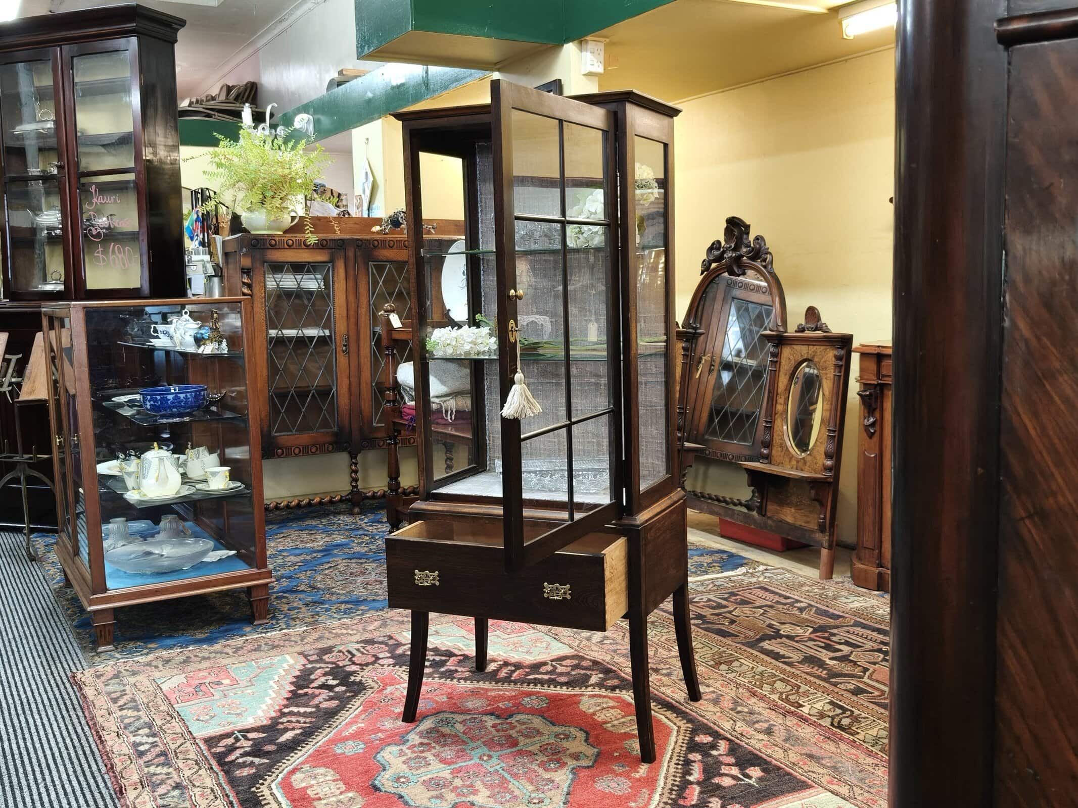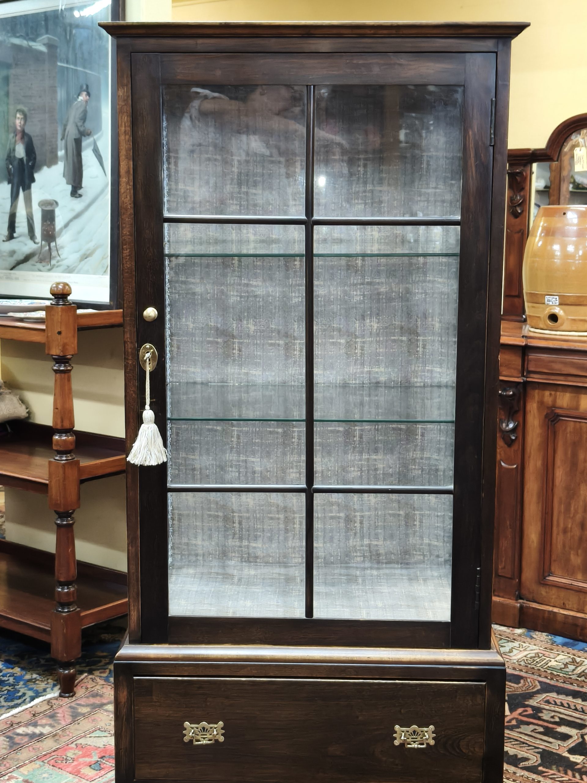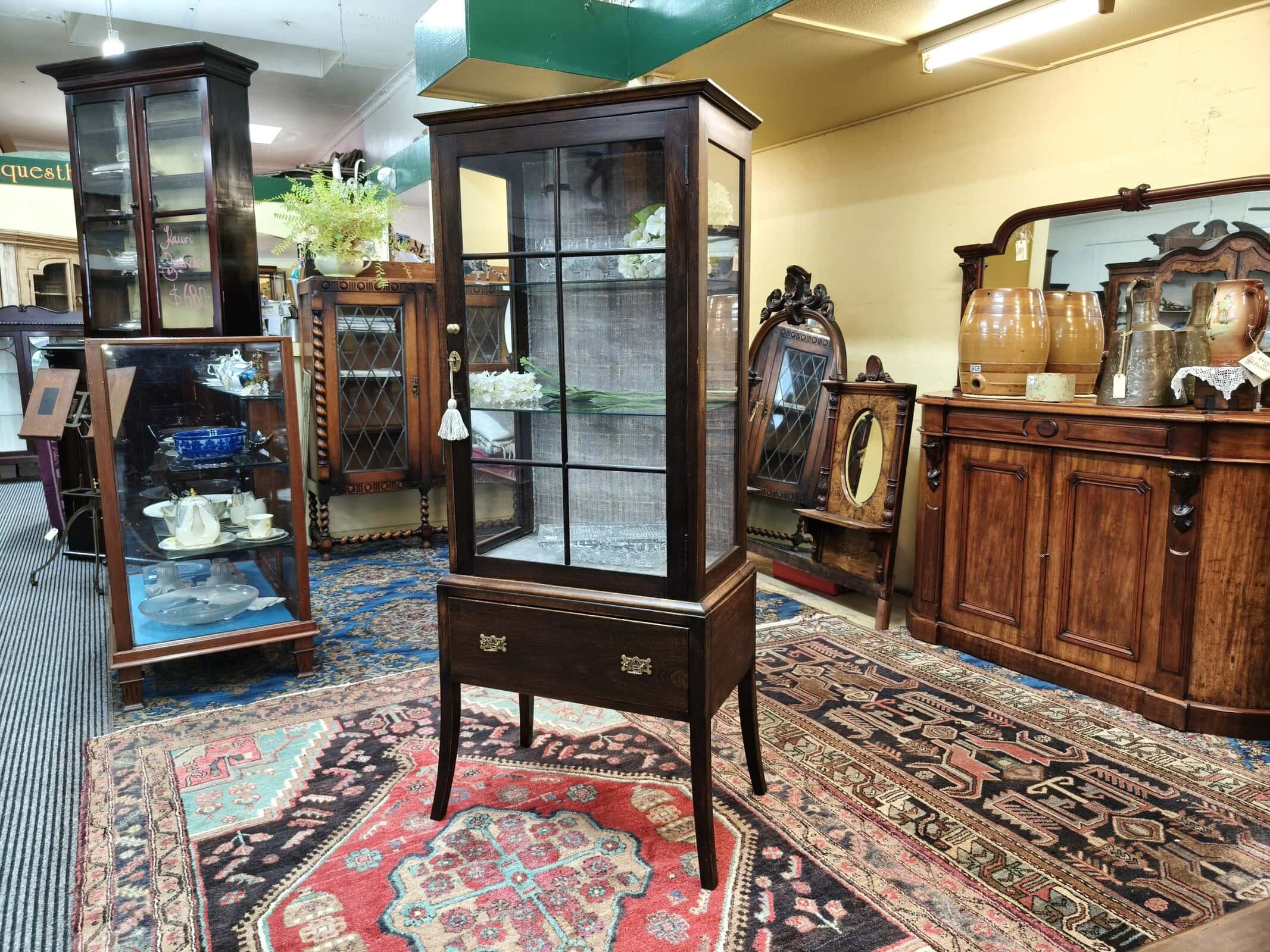 Dinky mahogany, Shaker-style china cabinet. Originally sold by Smith and Caughey...I imagine cost a sweet penny. Neat size for any space. Two adjustable shelves and a floor make for three layers of treasure housing. A lower drawer. Some sun fading, in a Bay colour and slight patina; otherwise, great condition and a new lined interior. Circa 1950.