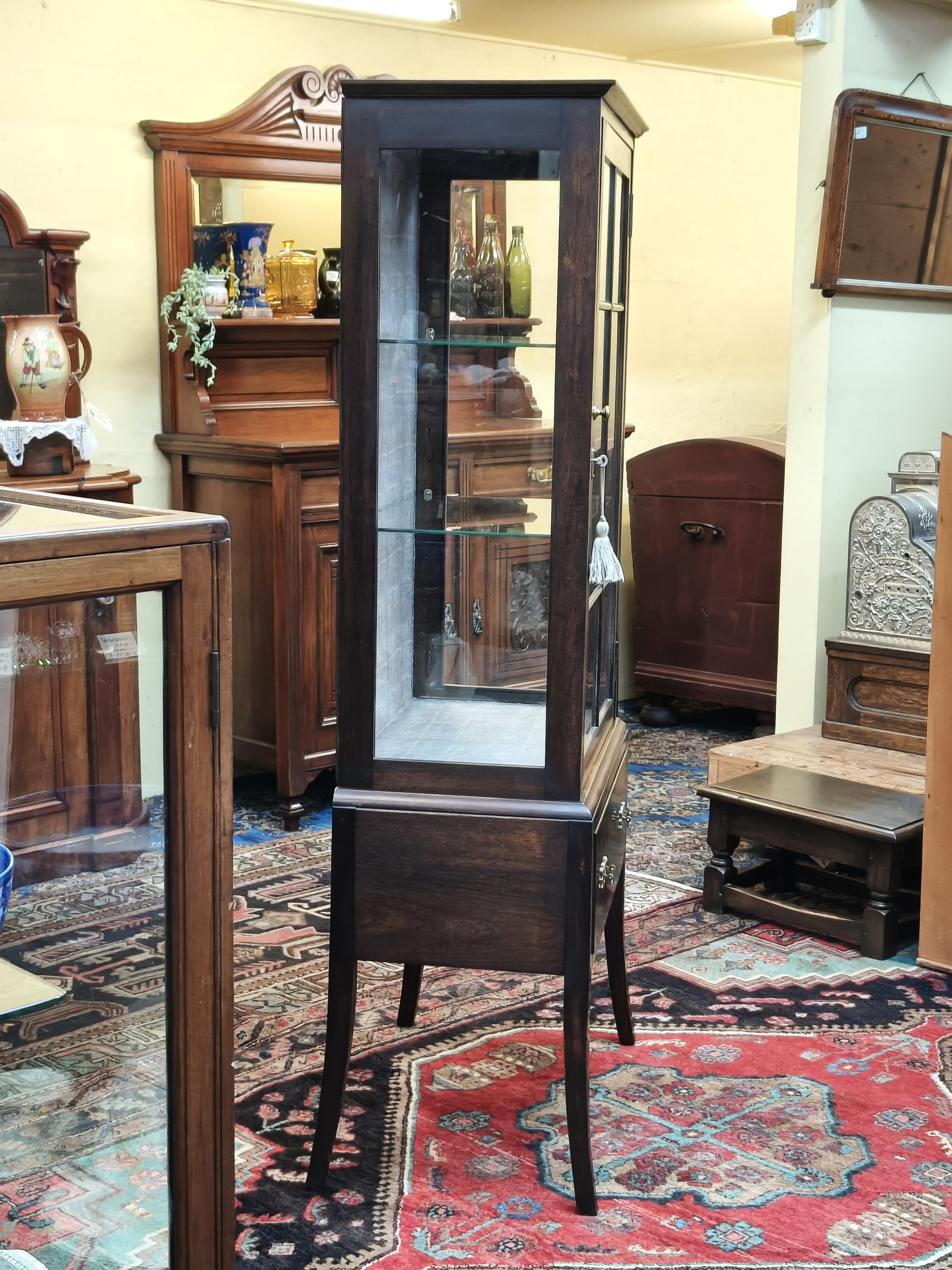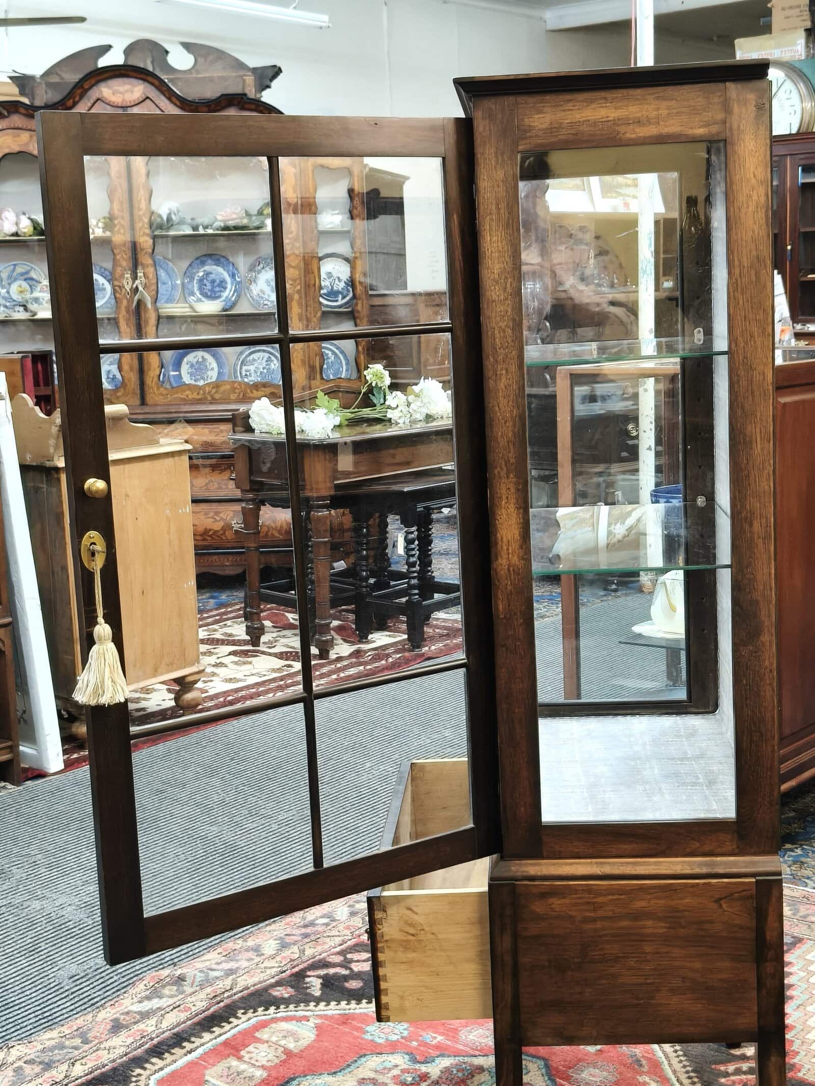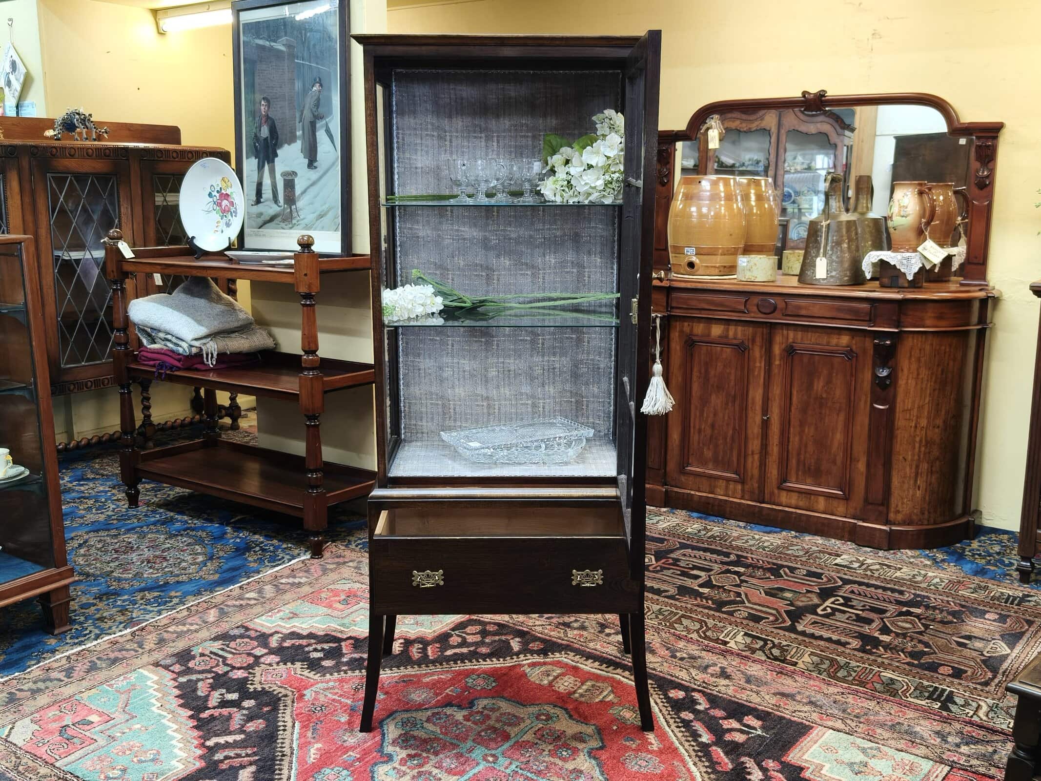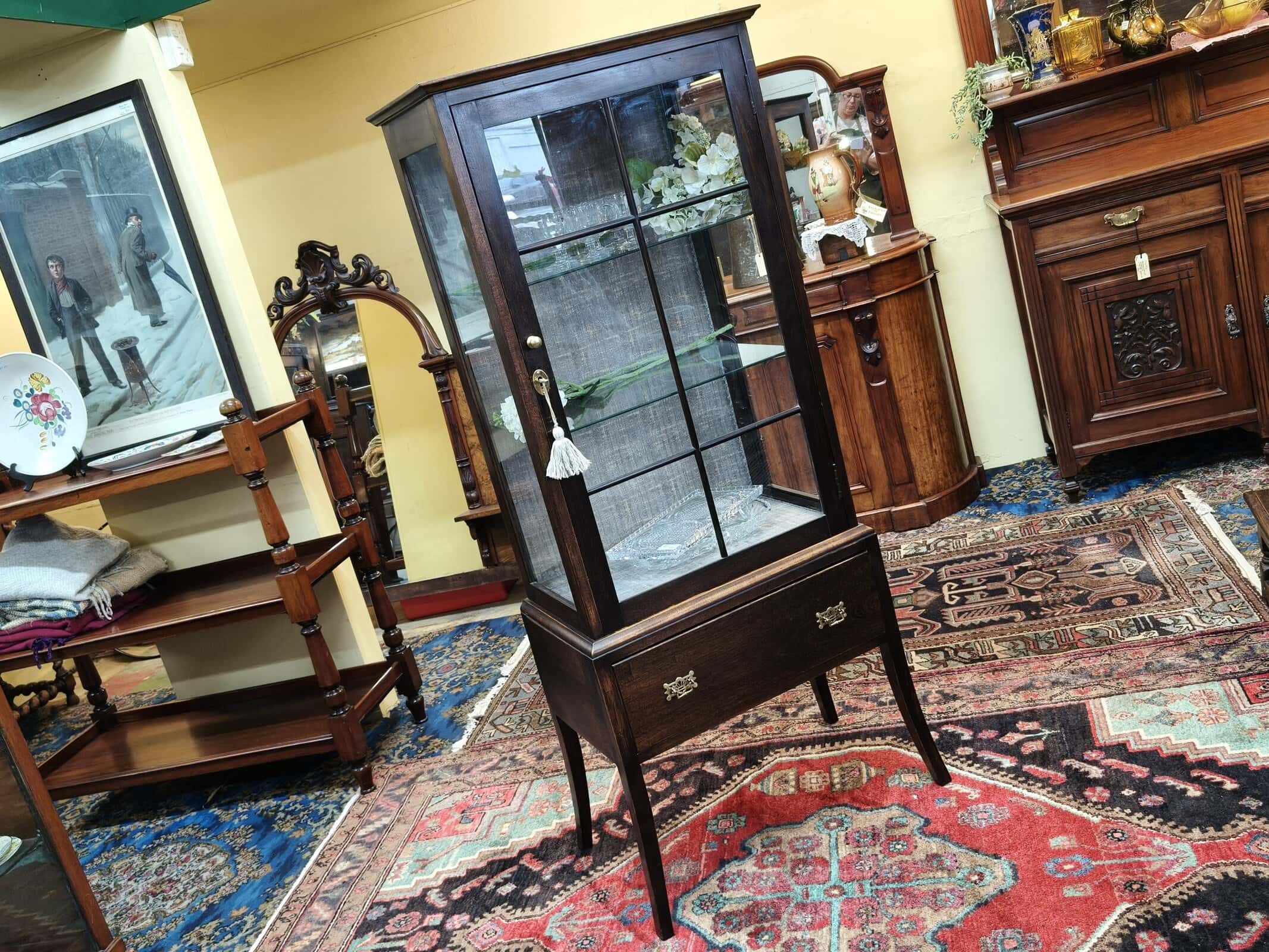 Dinky mahogany, Shaker-style china cabinet. Originally sold by Smith and Caughey...I imagine cost a sweet penny. Neat size for any space. Two adjustable shelves and a floor make for three layers of treasure housing. A lower drawer. Some sun fading, in a Bay colour and slight patina; otherwise, great condition and a new lined interior. Circa 1950.