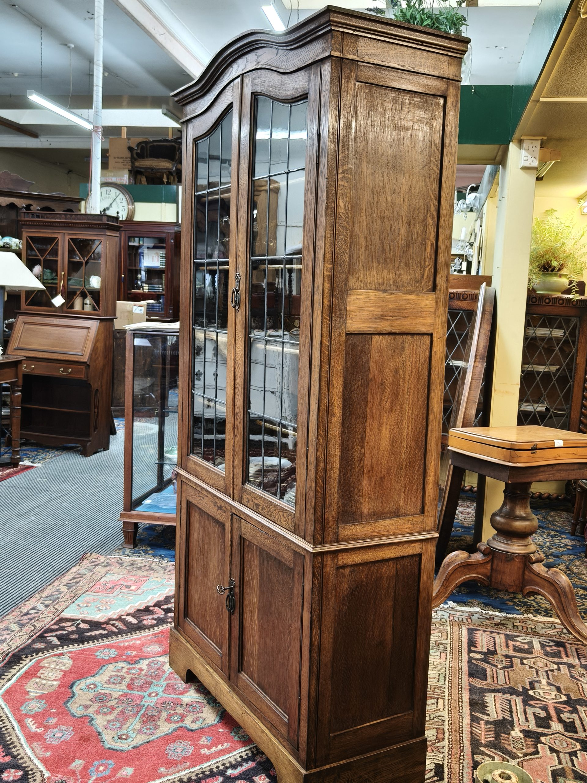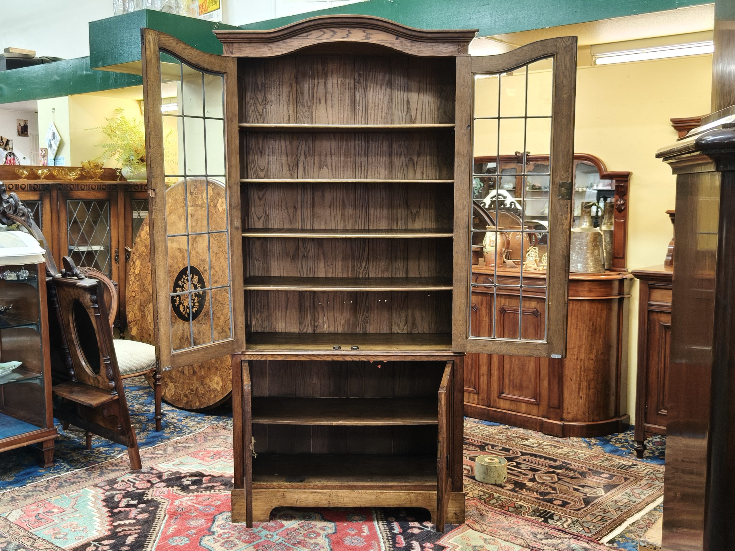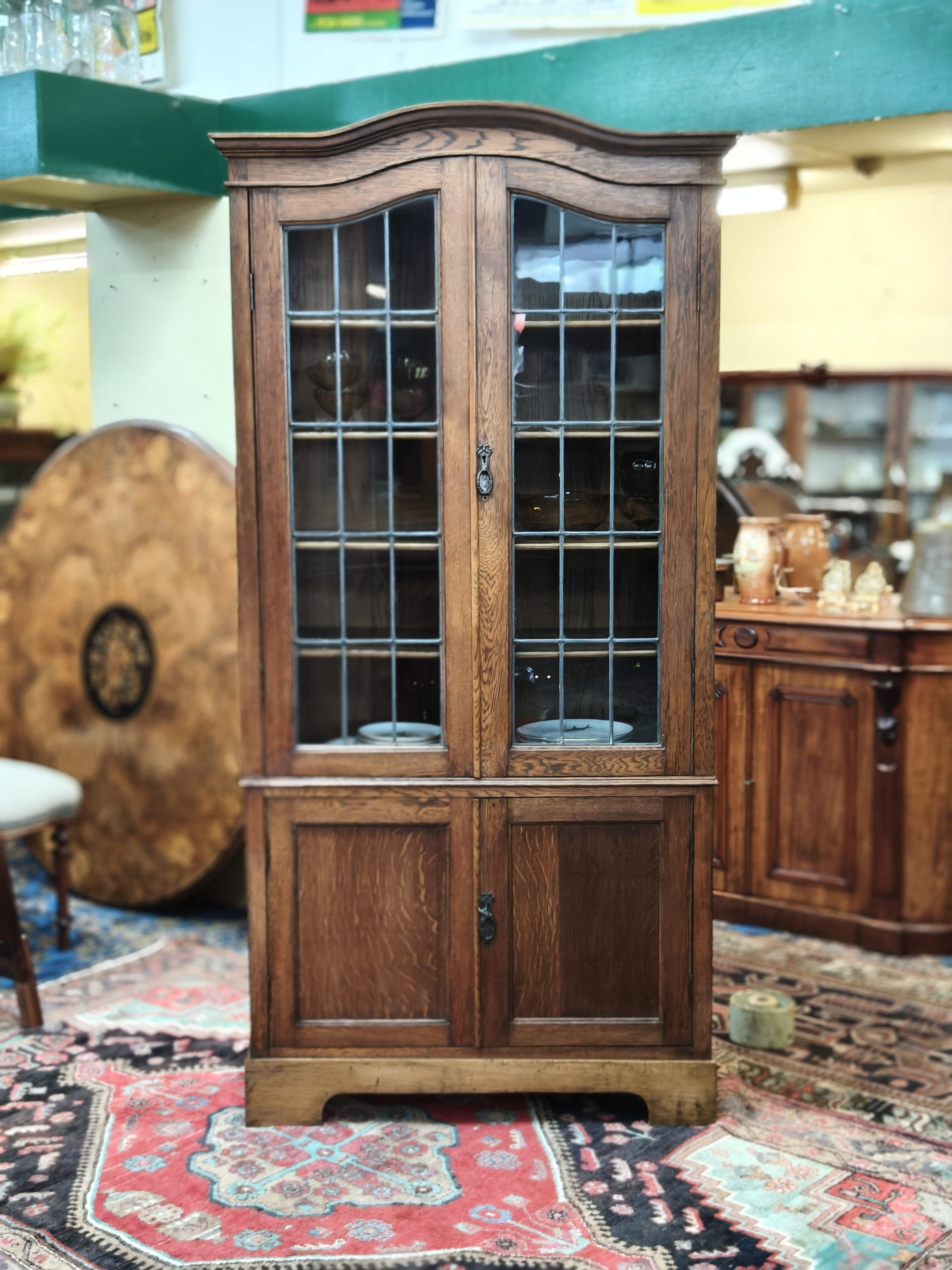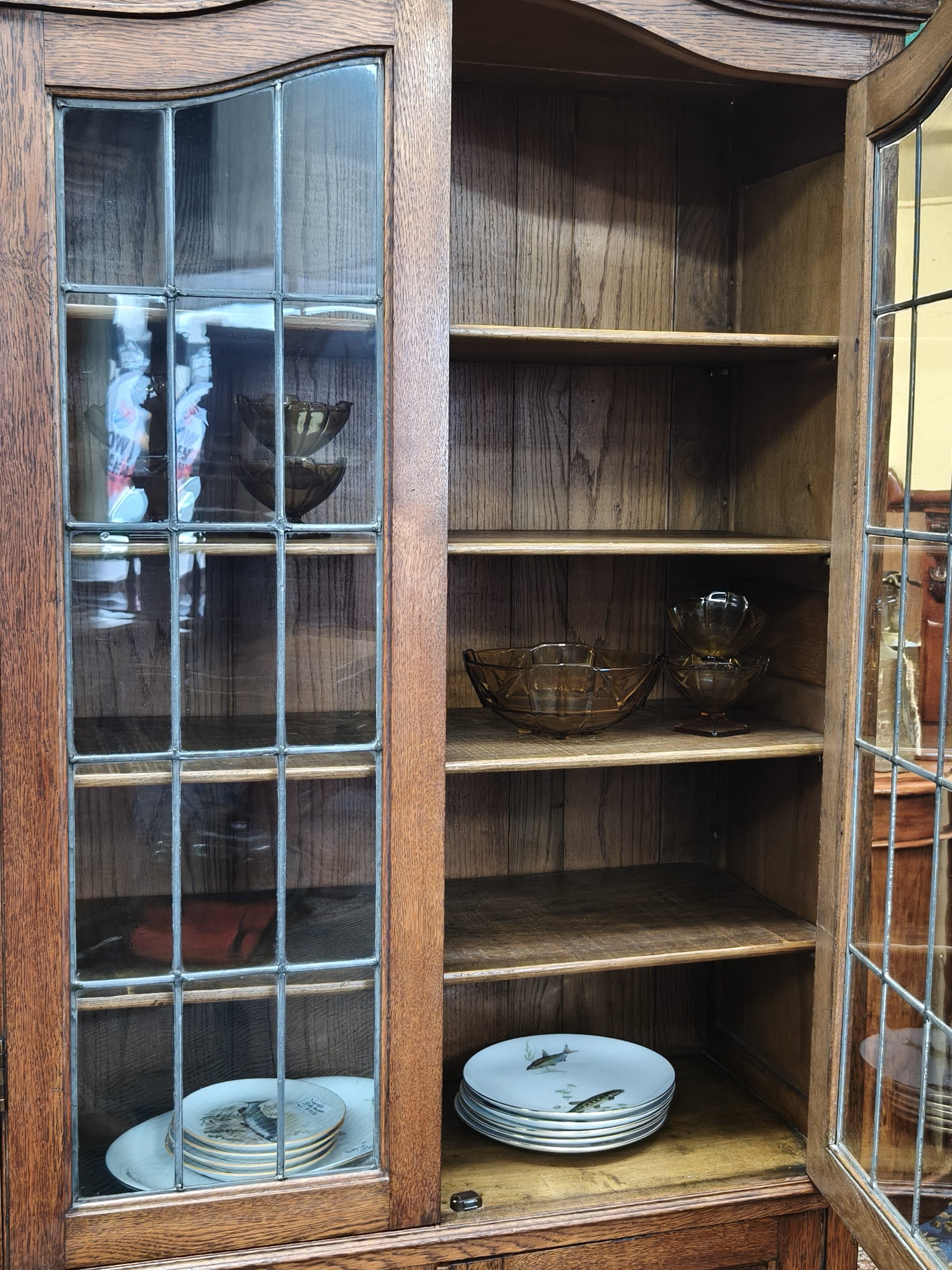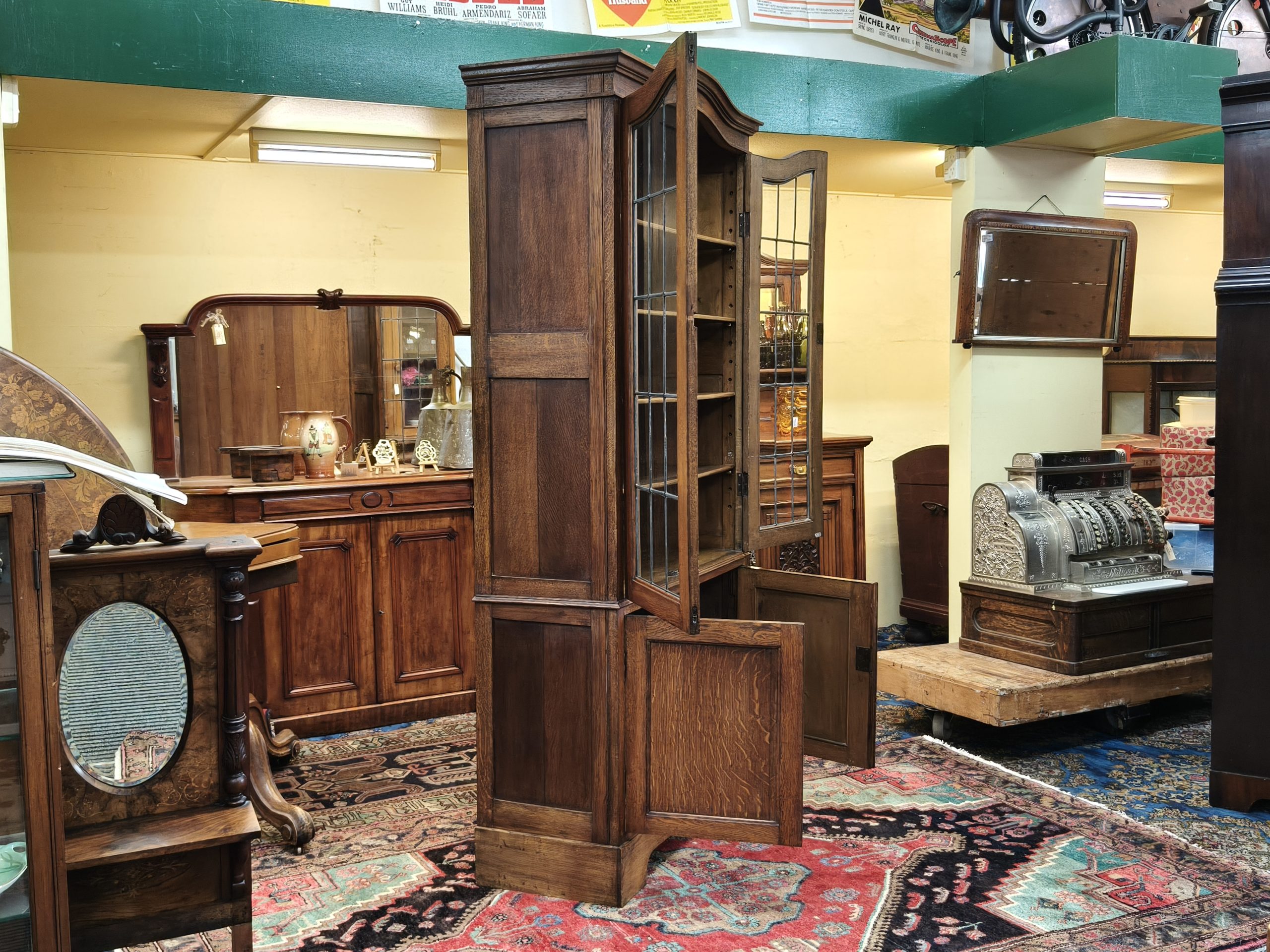 An arched top, nutty-coloured, English oak bookcase. Lead light grid glass upper doors, and a lower cupboard for the uglies, upon bracket feet. Locks. Adjustable shelves. Excellent storage for your glassware, crockery, treasures or books. Magic space saving with a smaller footprint. Excellent condition. Circa 1925.