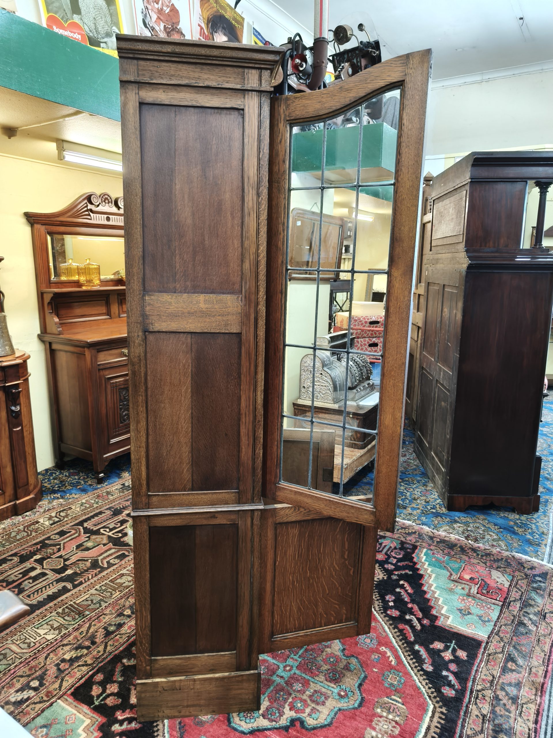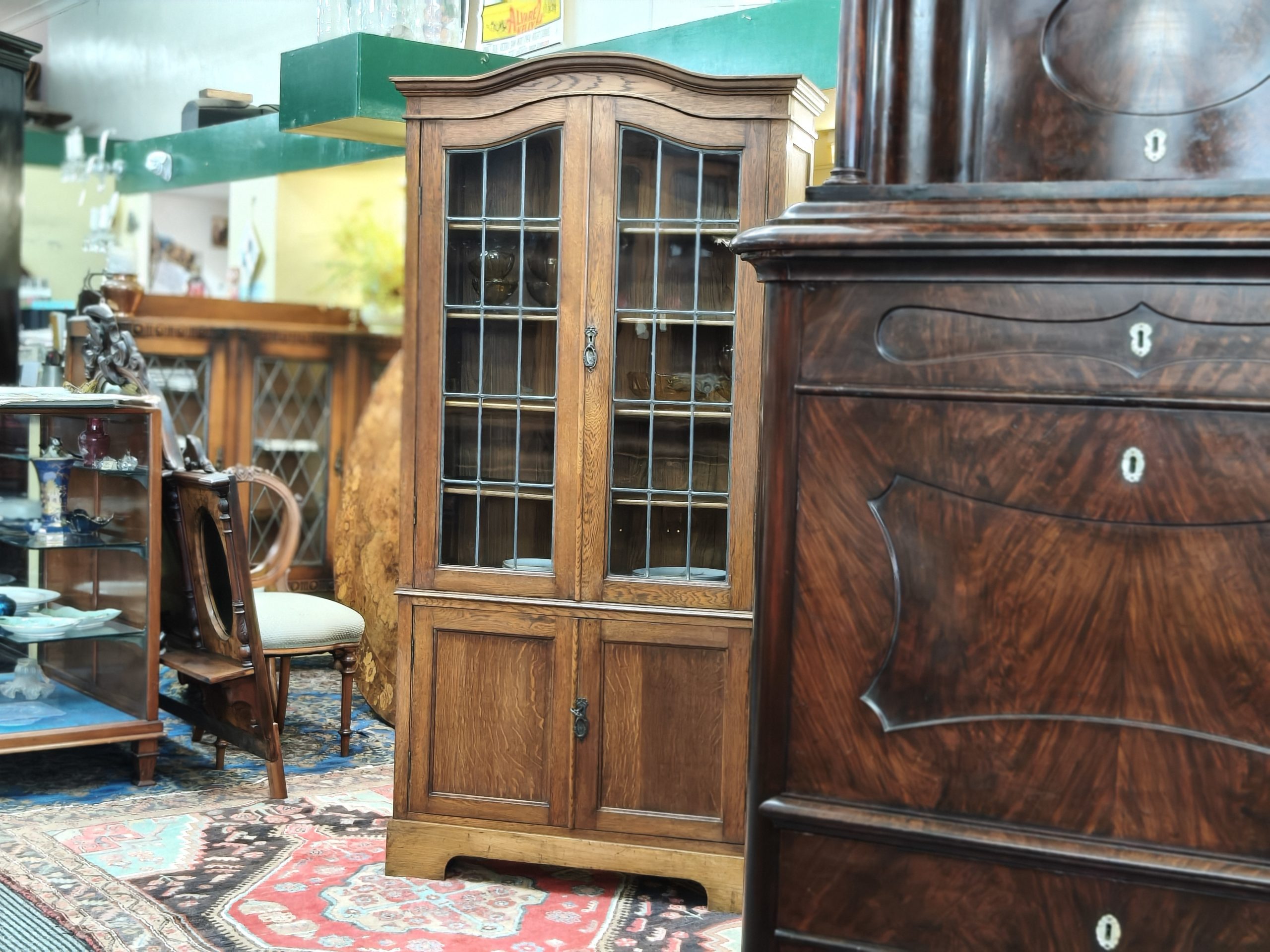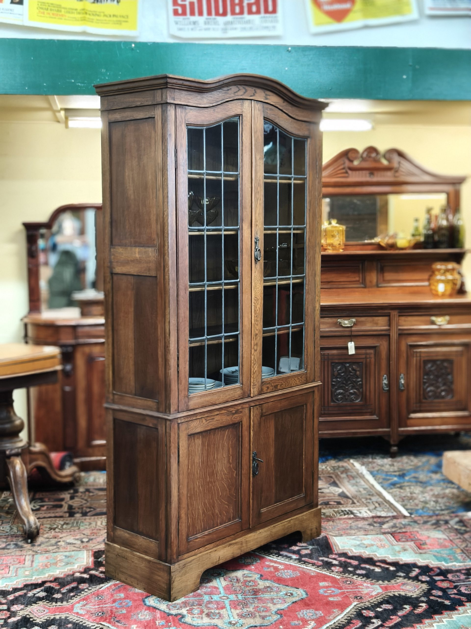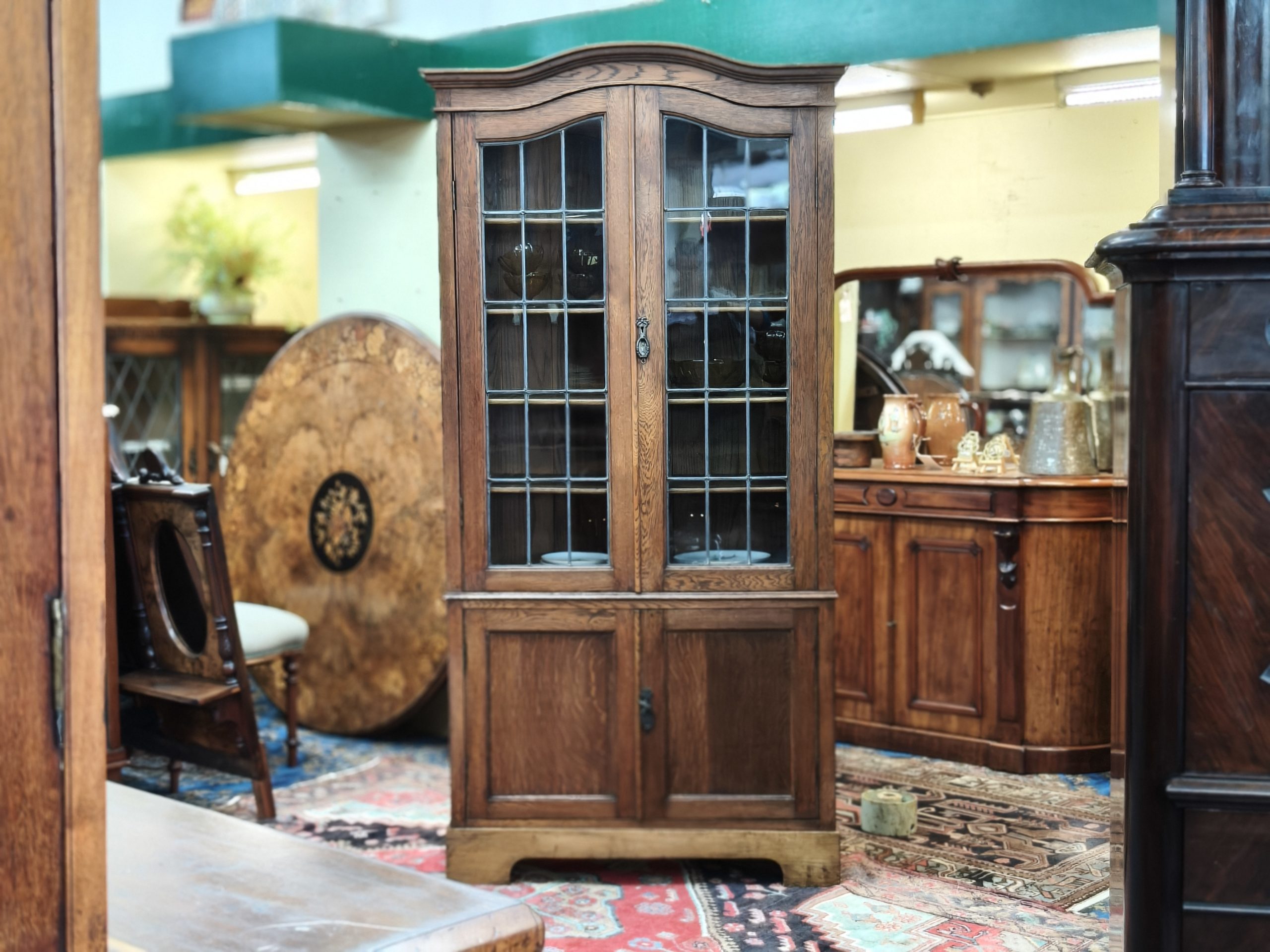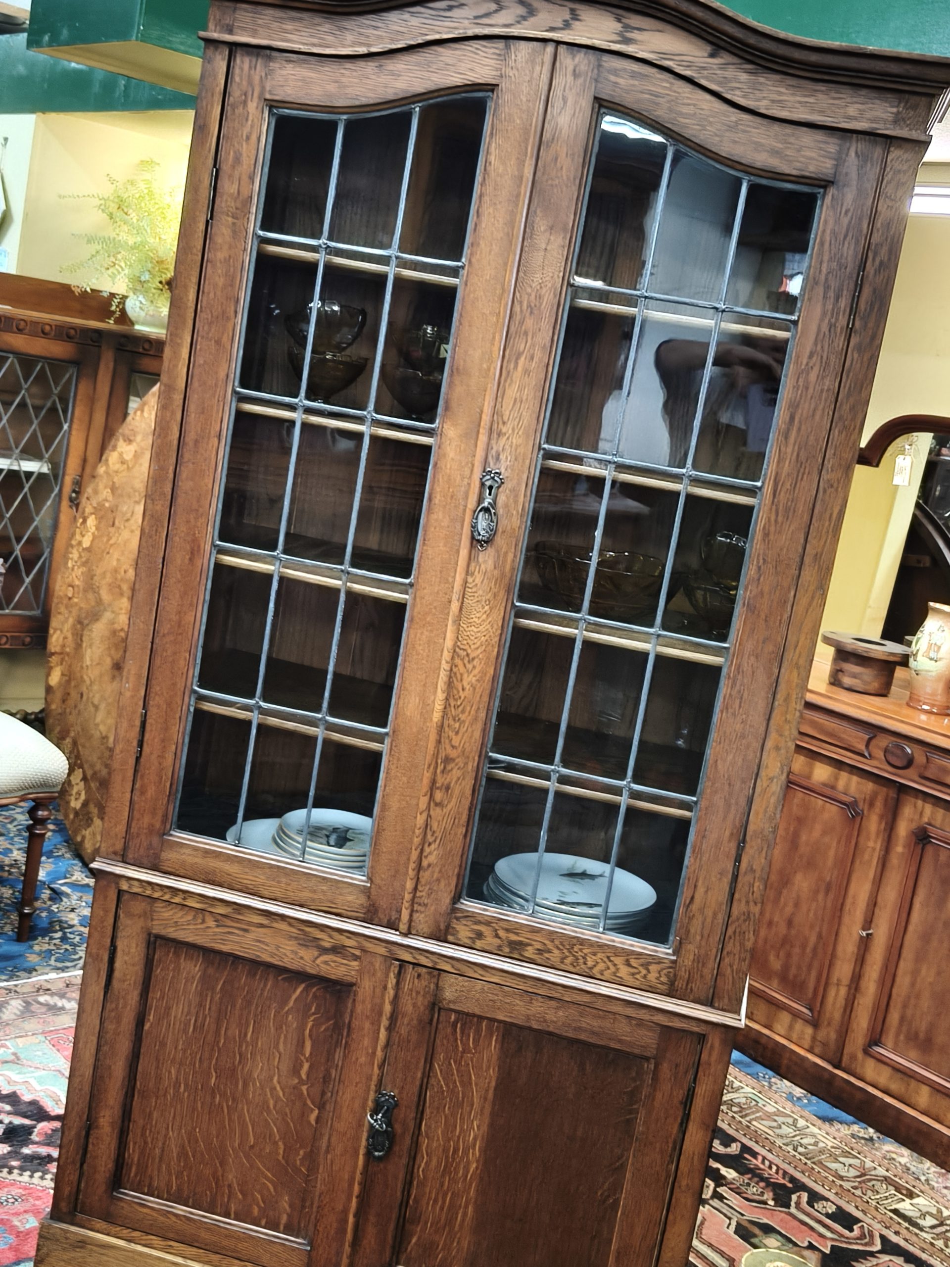 An arched top, nutty-coloured, English oak bookcase. Lead light grid glass upper doors, and a lower cupboard for the uglies, upon bracket feet. Locks. Adjustable shelves. Excellent storage for your glassware, crockery, treasures or books. Magic space saving with a smaller footprint. Excellent condition. Circa 1925.